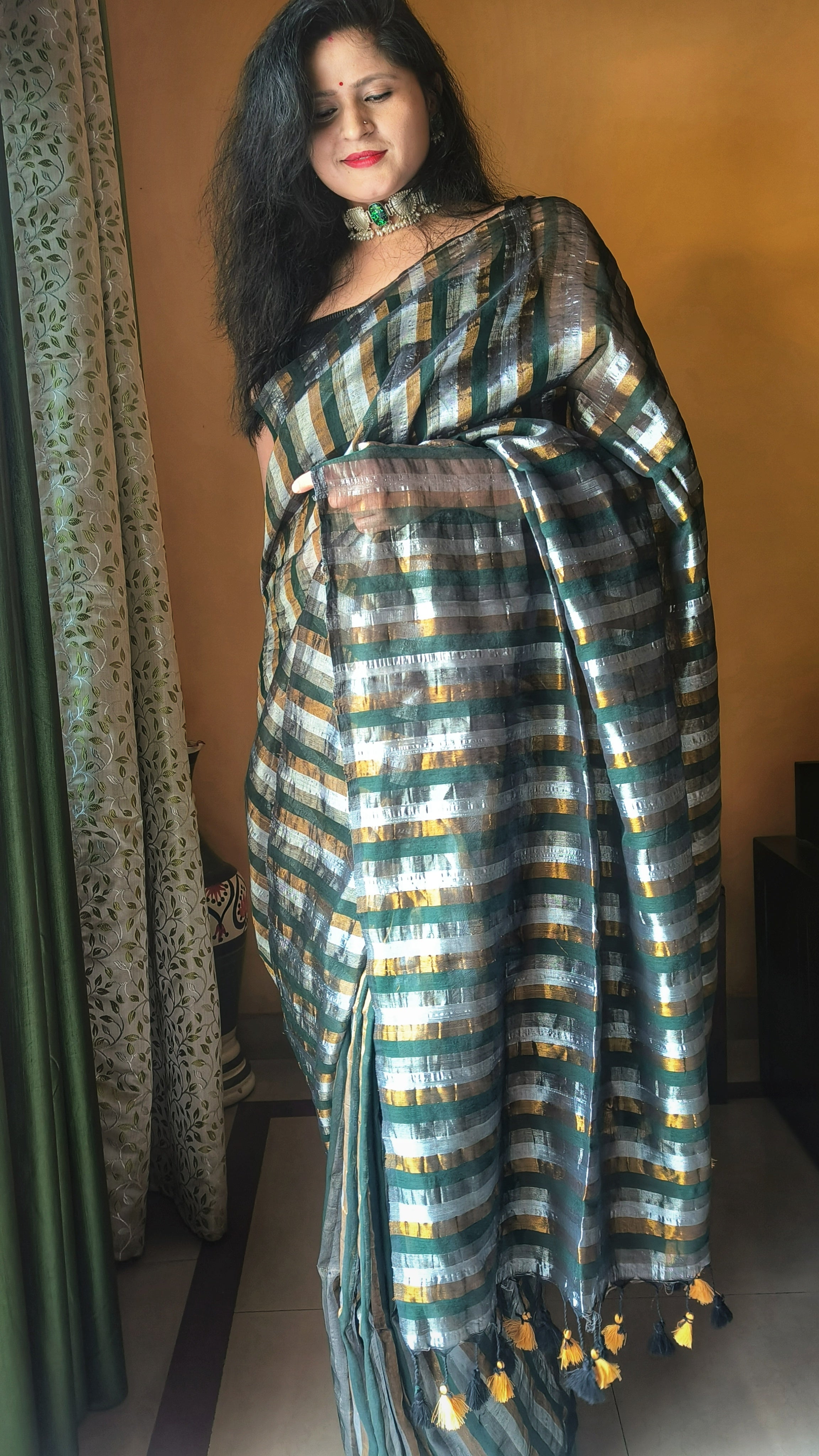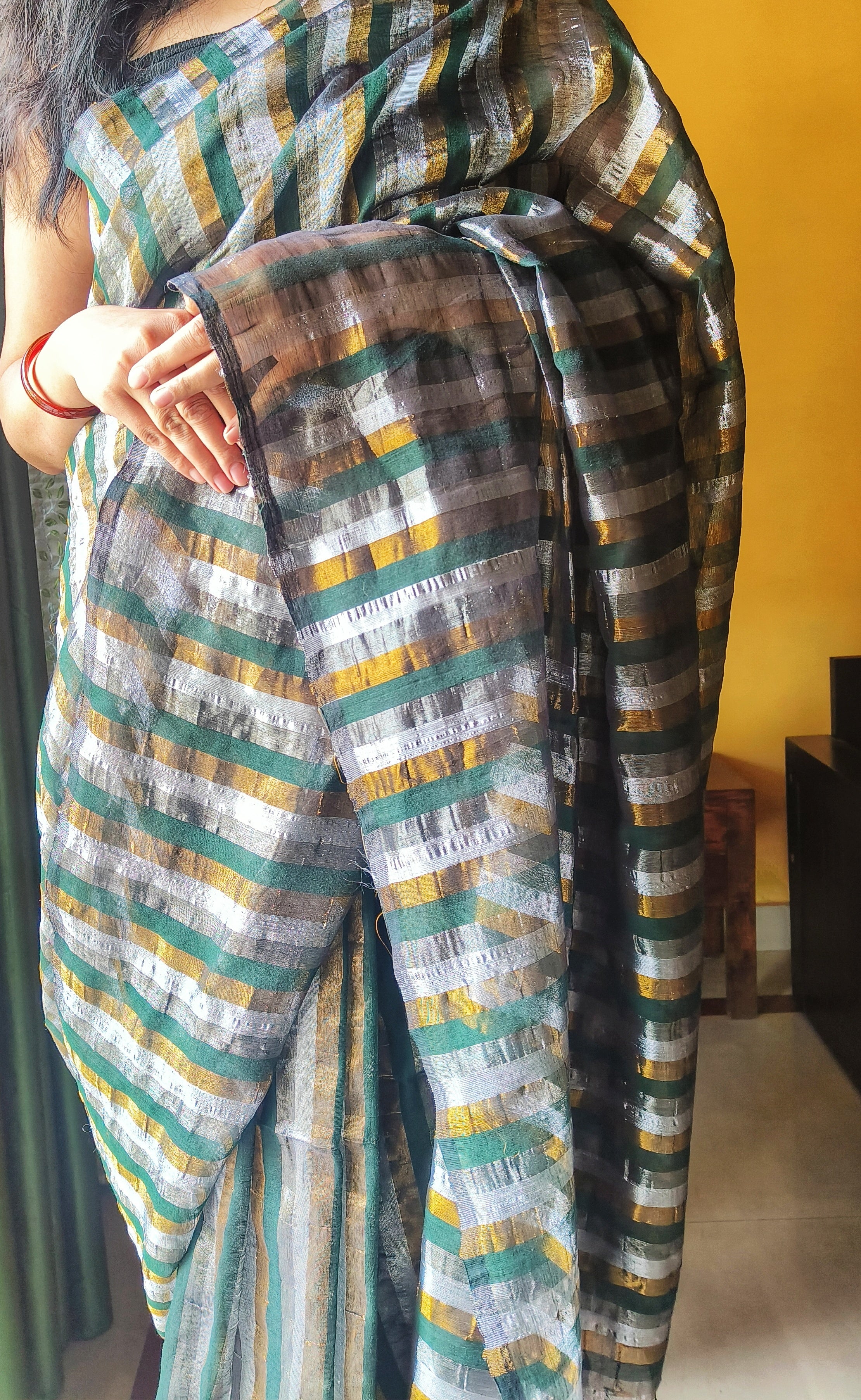 Material: Pure mulmul with pure silver golden tested zari strips all over. This is a very comfortable saree for summers.