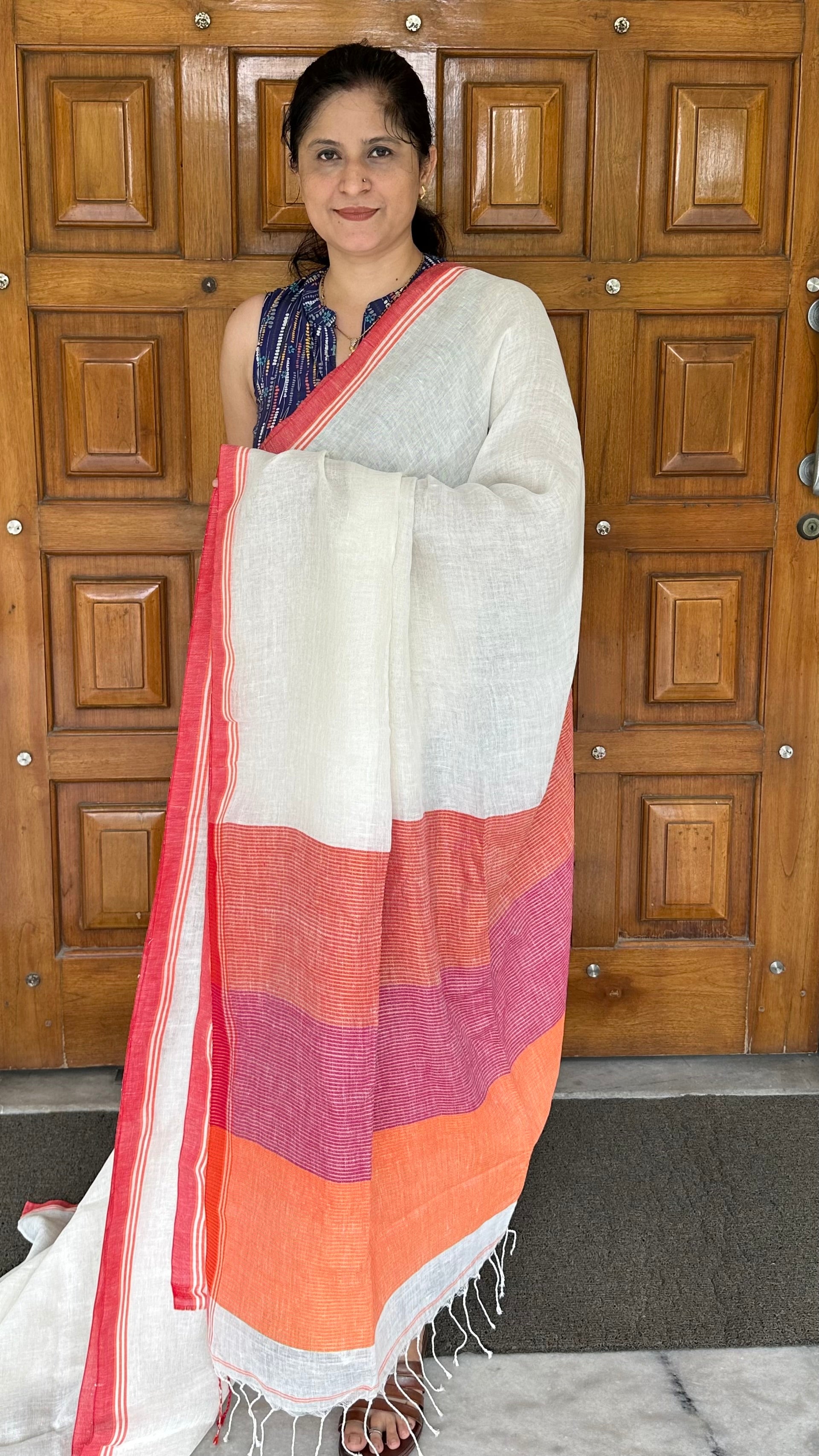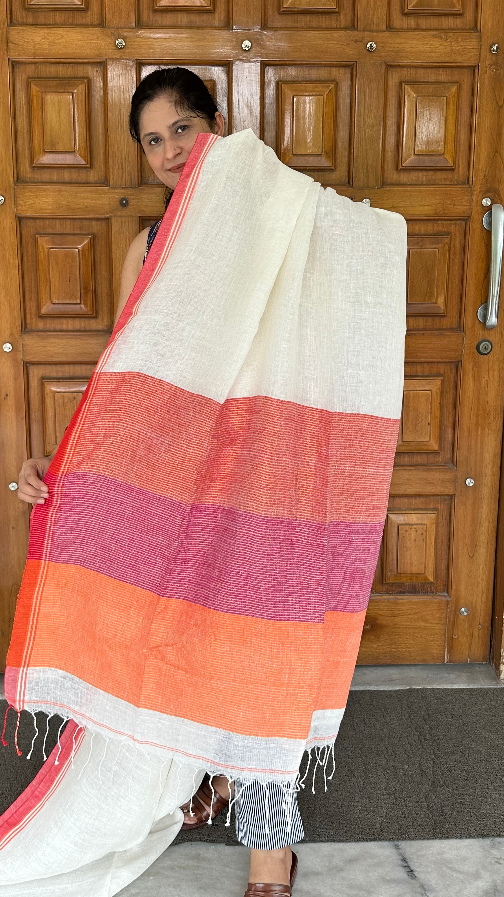 White Plain Linen Handloom Saree with Multicoloured Pallu and red borders