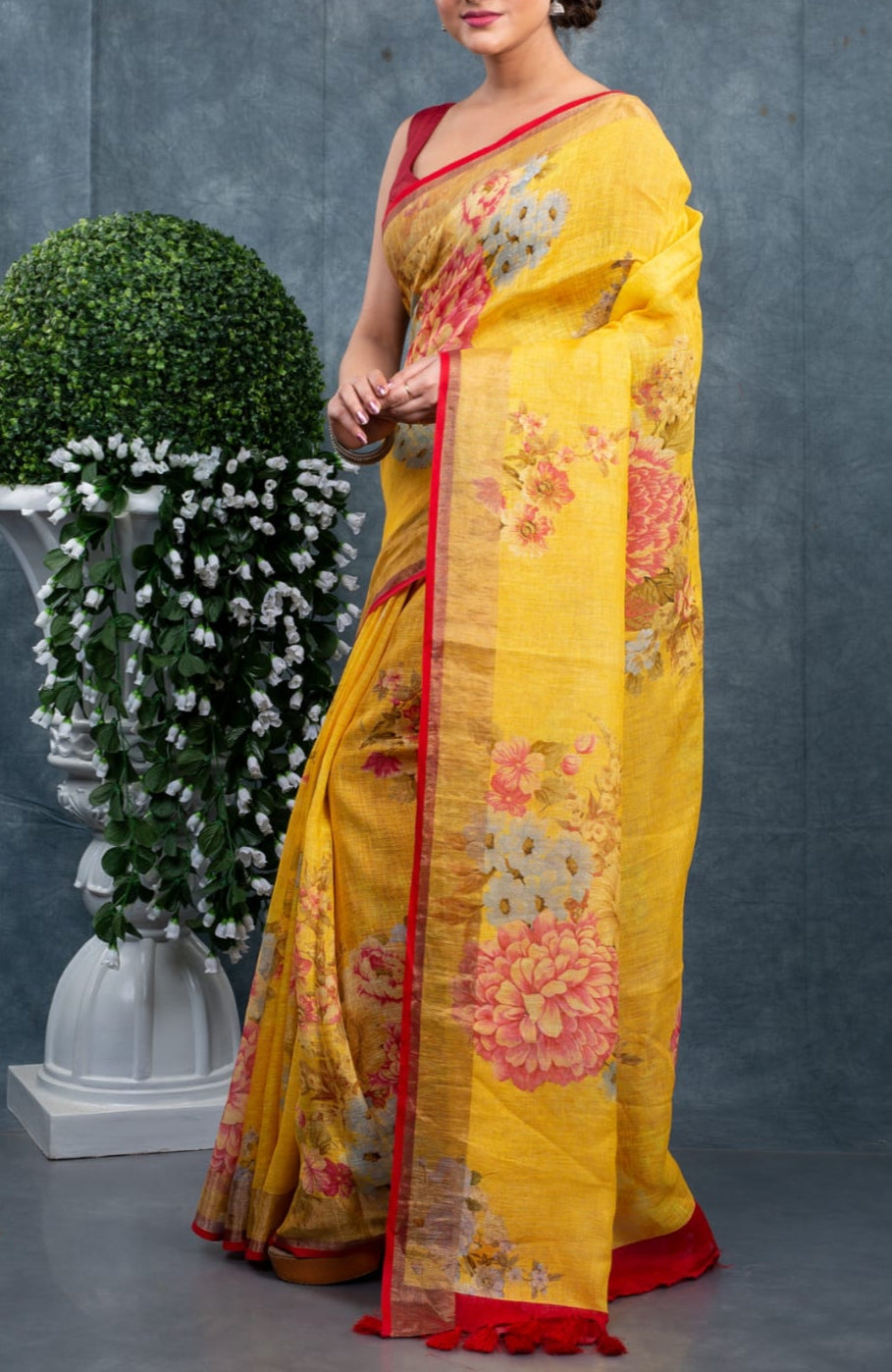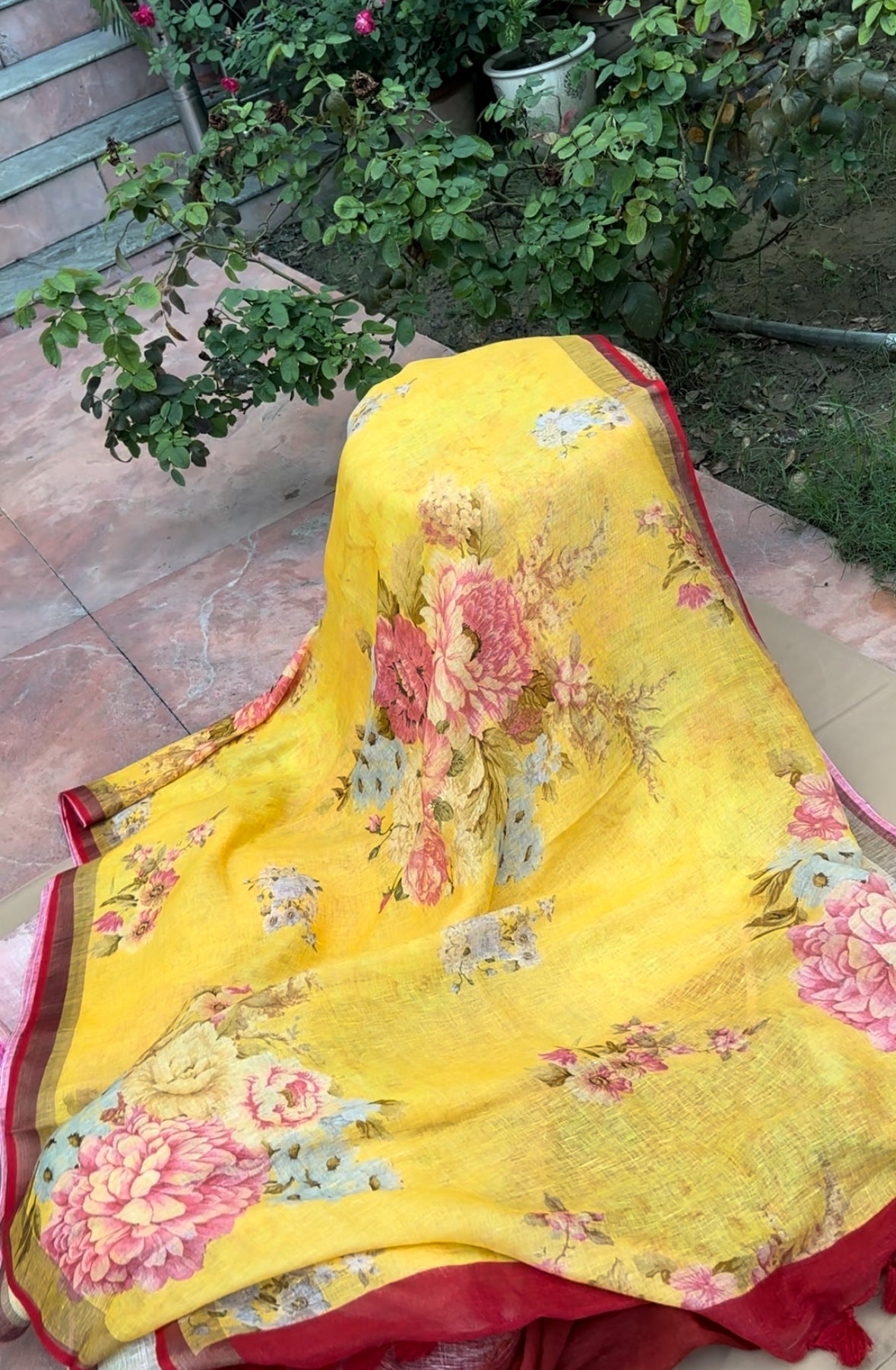 Material: Pure Jayshree Handloom Linen by Linen Saree. It has peach flowers digital Print. Saree has zari border and pallu has tassles. This is very soft saree easy to drape. No hassles in making pallu. If you love some unique sarees this one is for you.