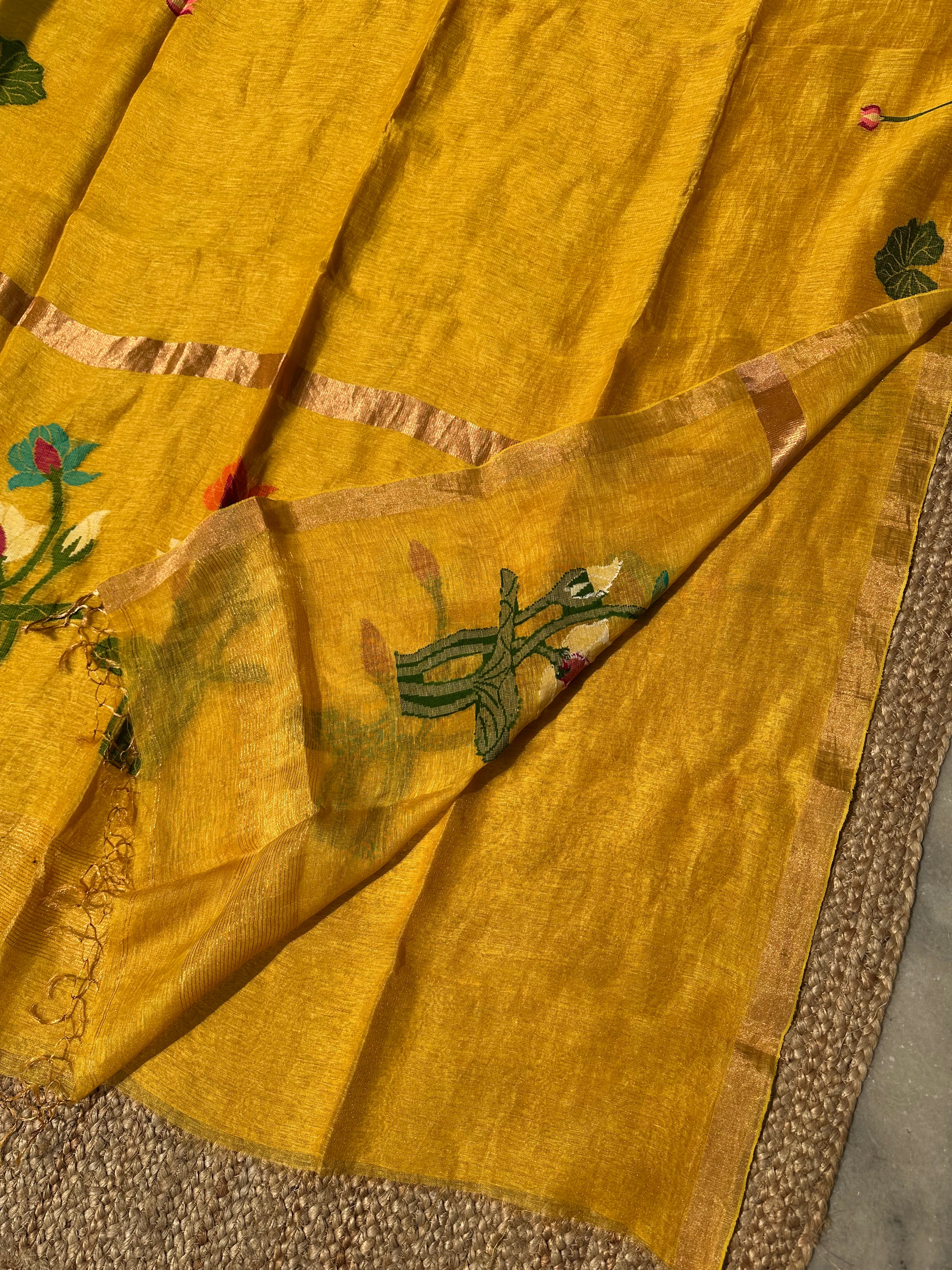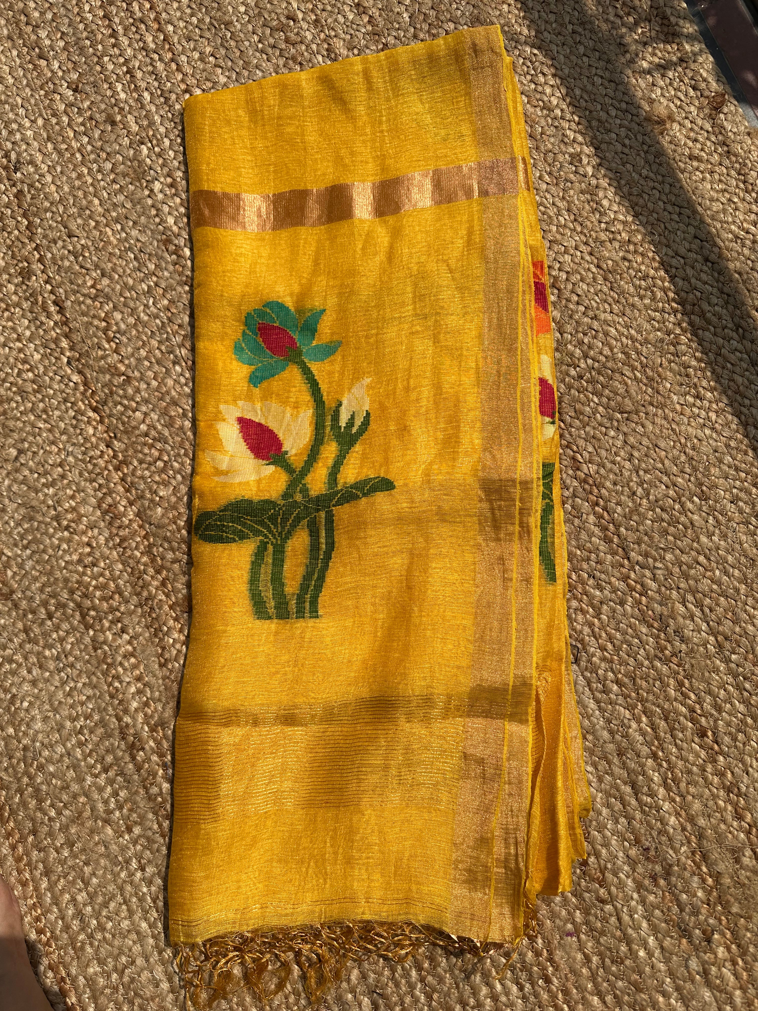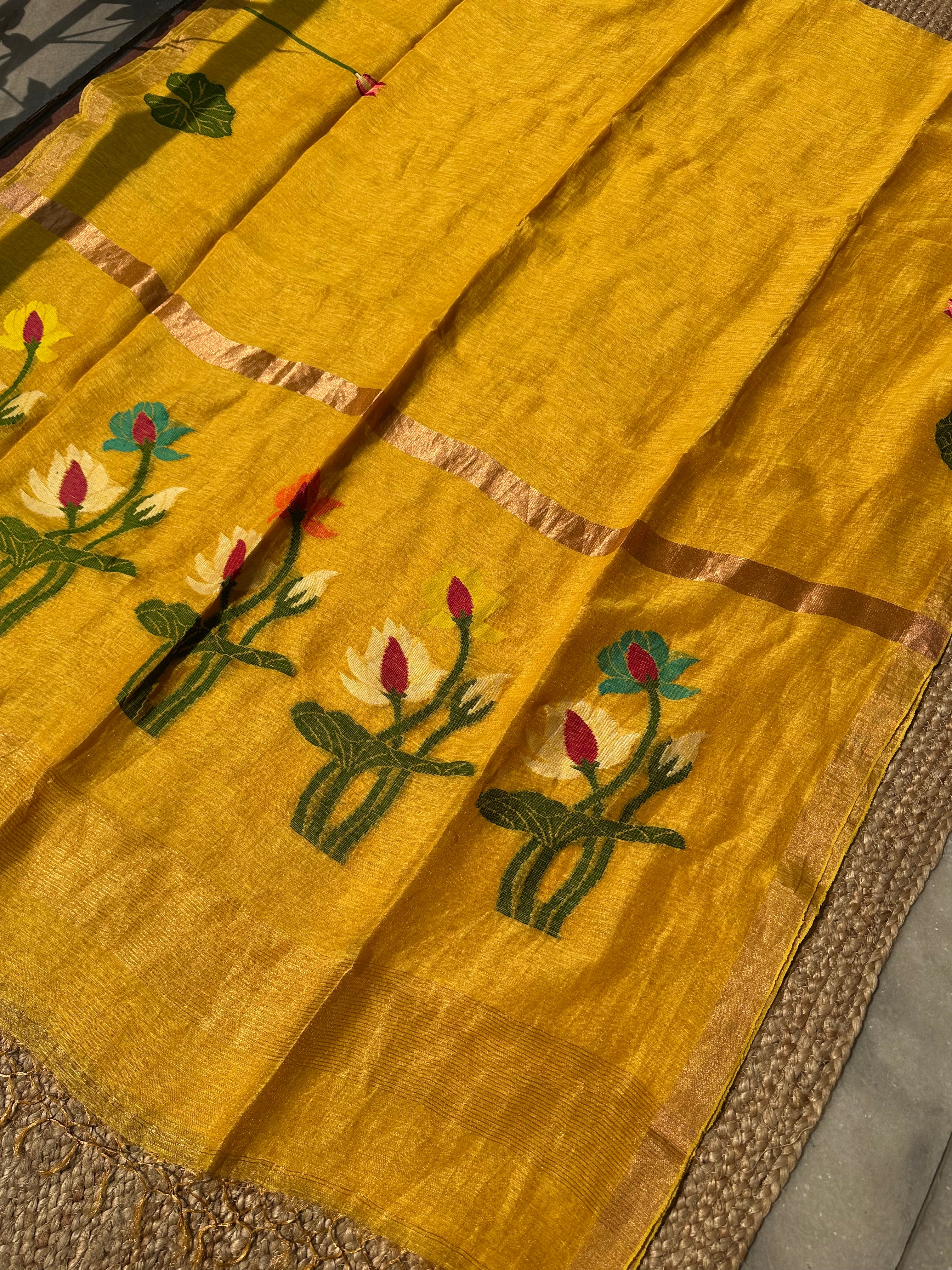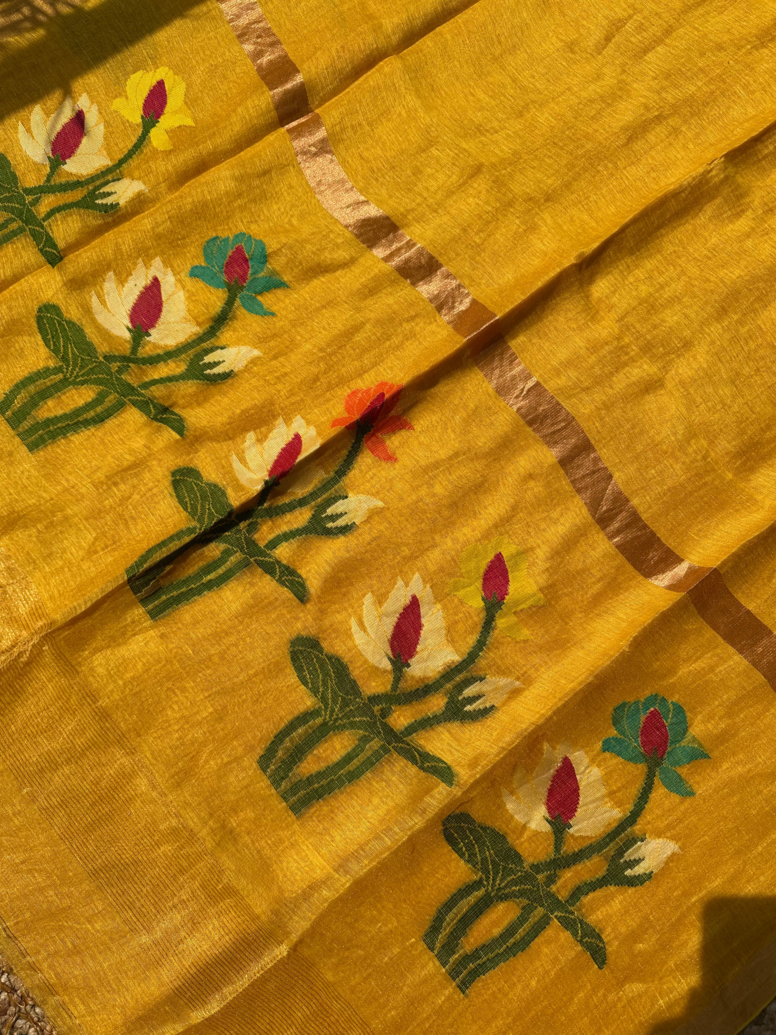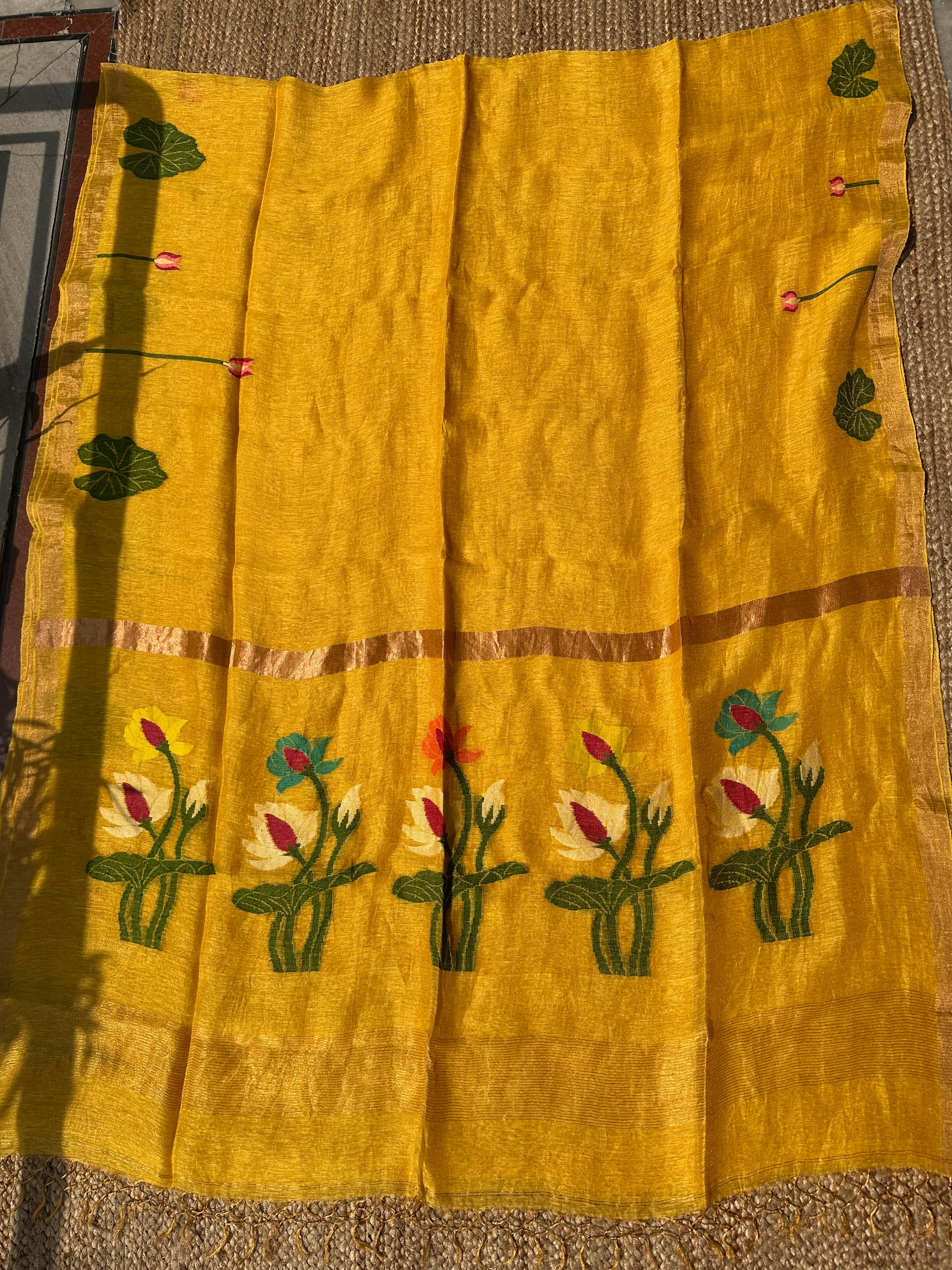 Material: Pure Jayshree Linen Silk saree. The warp and weft are of pure linen and pure silk. Premium saree for any occasion. It is handloom sarees with handwoven Jamdani work. The borders have Lotus and leaves handwoven. Pallu has multi colour flowers and zari work. Length of saree is 6.5 mtrs including running blouse.