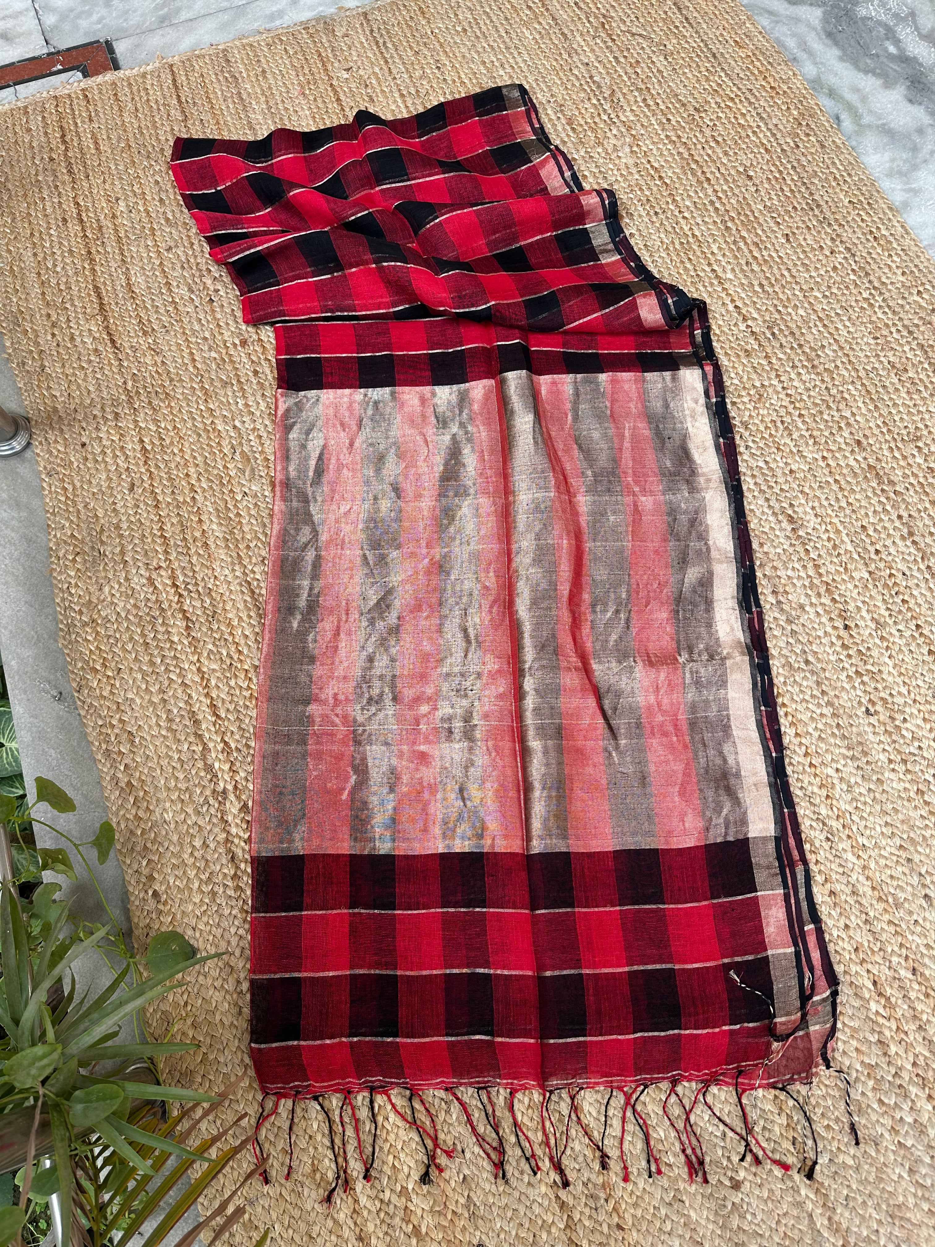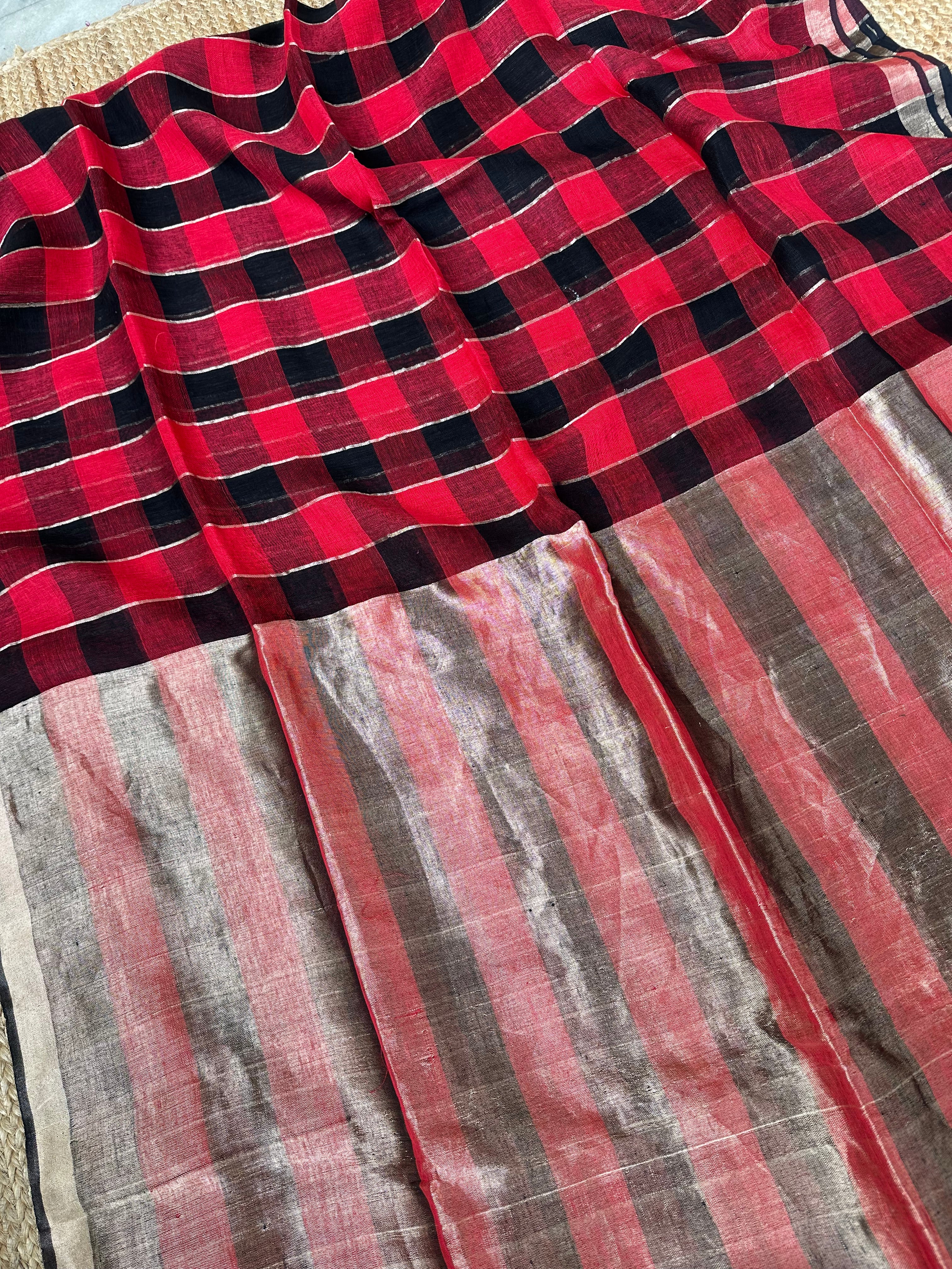 Red Linen Handloom Small Checks Silver Pallu Saree