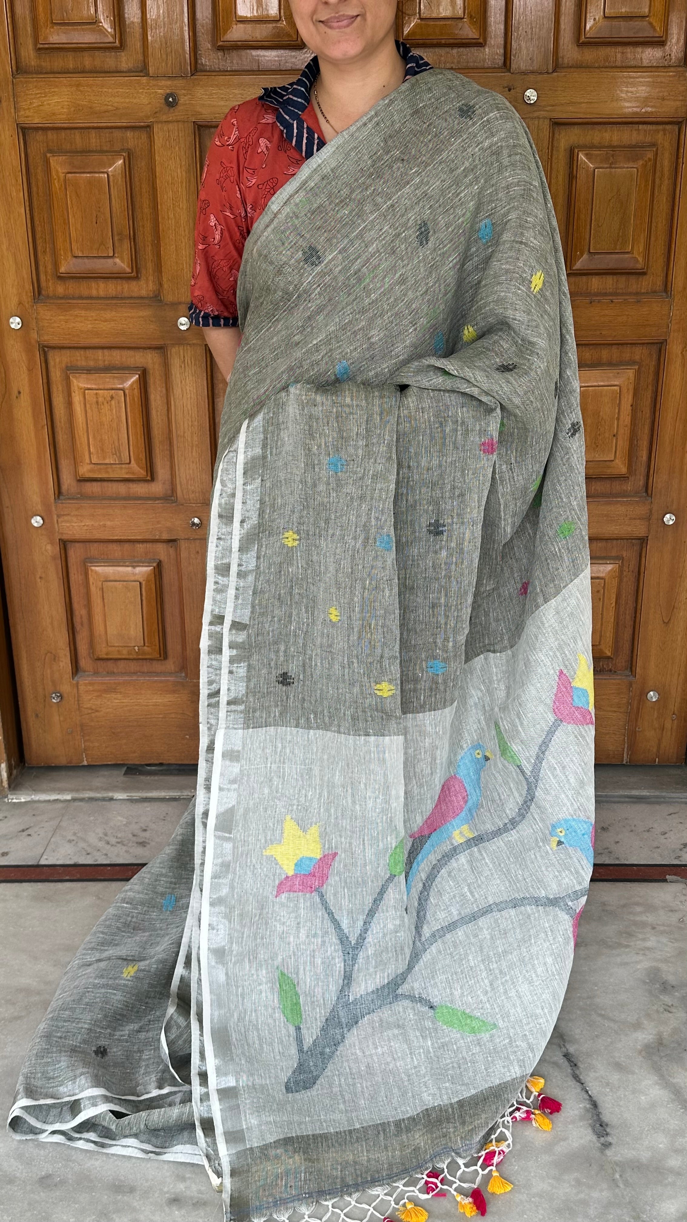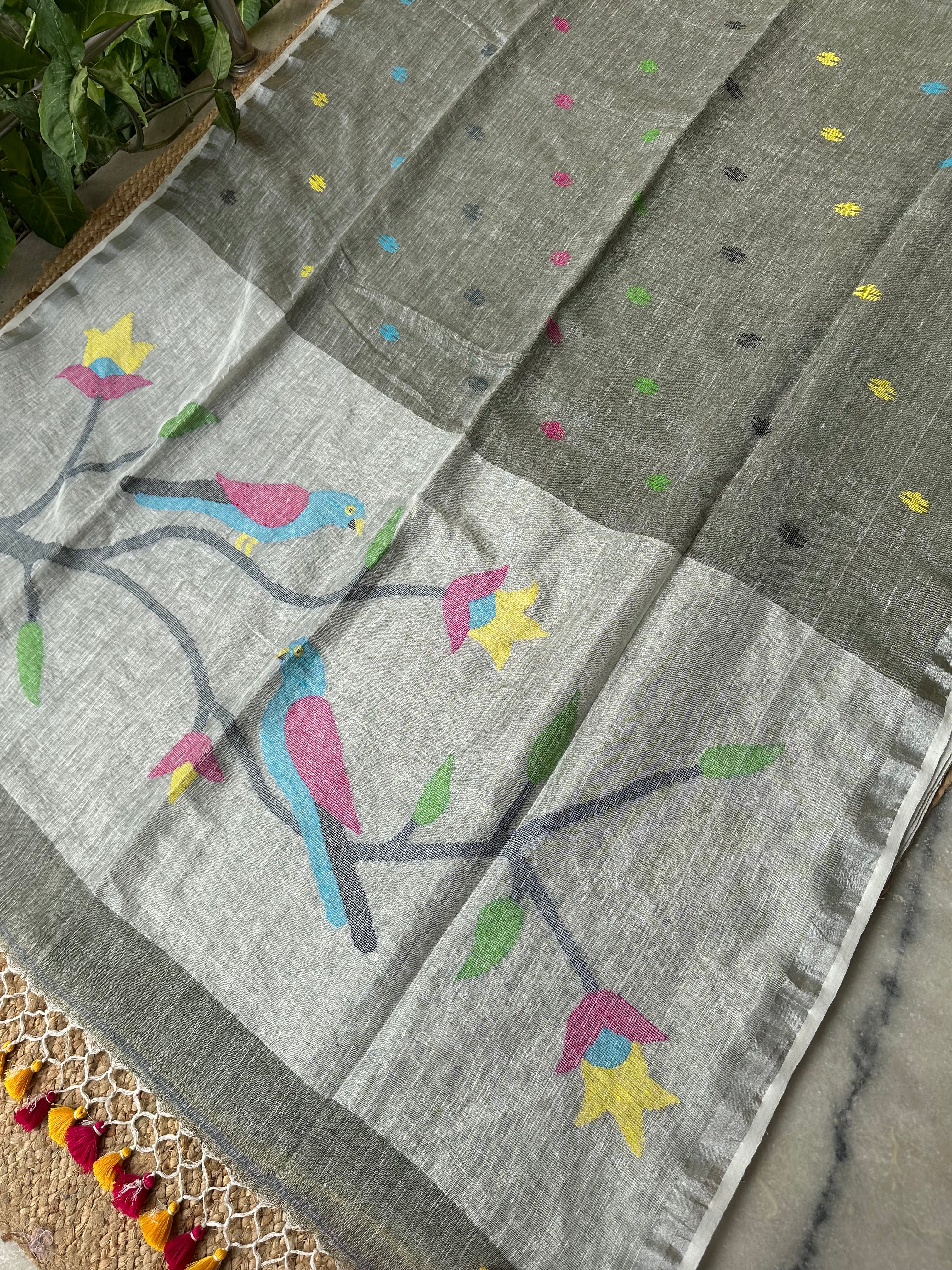 Grey Silver Paithani Linen Handloom Saree