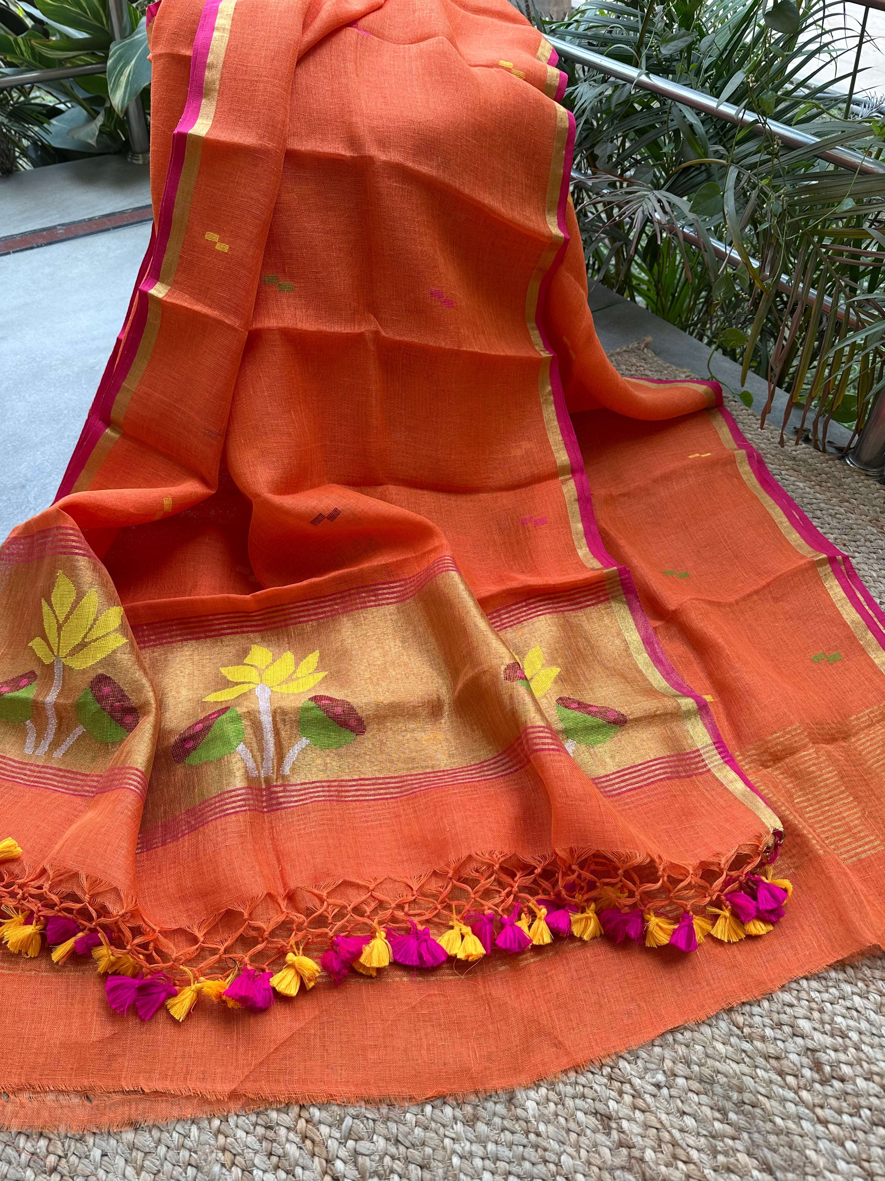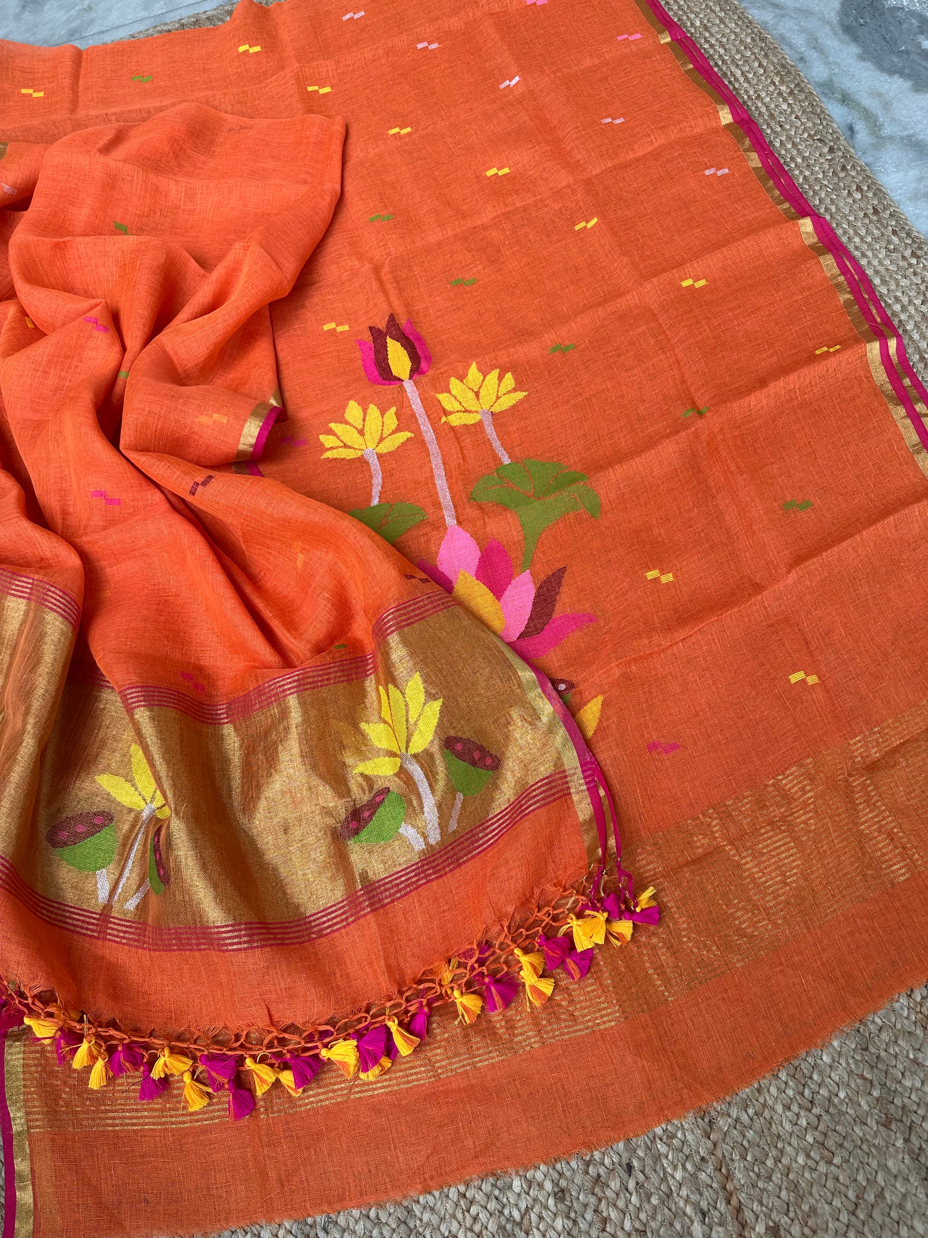 Orange Linen Tissue Handloom Paithani Jamdani Pallu Saree