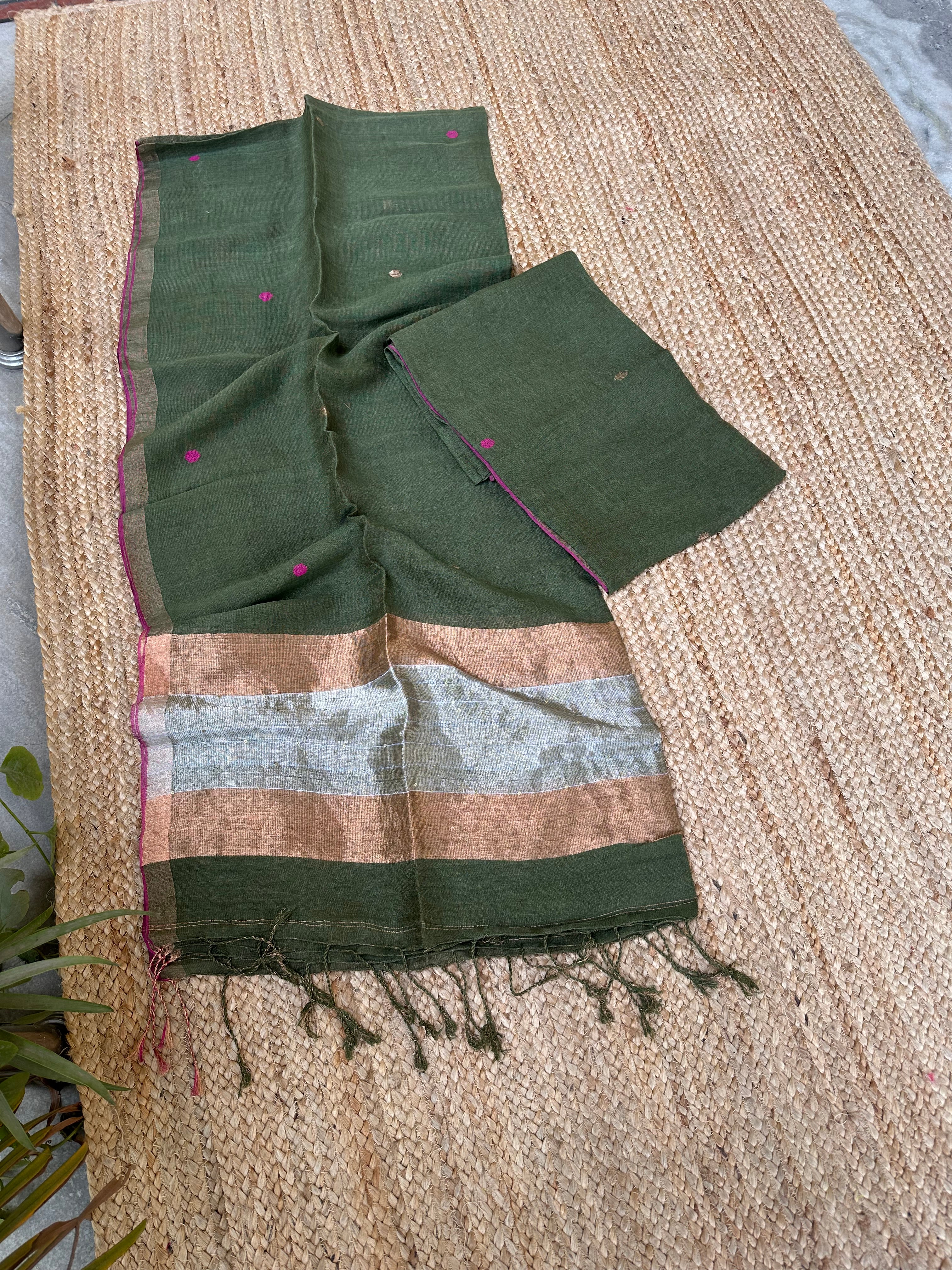 Olive Green Linen Zari Handloom Kurta Dupatta Set