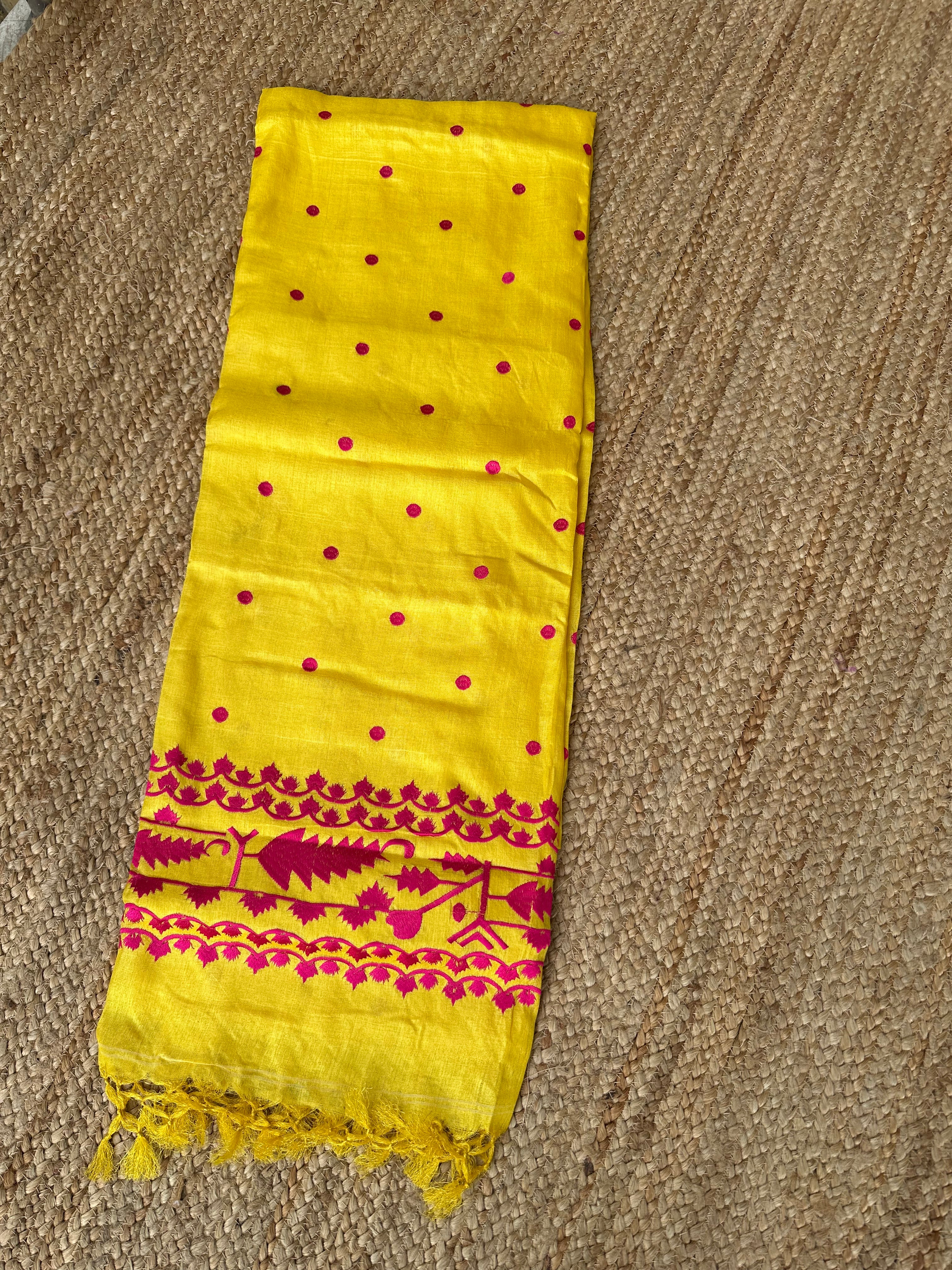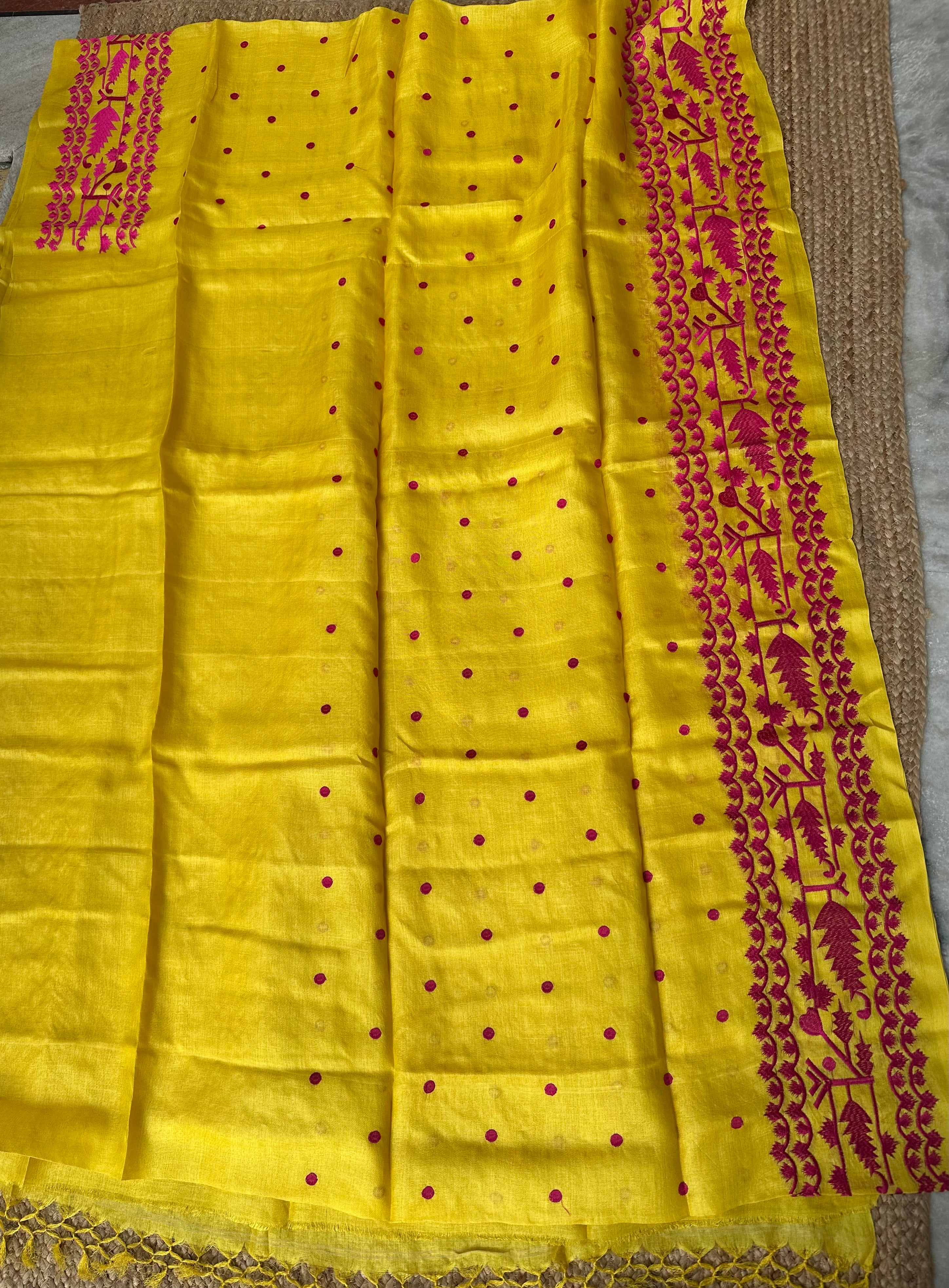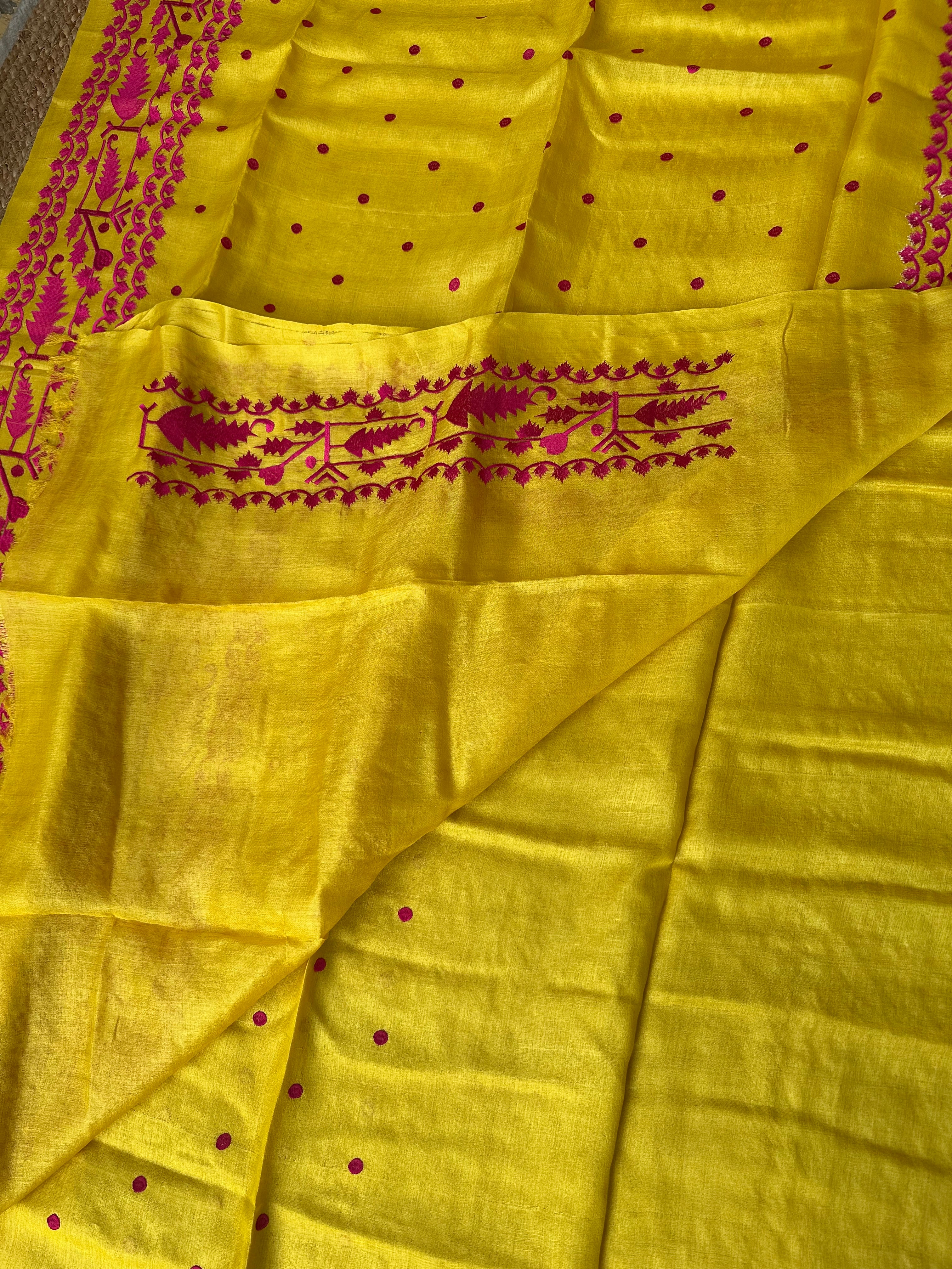 Pure Tusser Handloom Yellow saree with Pink Embroidery