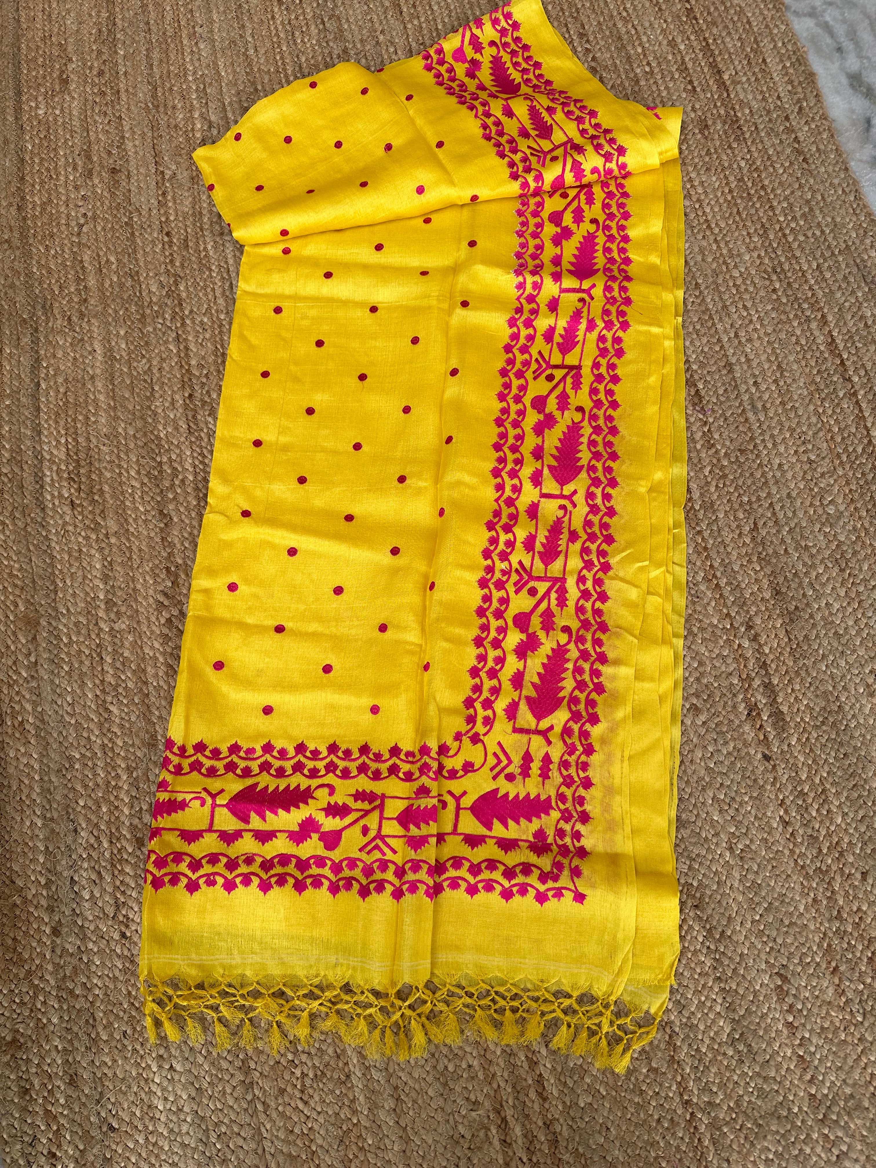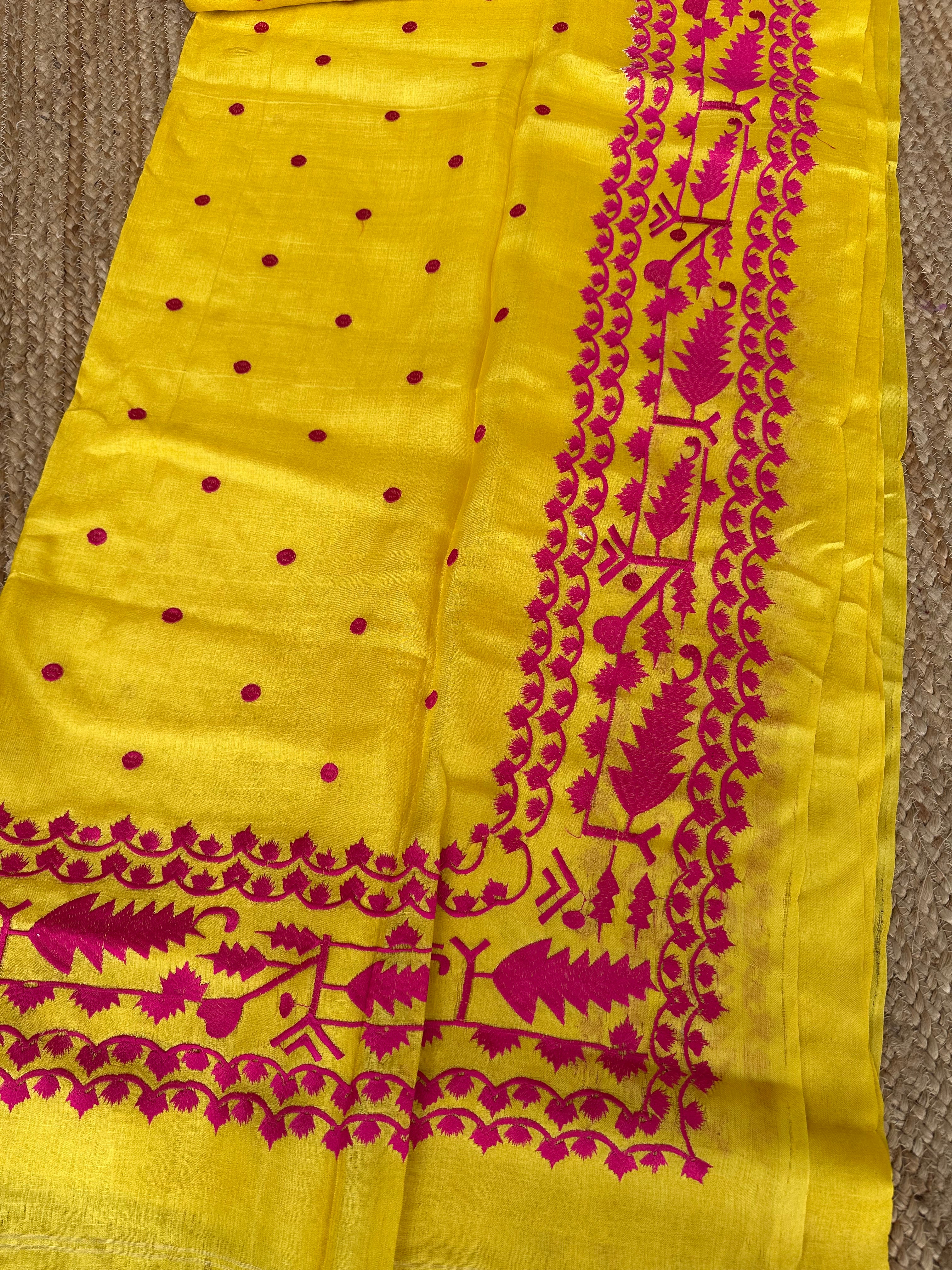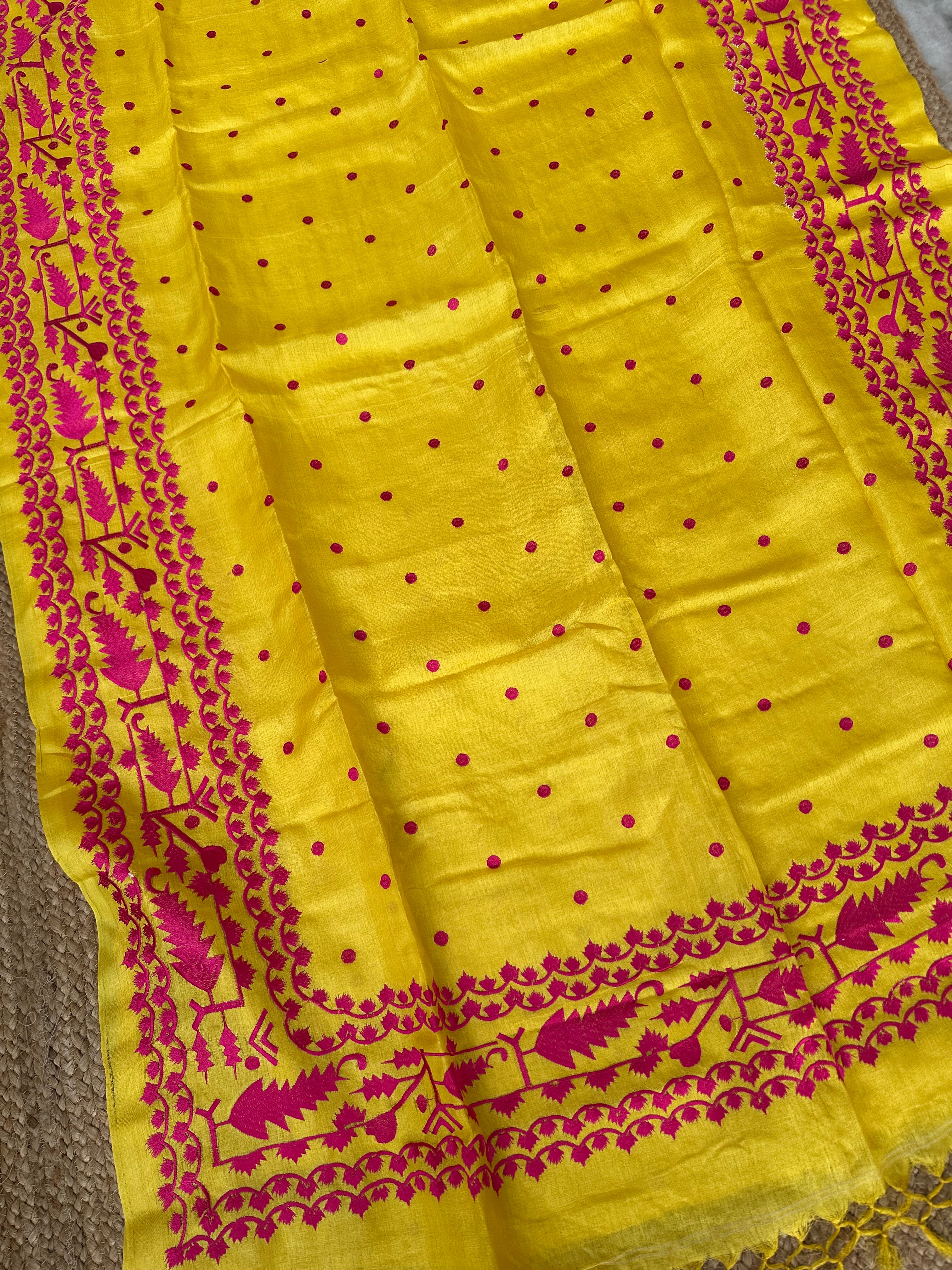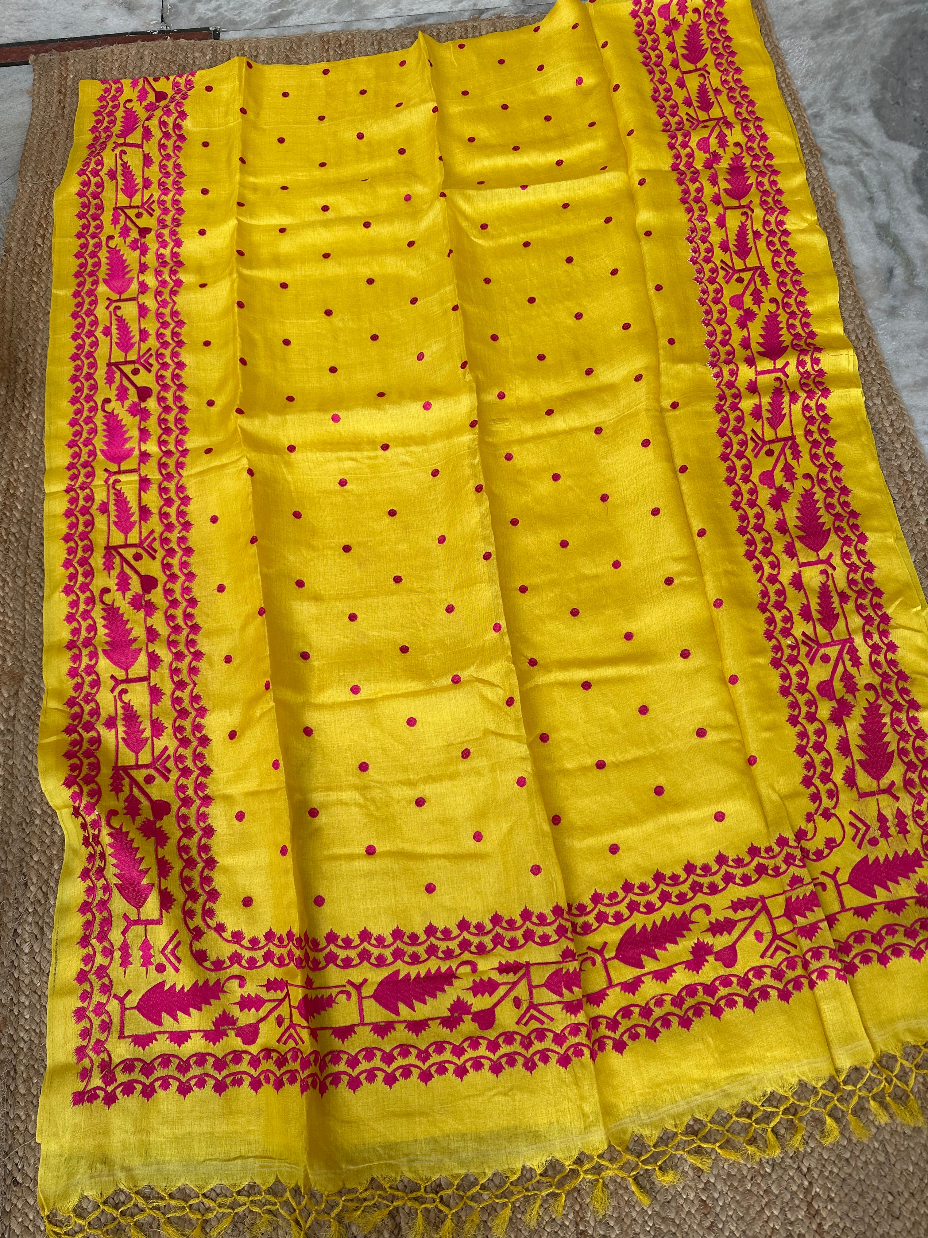 Pure Tusser Handloom Yellow saree with Pink Embroidery