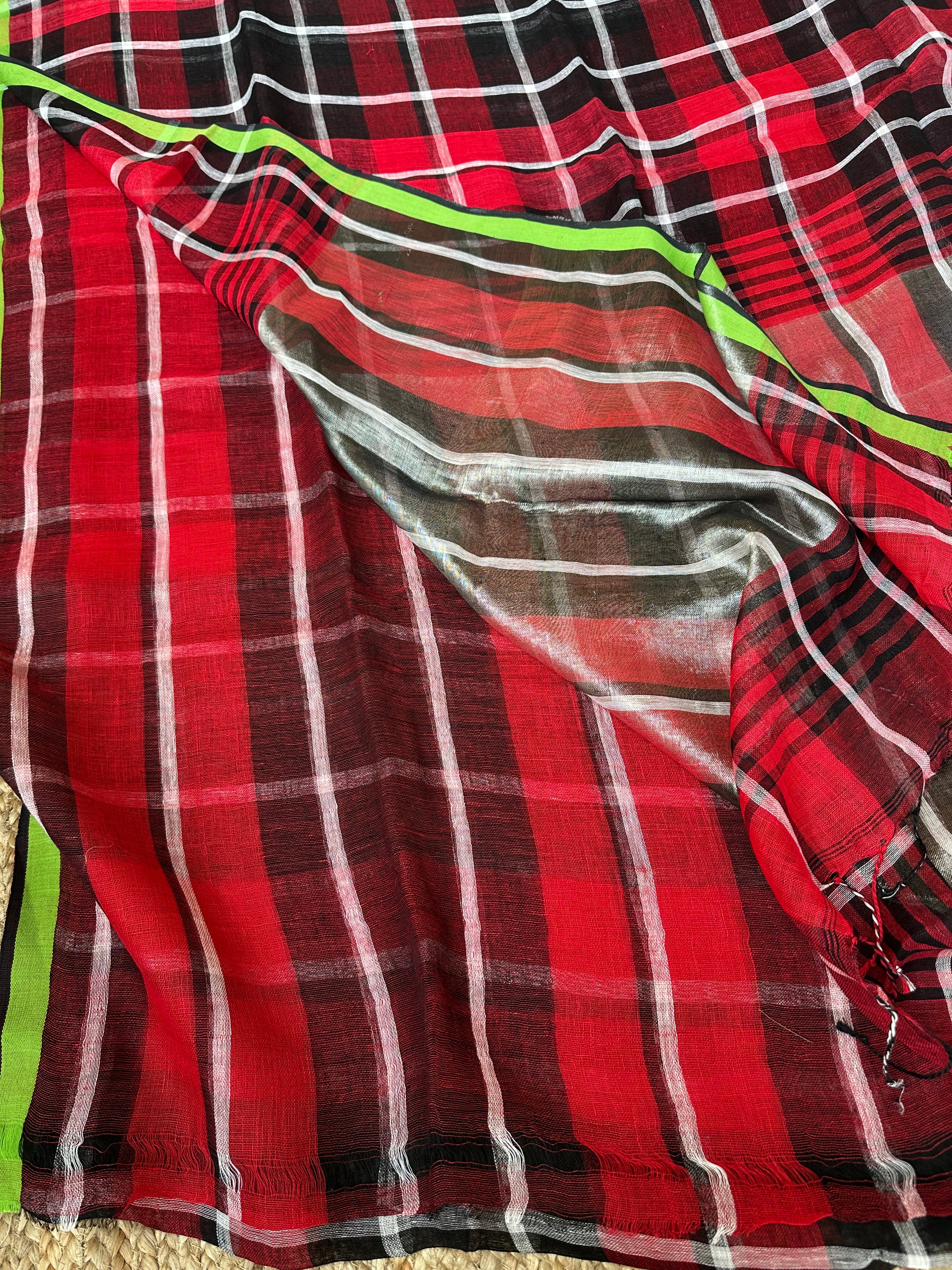 Pure Linen Handloom Red Black checks Saree