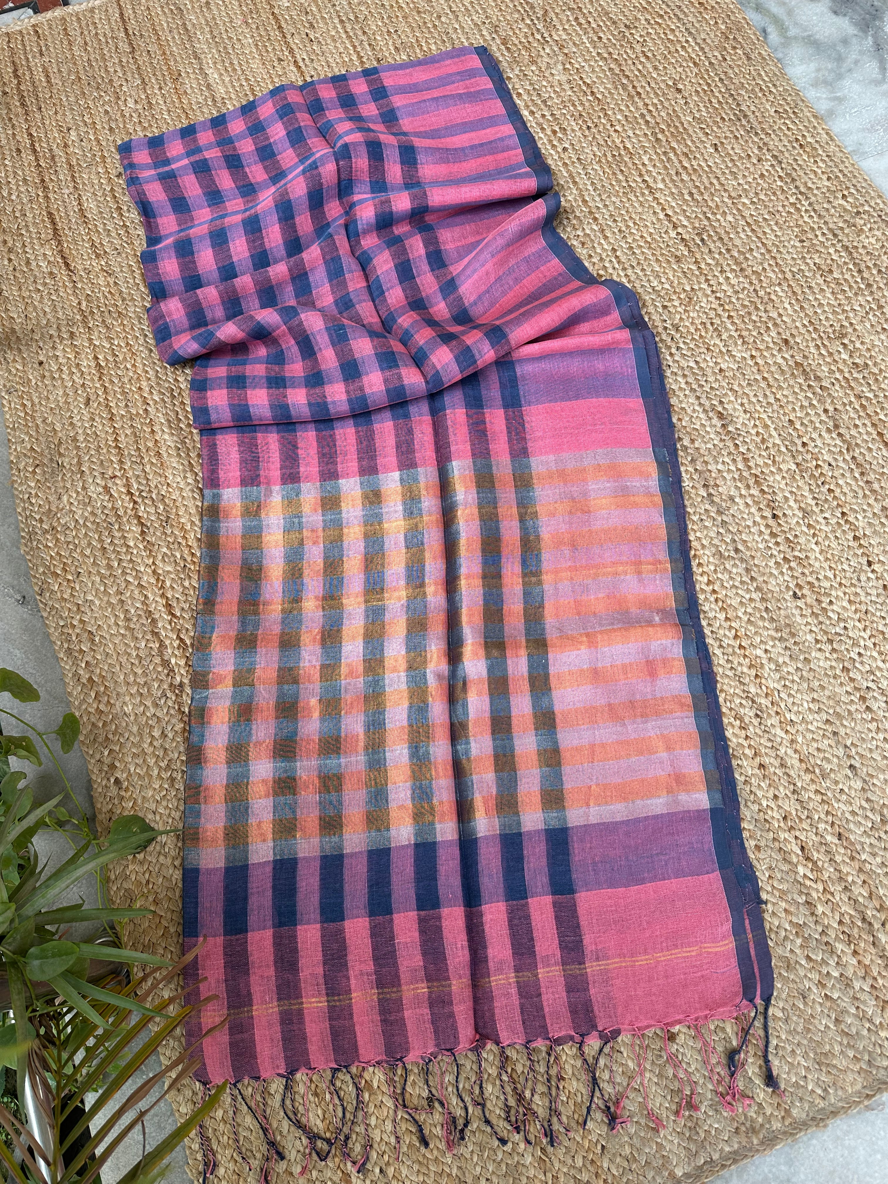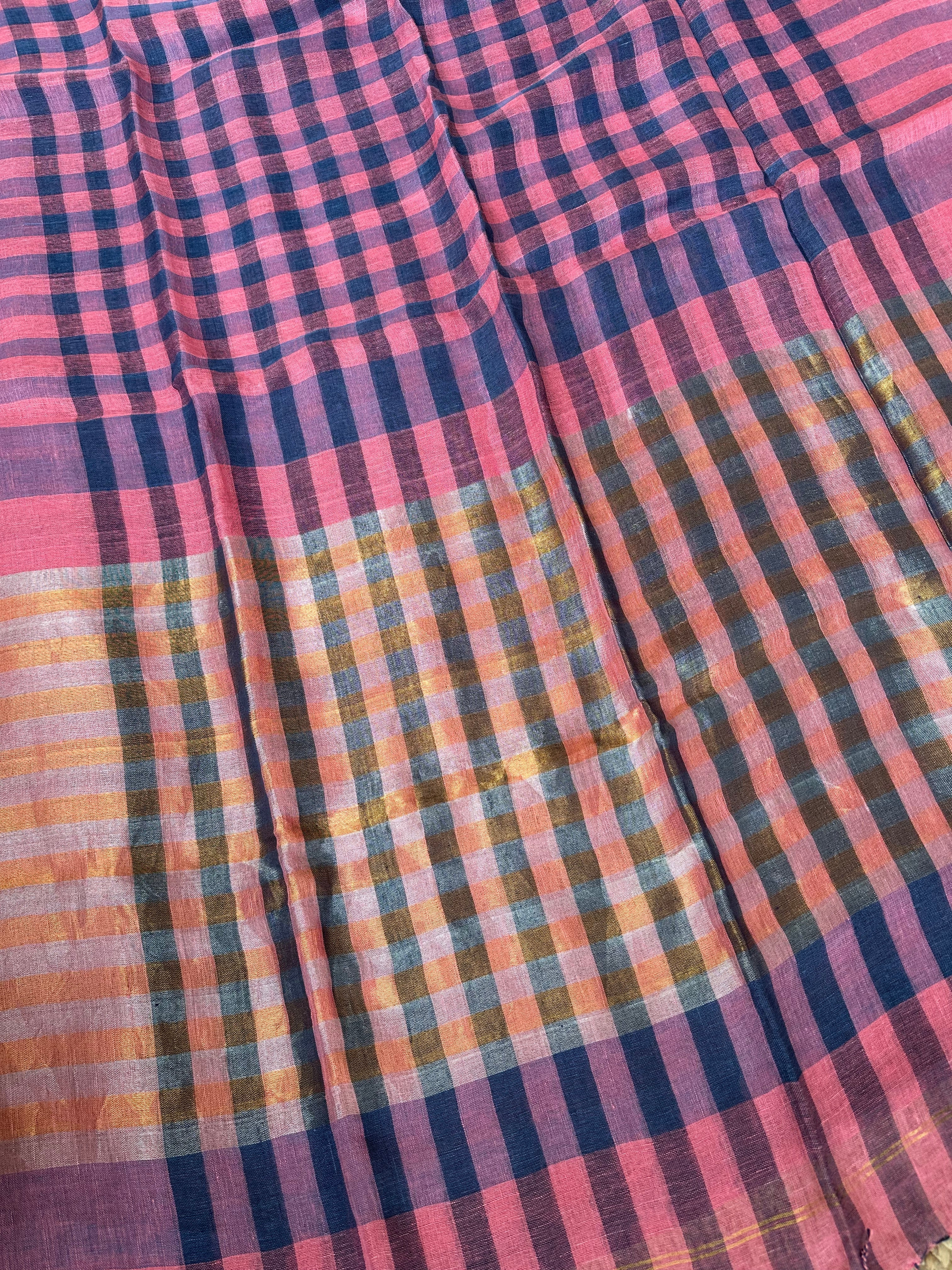 Pure Linen Handloom Pink Navy Blue checks Saree