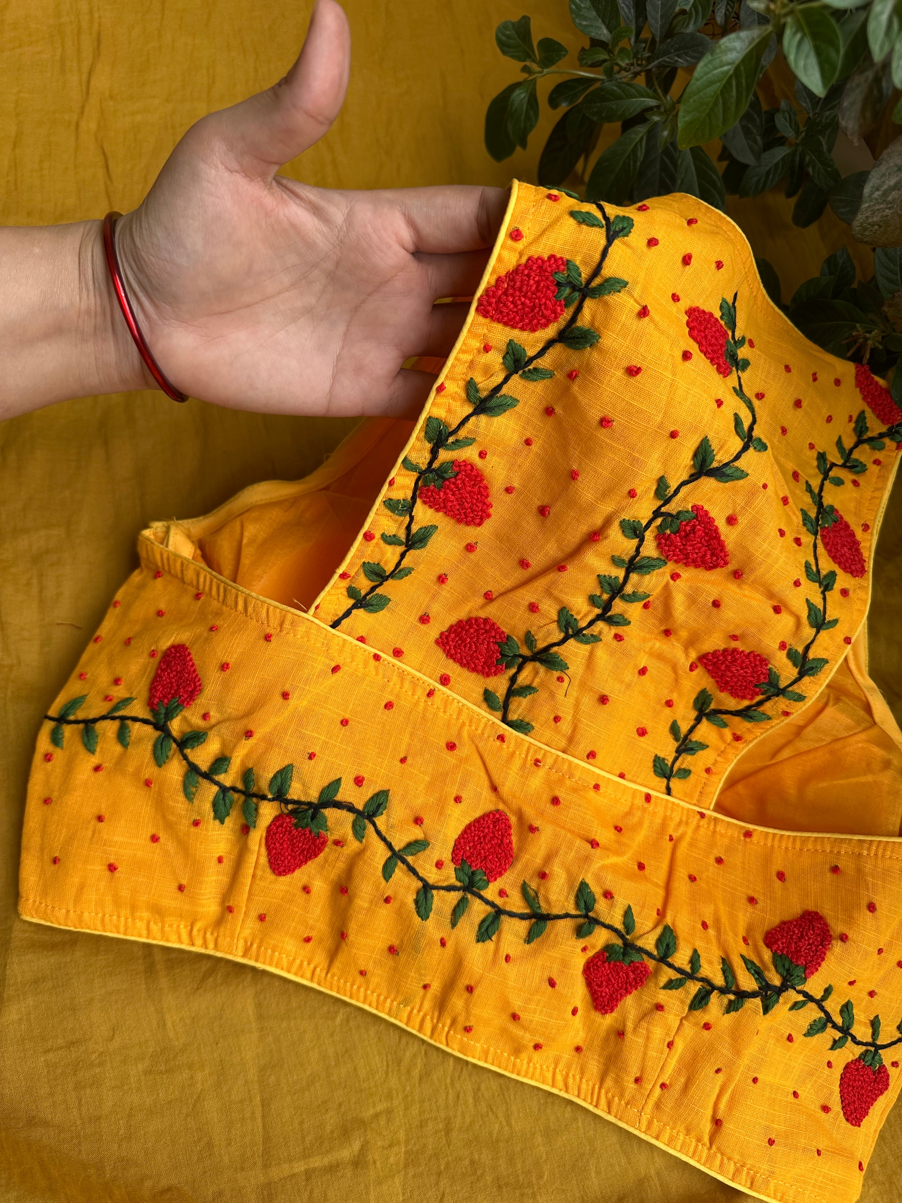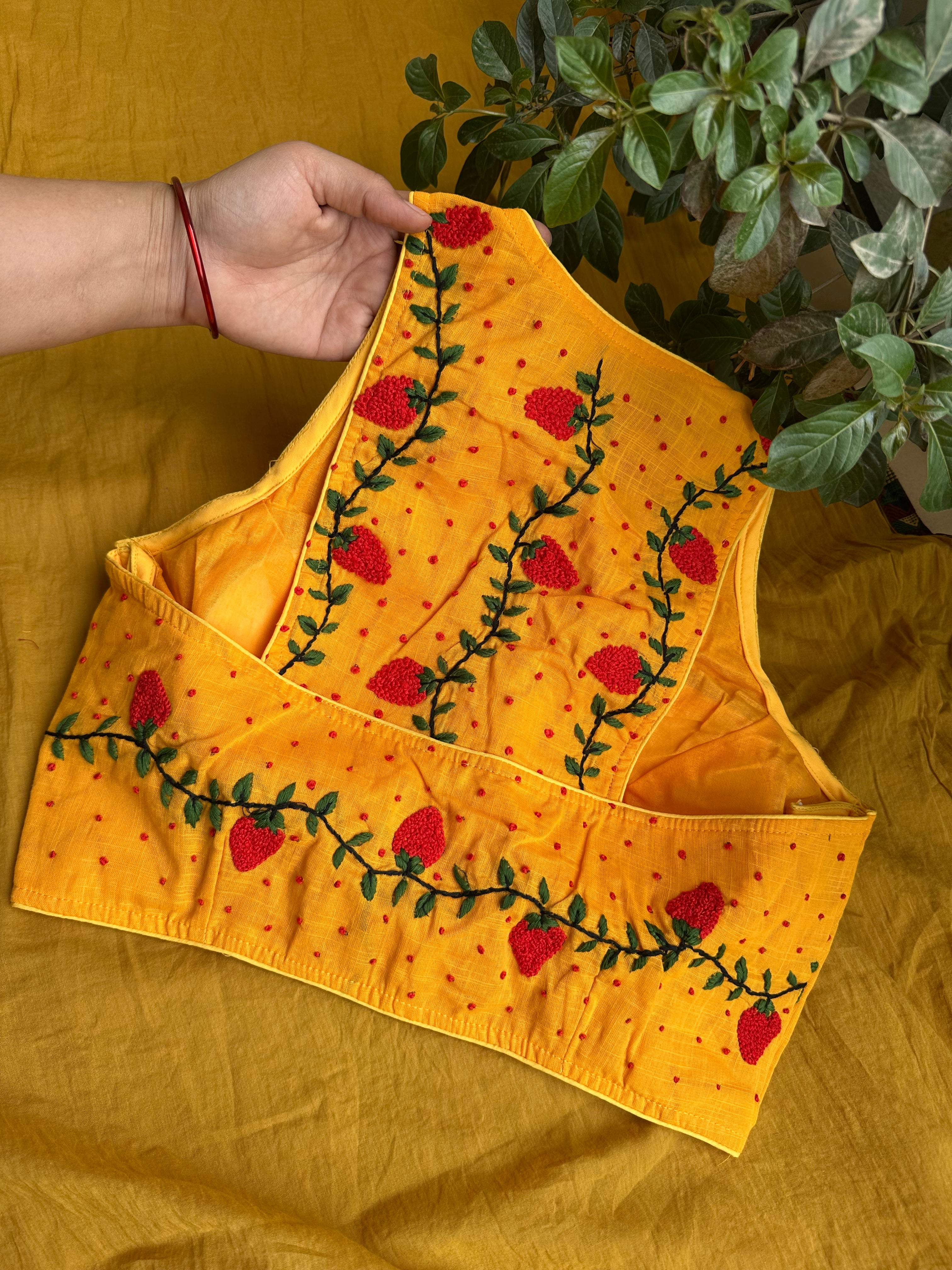 Material: Pure Cotton with embroidered racer back. The strawberry French knots hand embroidery making it a statement blouse.