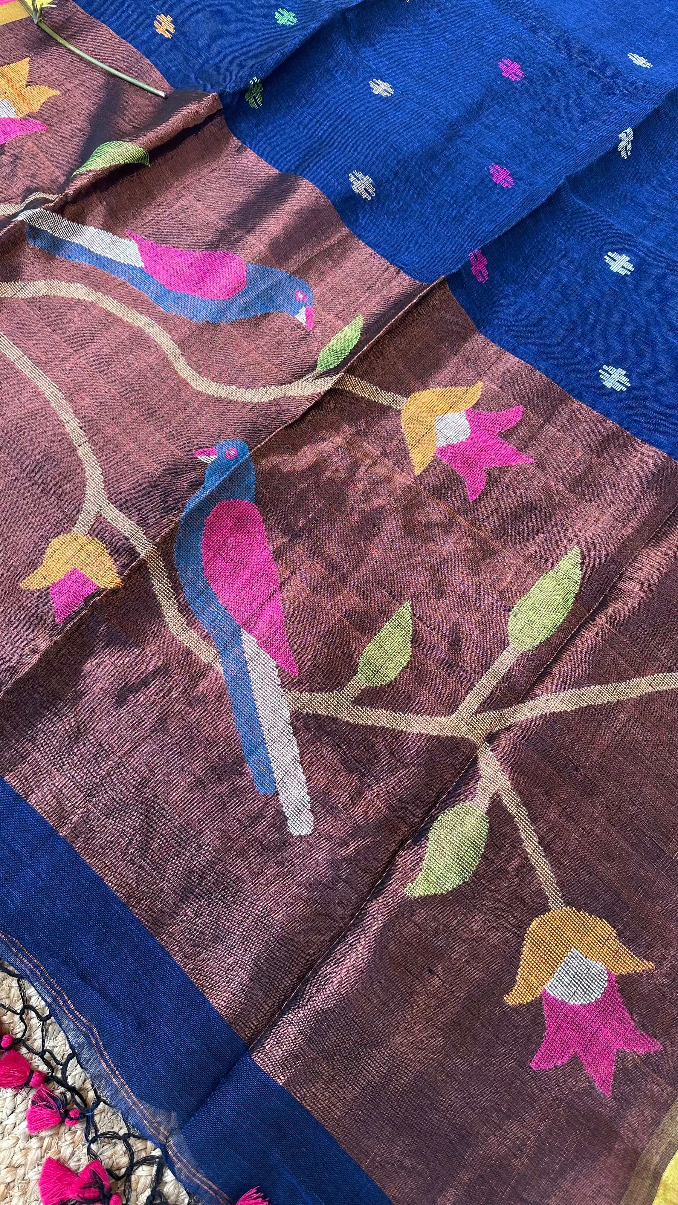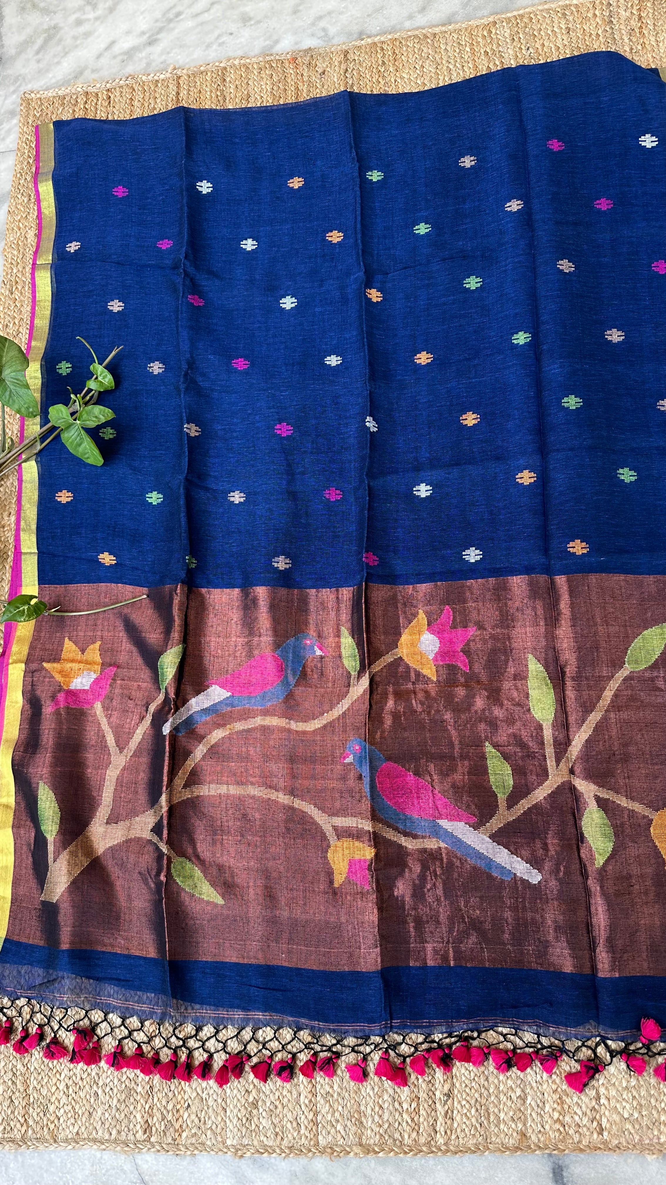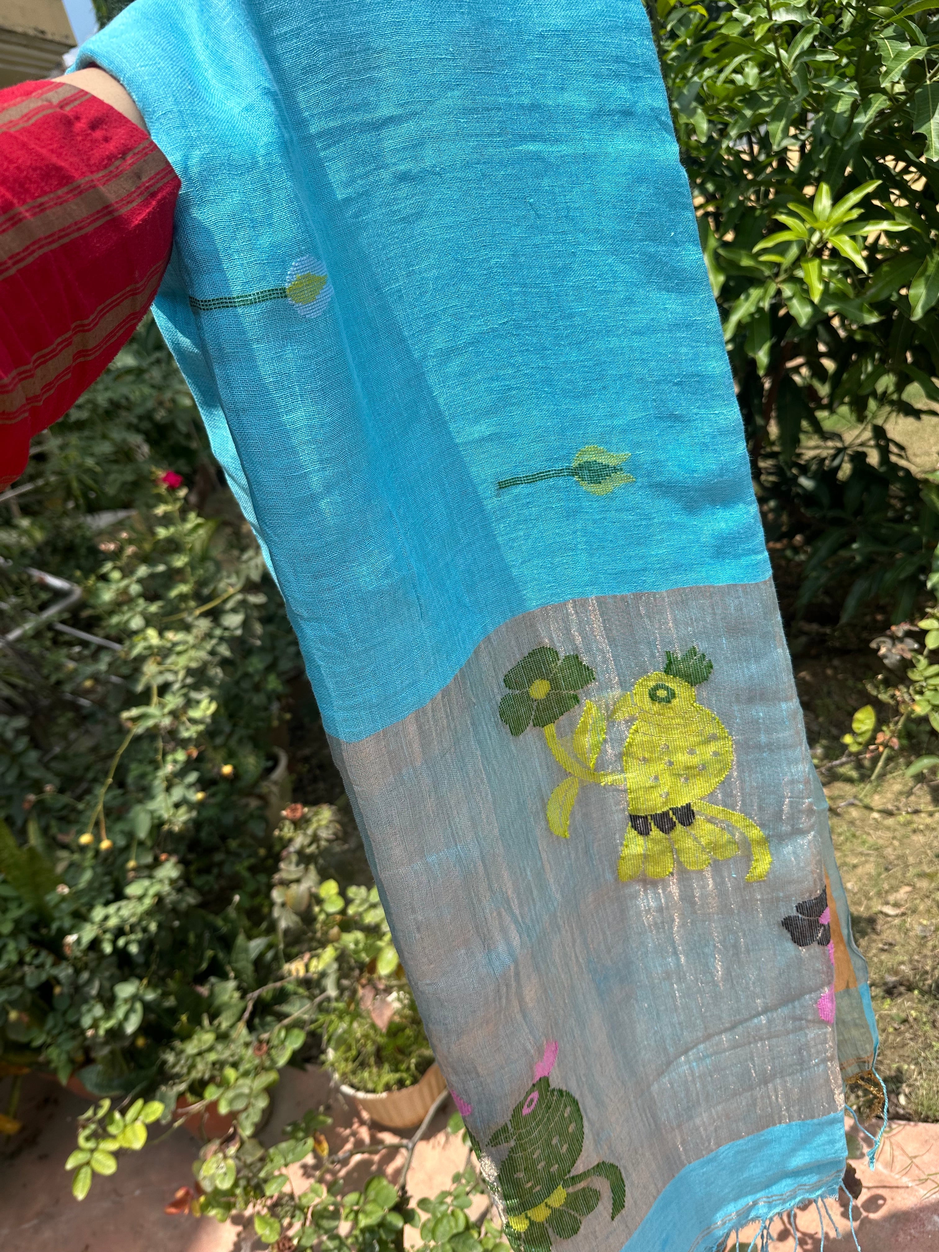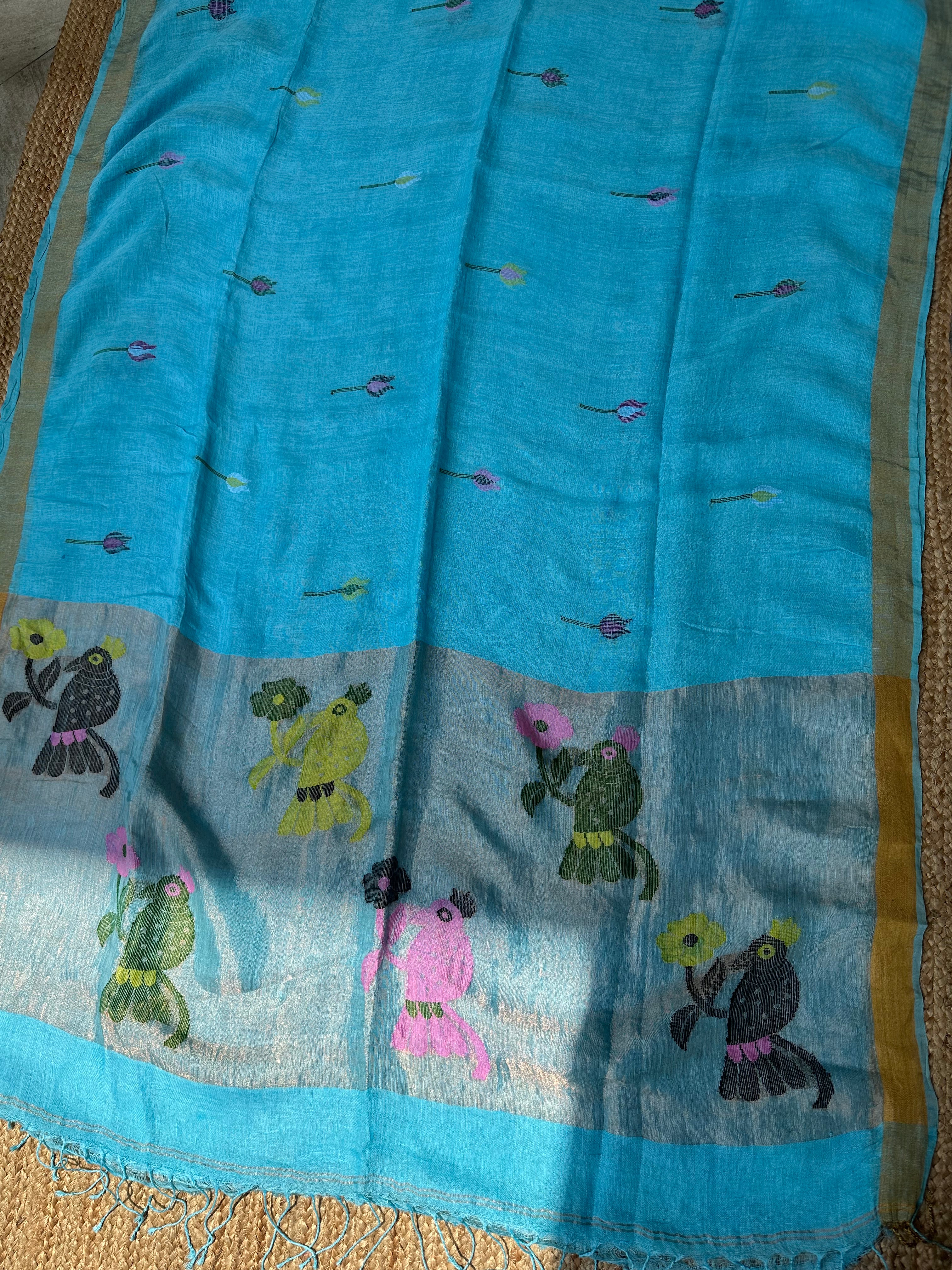Pure Linen Silk Handloom Jamdani Saree Heavy Lotus Leaves Pallu- Dusty Blue