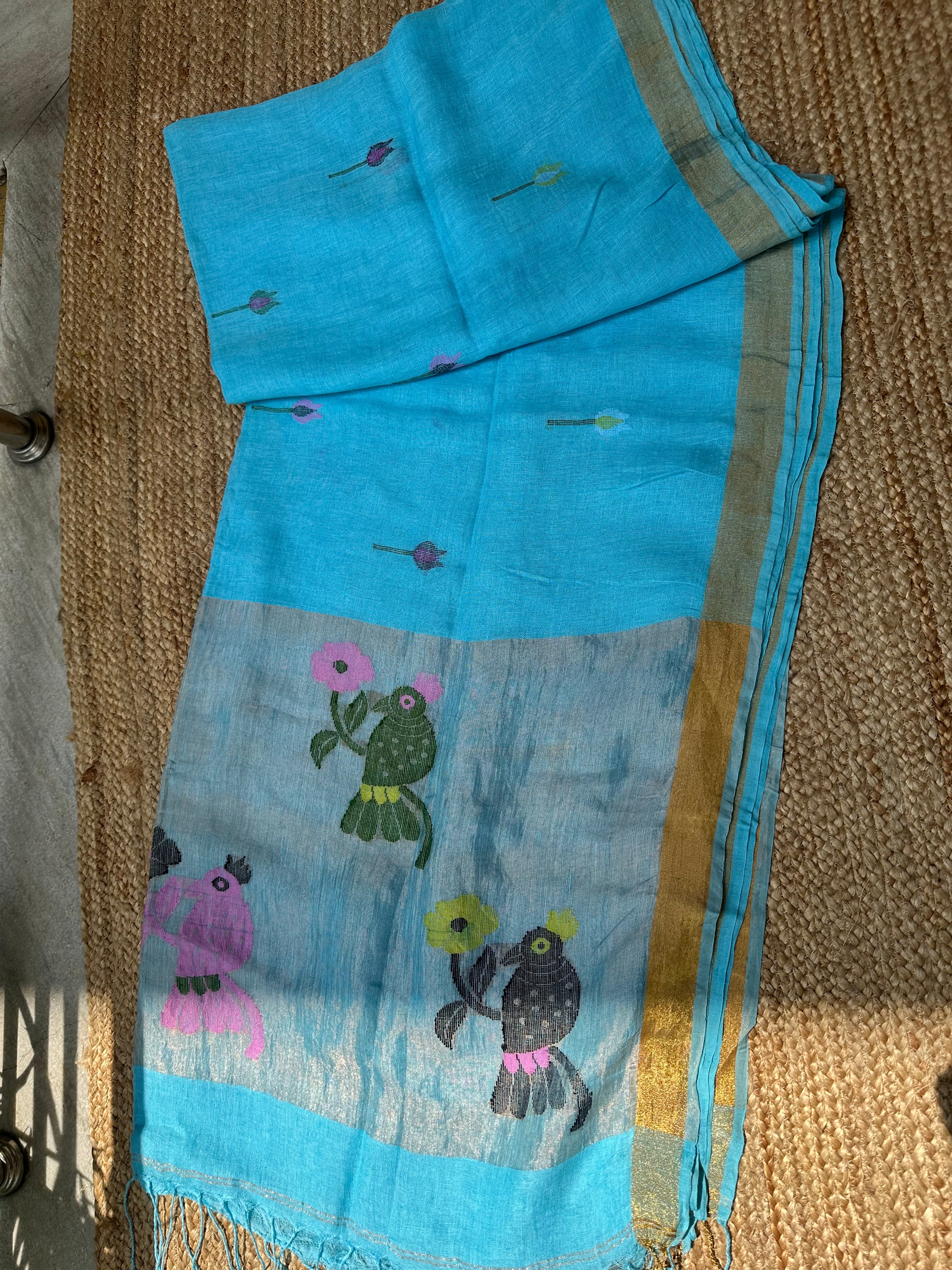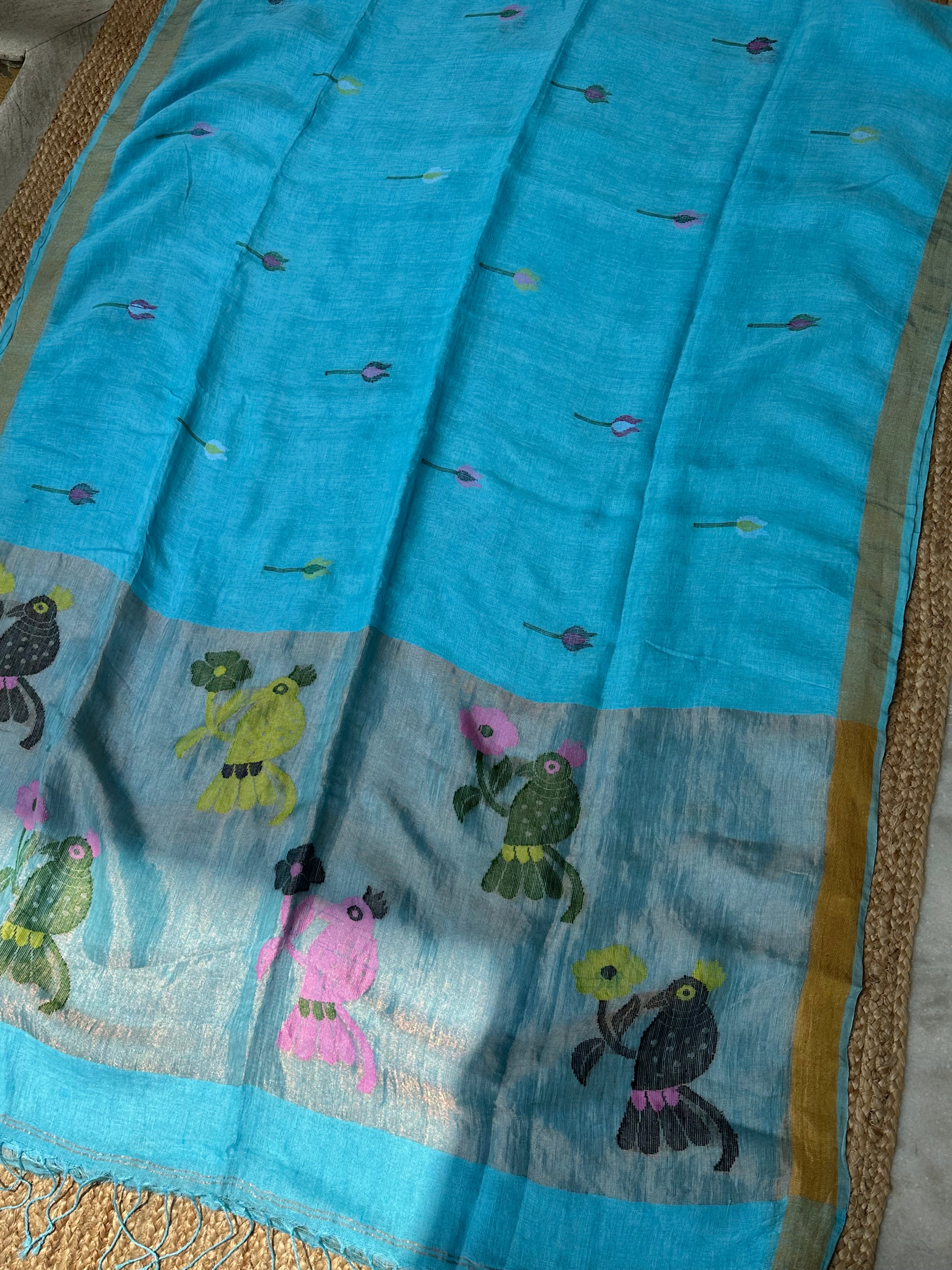 Sky blue Silver Zari Paithani Linen Handloom Saree