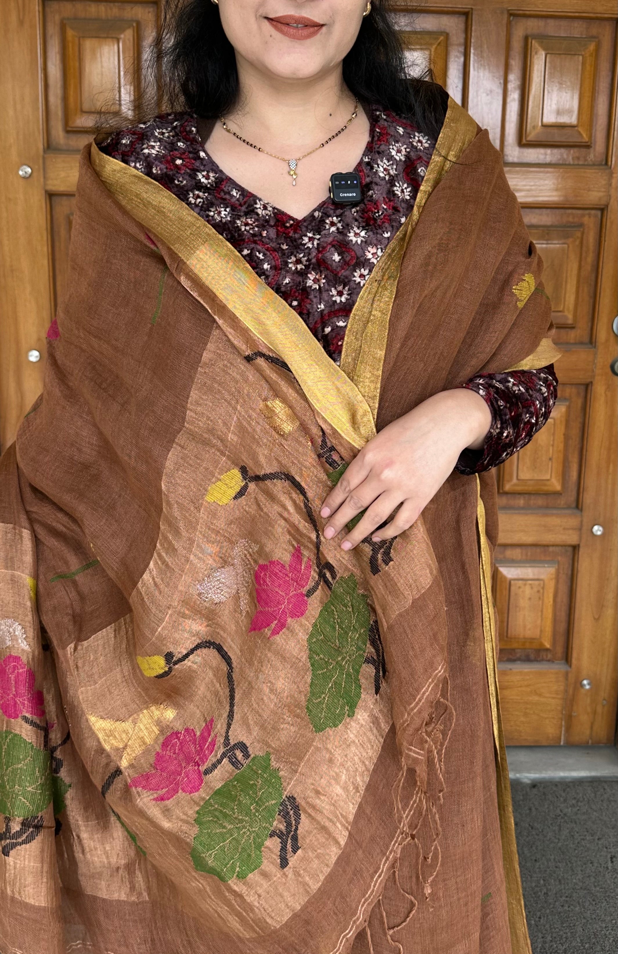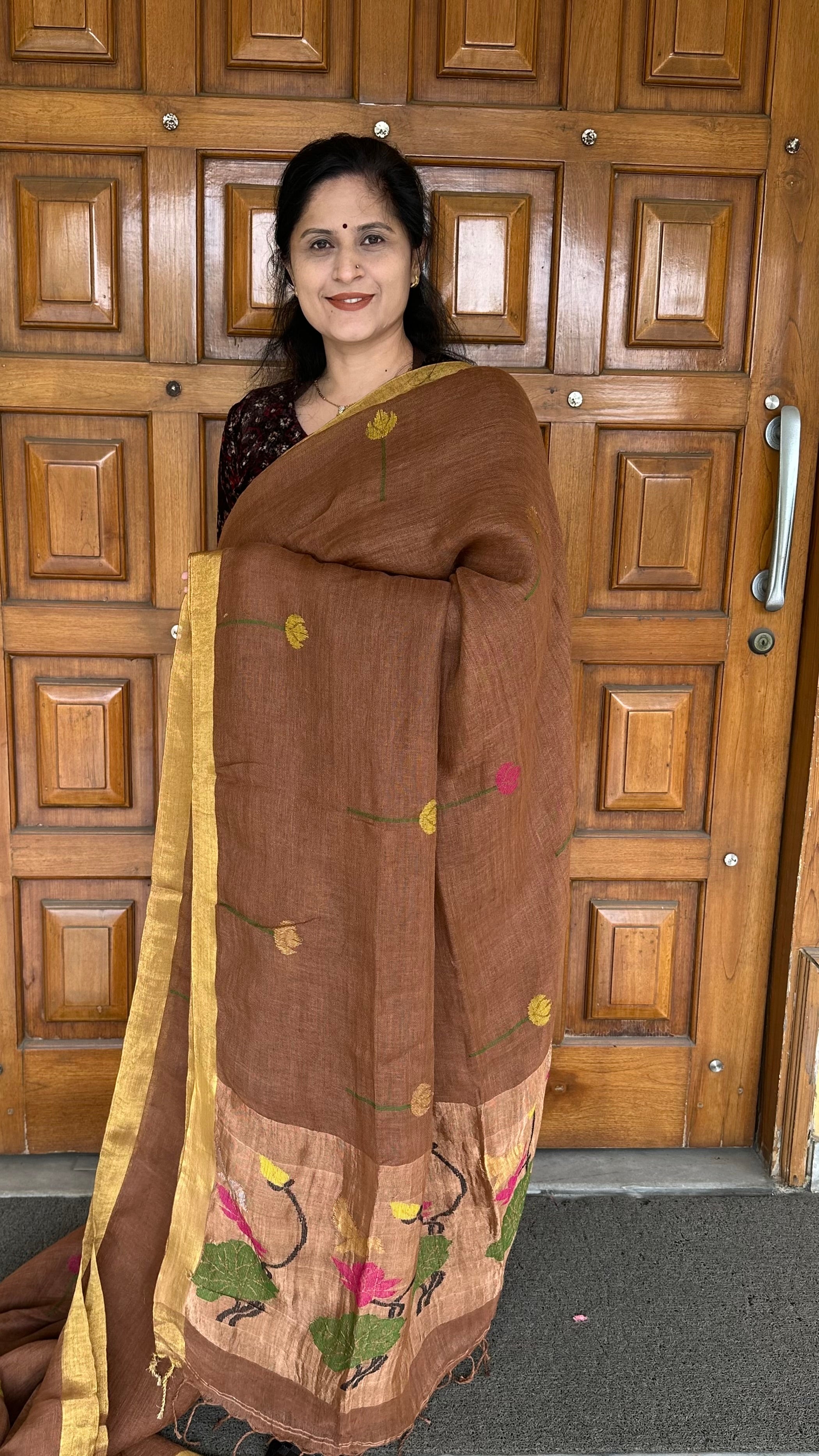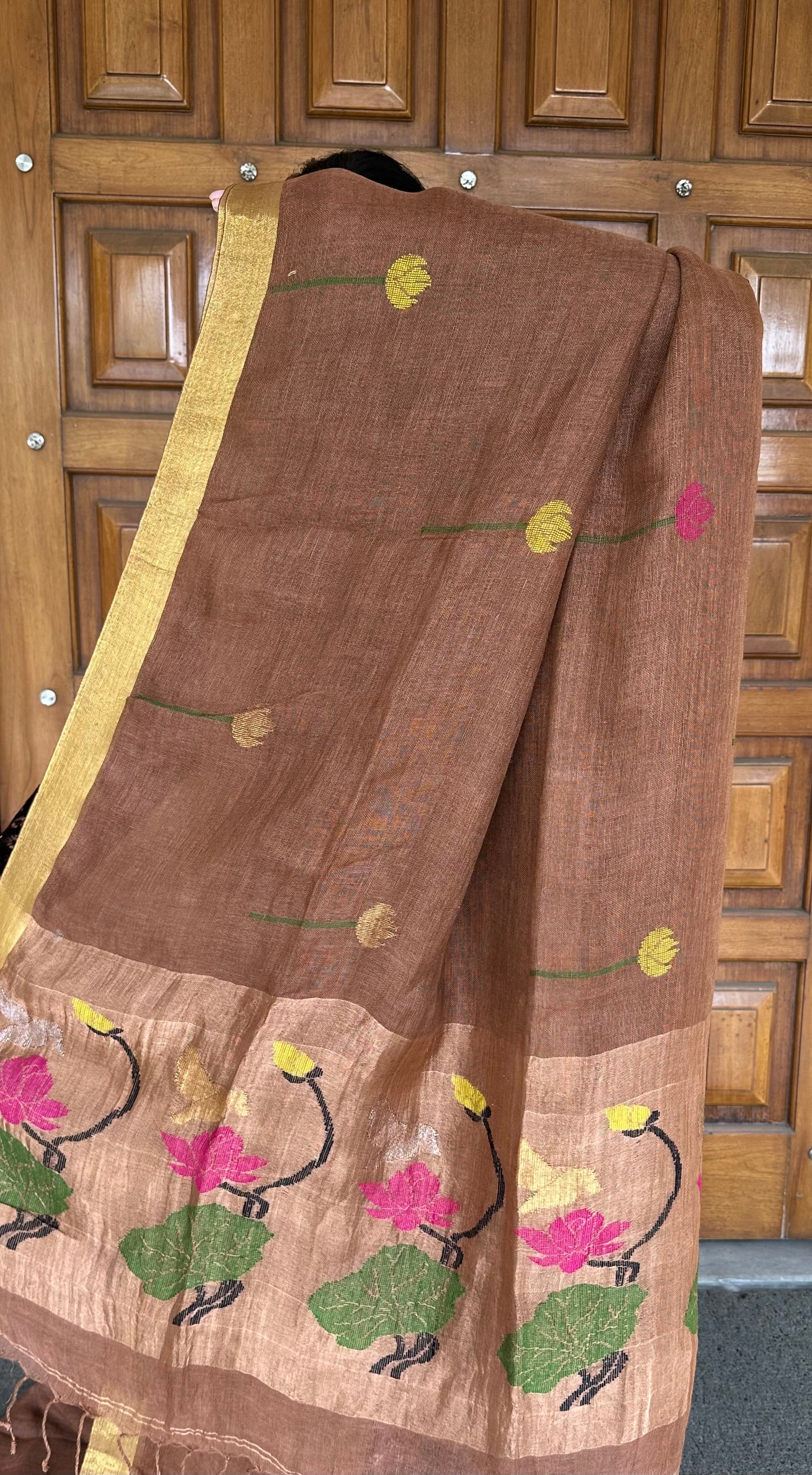 Brown Golden Zari Paithani Linen Handloom Saree