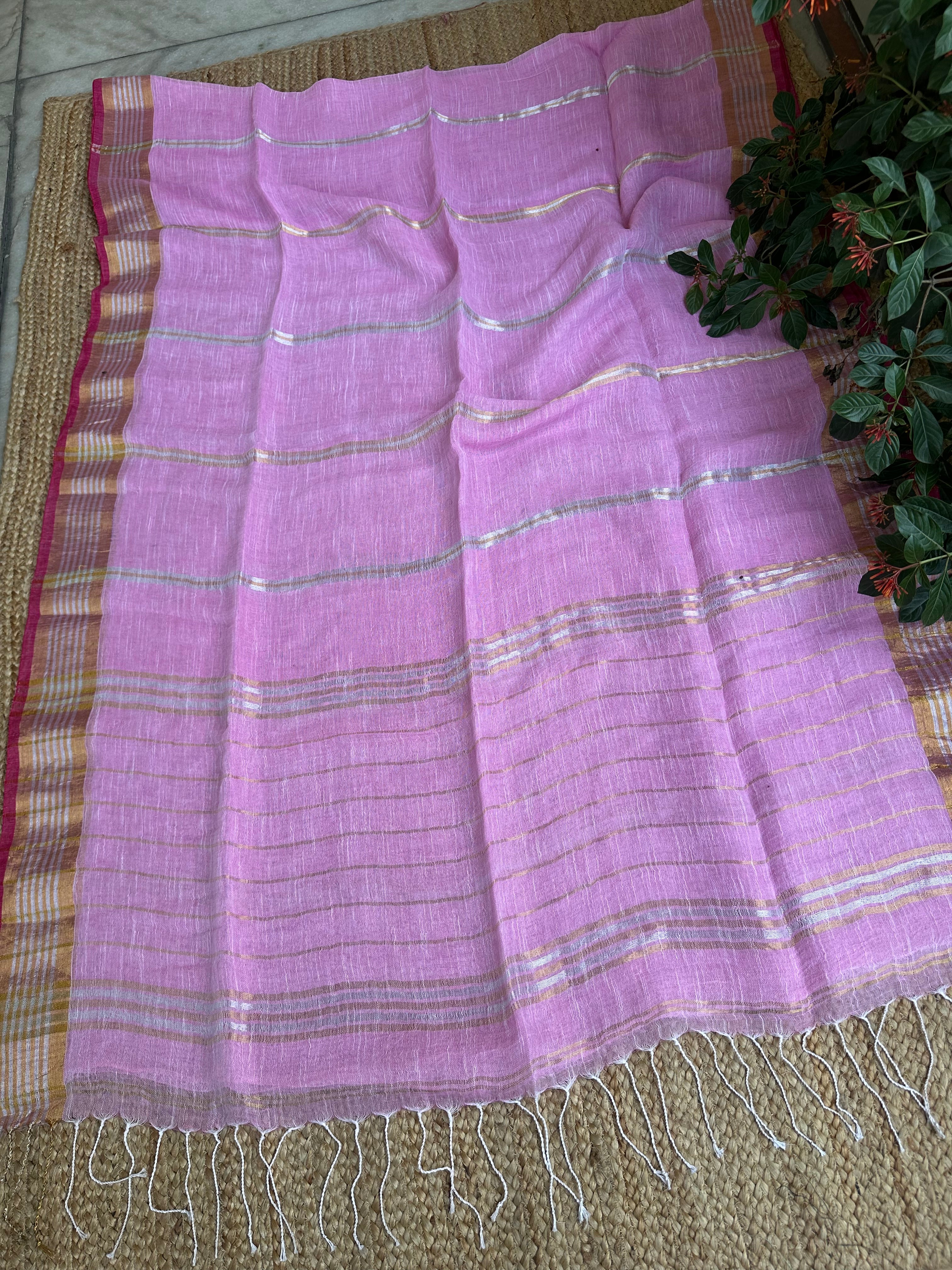 Pink Linen Cotton Handloom Zari Stripes Border Saree