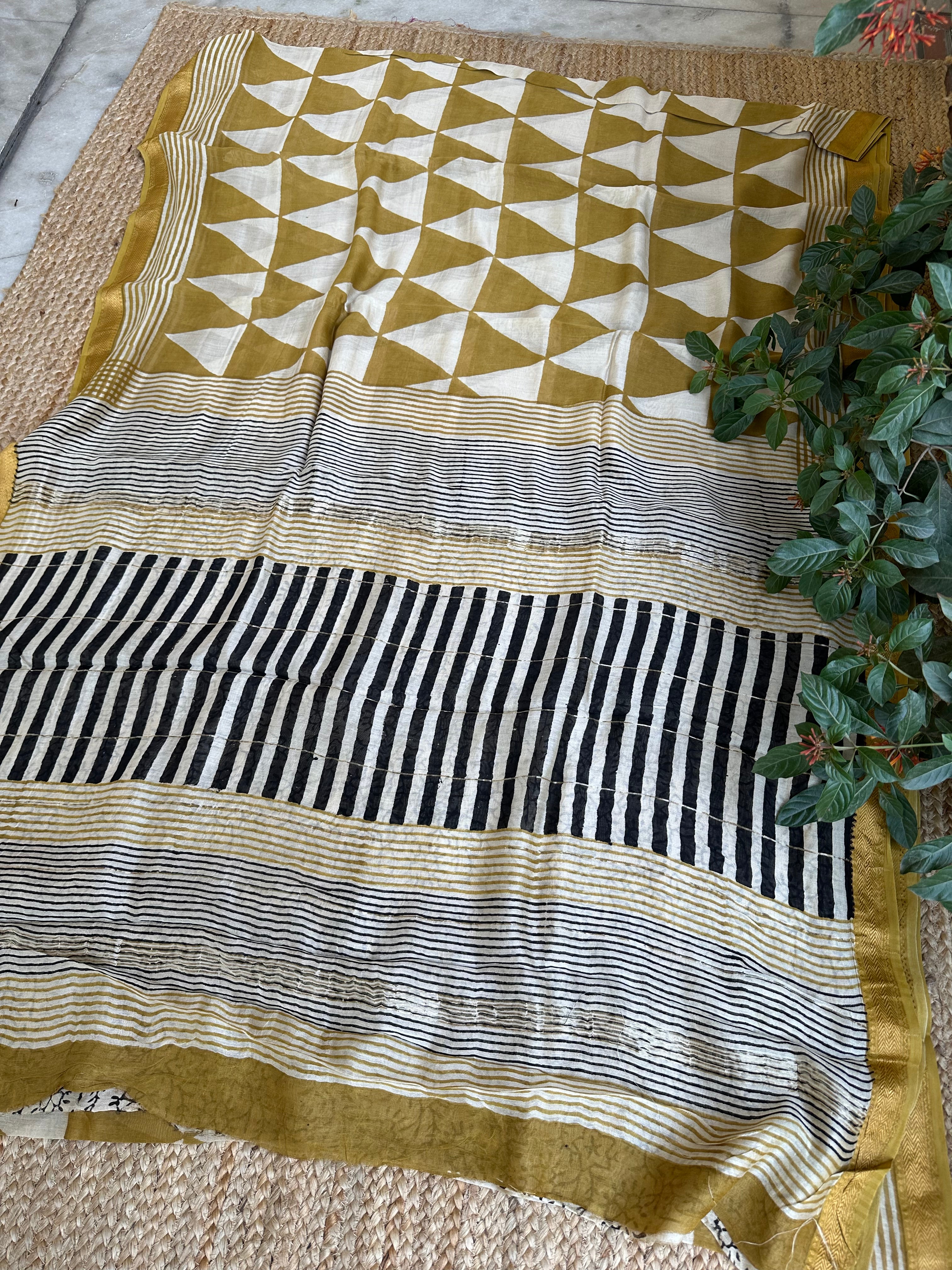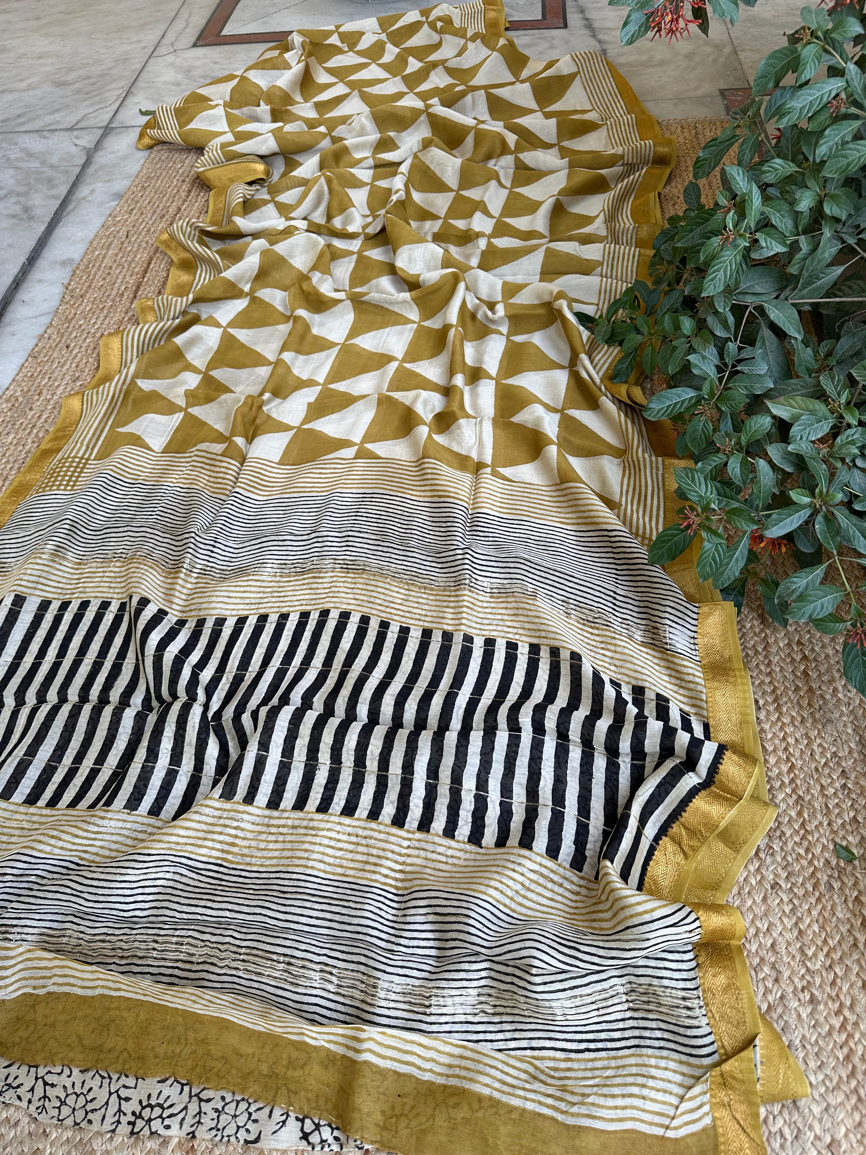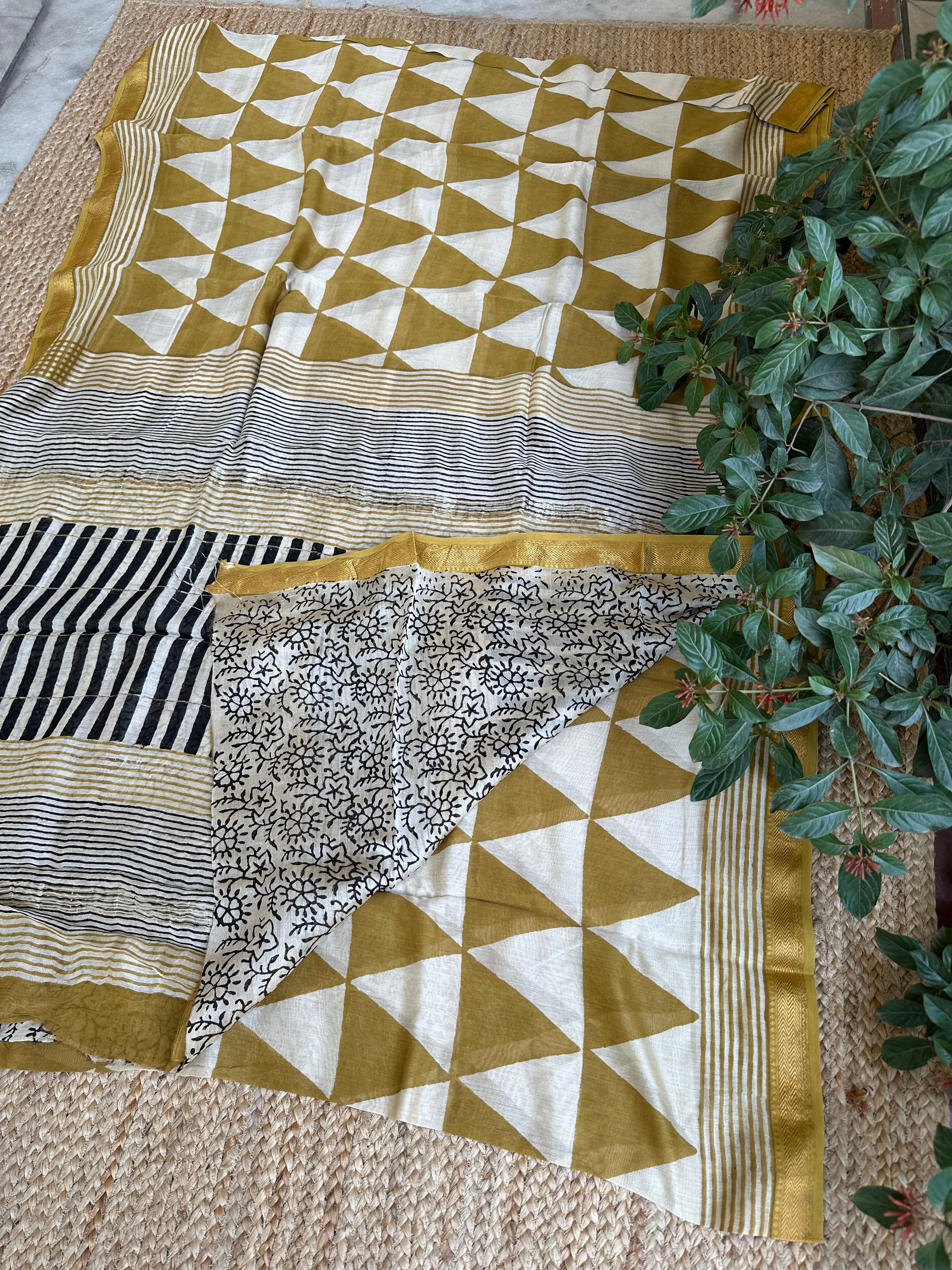 Maheshwari Handblock Printed Mustard Triangles Saree