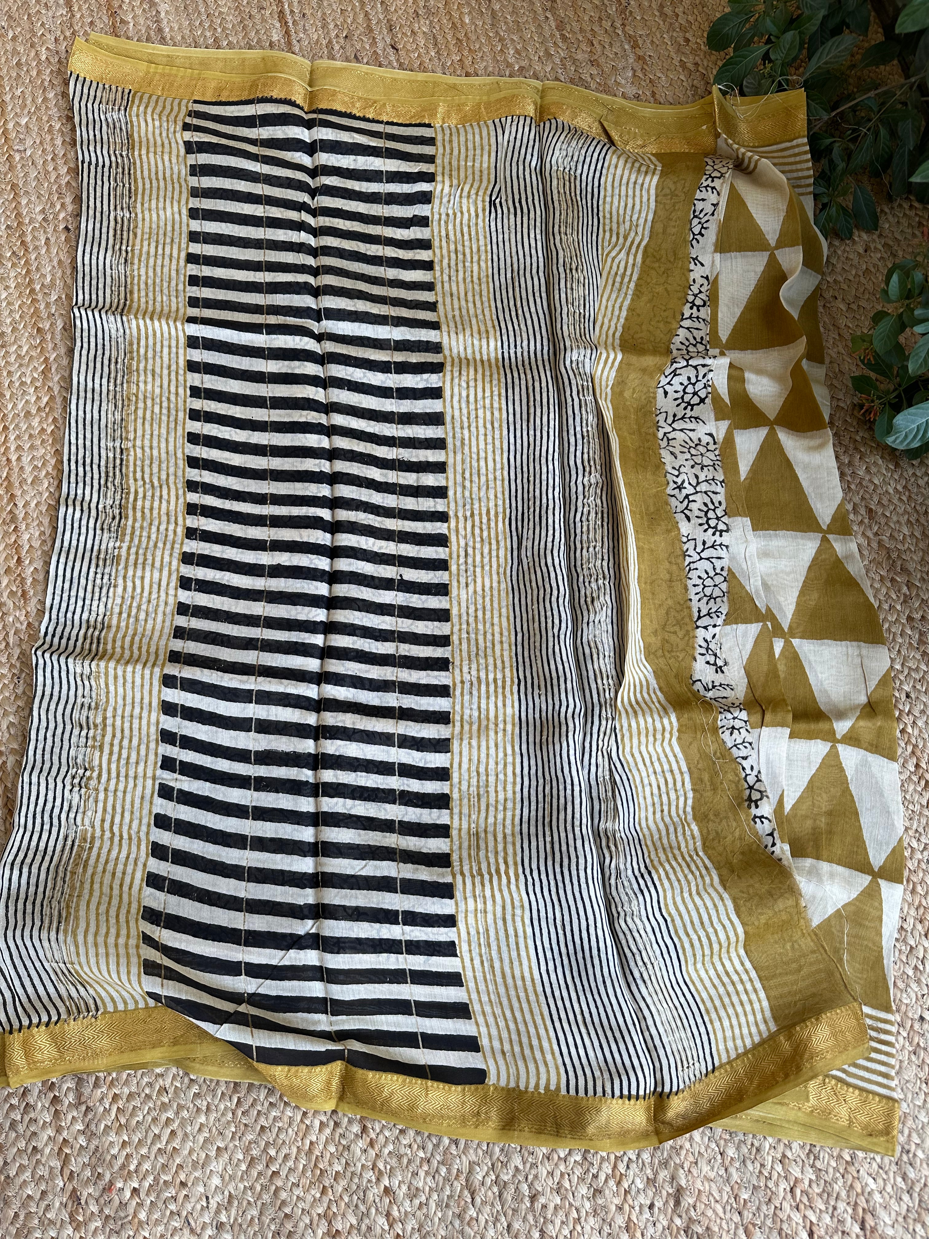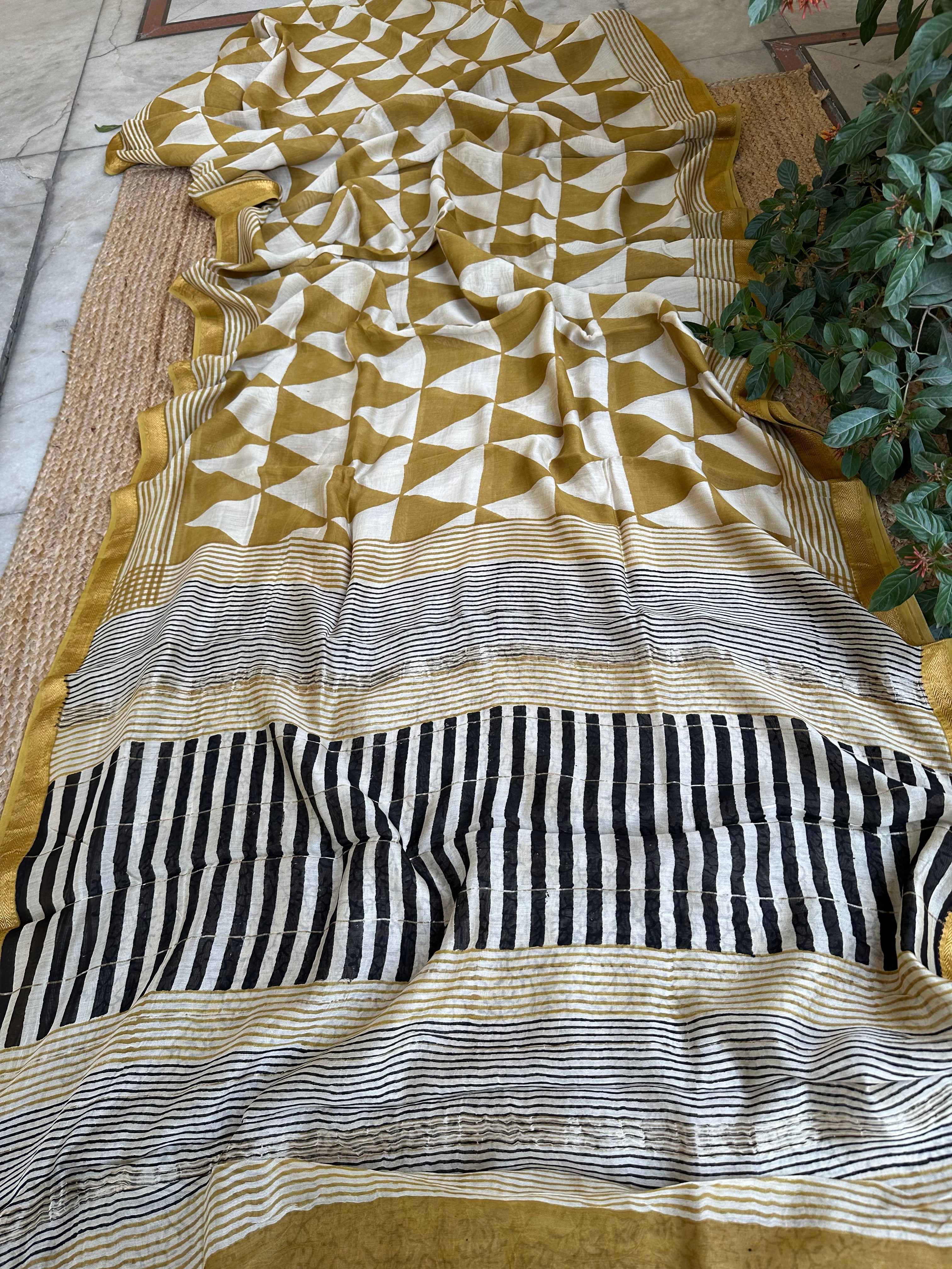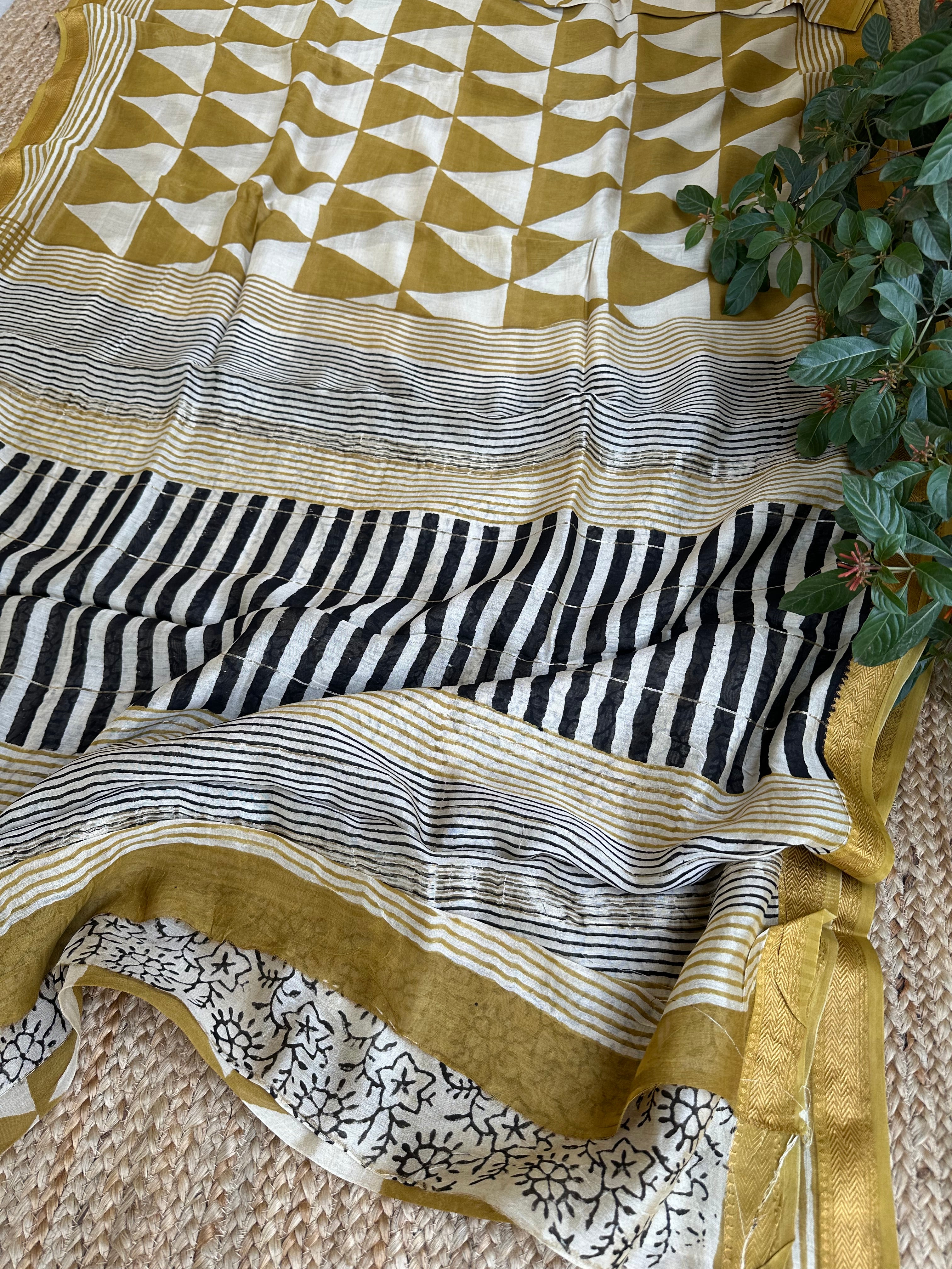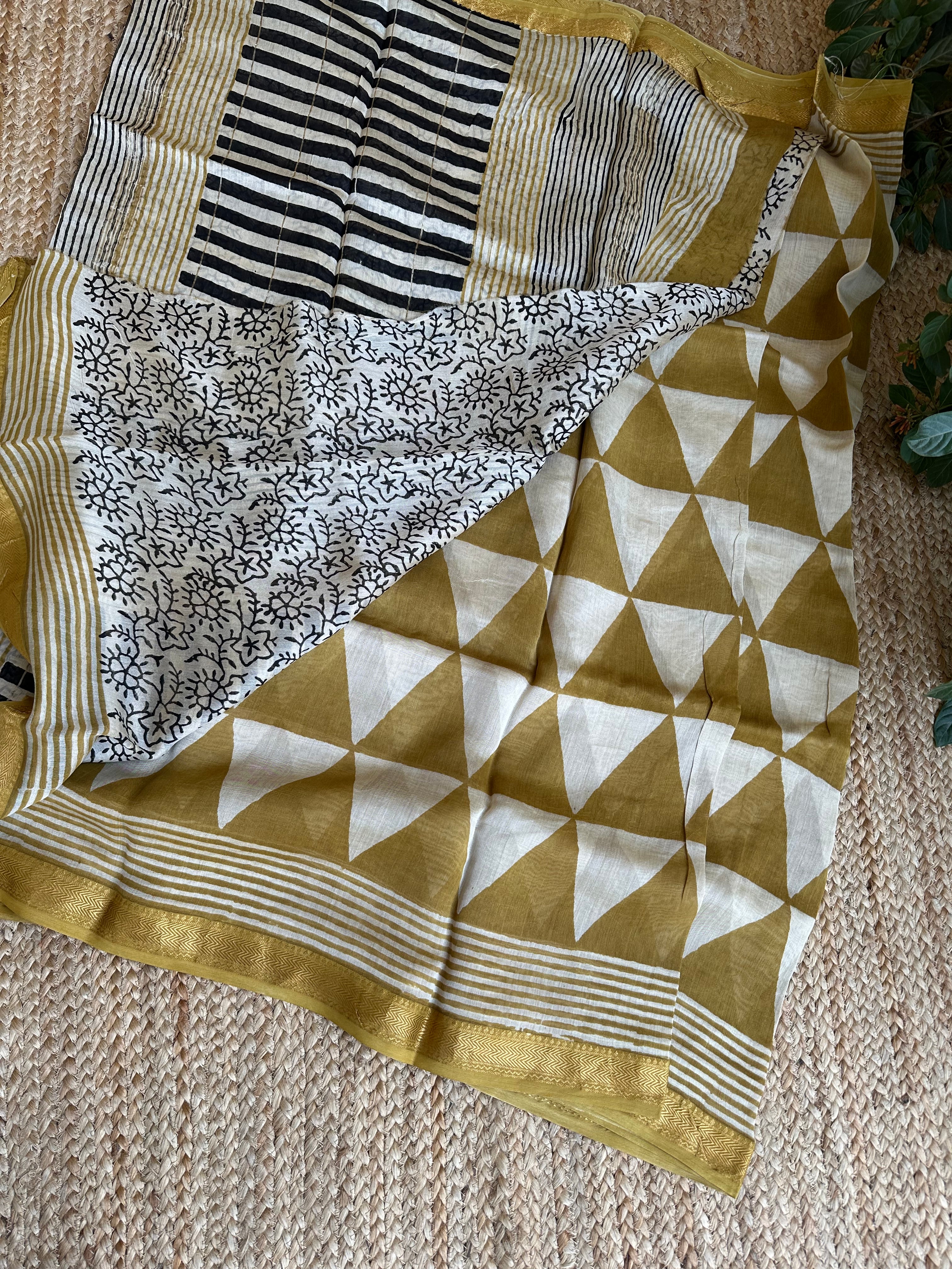 Maheshwari Handblock Printed Mustard Triangles Saree