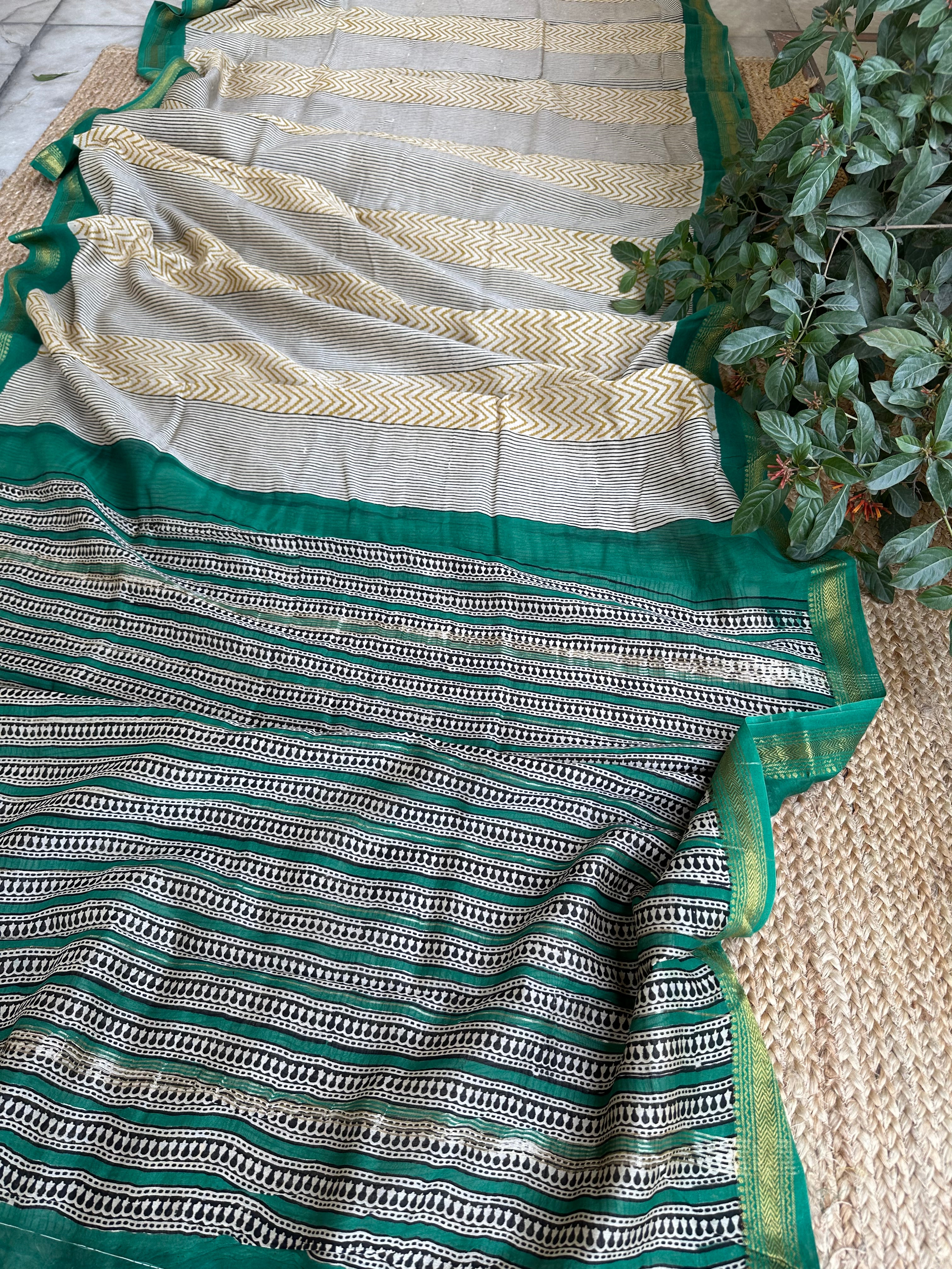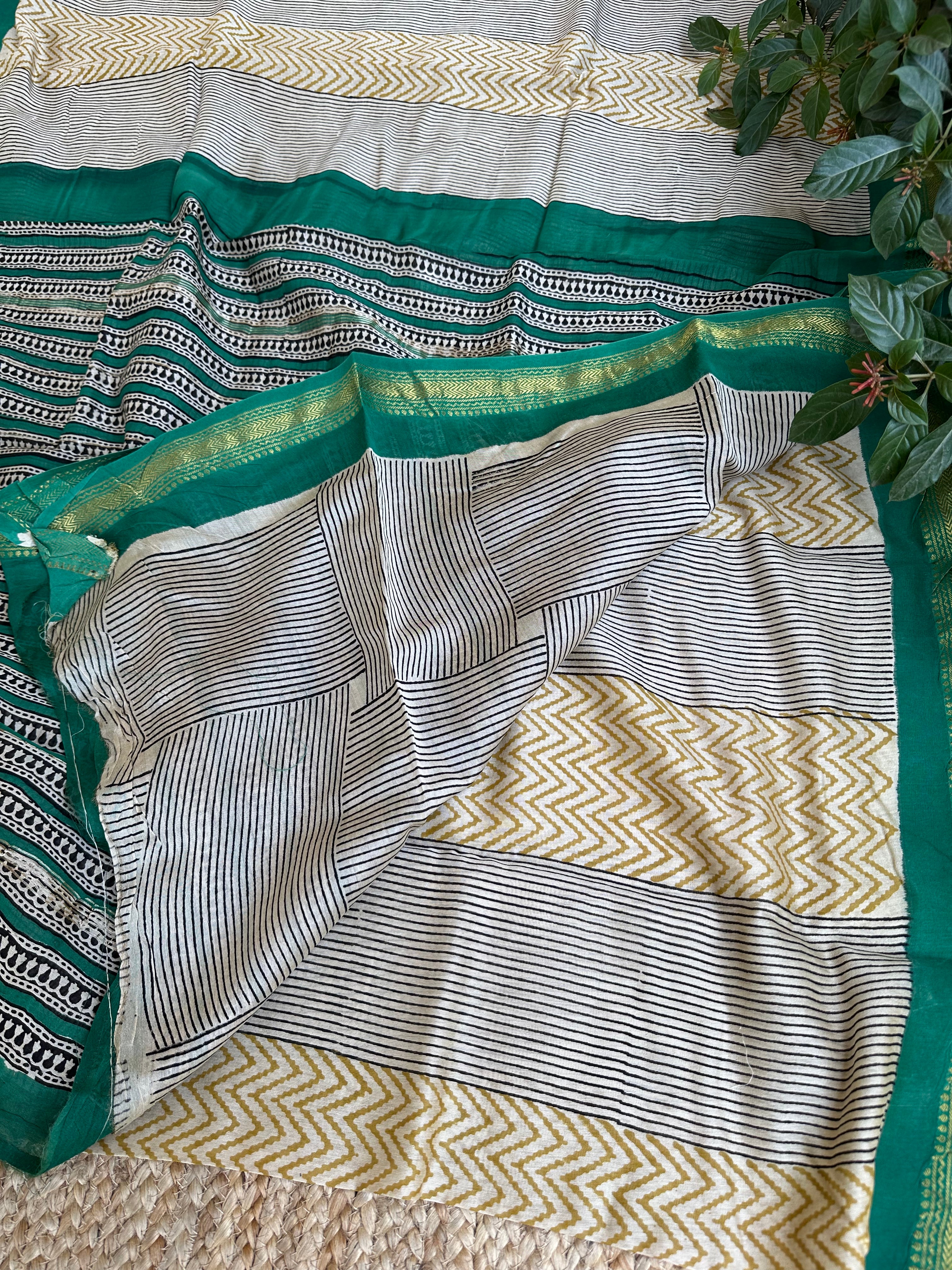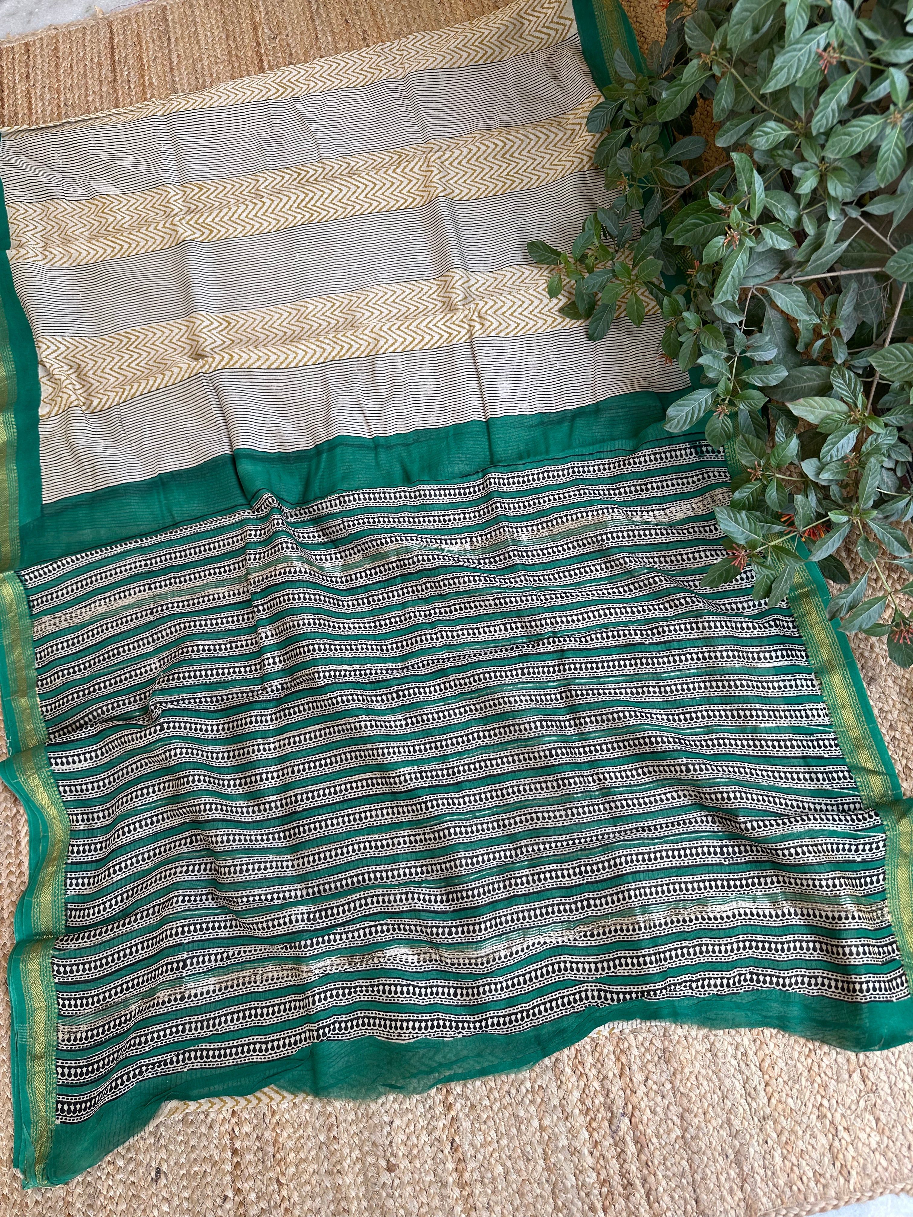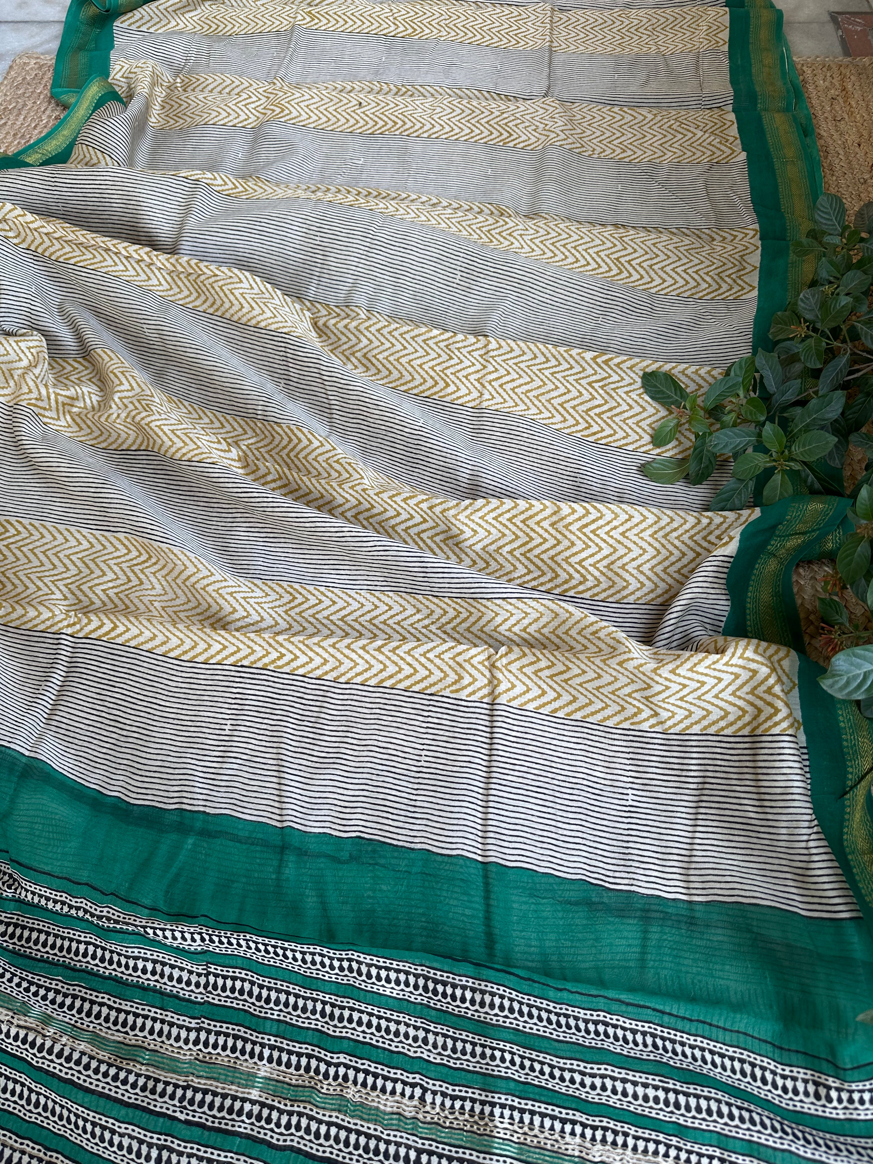 Maheshwari Handblock Printed Green Mustard Saree