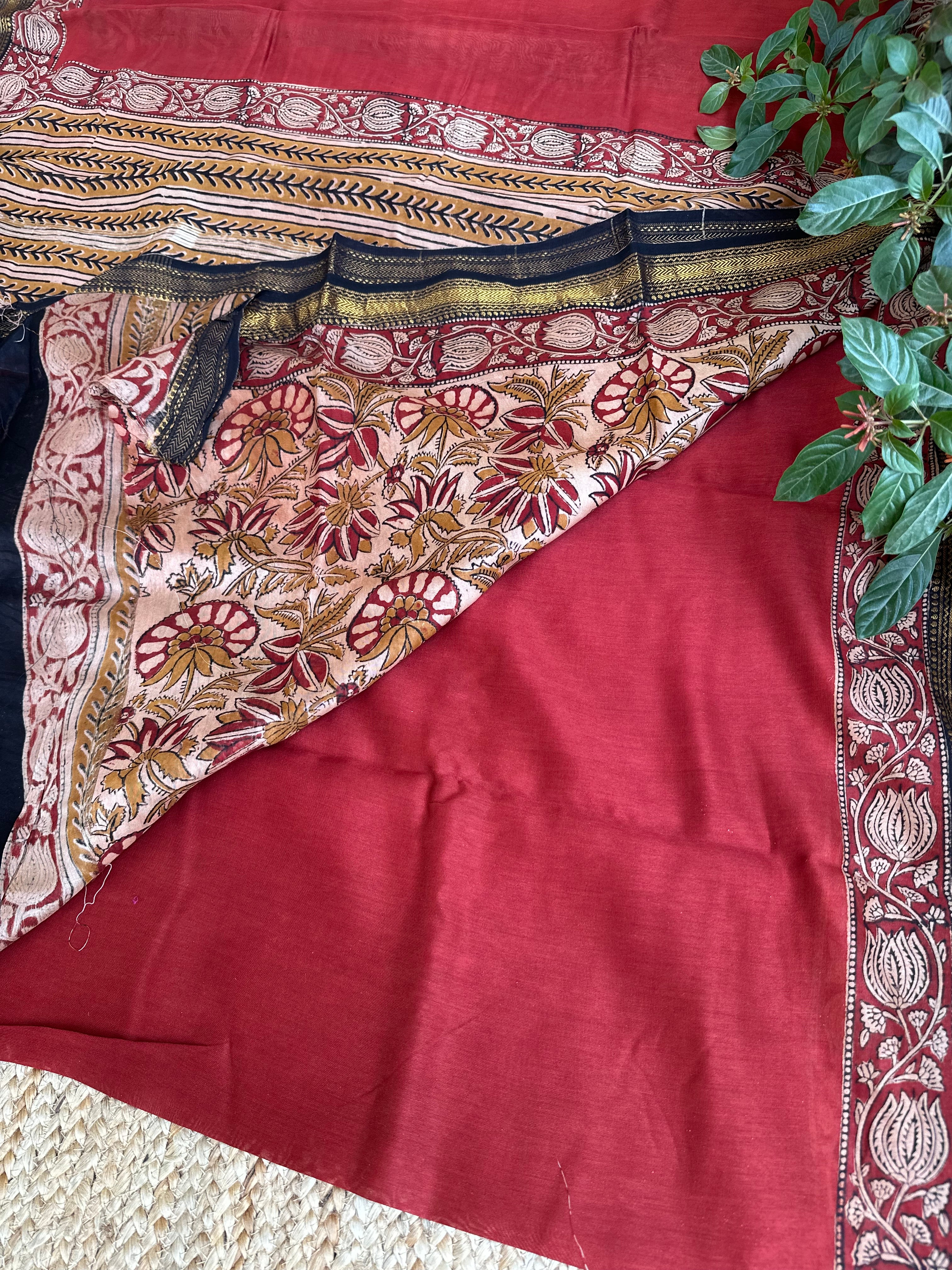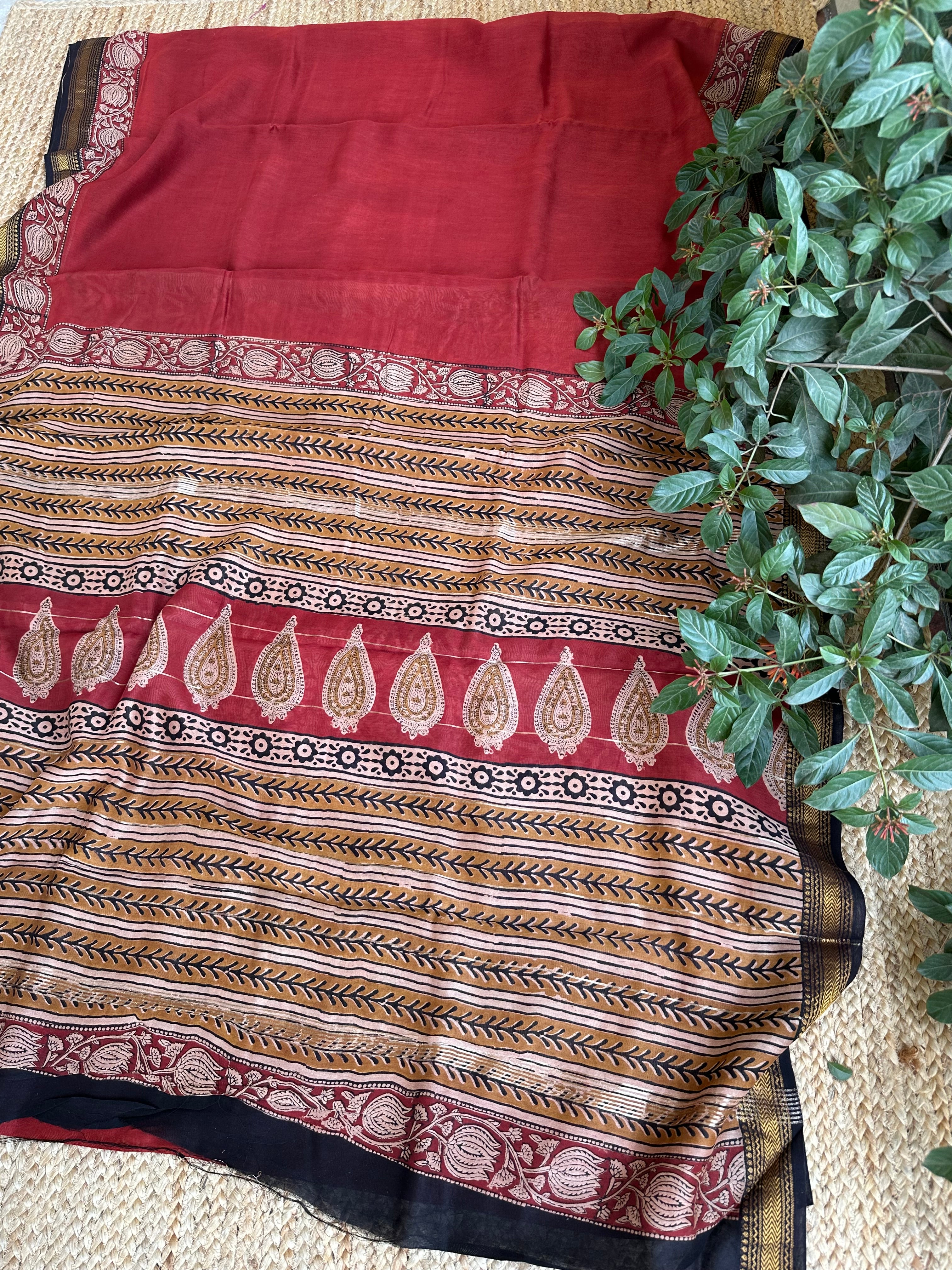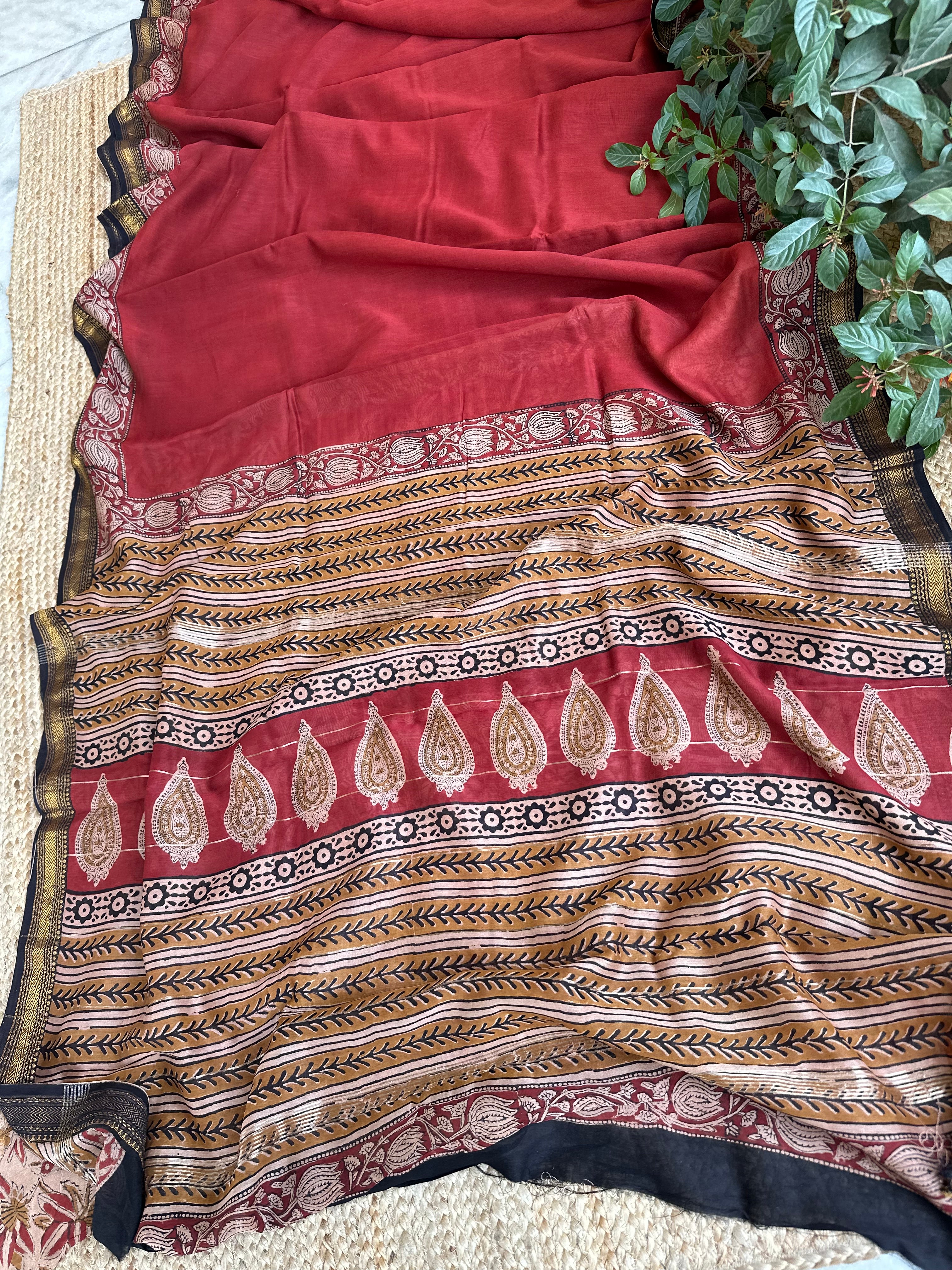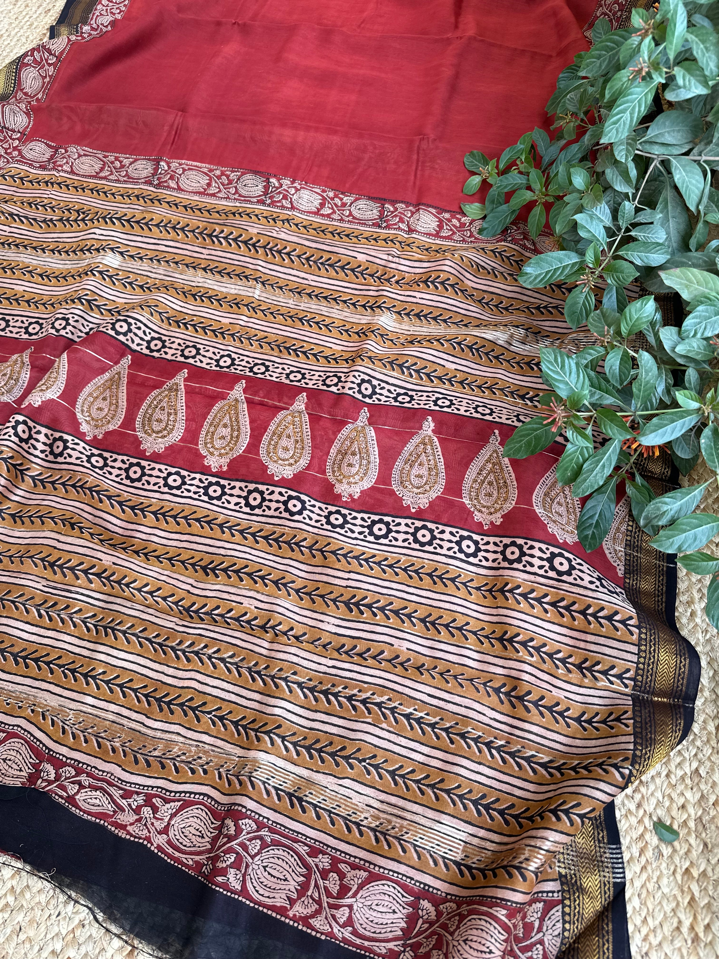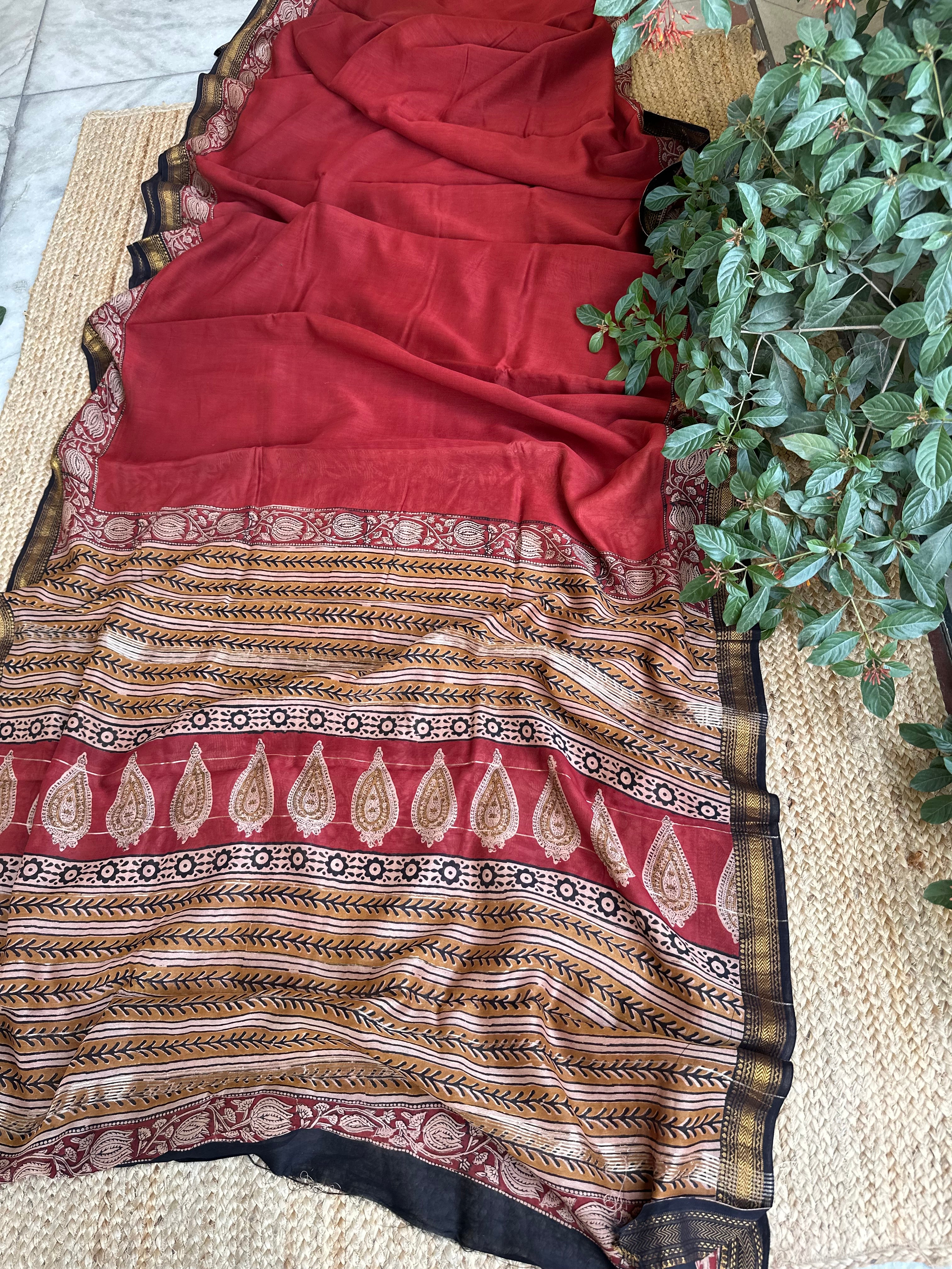Maheshwari Handblock Printed Red Mustard Saree