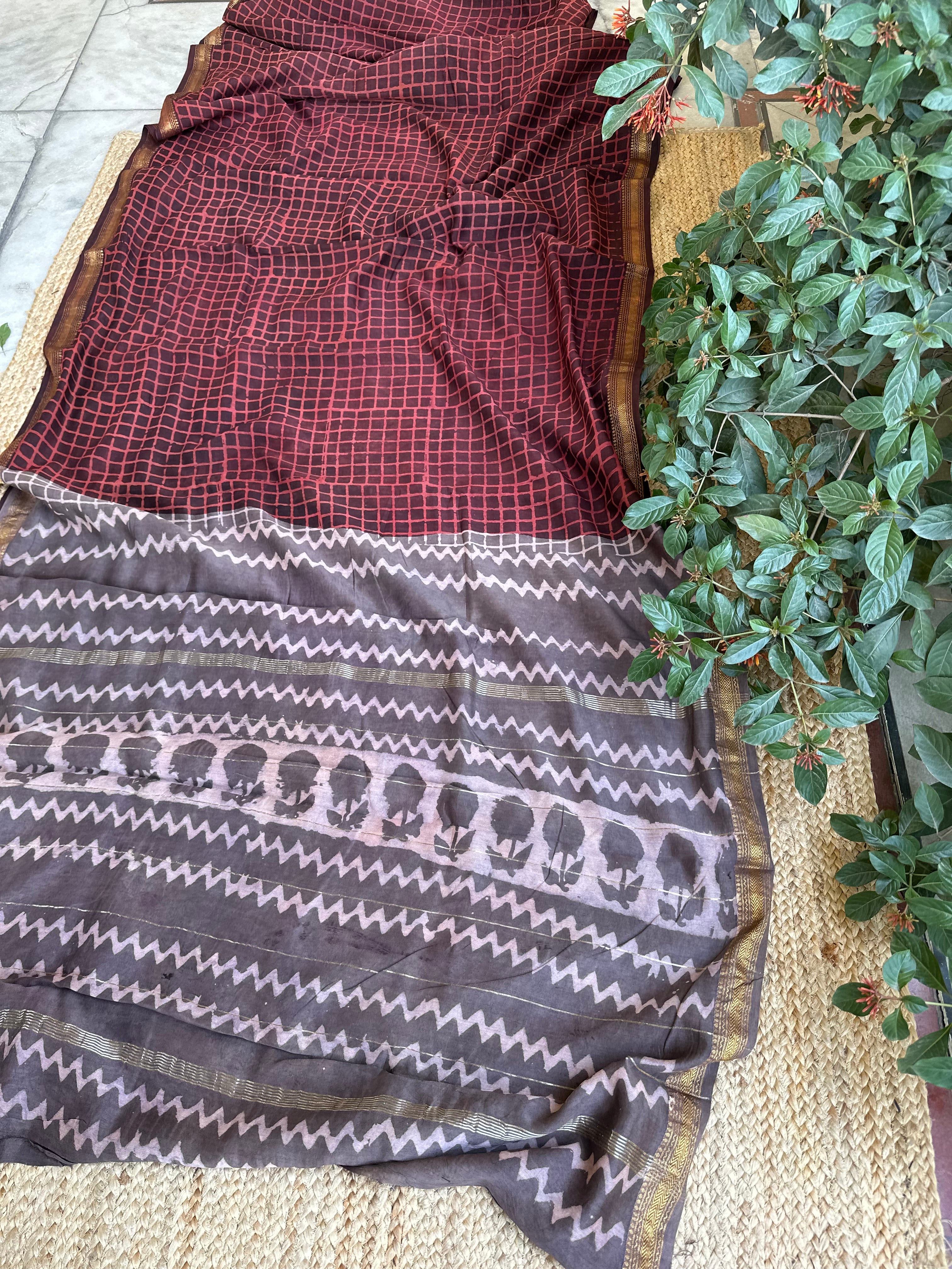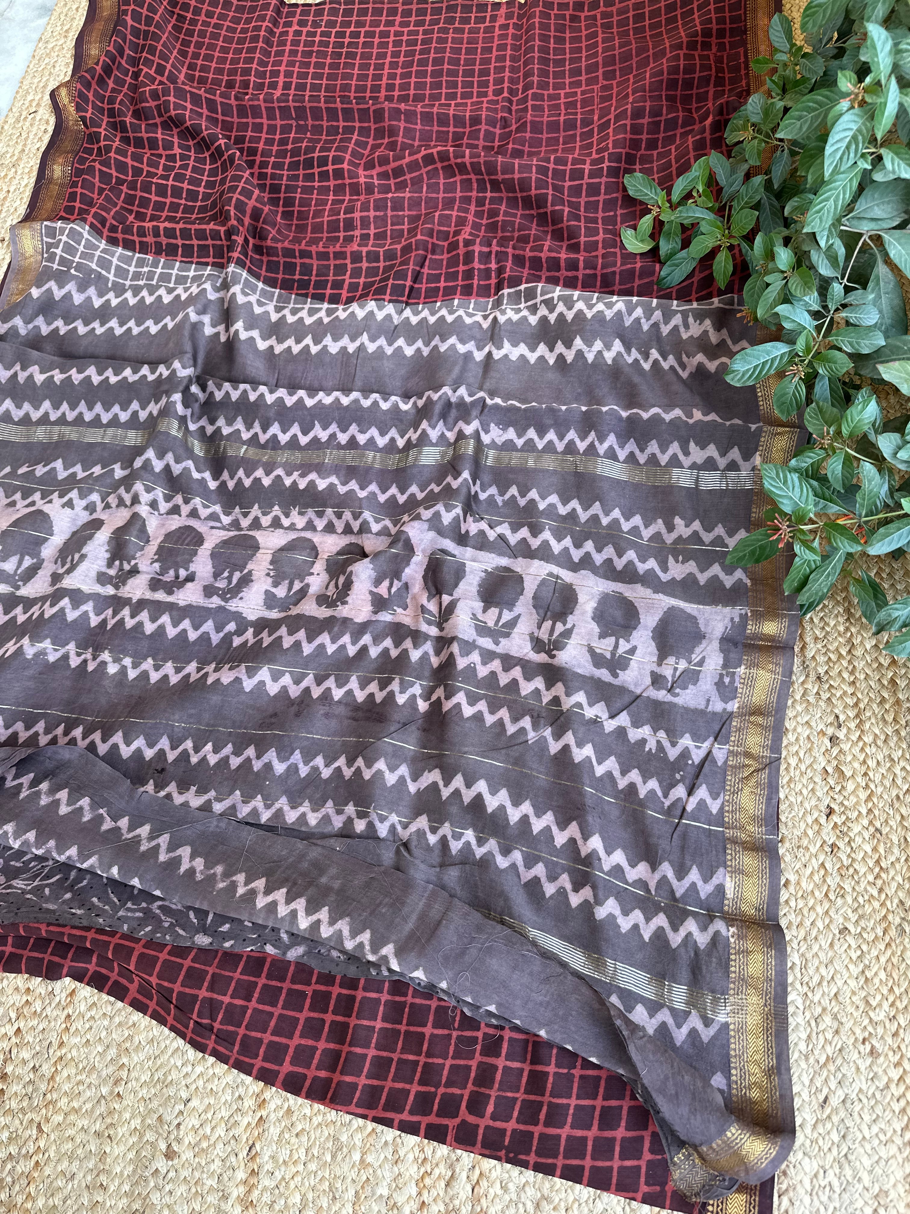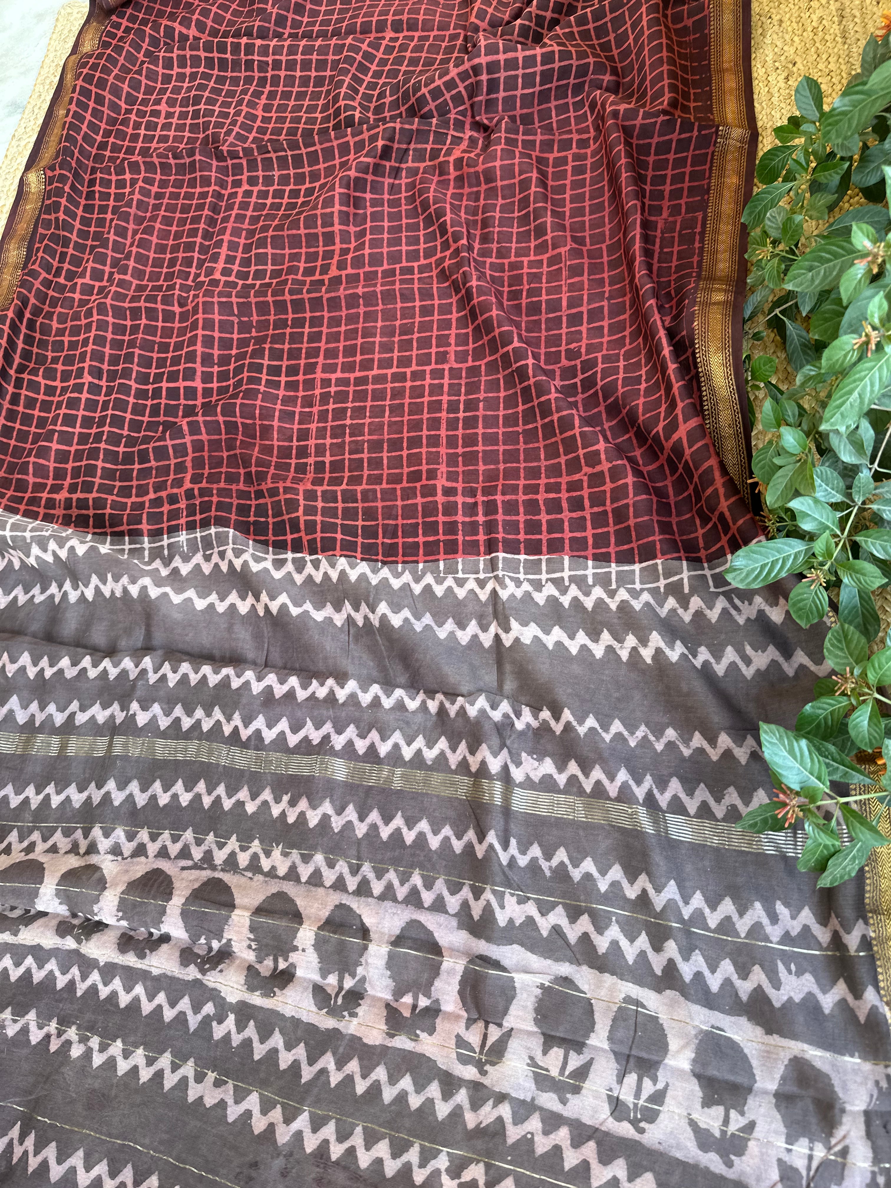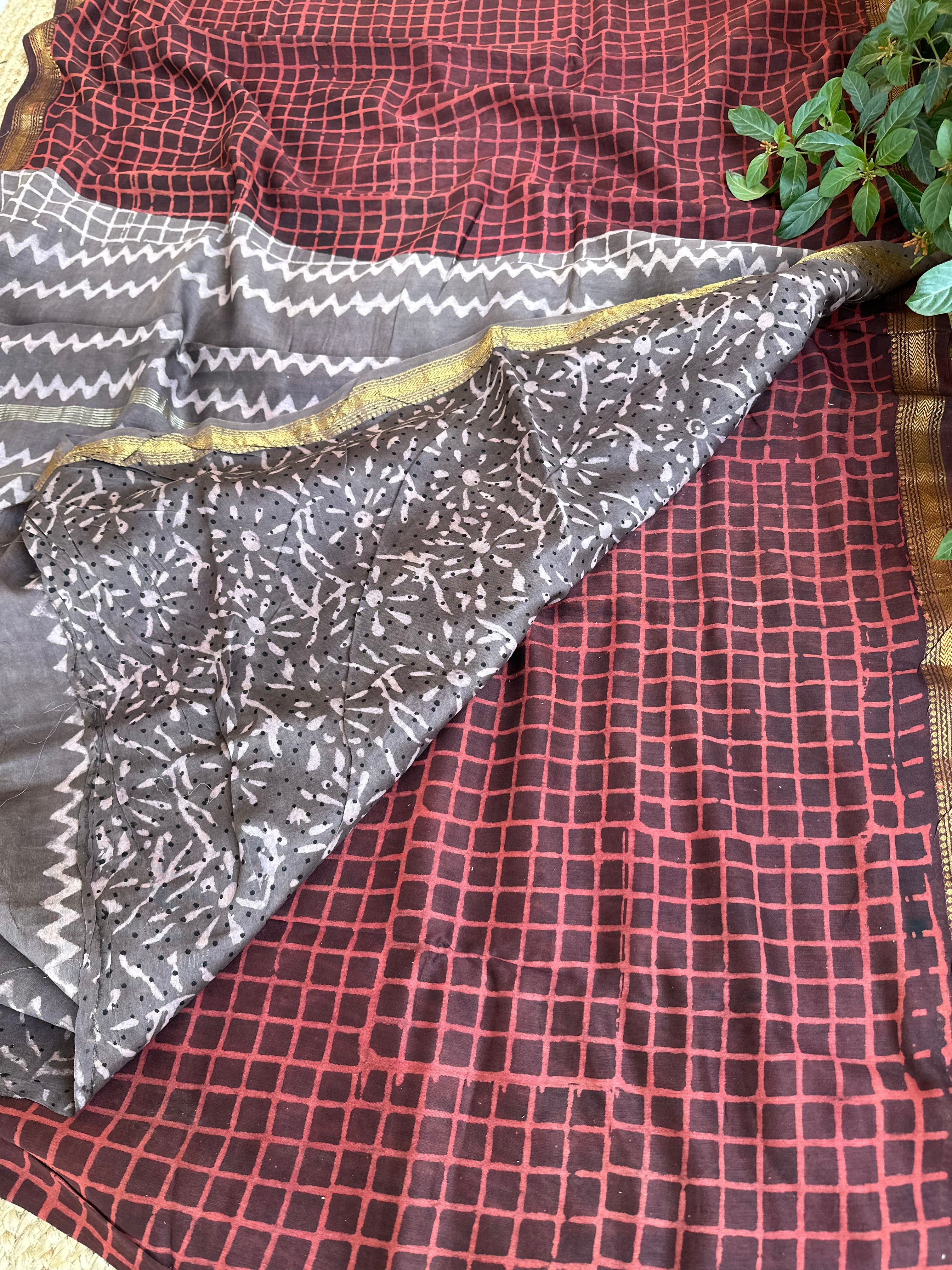 Maheshwari Handblock Printed Red Grey Saree