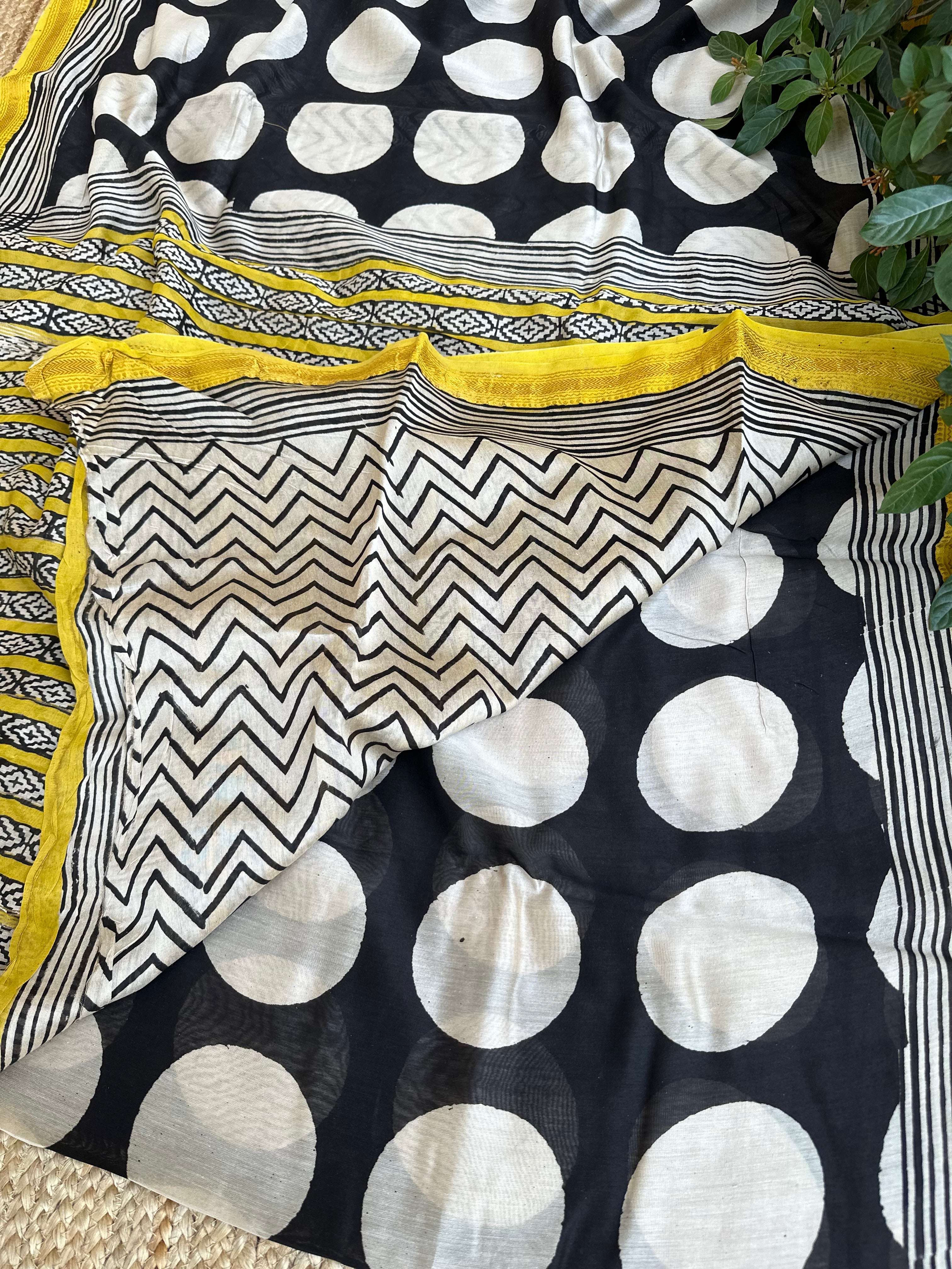 Black White Polka Dots Modal Silk Handblock Saree