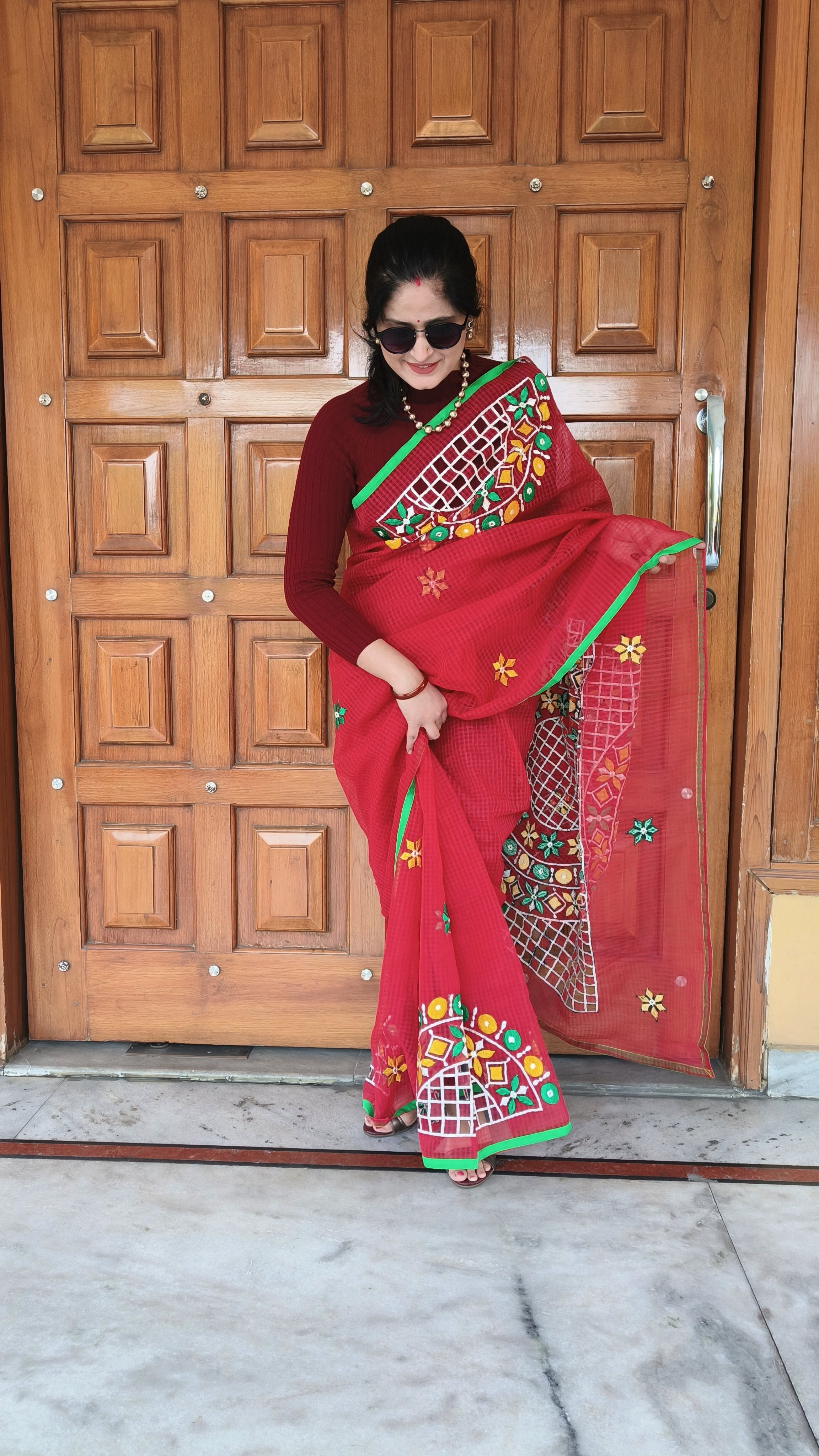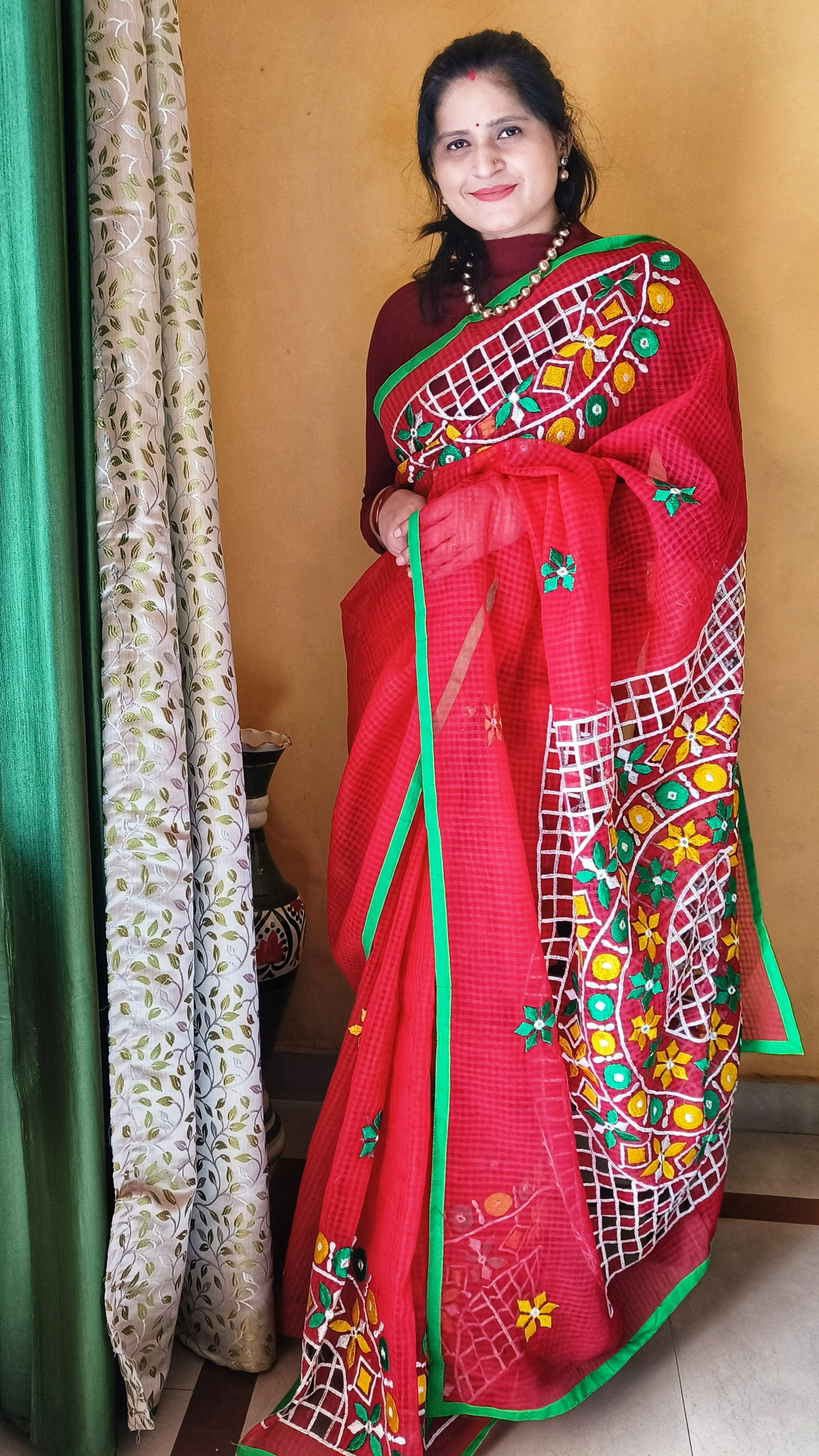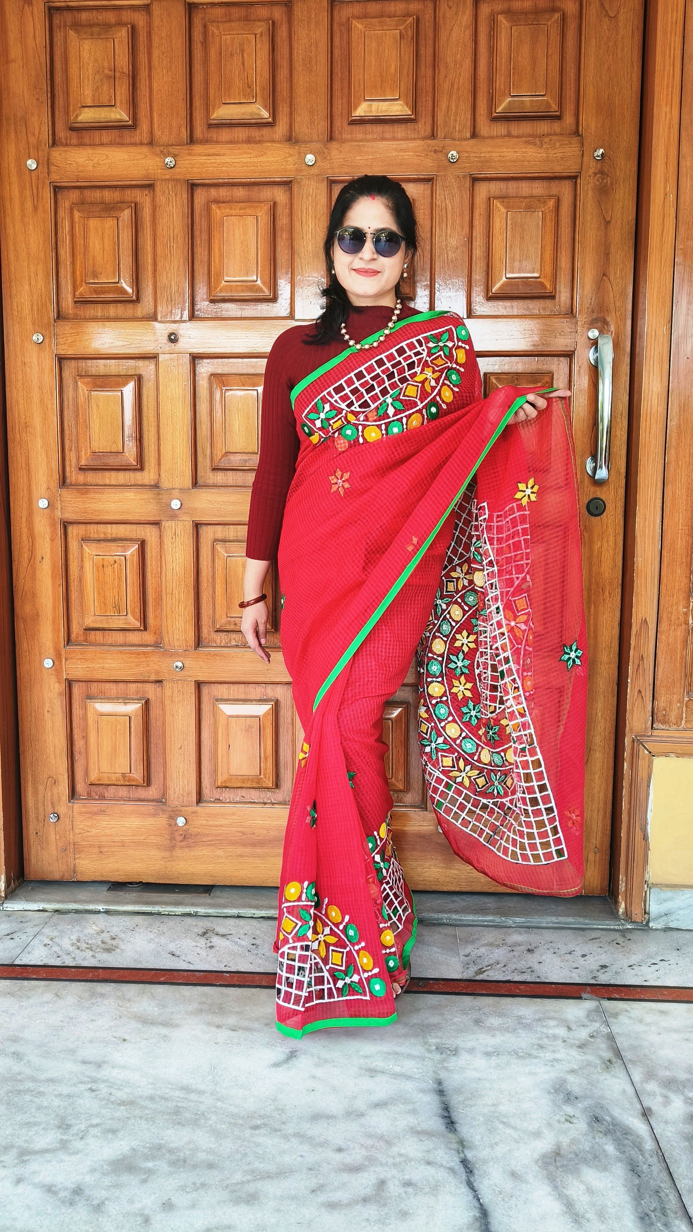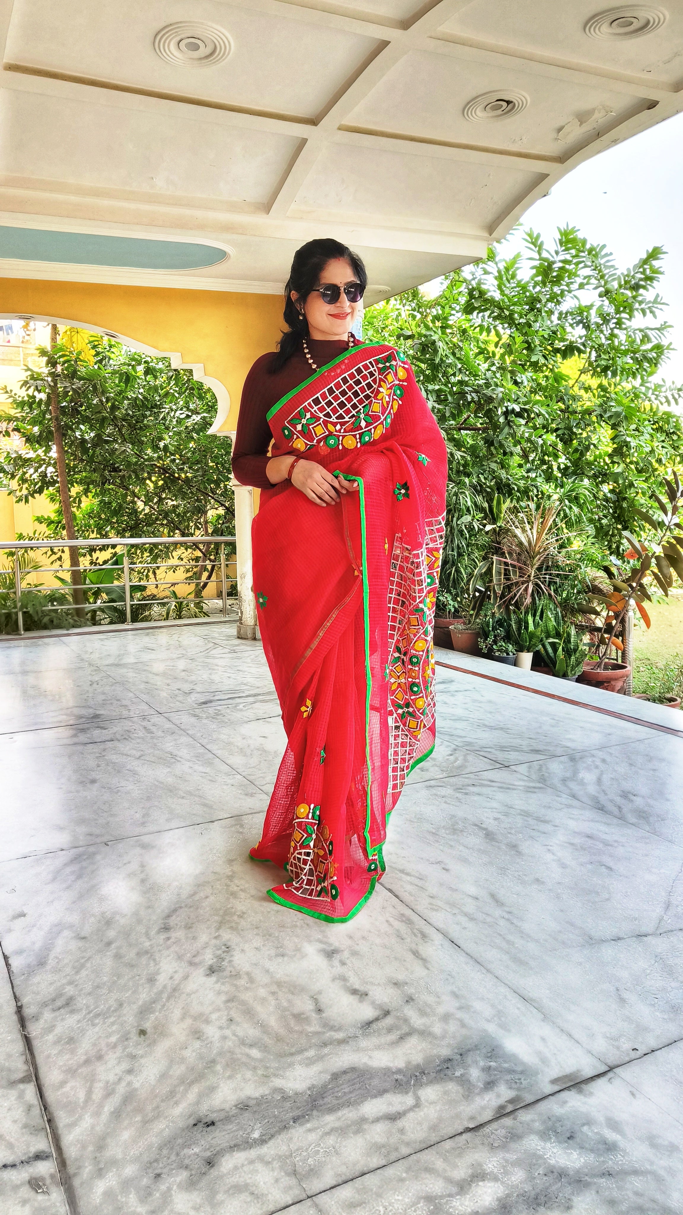Handloom Gamcha Cotton Sleeveless Lace Work checks Blouse (Red)