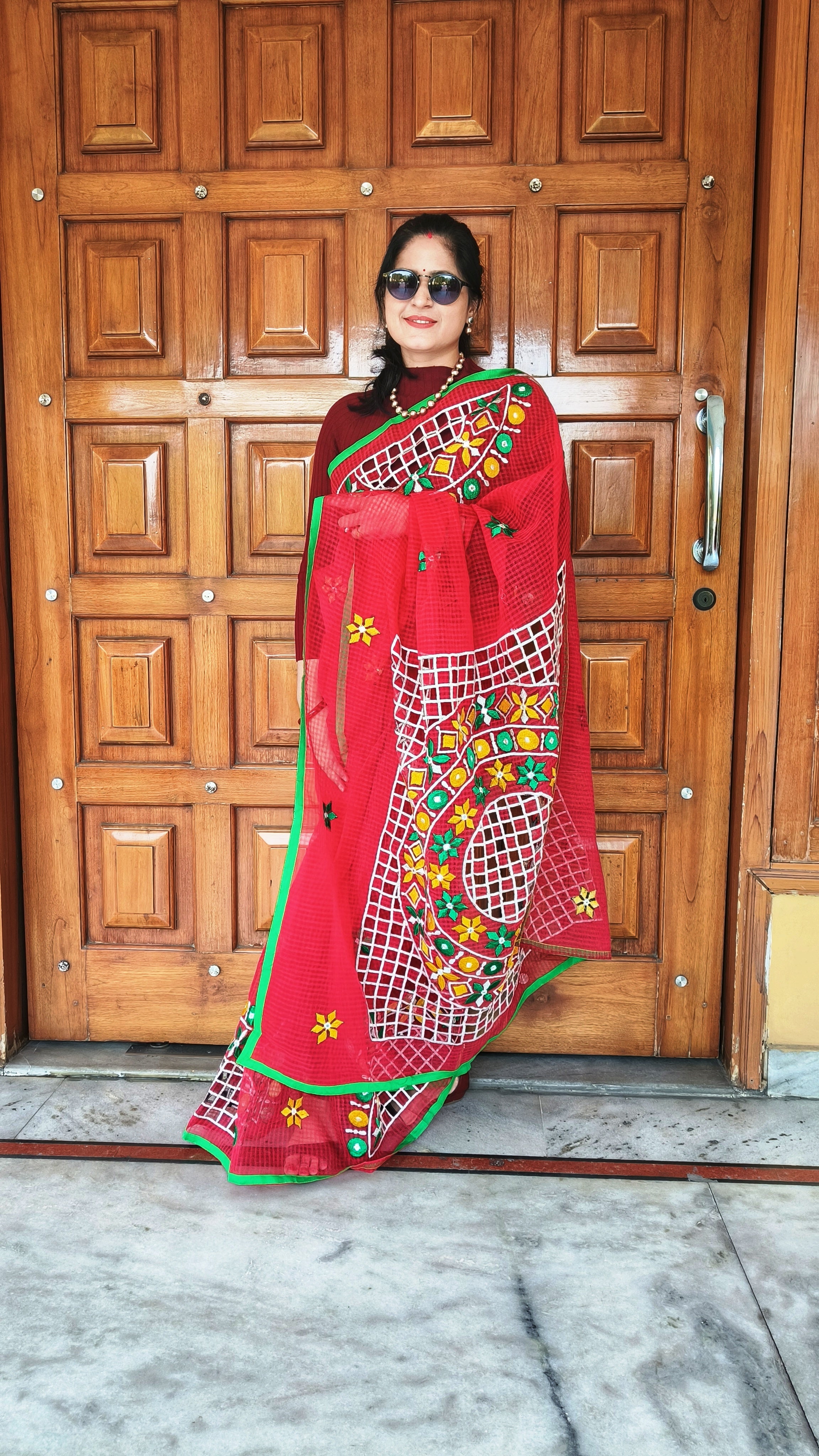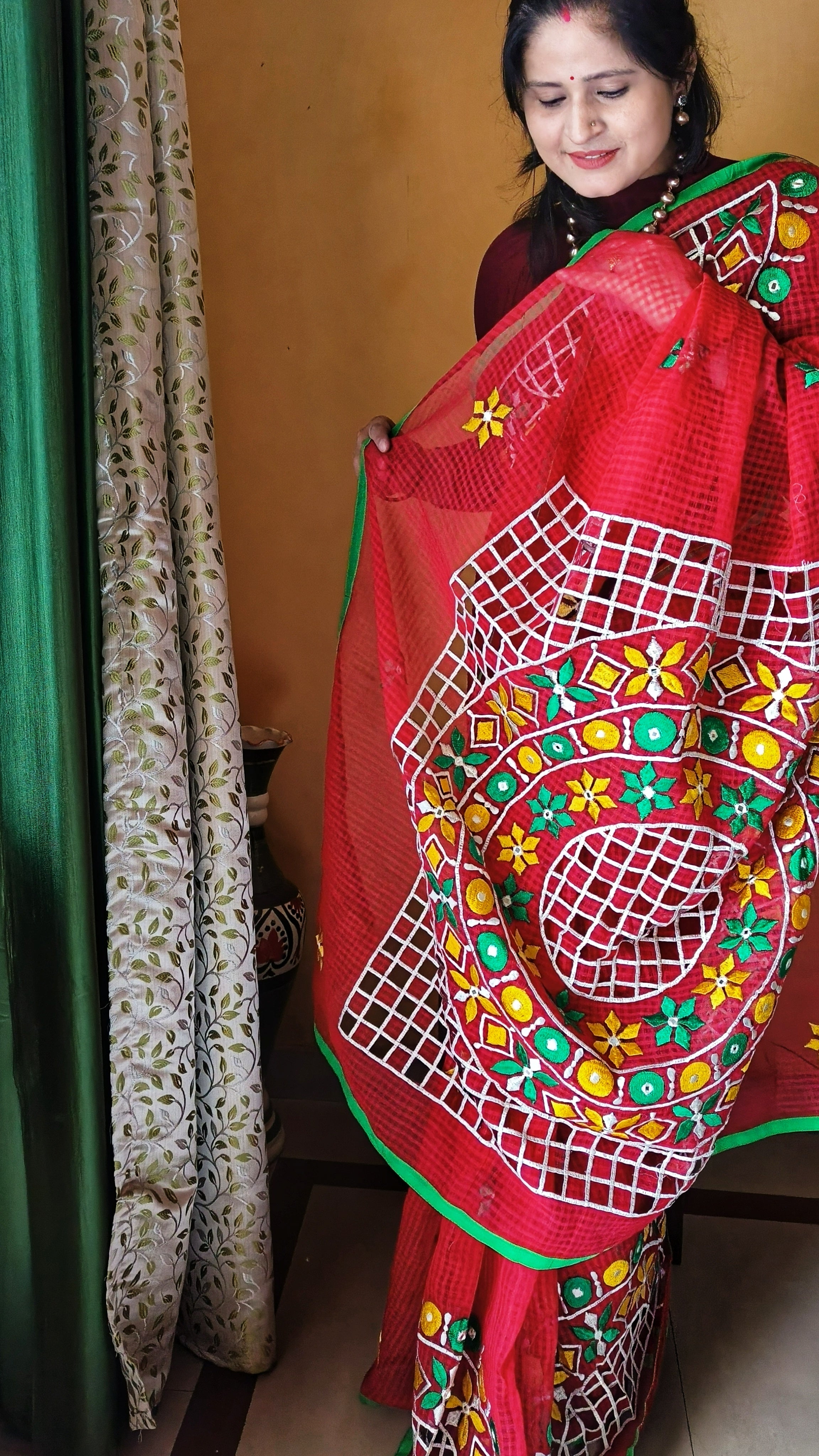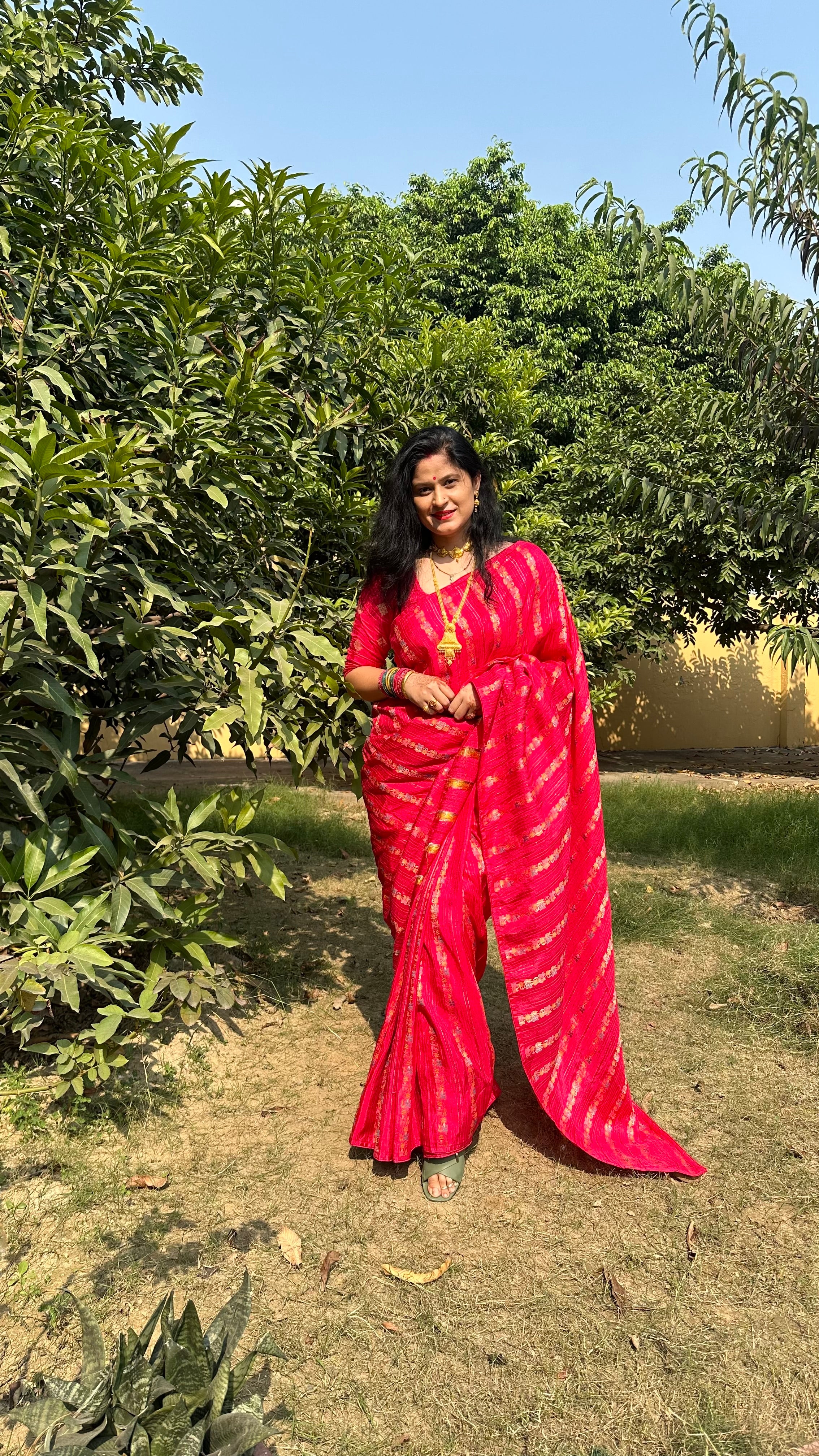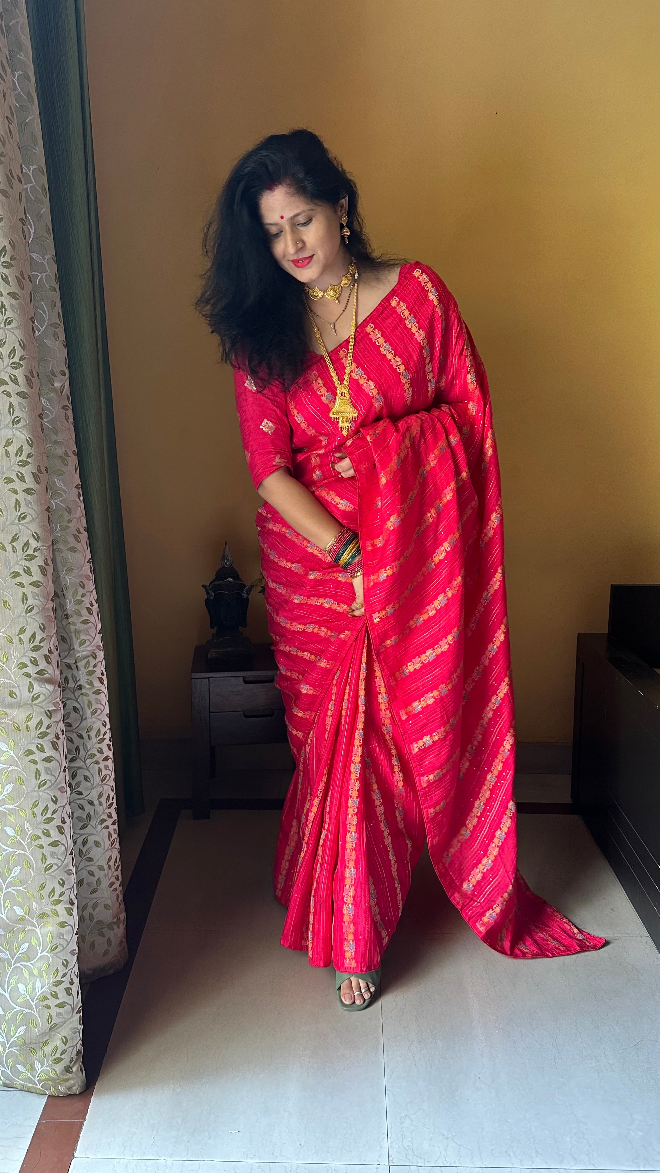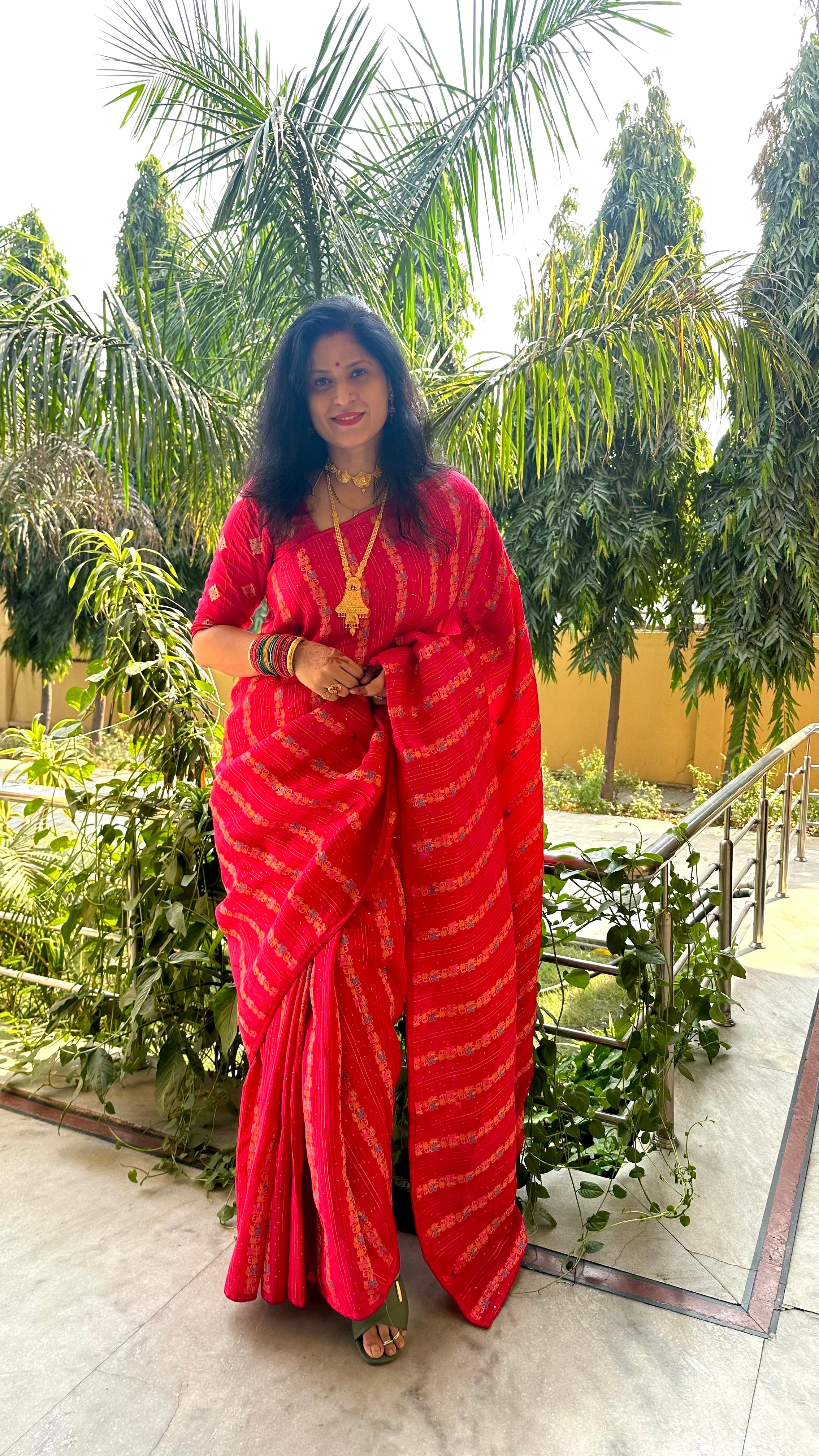 Handloom Gamcha Cotton Sleeveless Lace Work checks Blouse (Red)