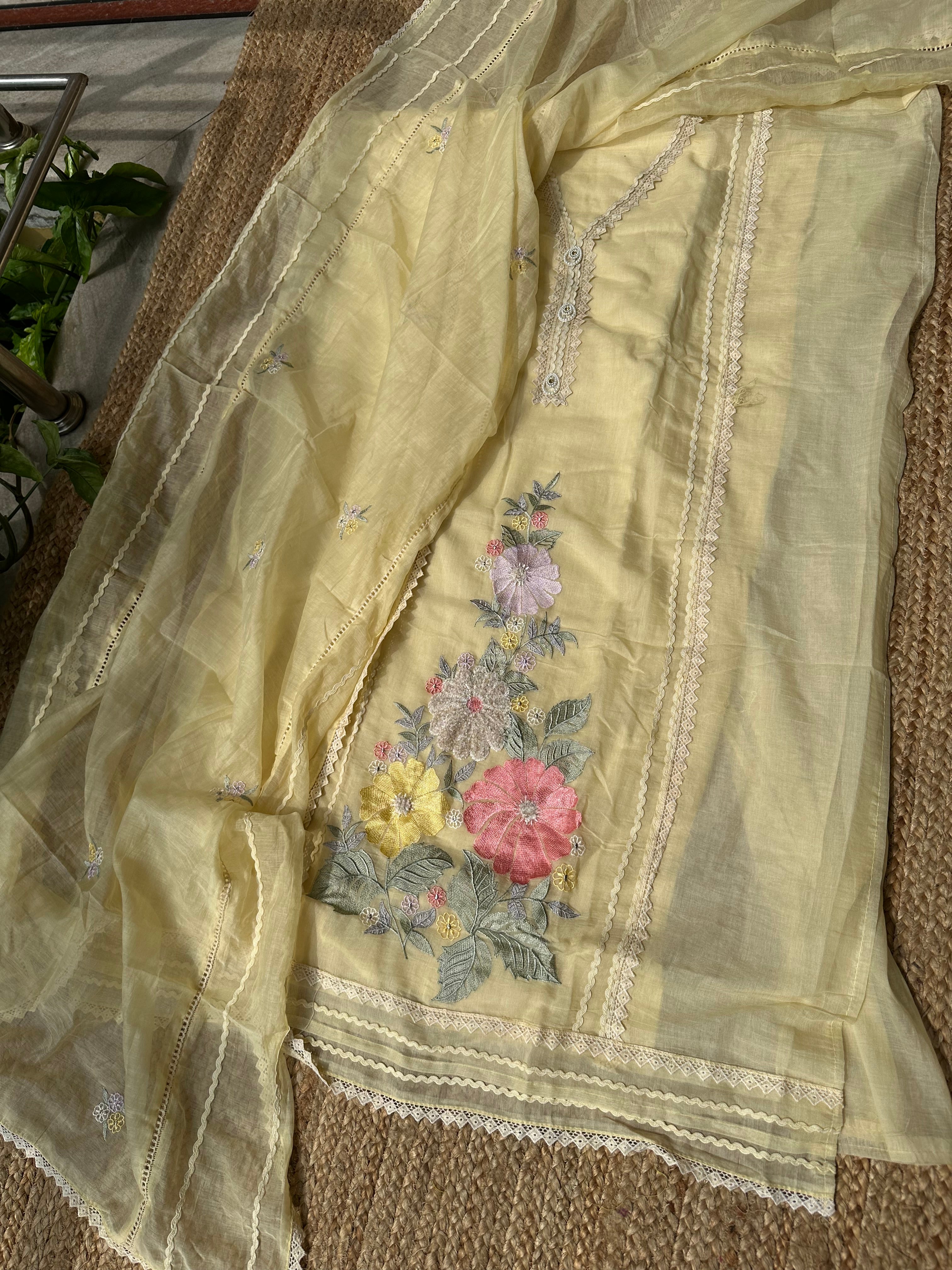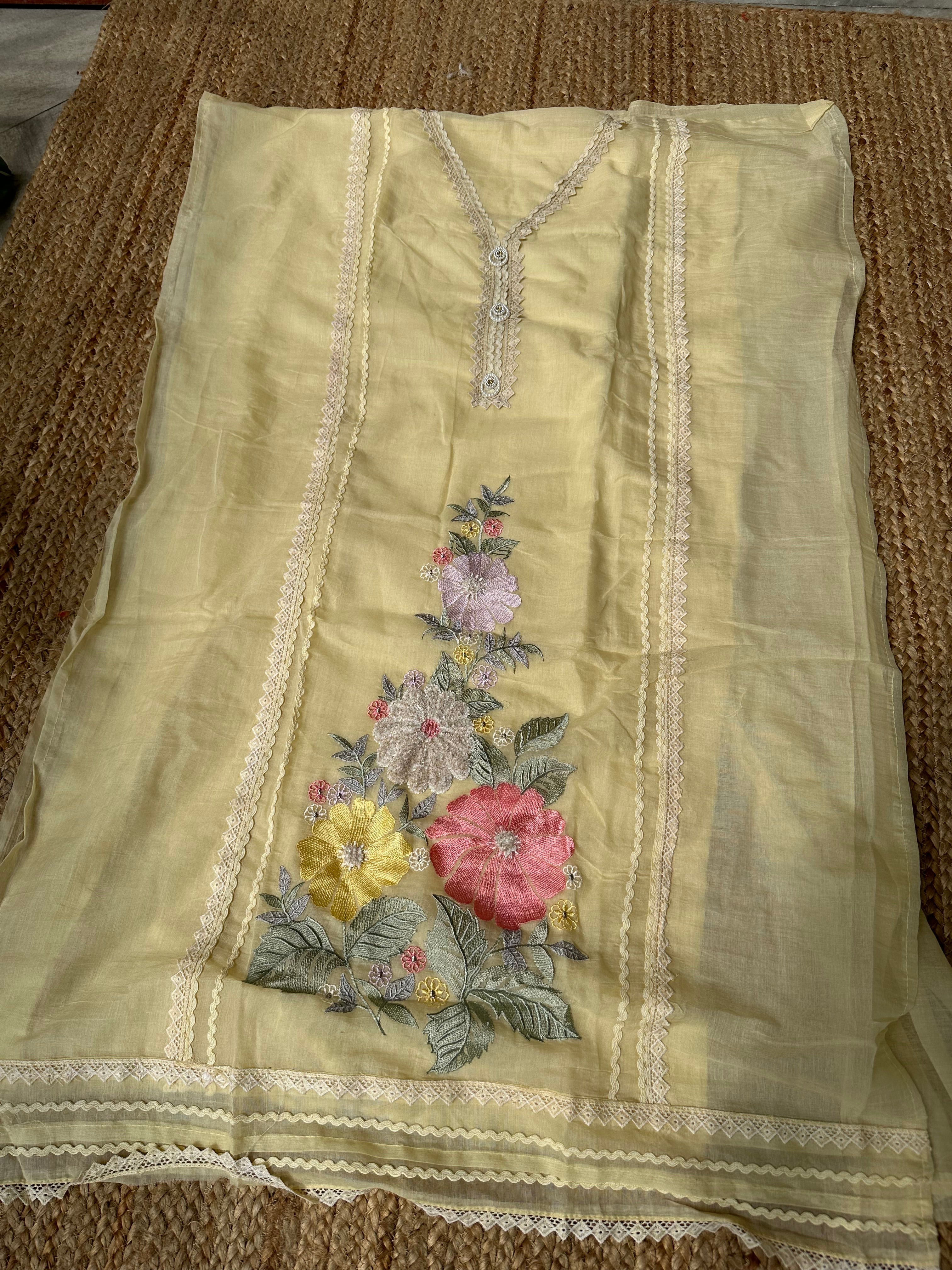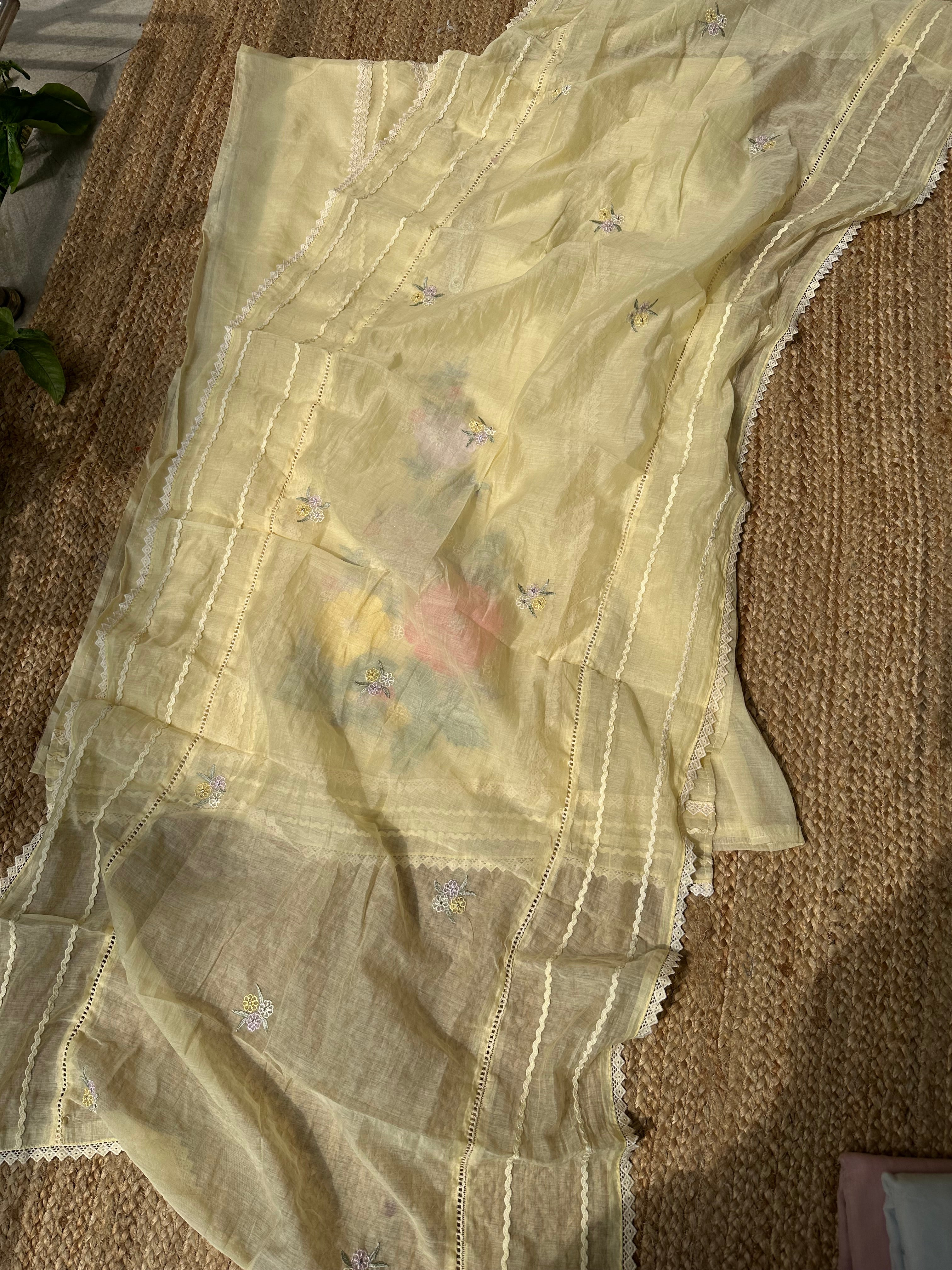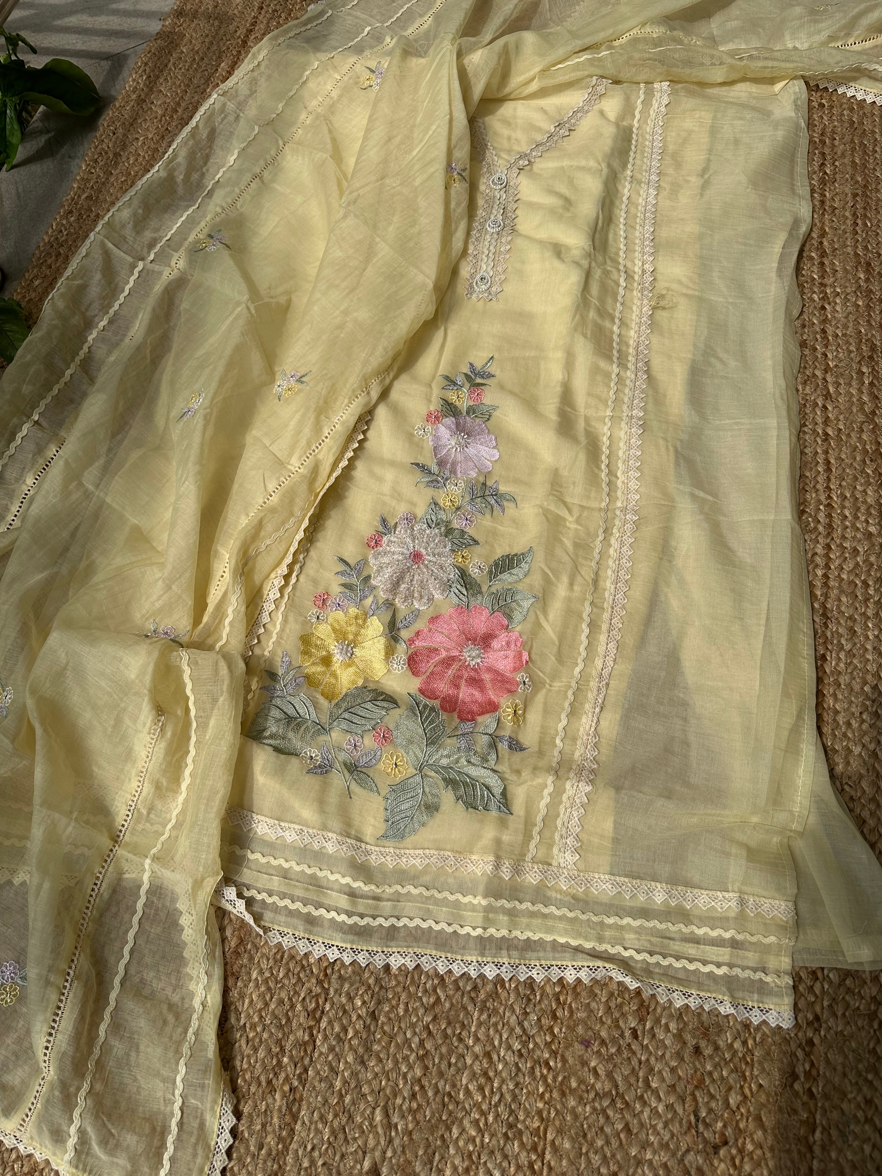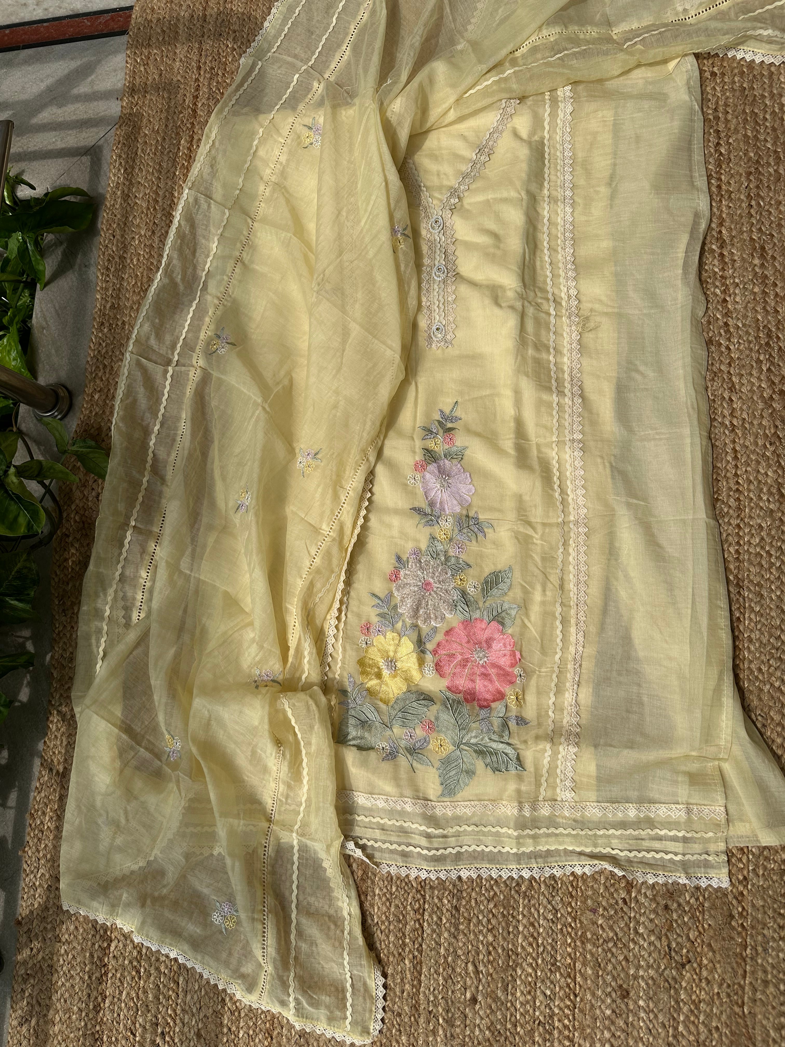 Light Lemon Mul Chanderi Embroidered Suit Set