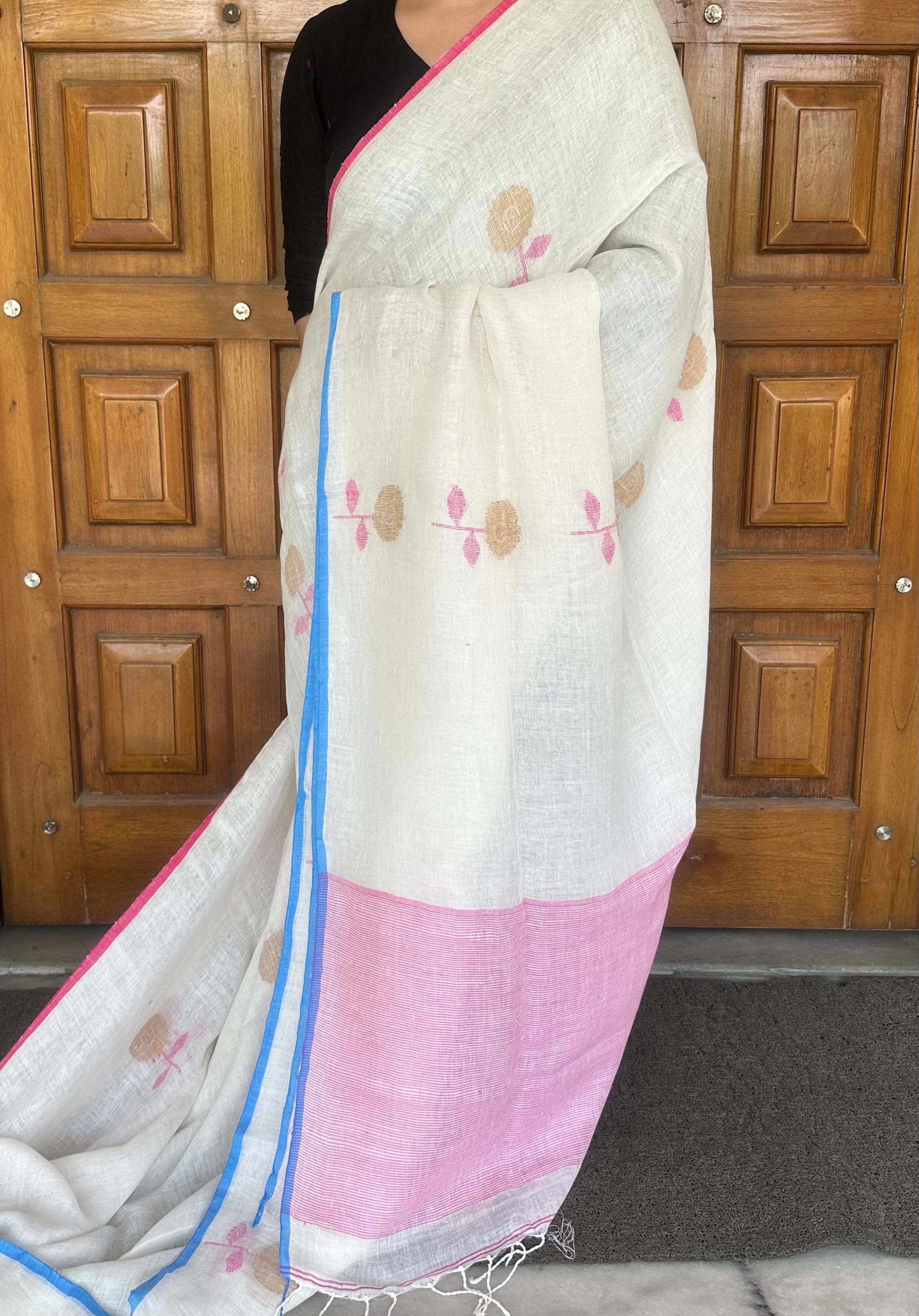 Material: Very Premium quality high count Linen saree with handwoven Jamdani motifs.
