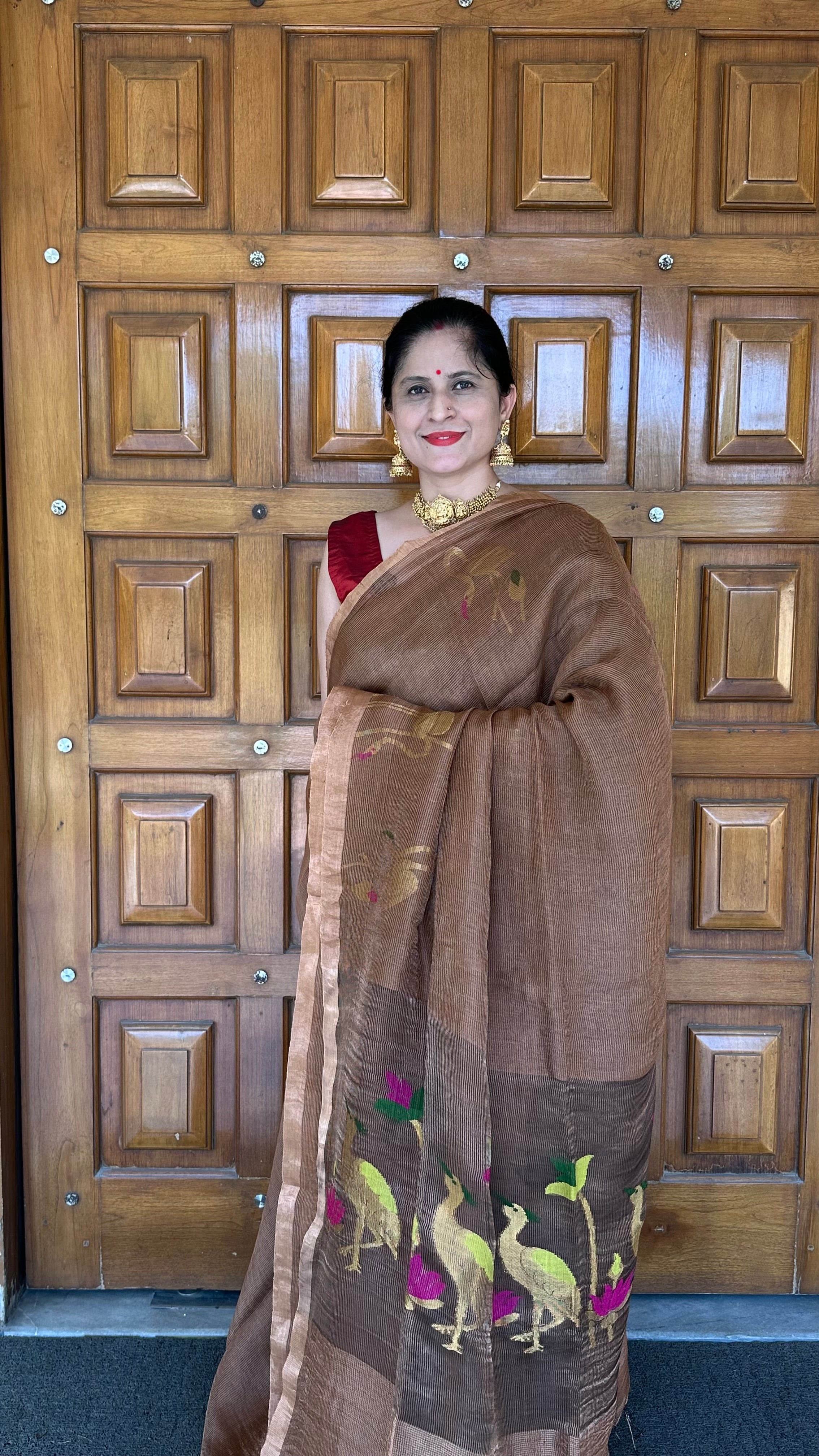Chocolate Brown Flamingo Handloom Linen Tissue Jamdani Saree