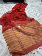 Matetial: Pure linen by linen saree with gold stripes all over and golden zari pallu. The linen used is 100 count jayshree linen. You can style it in office as well as in parties.