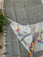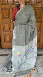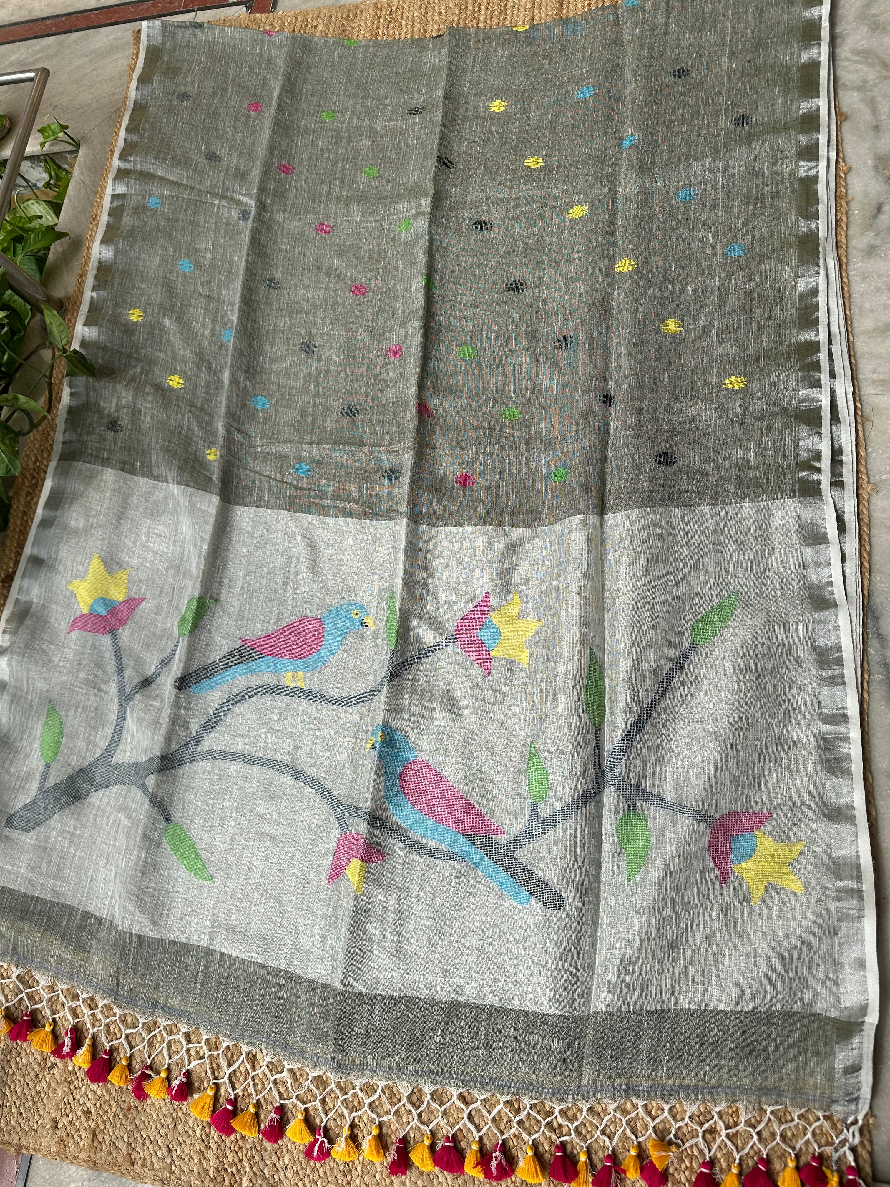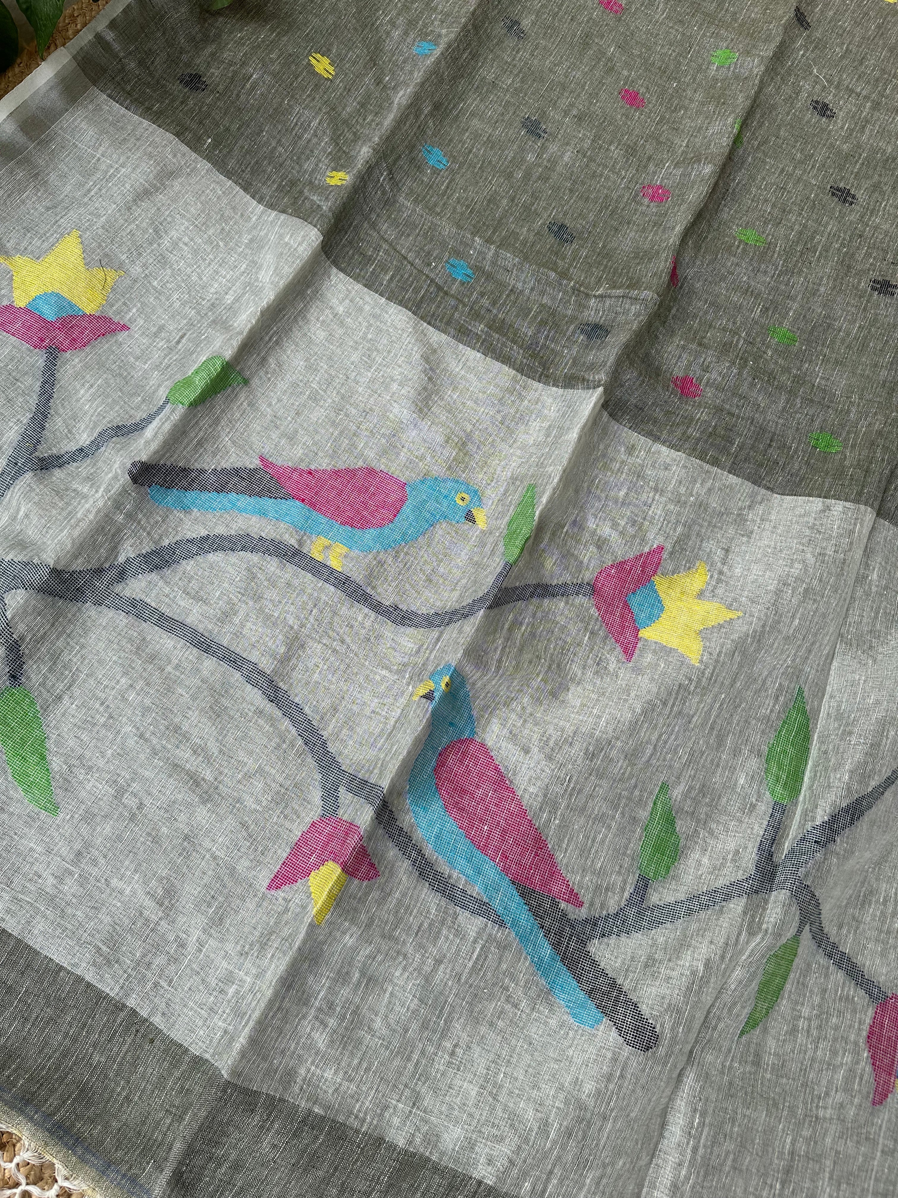 Material: Pure handloom linen fabric saree with handwoven Jamdani booti all over. From pleats portion, the bootis are at more distance. Pallu is zari pallu with Paithani inspired Jamdani handwoven work.