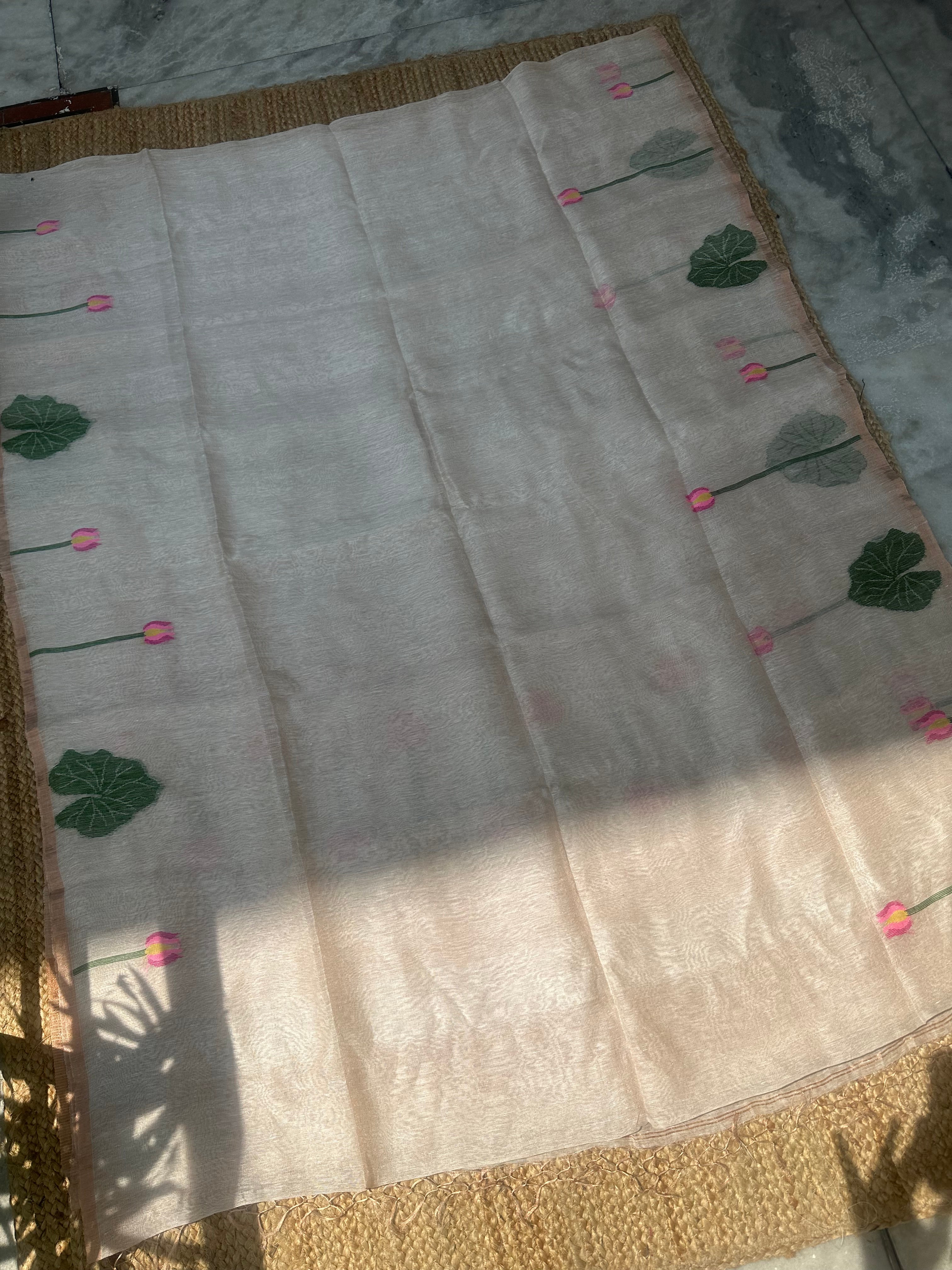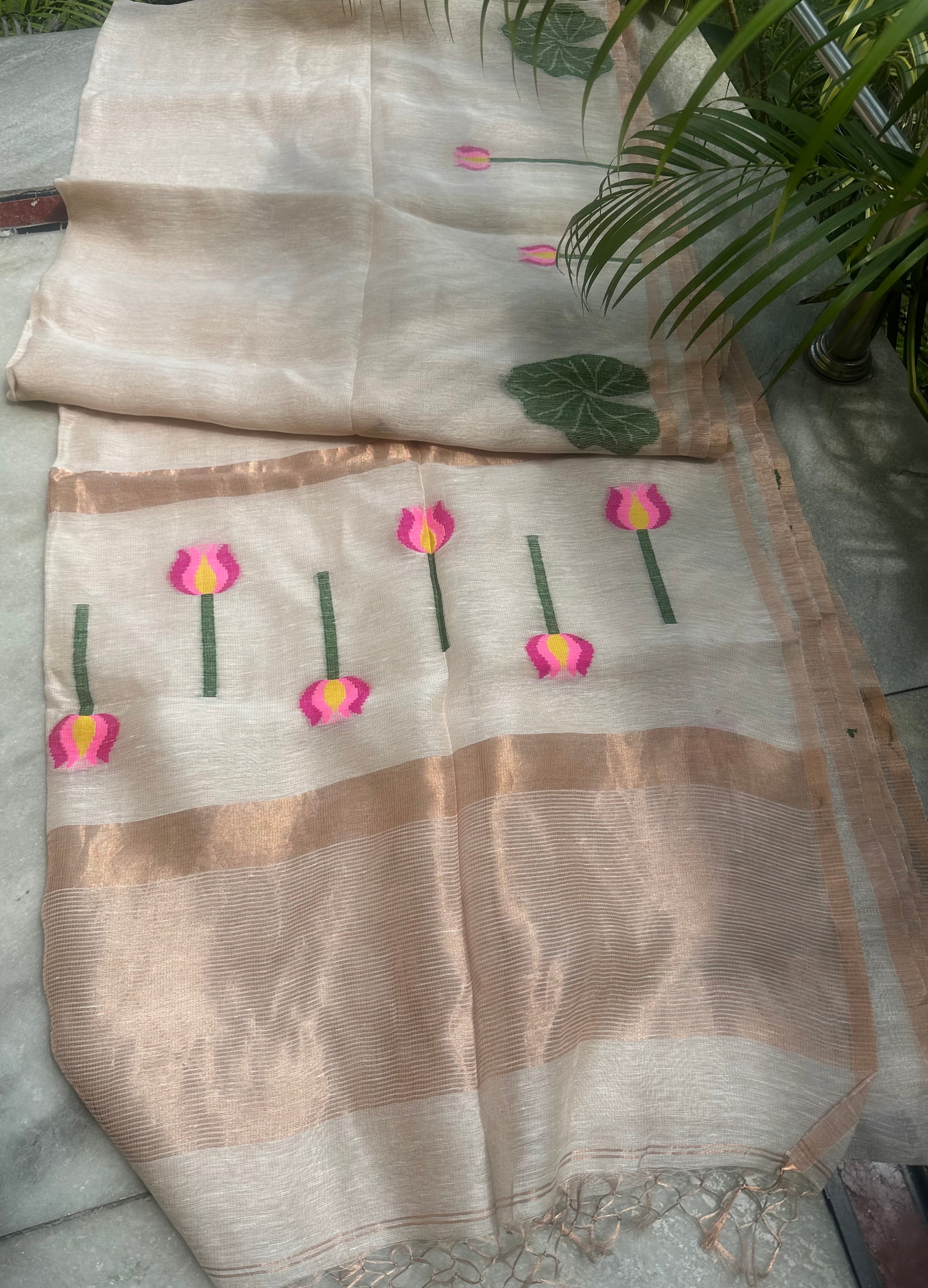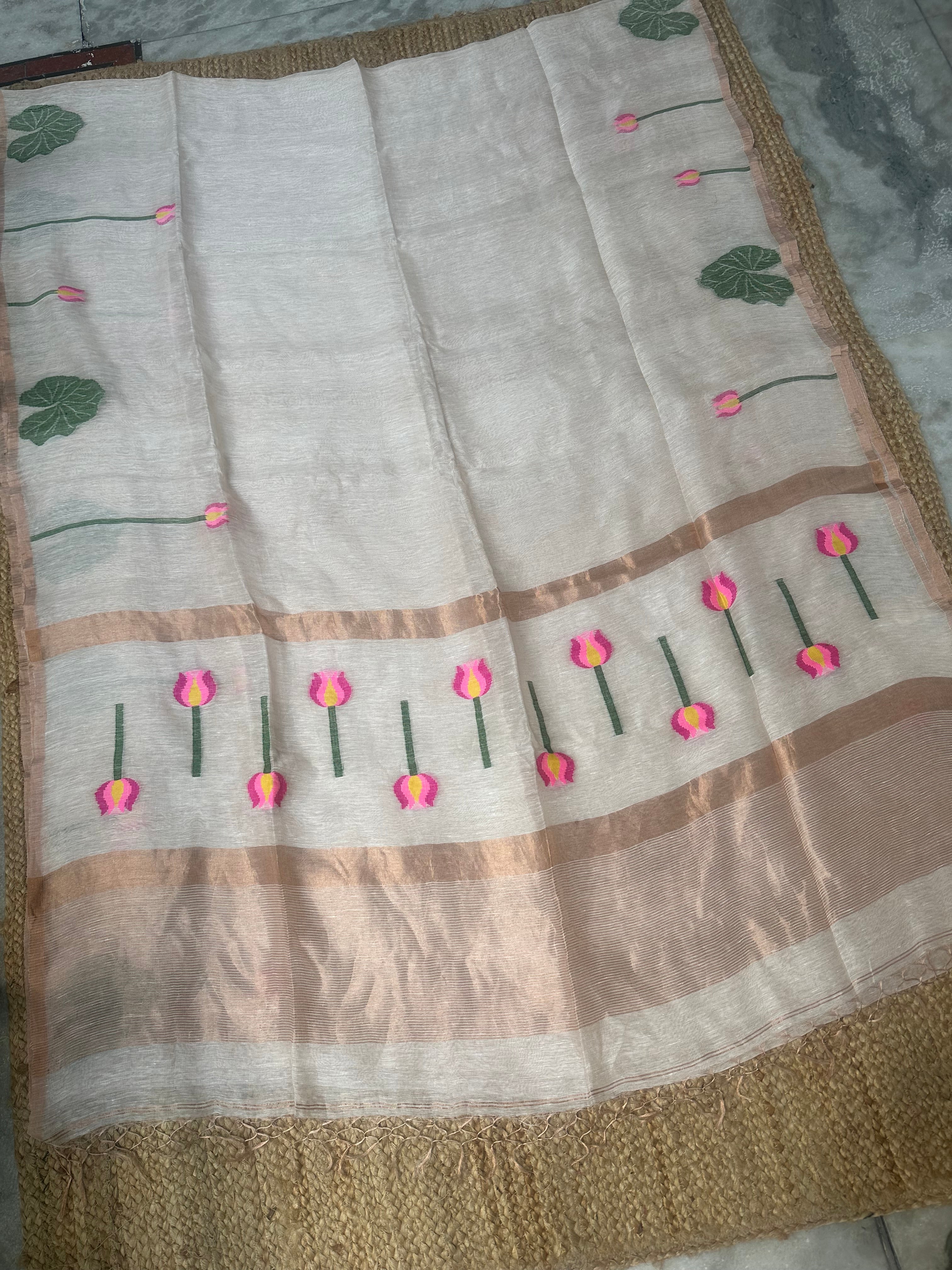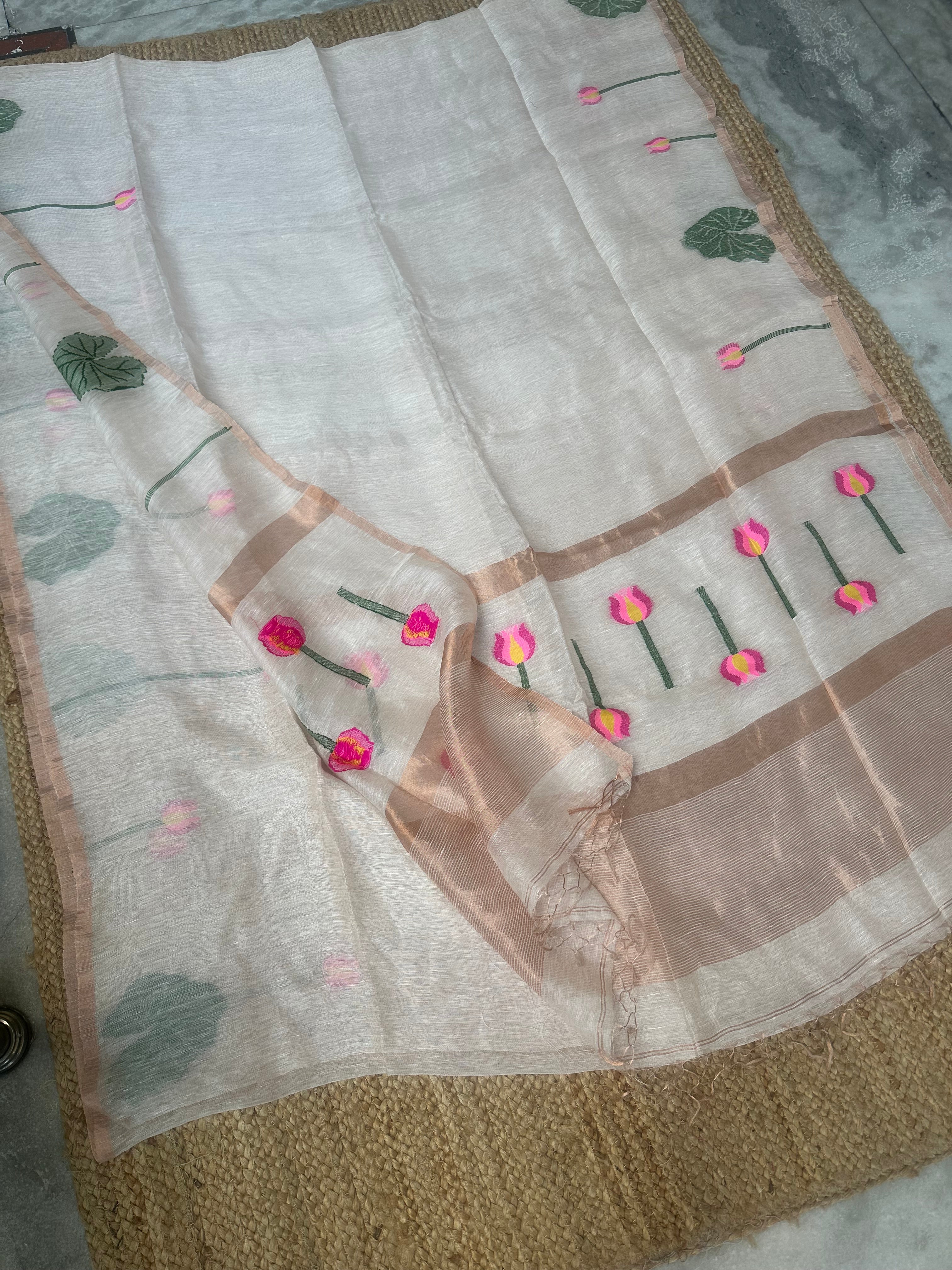 Material: Premium 120 count Jayshree Linen Tissue saree. It has handwoven Jamdani work of Lotus leaves & flowers in colourful threads and zari.