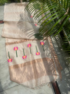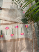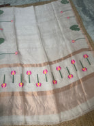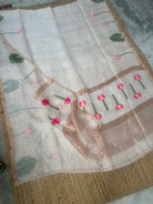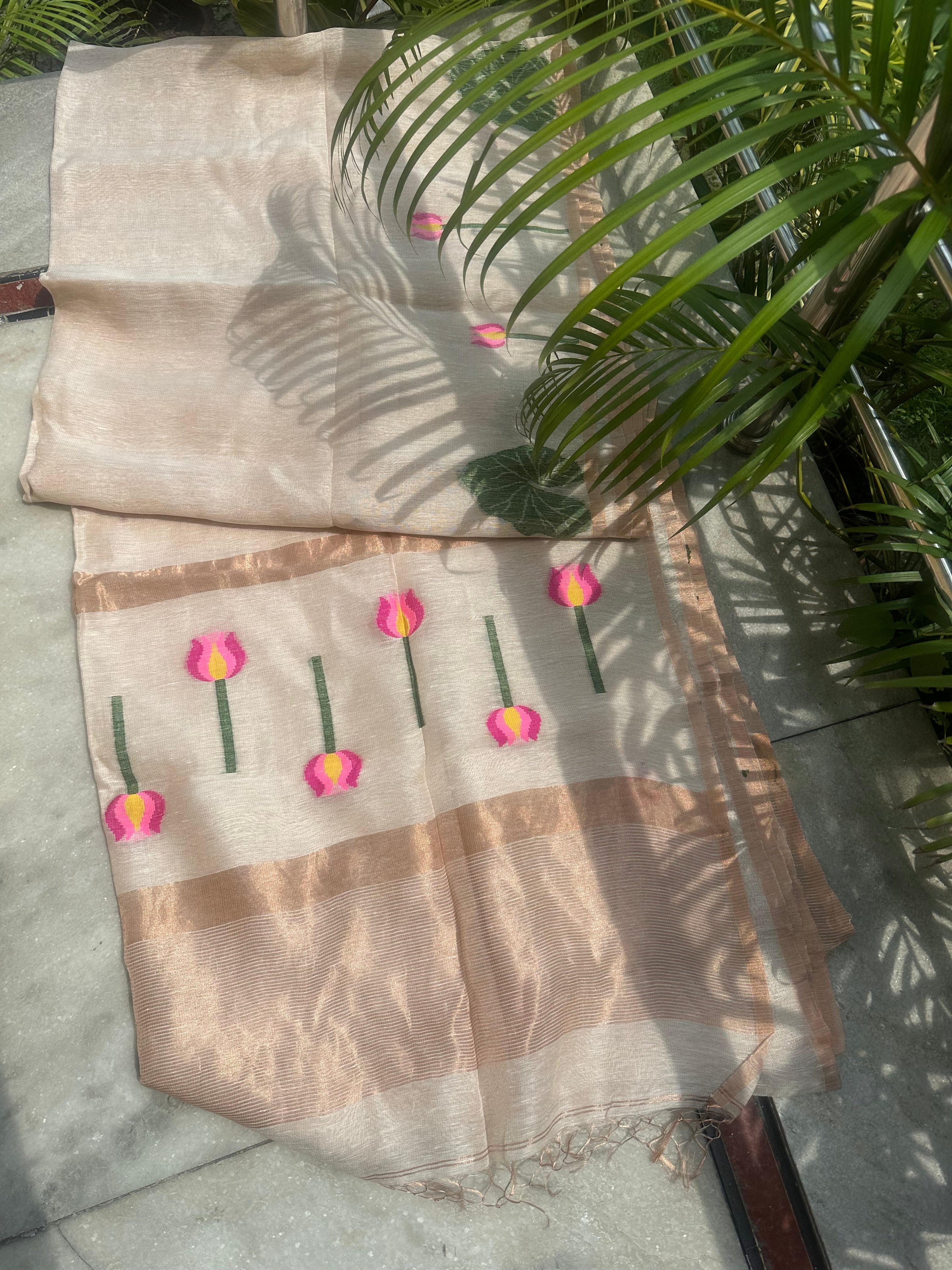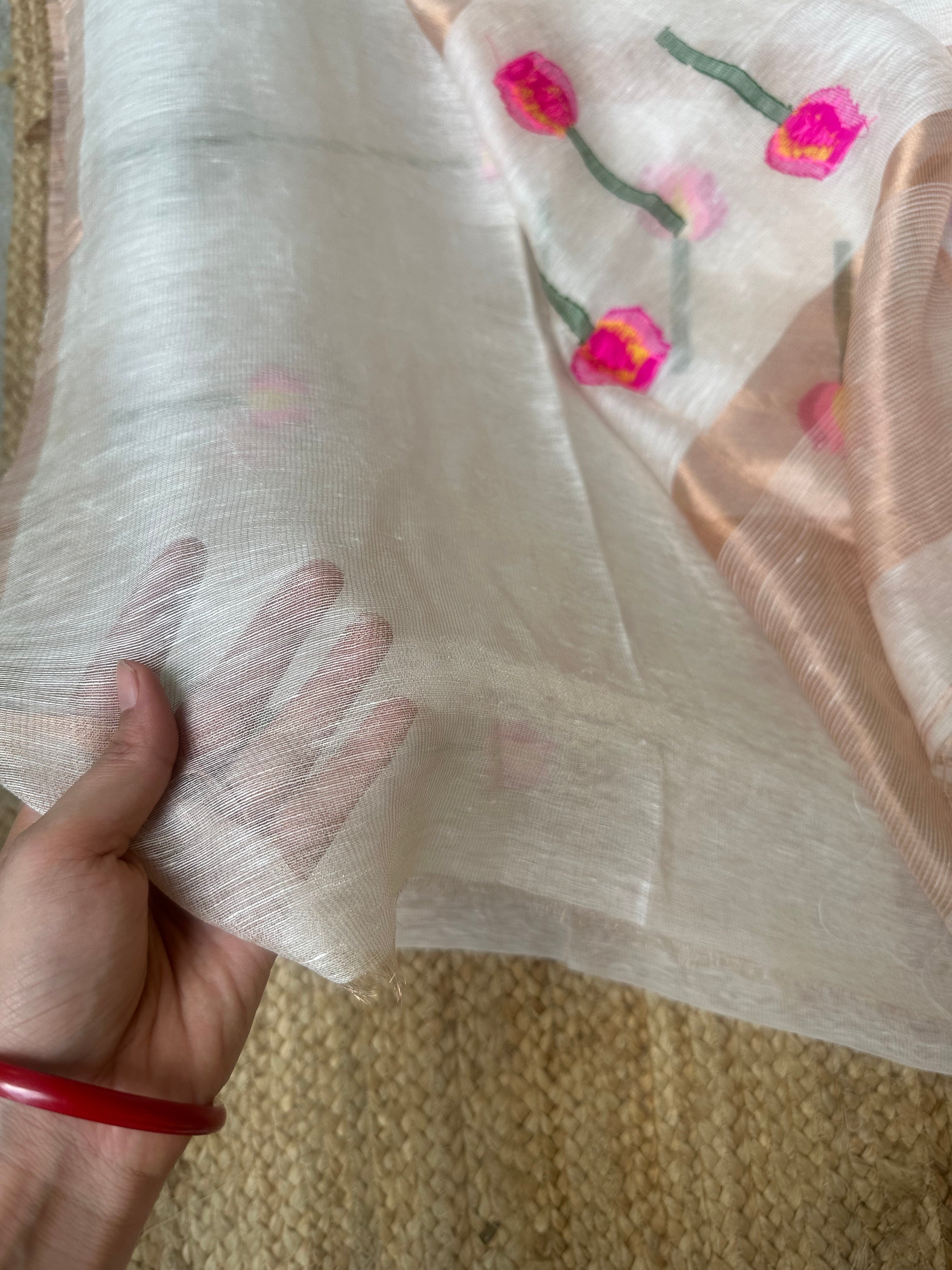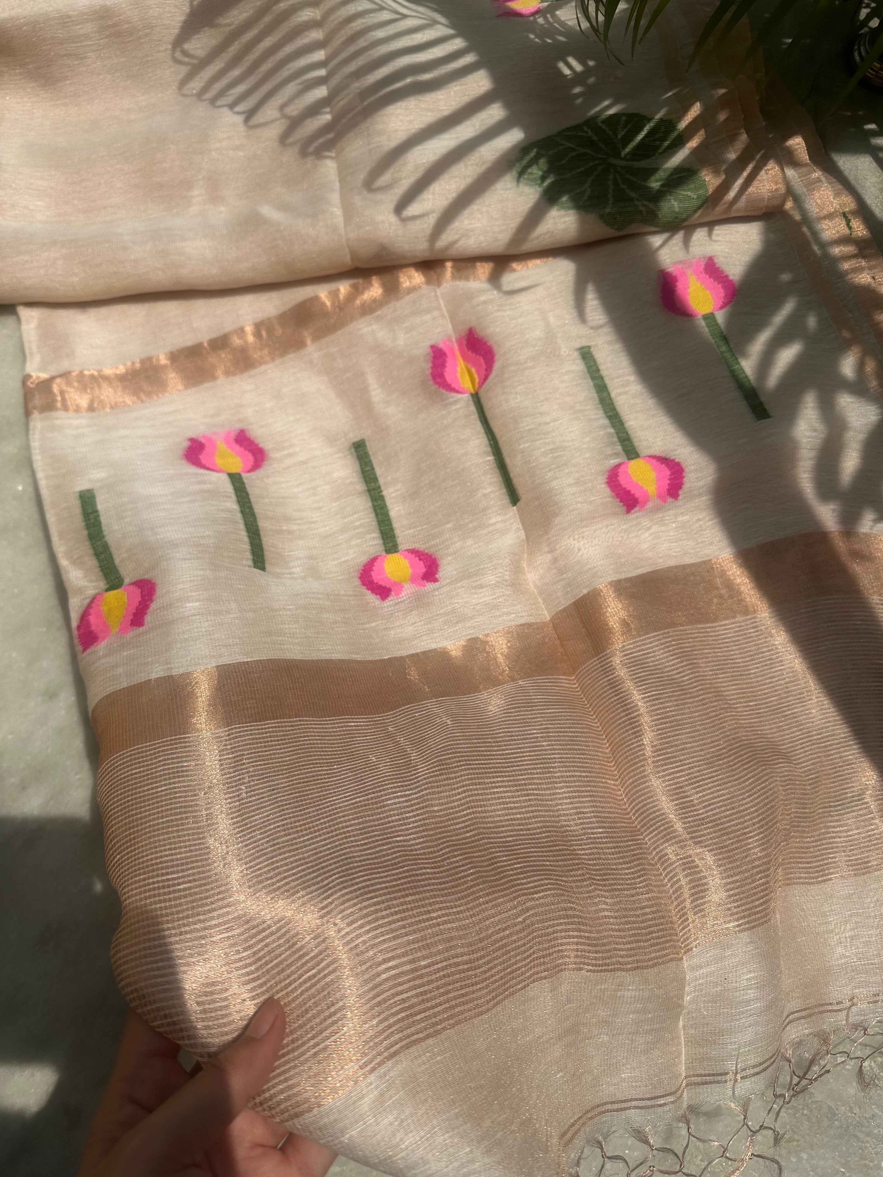 Material: Premium 120 count Jayshree Linen Tissue saree. It has handwoven Jamdani work of Lotus leaves & flowers in colourful threads and zari.