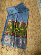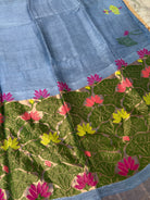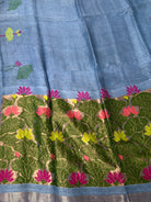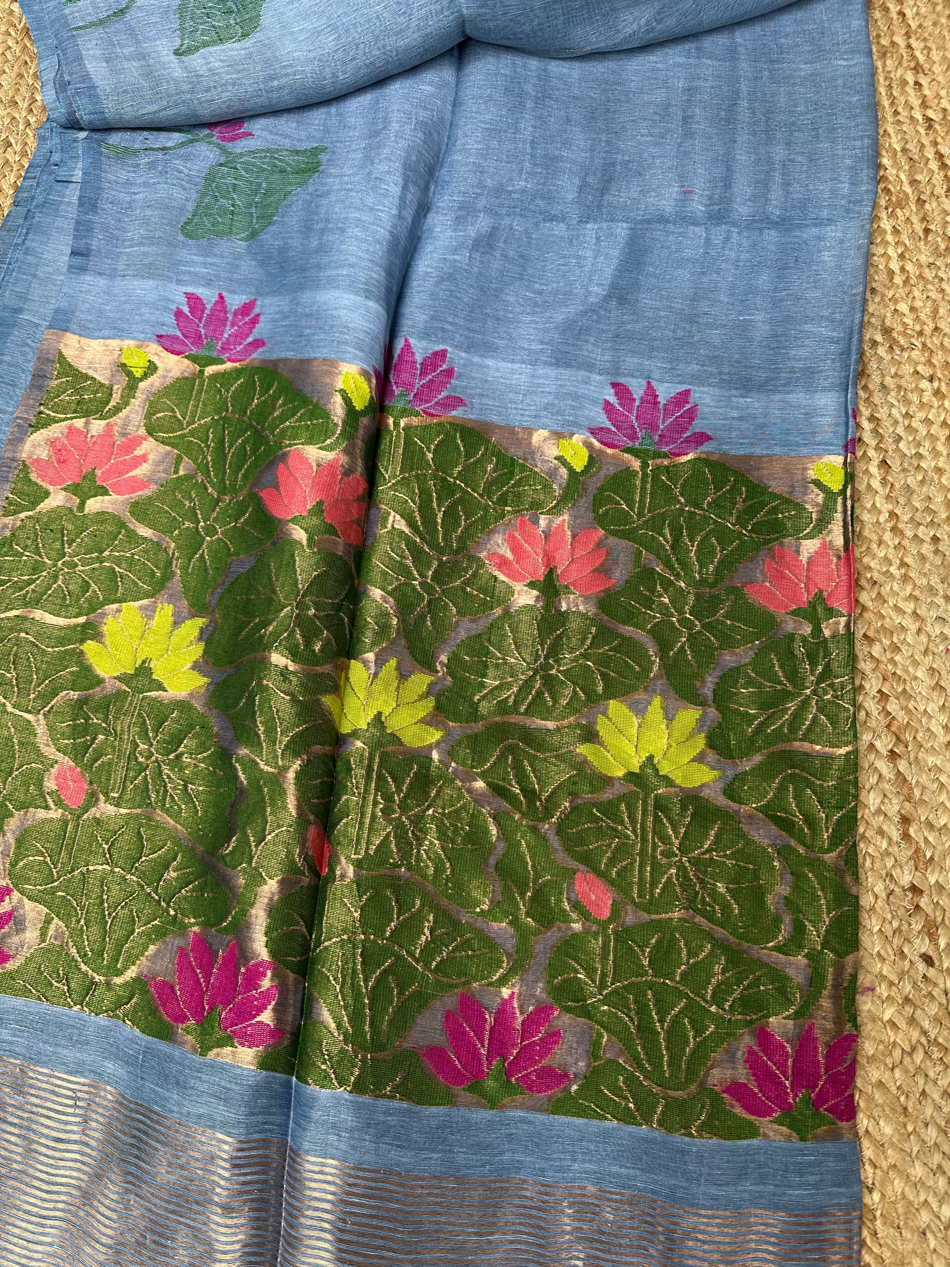 Pure Linen Silk Handloom Jamdani Saree Heavy Lotus Leaves Pallu- Dusty Blue