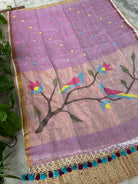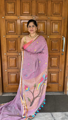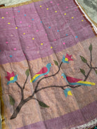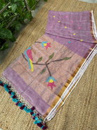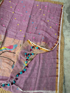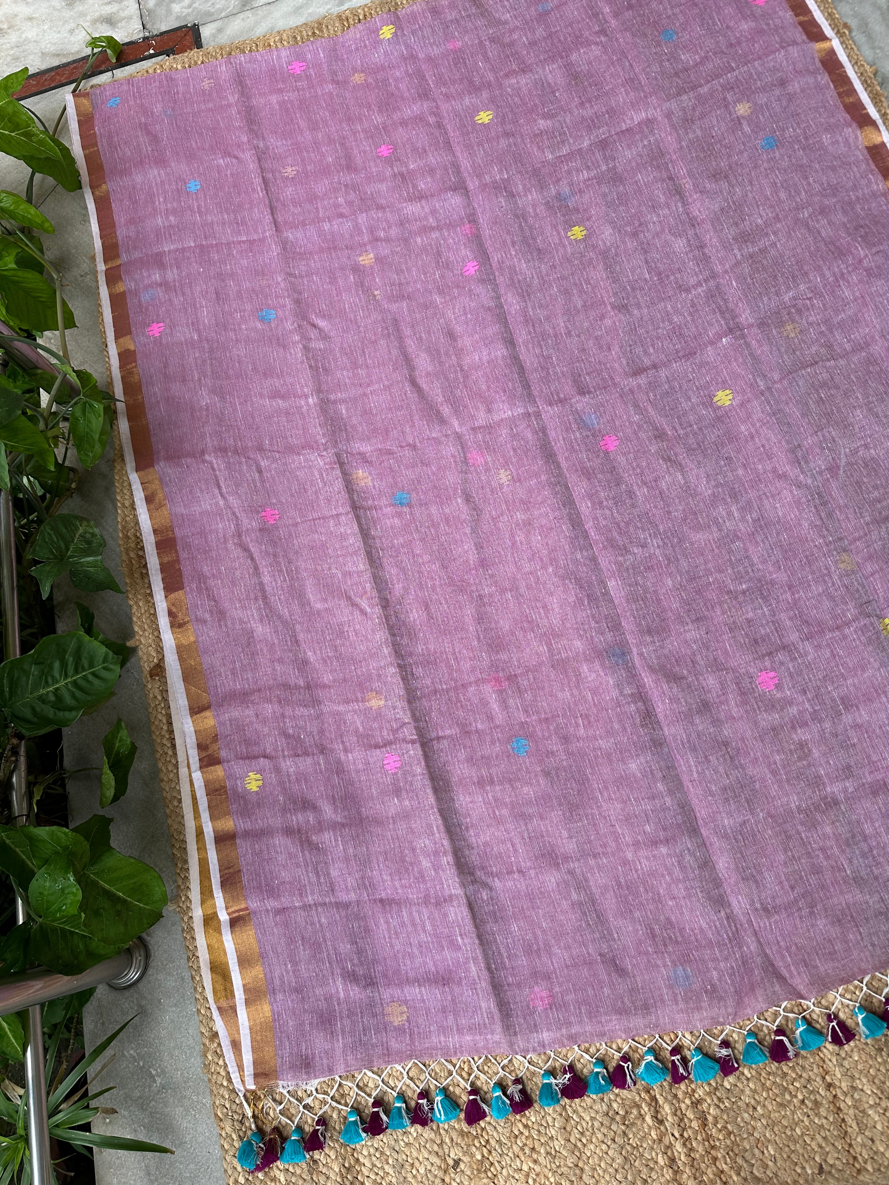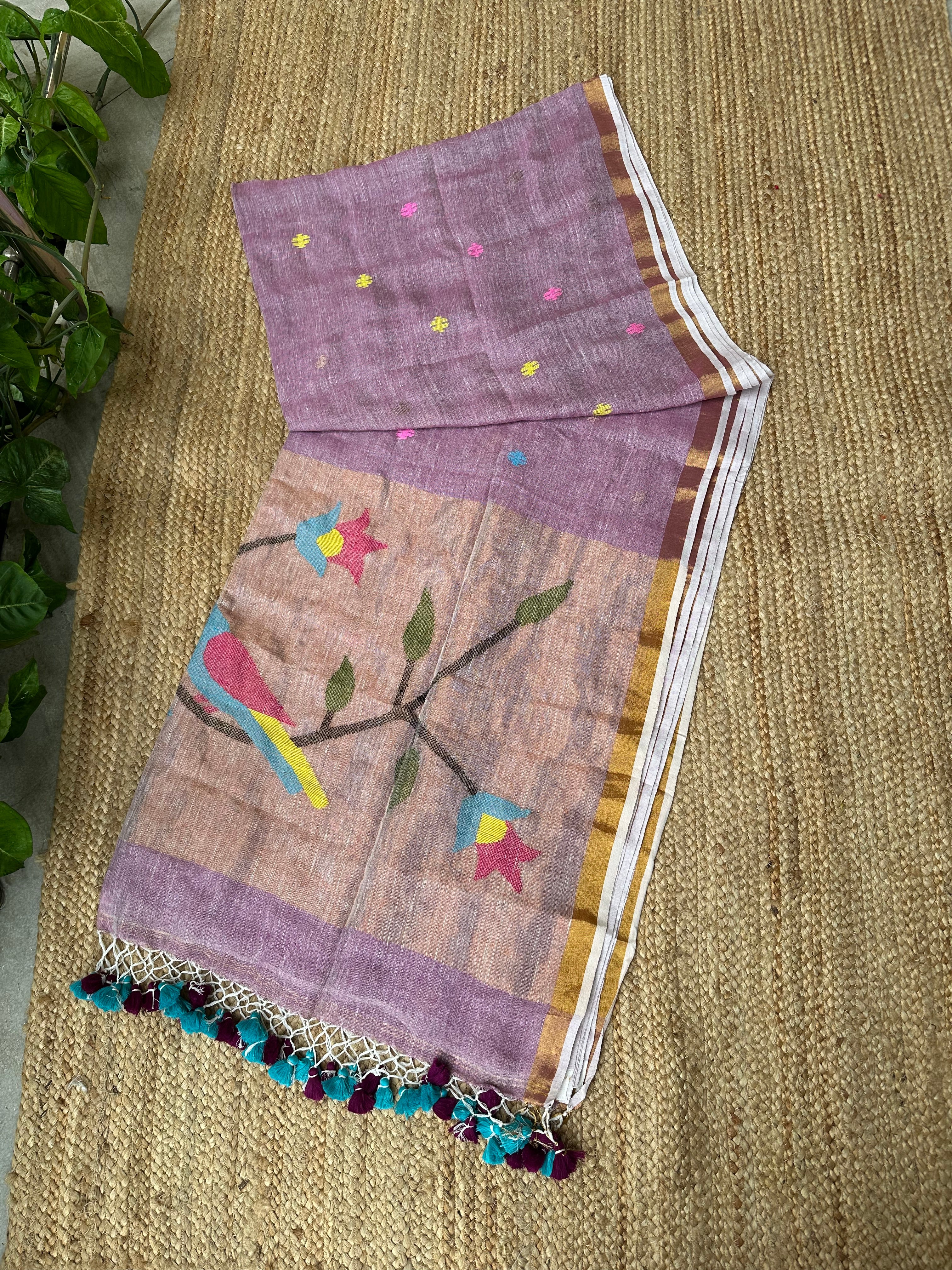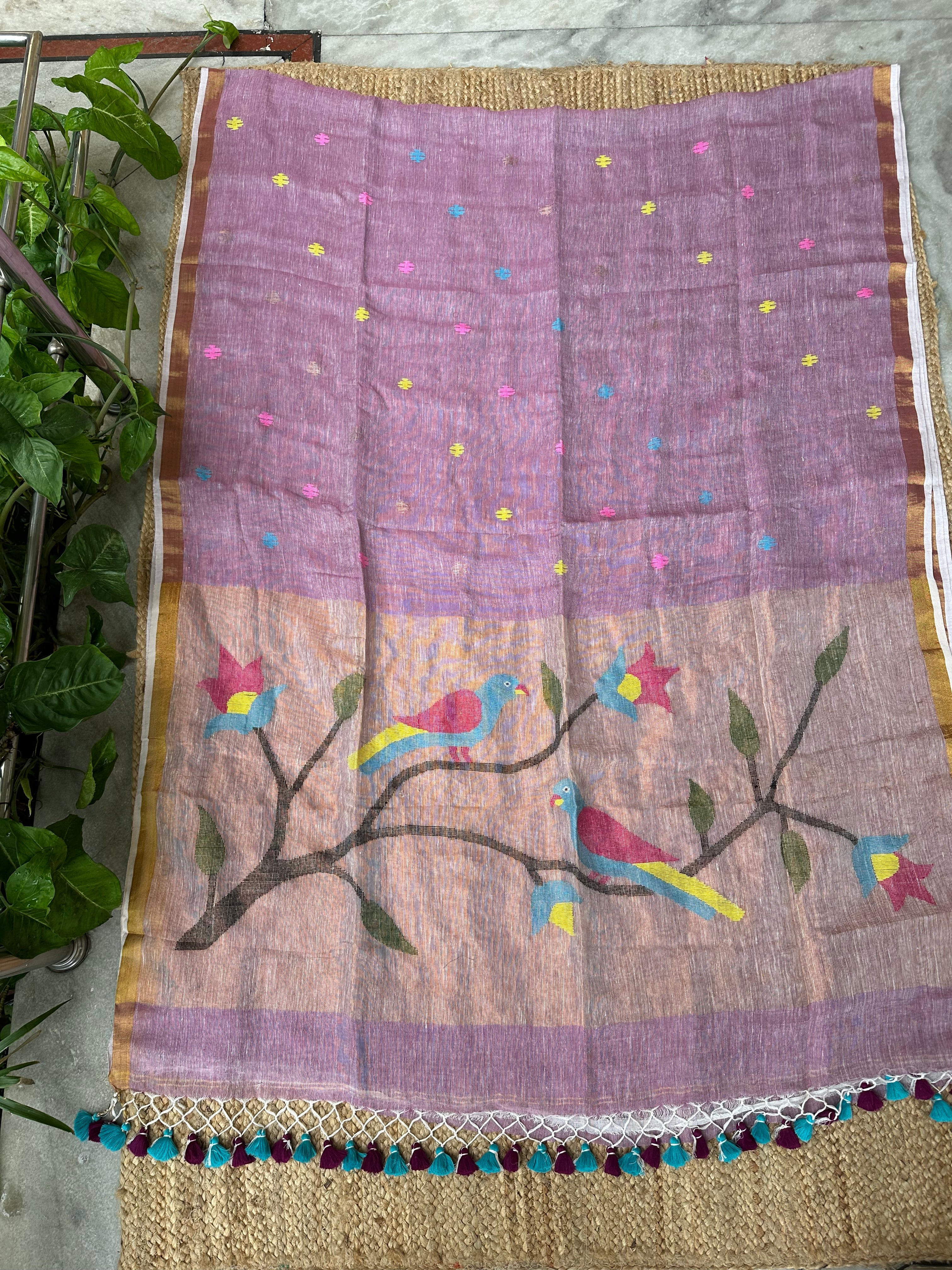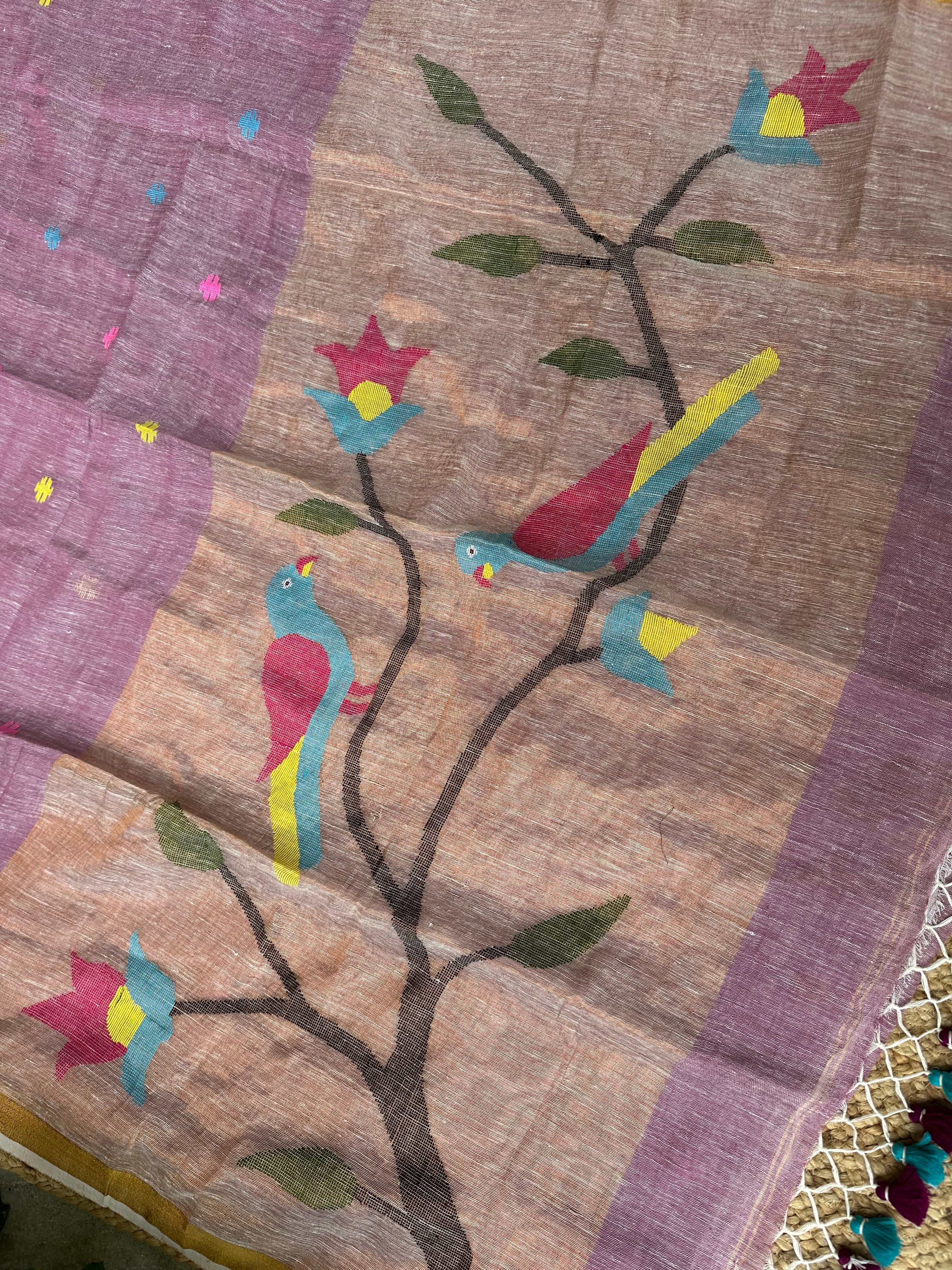 Material: Pure handloom linen fabric saree with handwoven Jamdani booti all over. From pleats portion, the bootis are at more distance. Pallu is zari pallu with Paithani inspired Jamdani handwoven work.