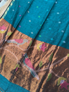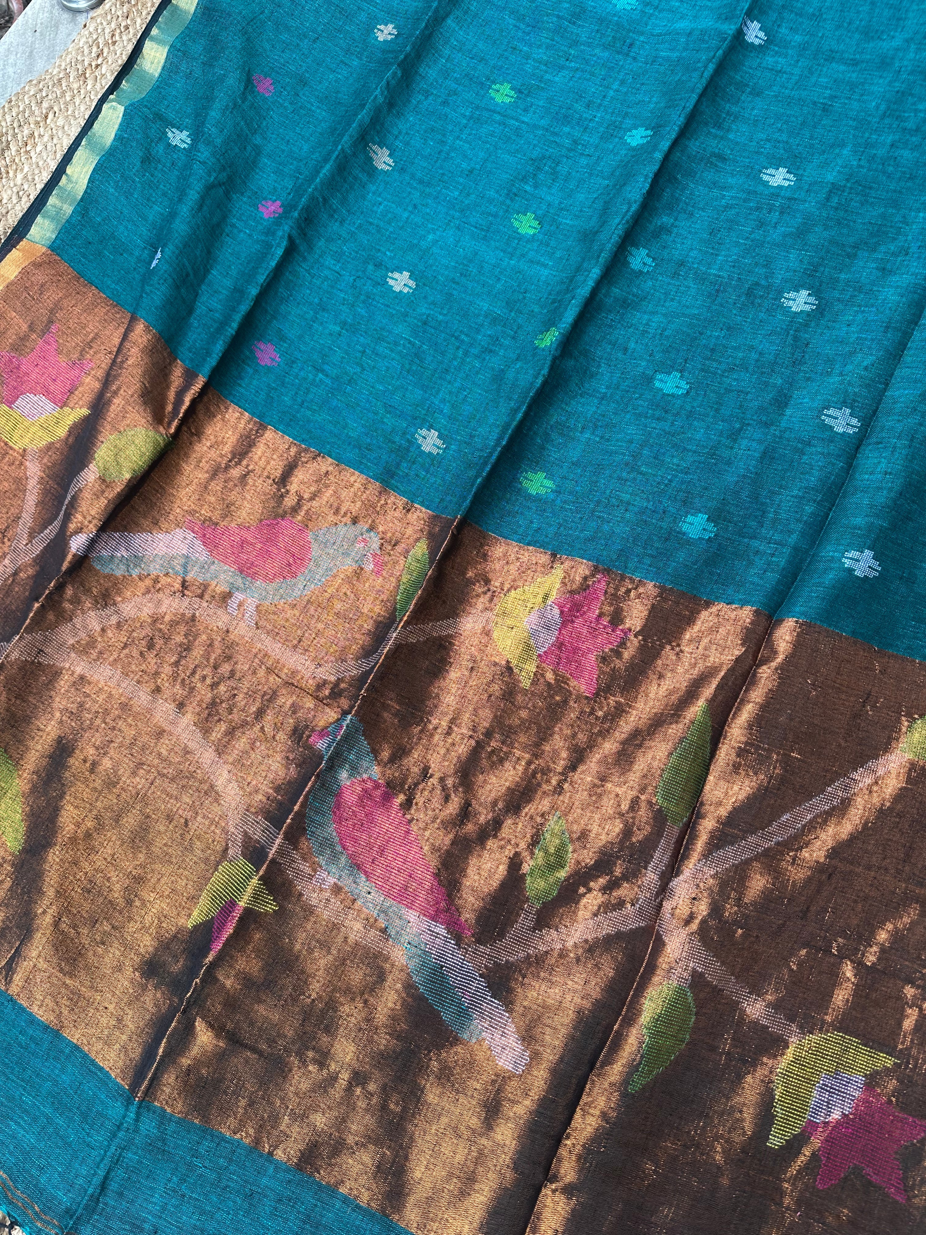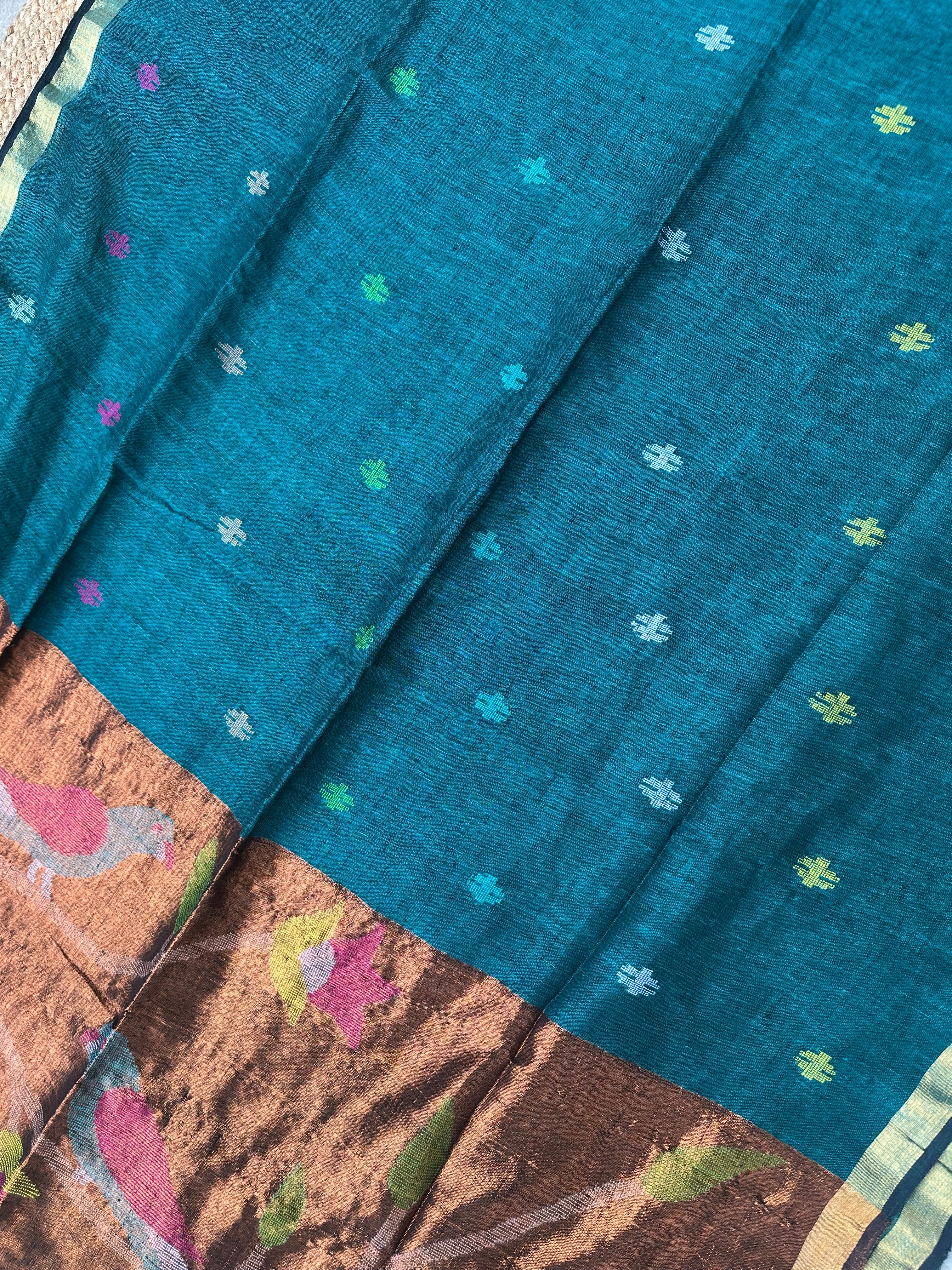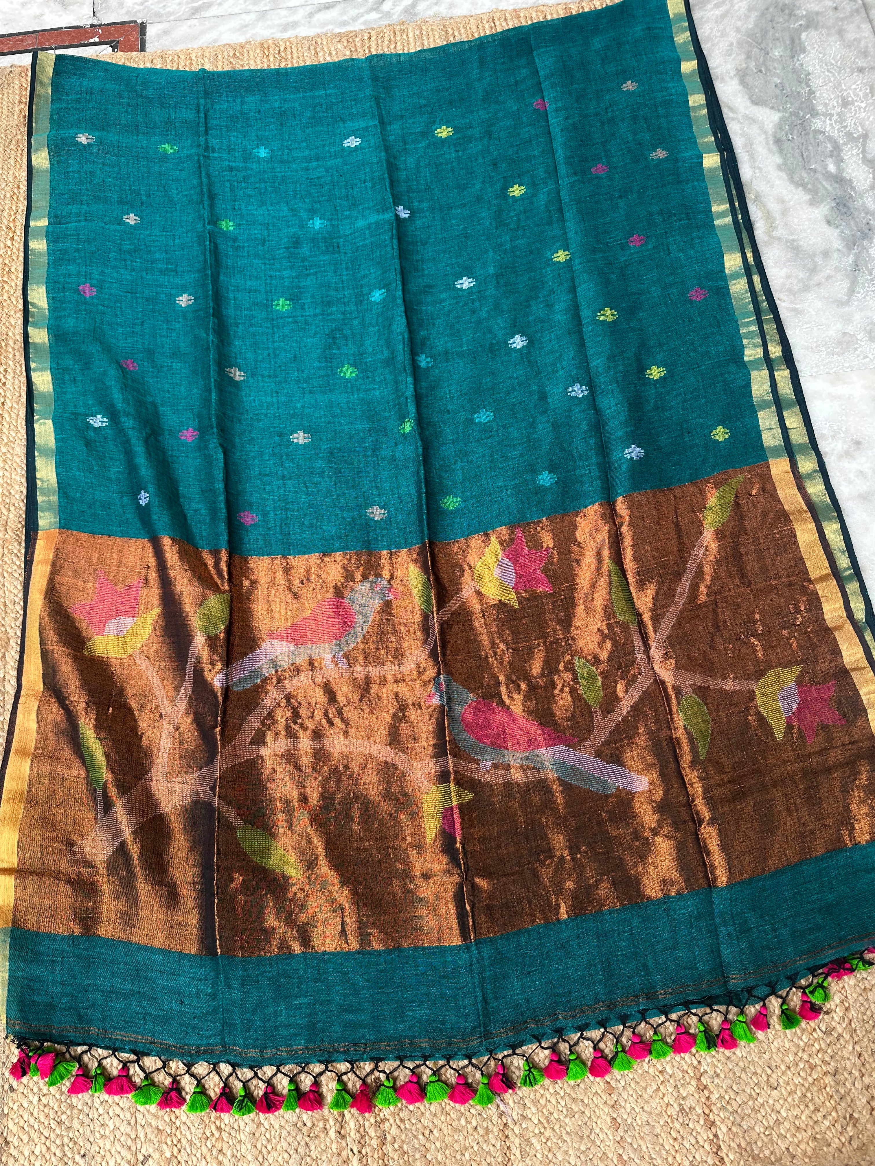 Material: Pure handloom linen fabric saree with handwoven Jamdani booti all over. From pleats portion, the bootis are at more distance. Pallu is zari pallu with Paithani inspired Jamdani handwoven work.
