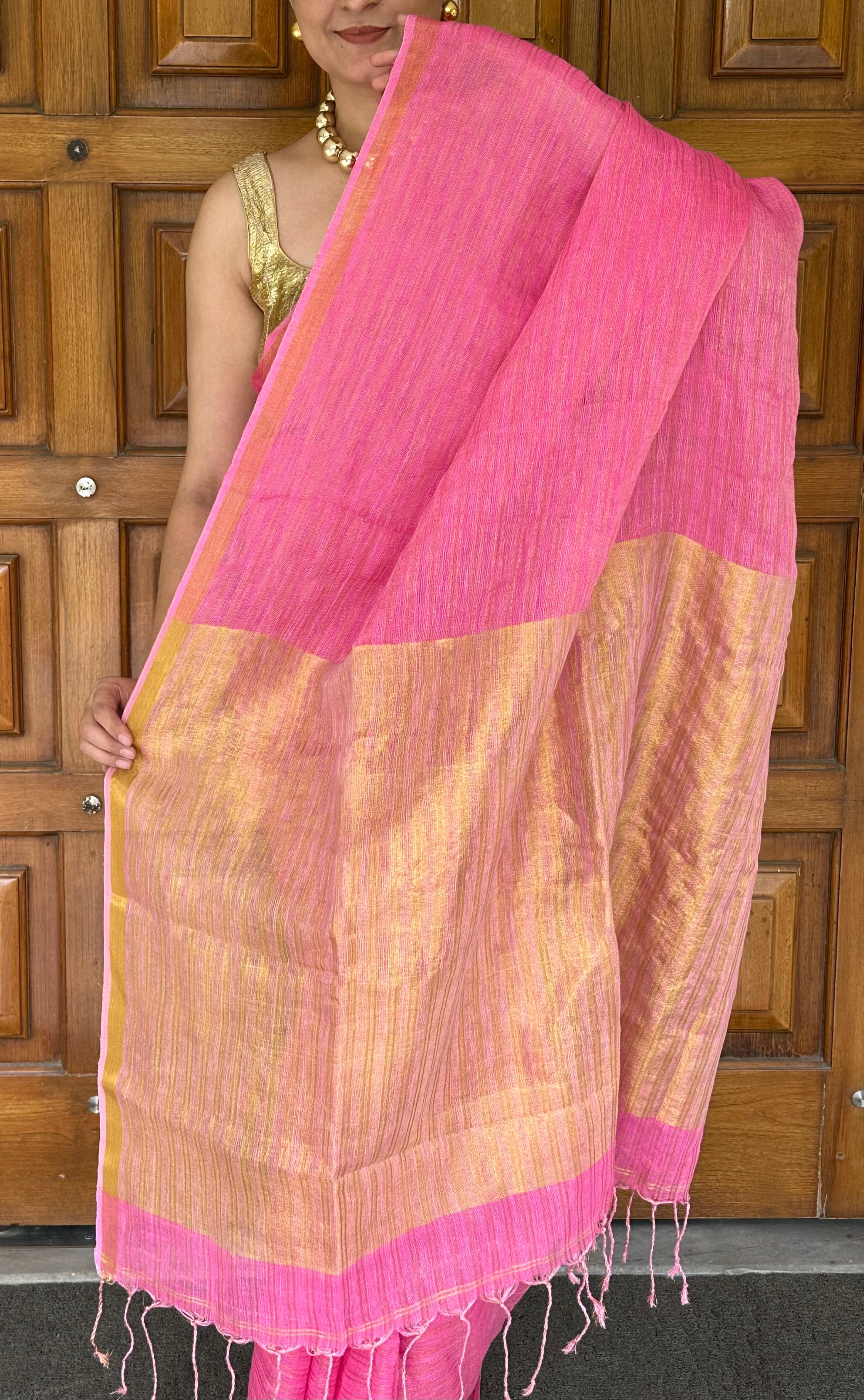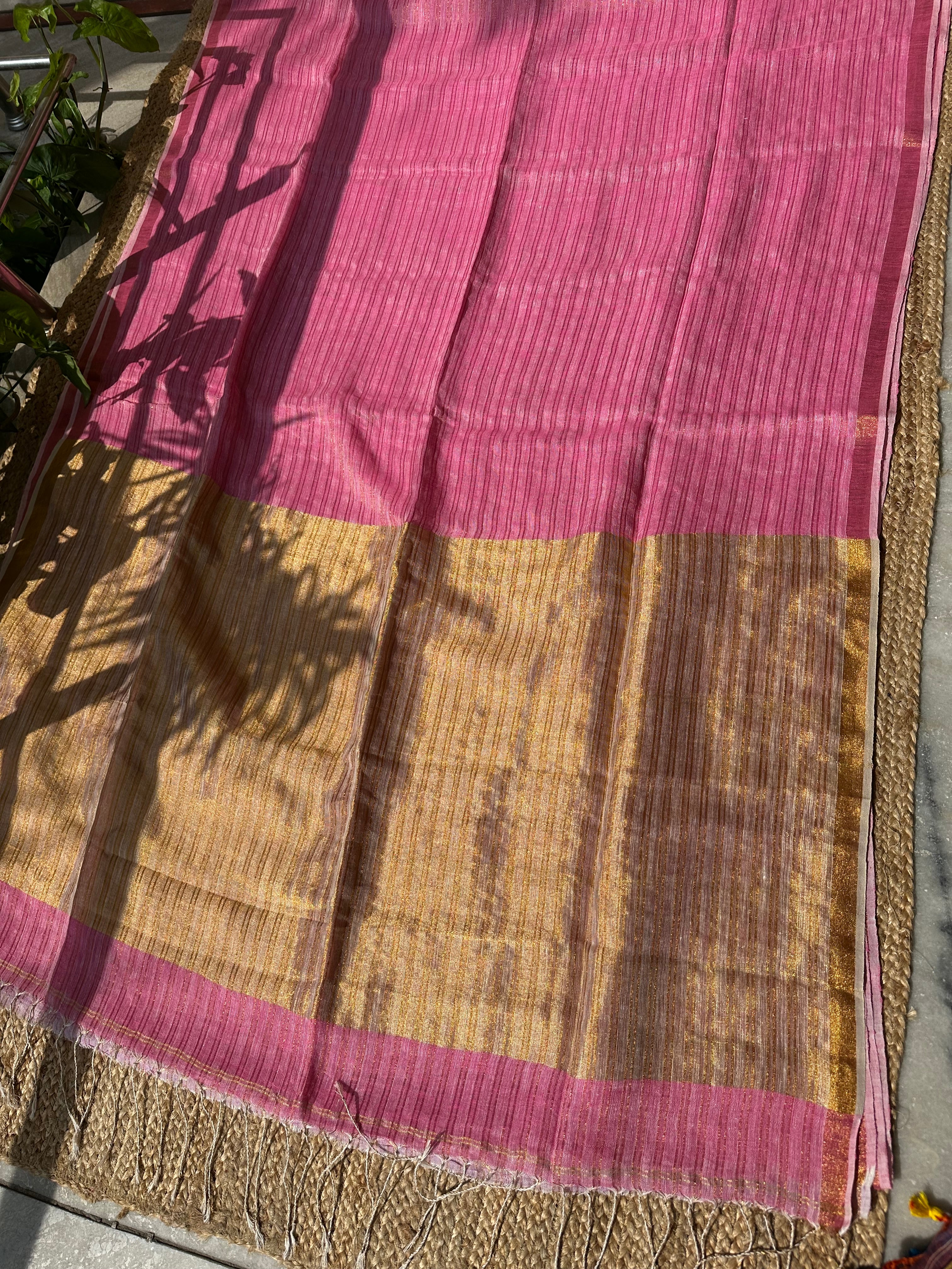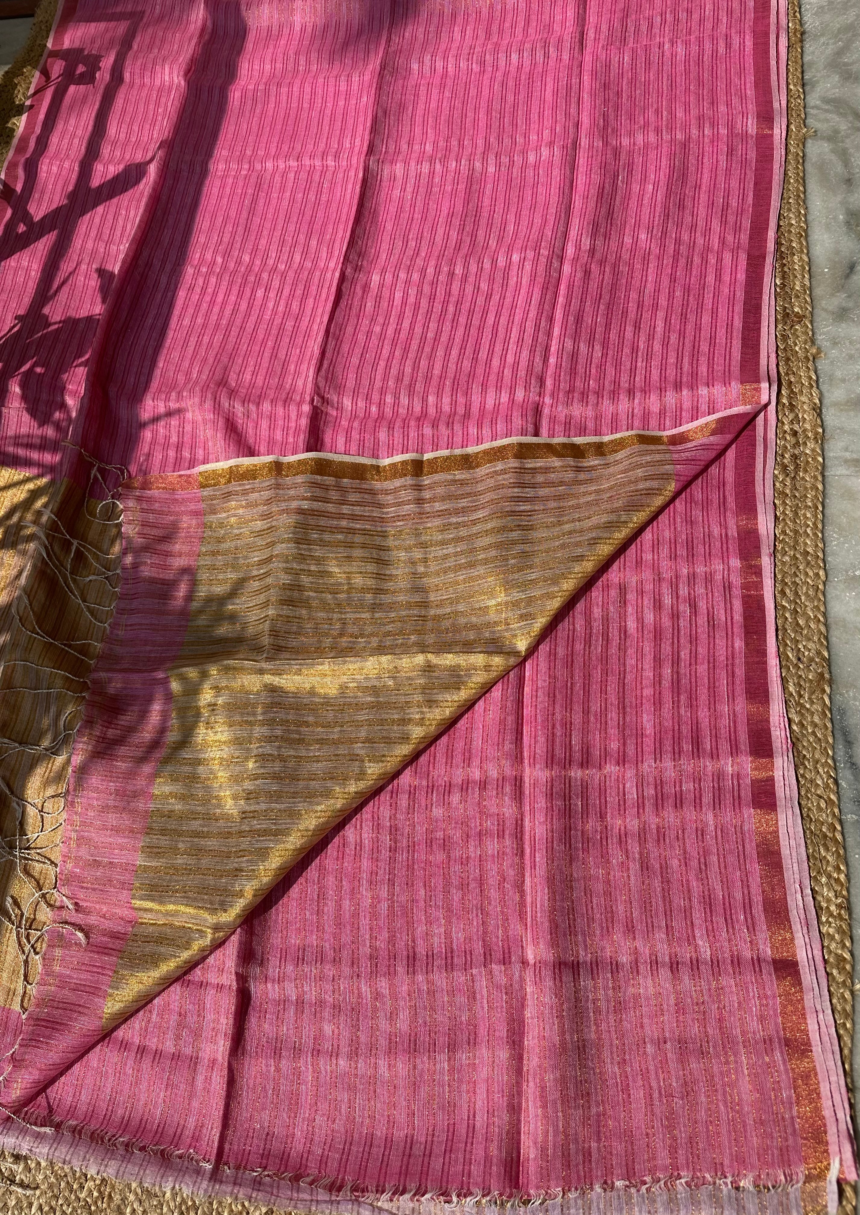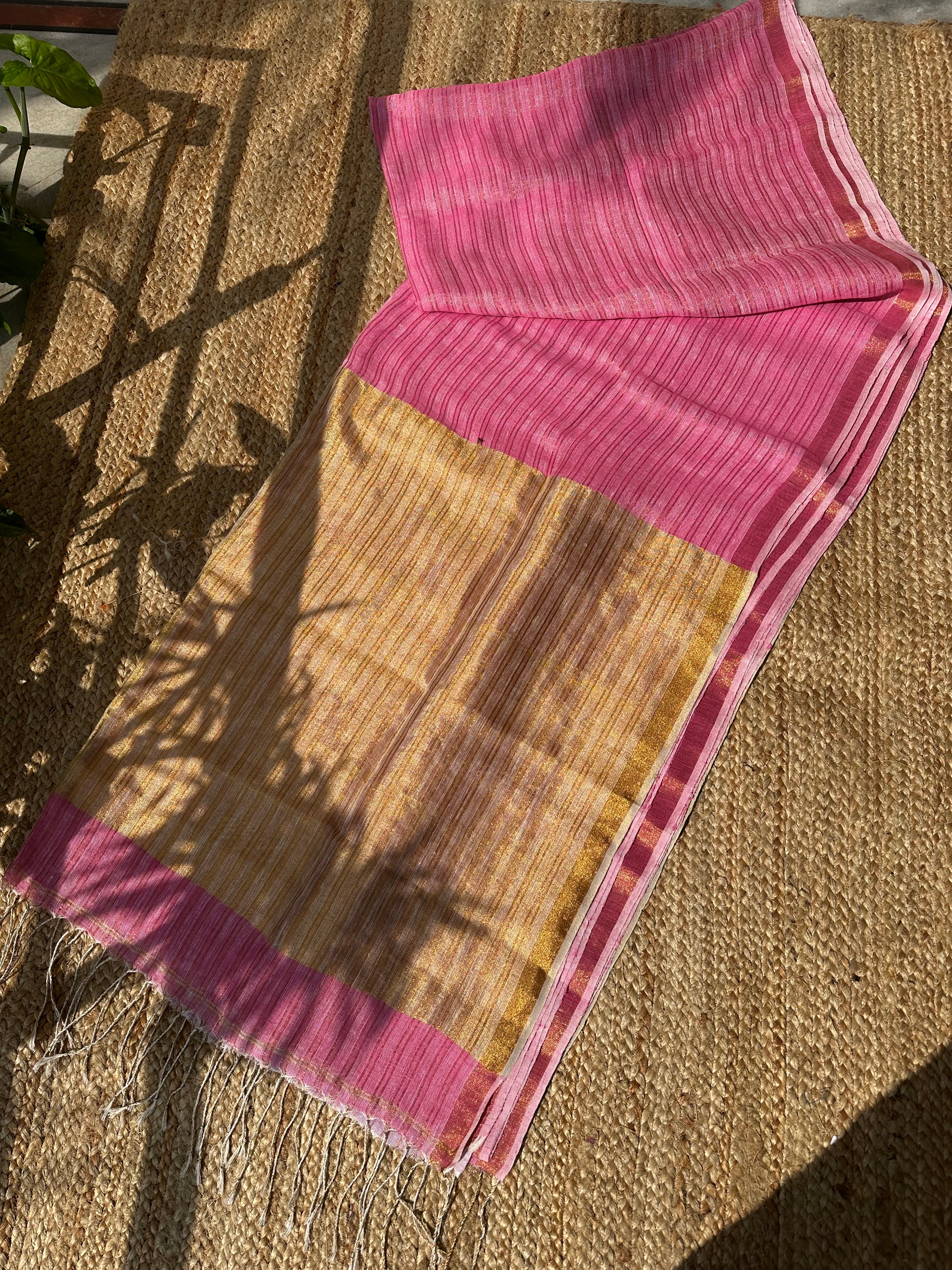 Matetial: Pure linen by linen saree with gold stripes all over and golden zari pallu. The linen used is 100 count jayshree linen. You can style it in office as well as in parties.