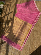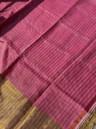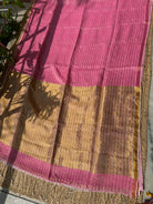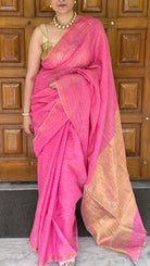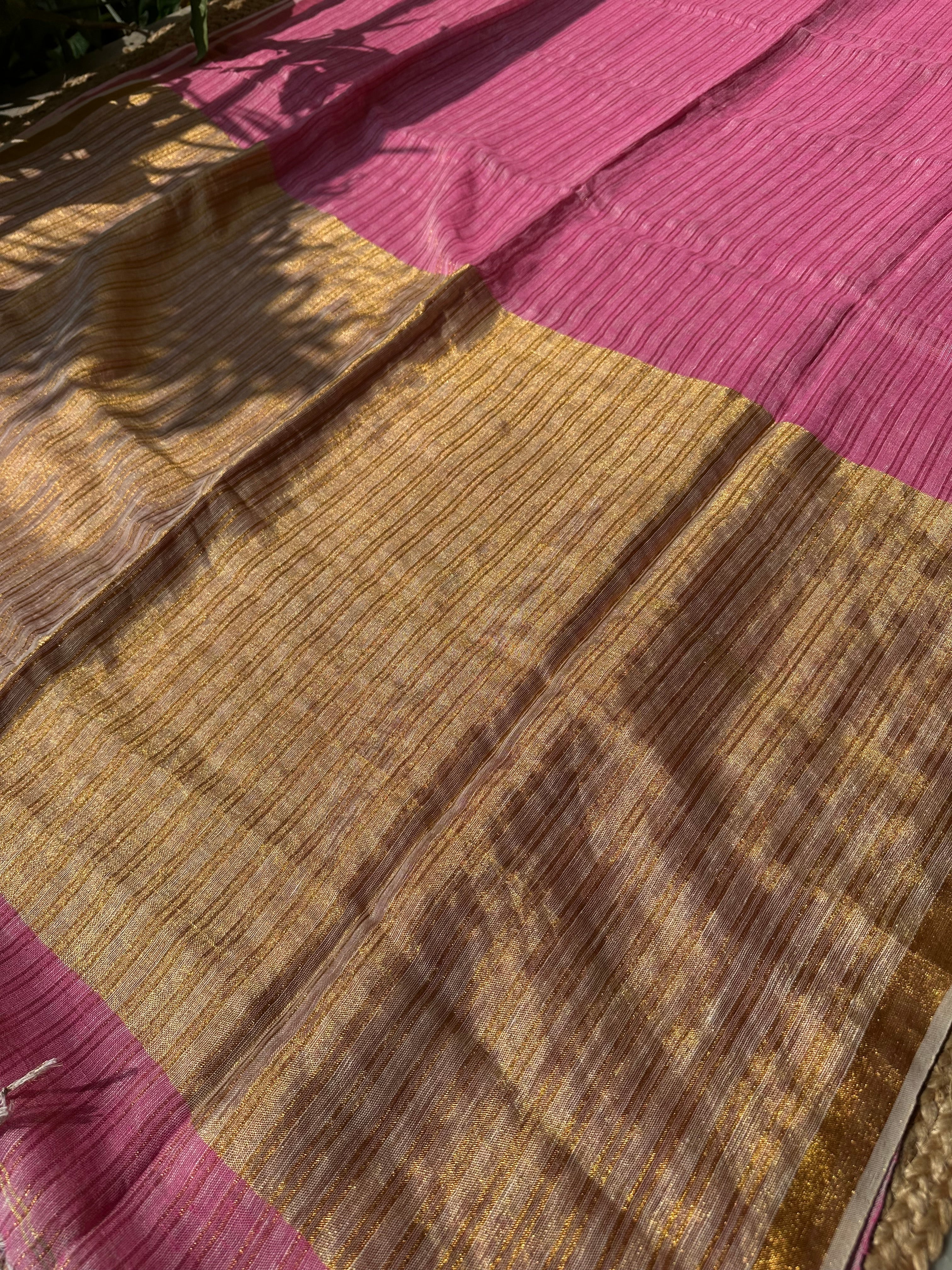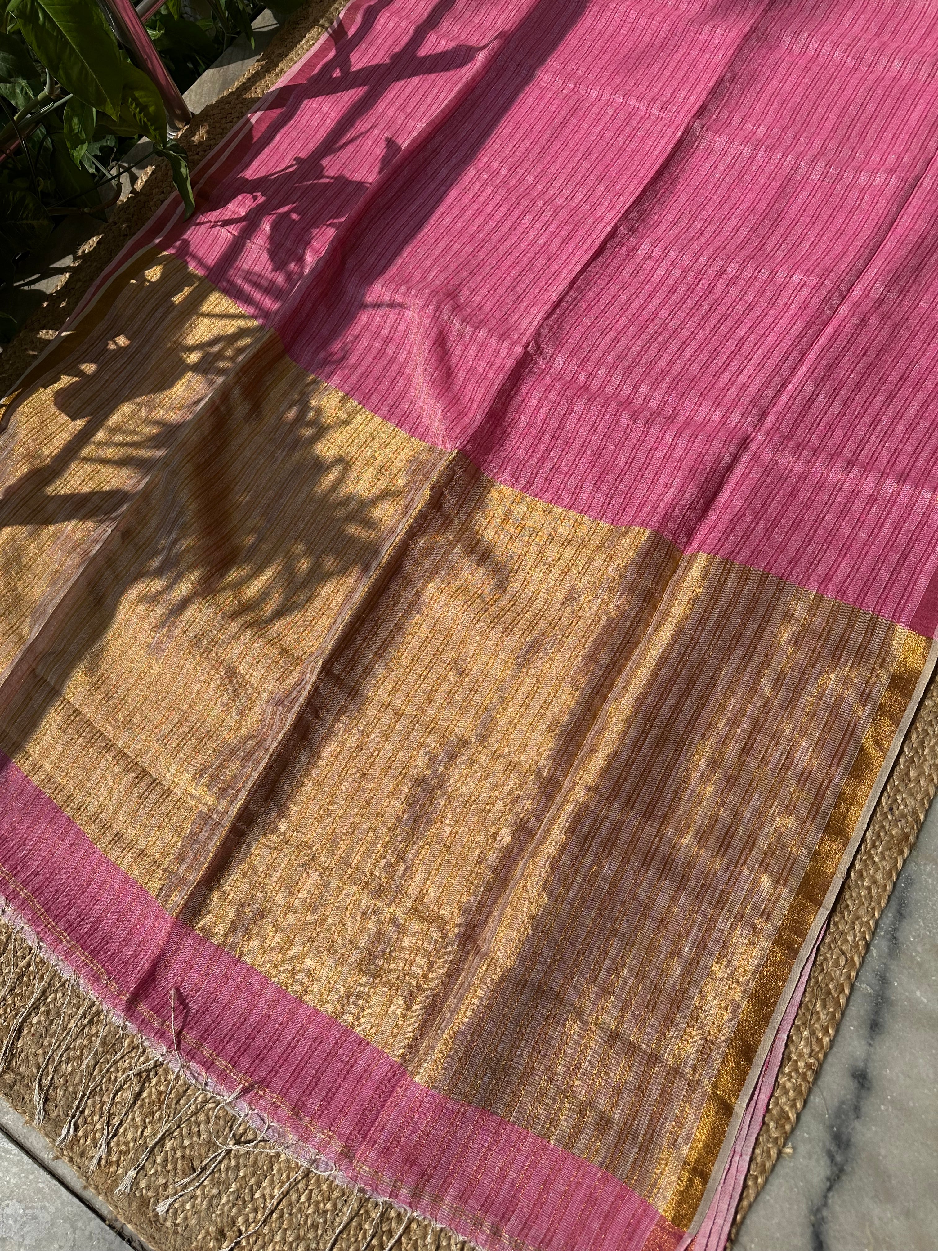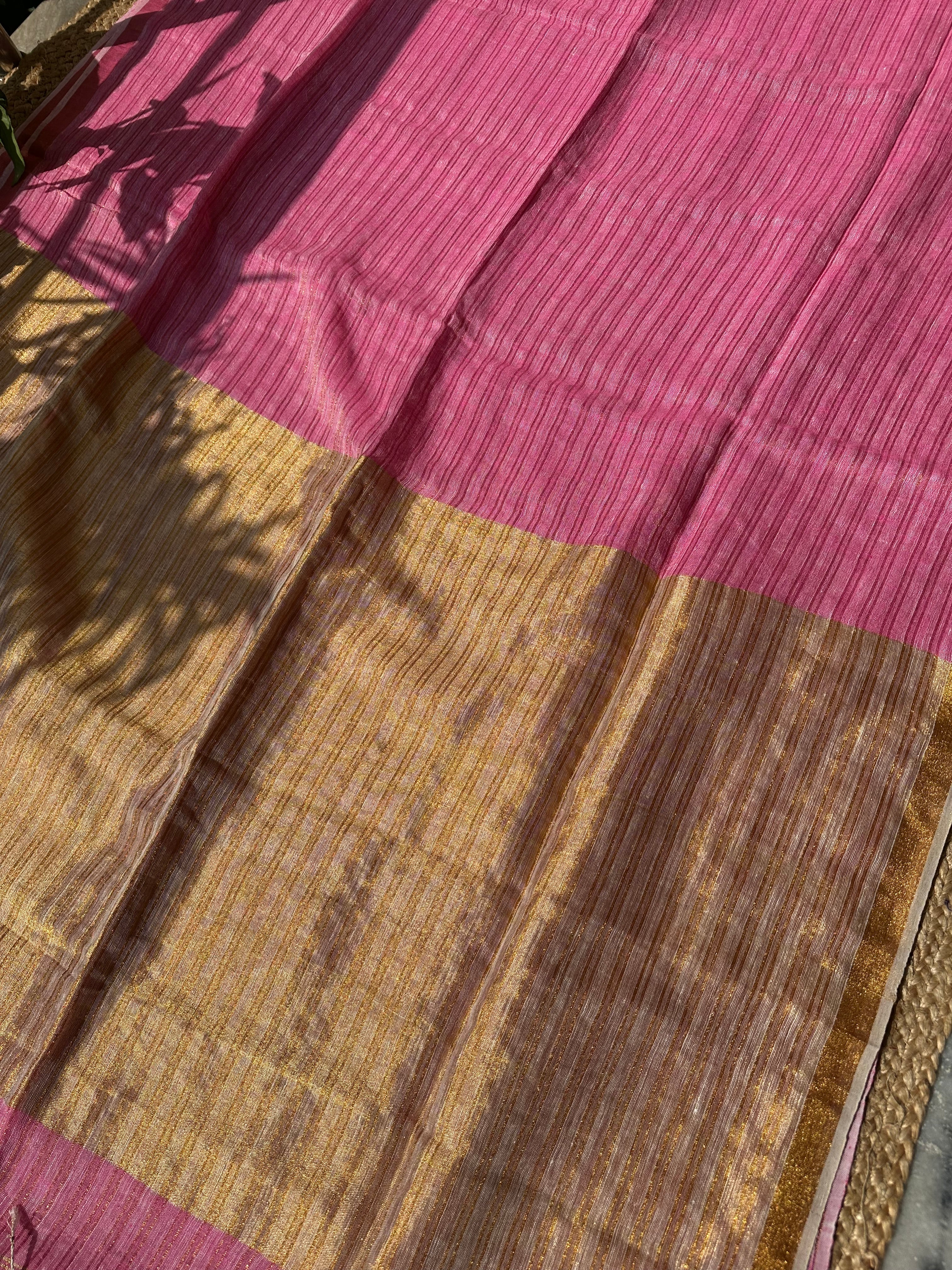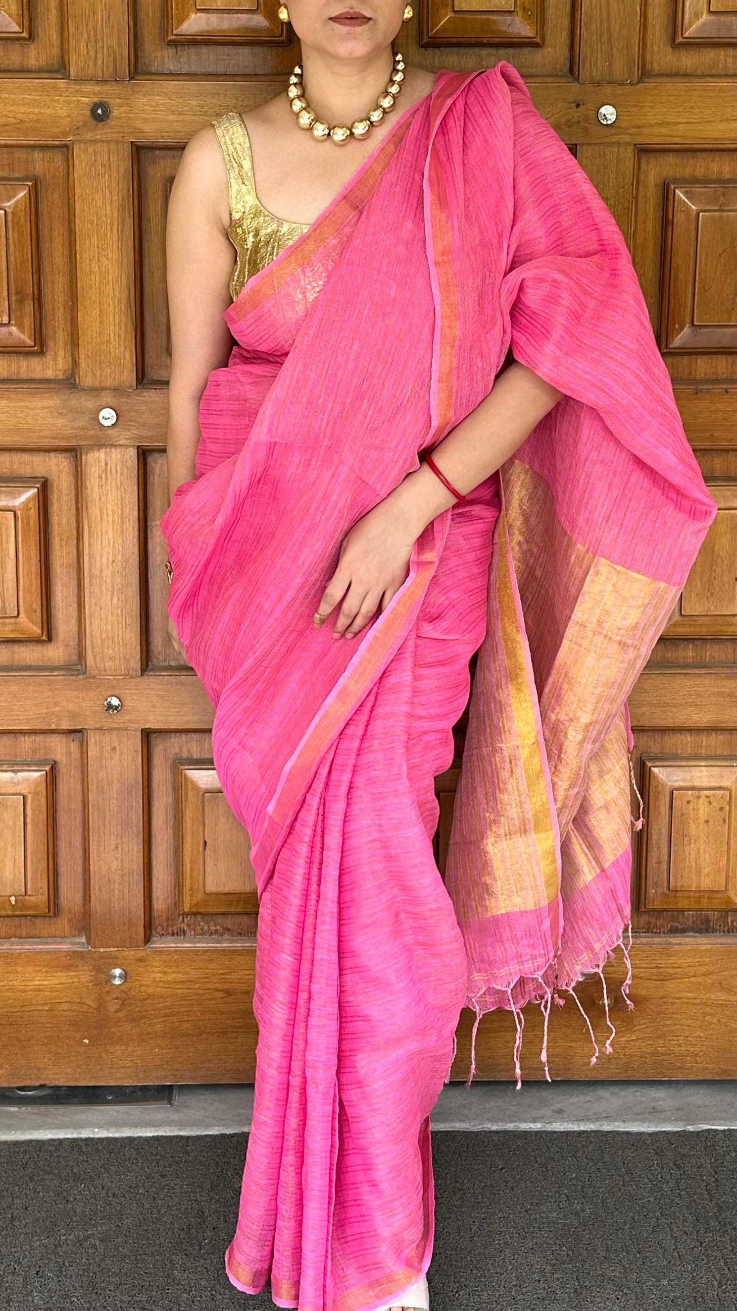 Matetial: Pure linen by linen saree with gold stripes all over and golden zari pallu. The linen used is 100 count jayshree linen. You can style it in office as well as in parties.