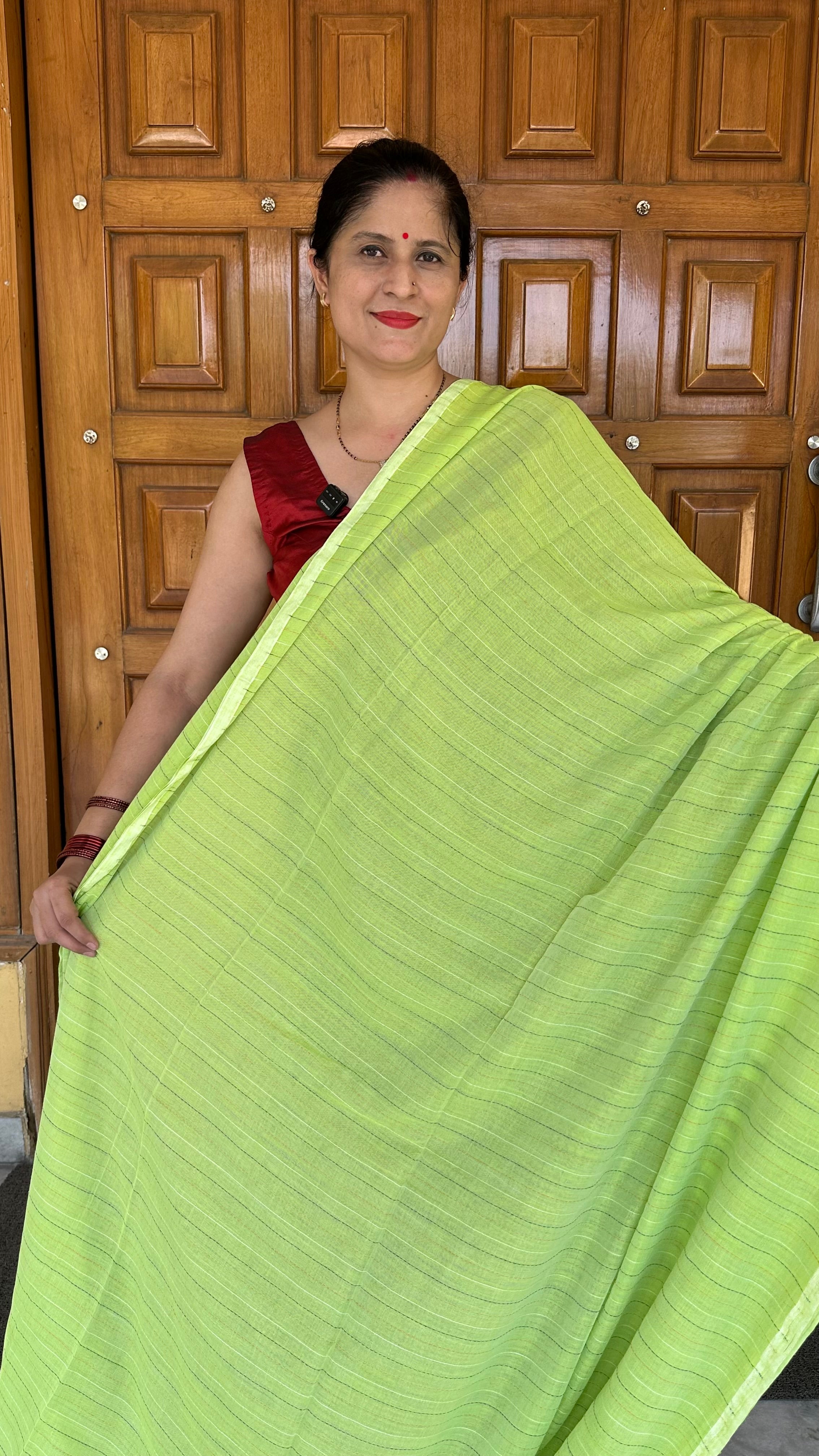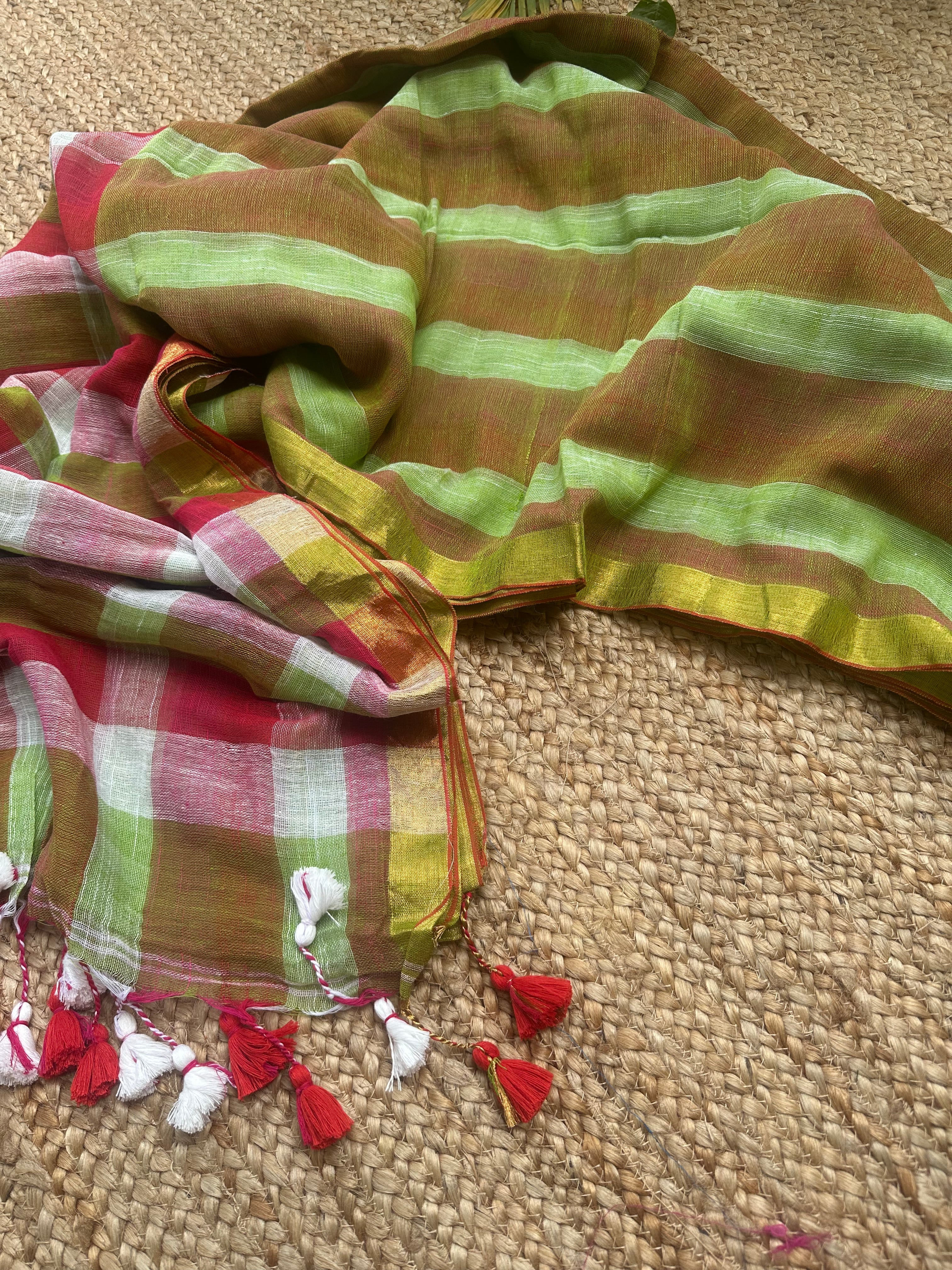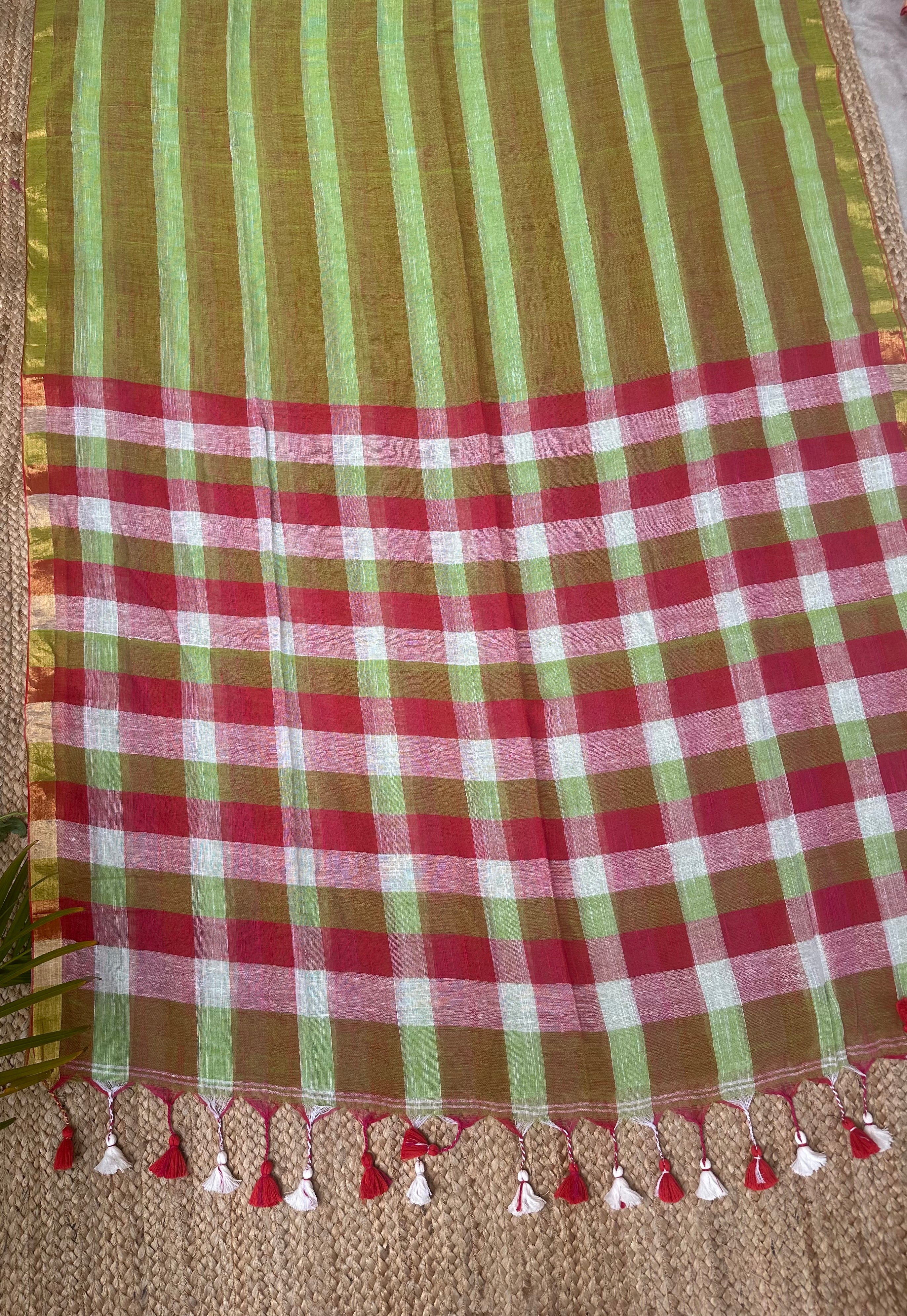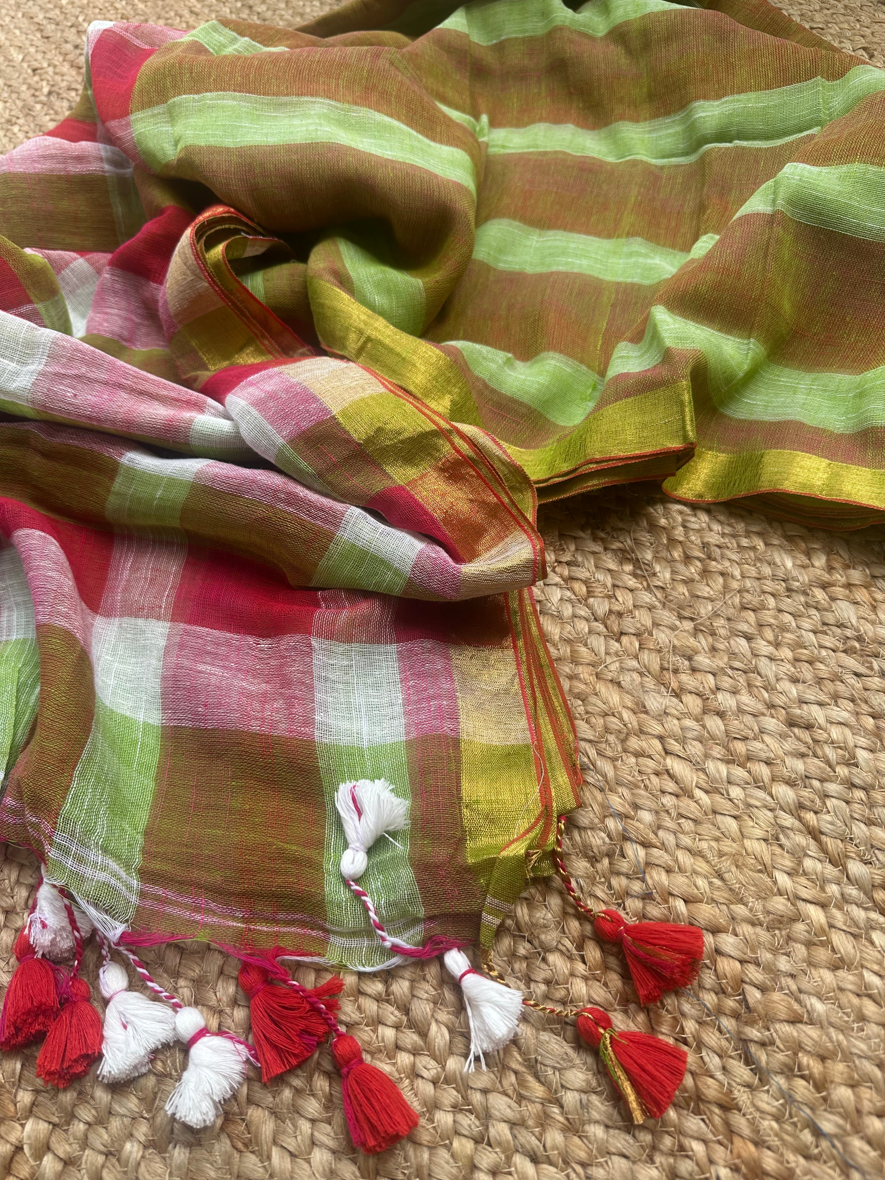 Green Red Striped Checks Linen Cotton Handloom Saree