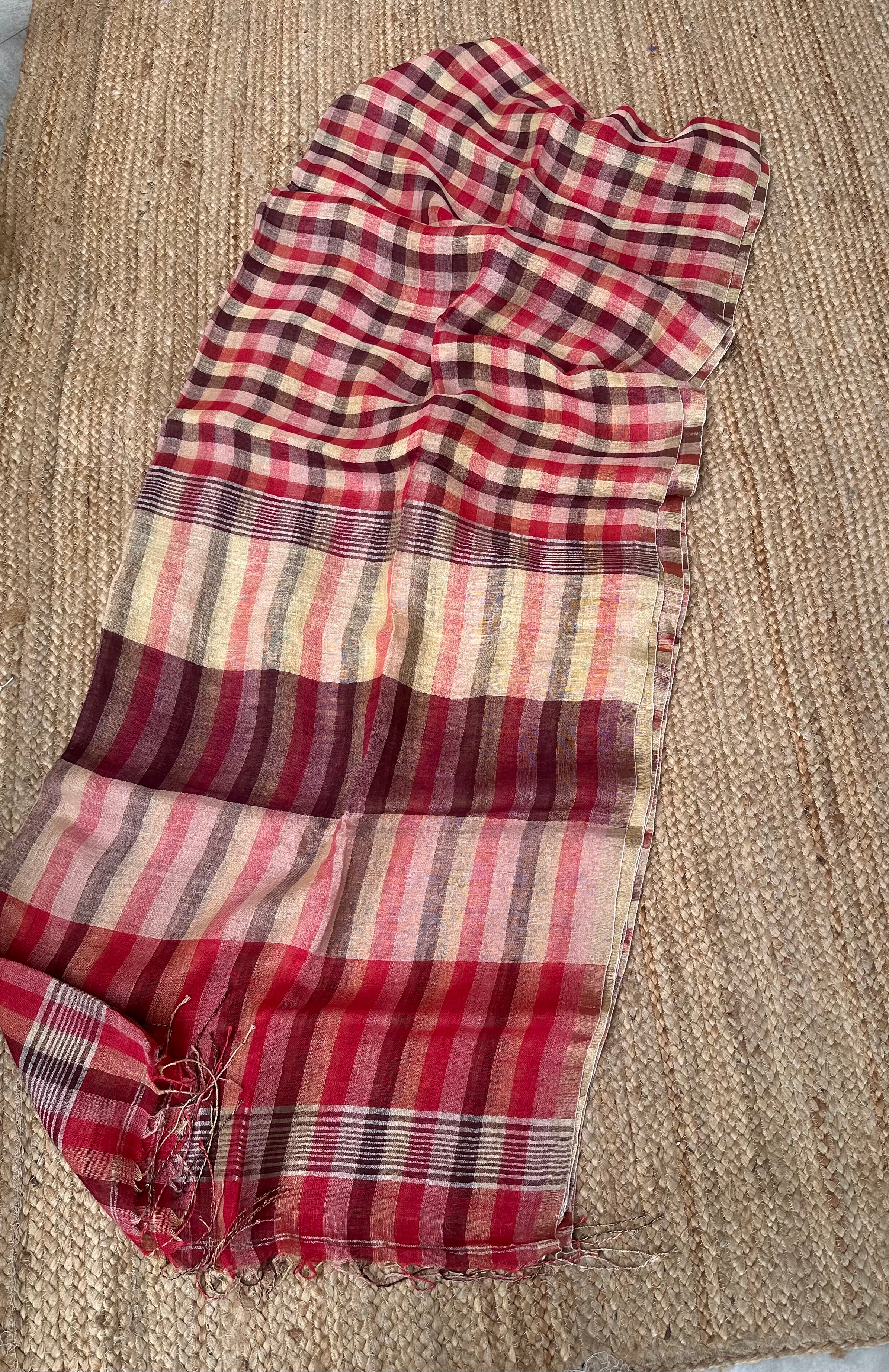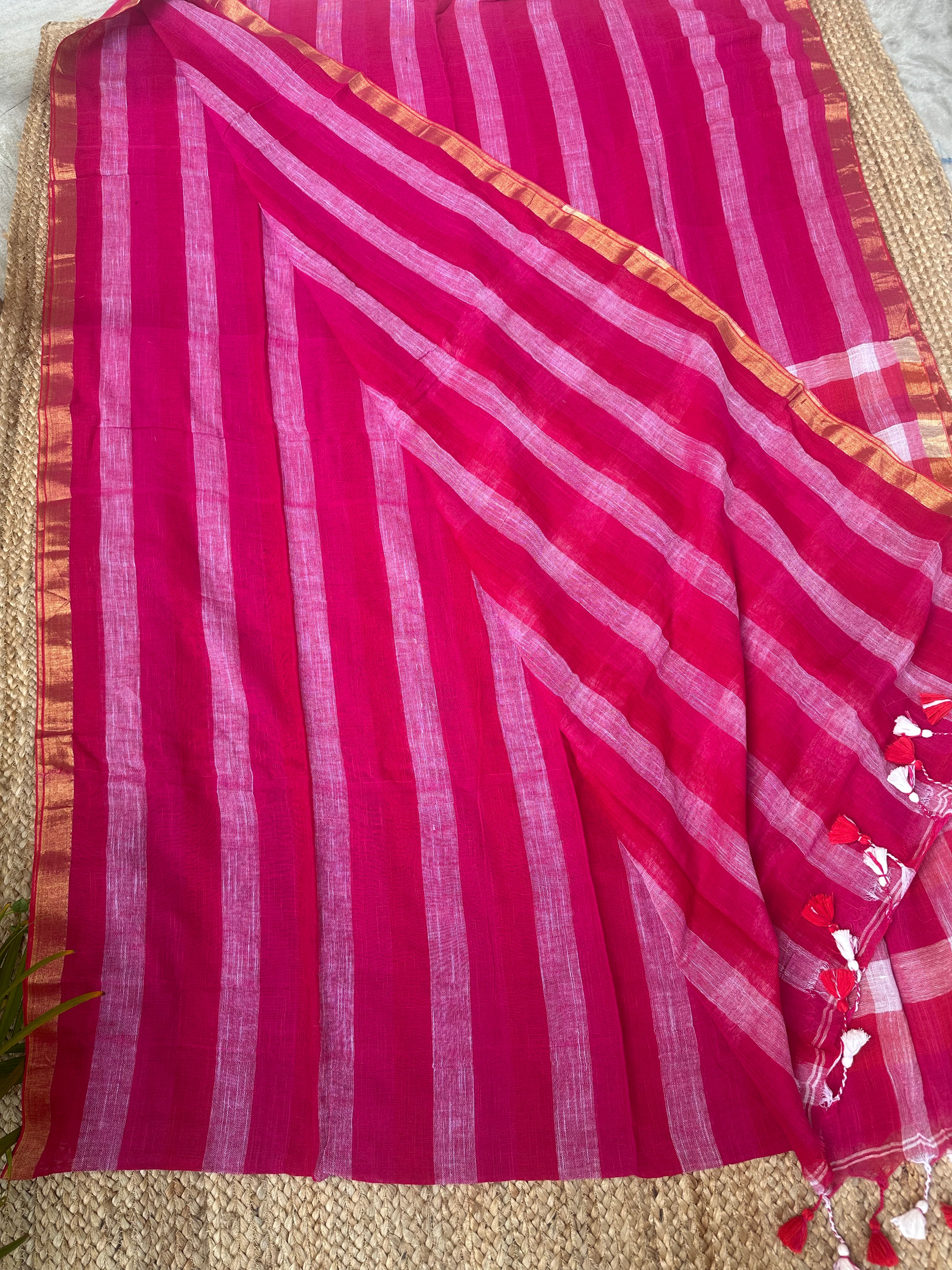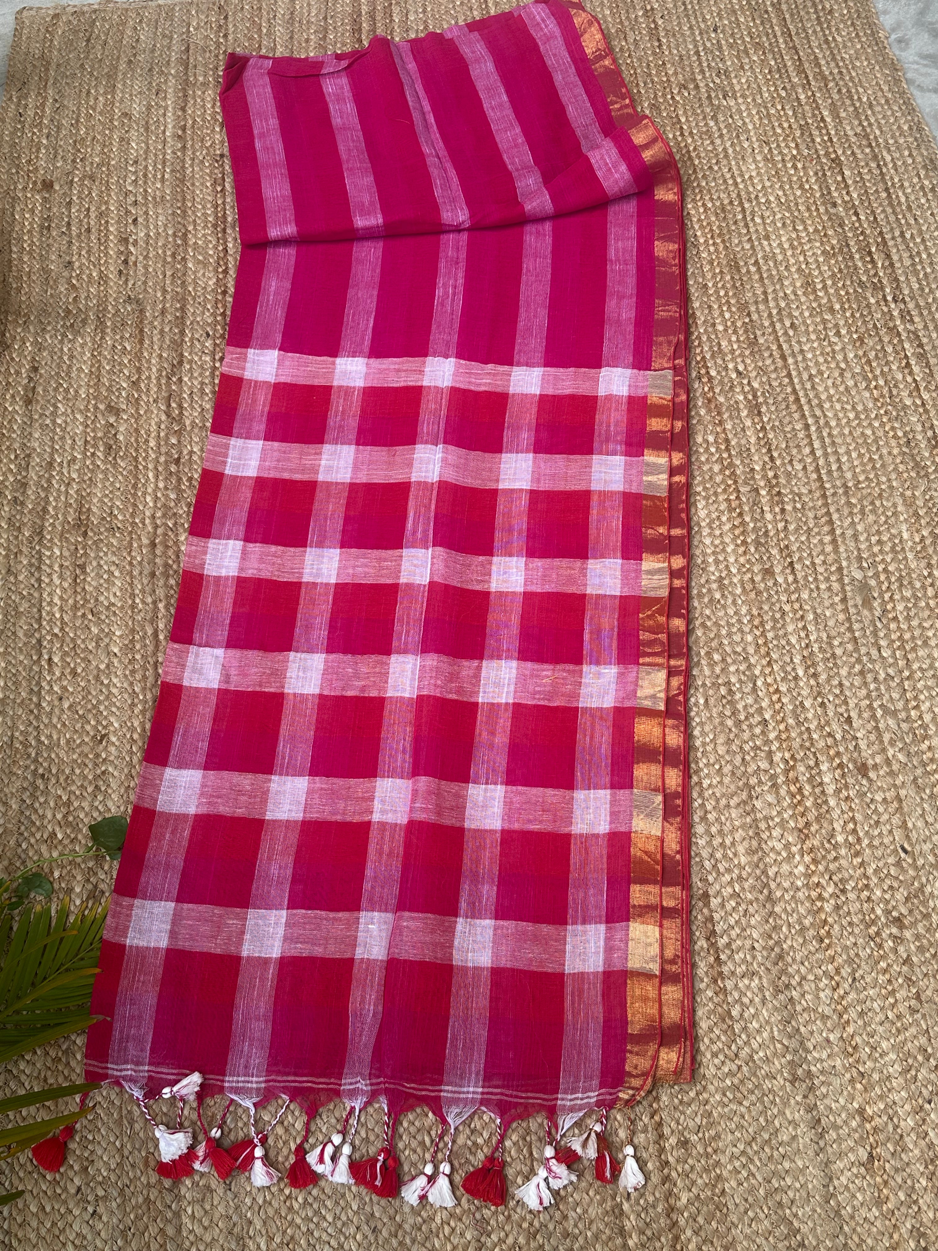 Pink Red Striped Checks Linen Cotton Handloom Saree