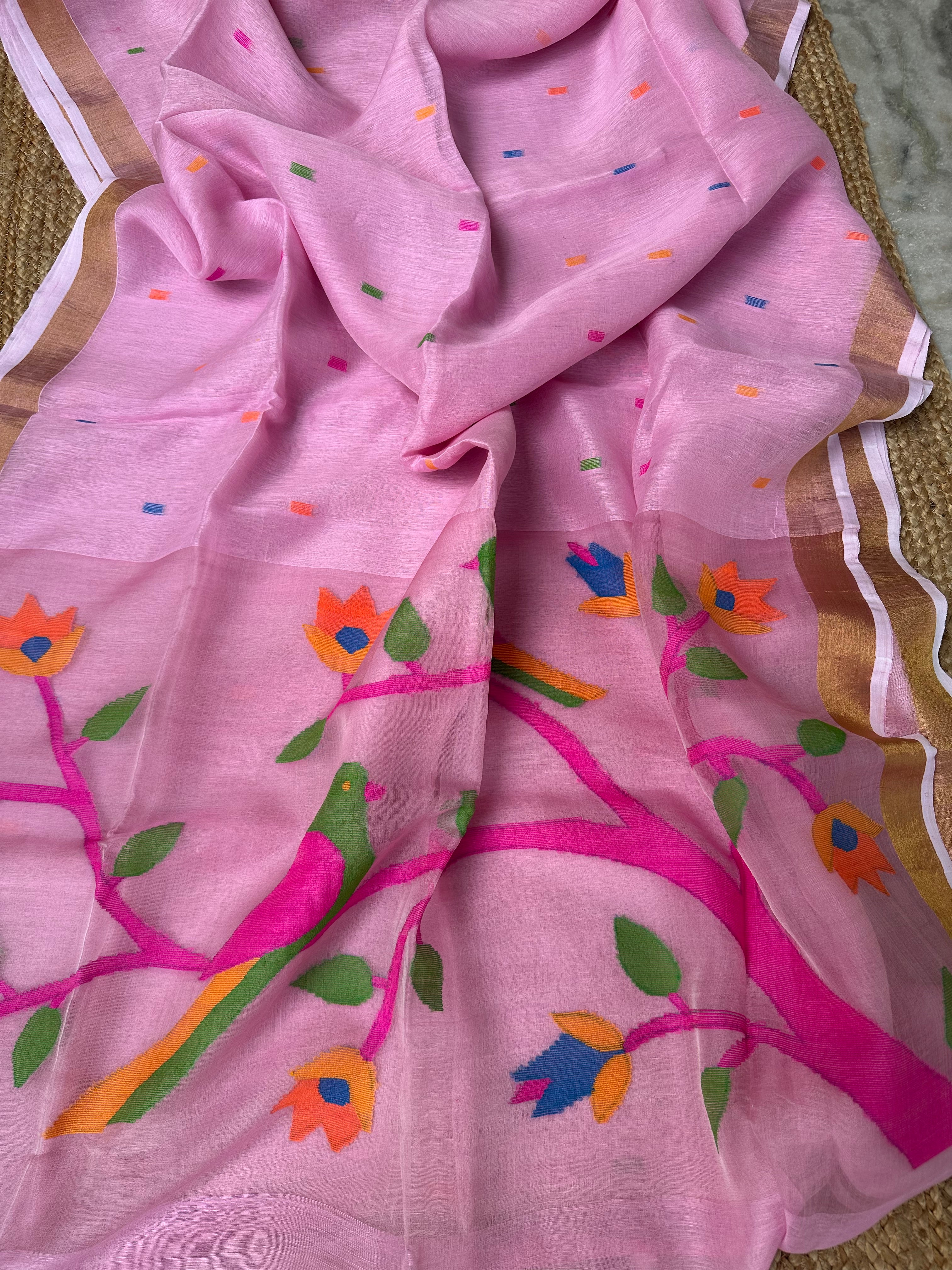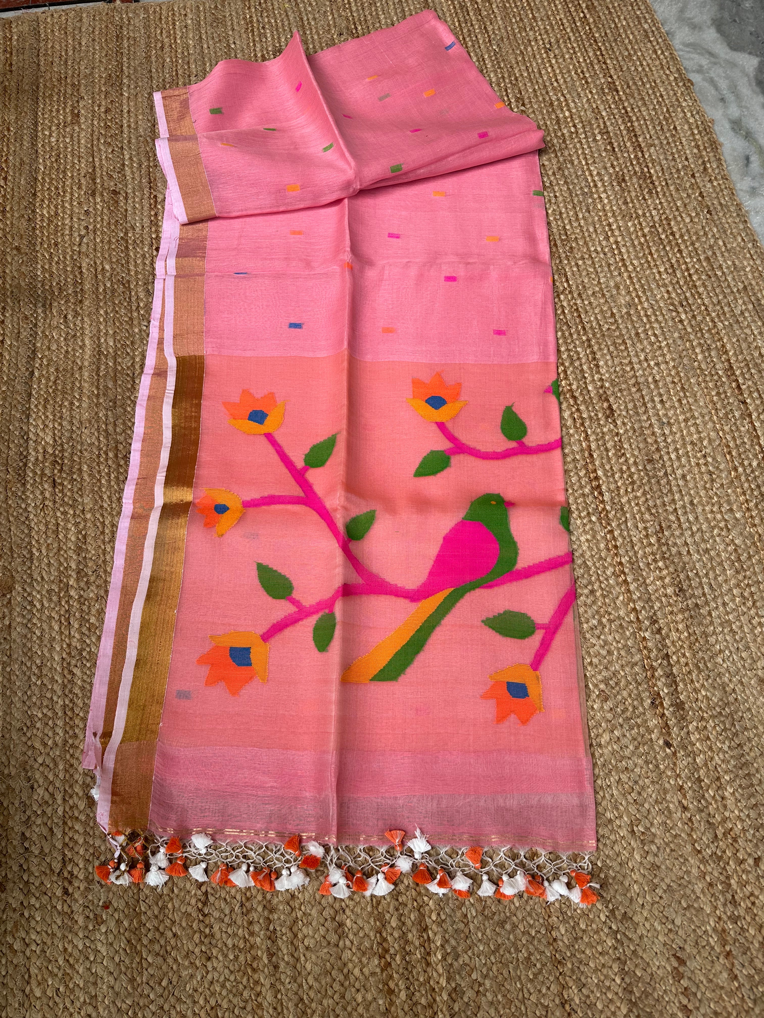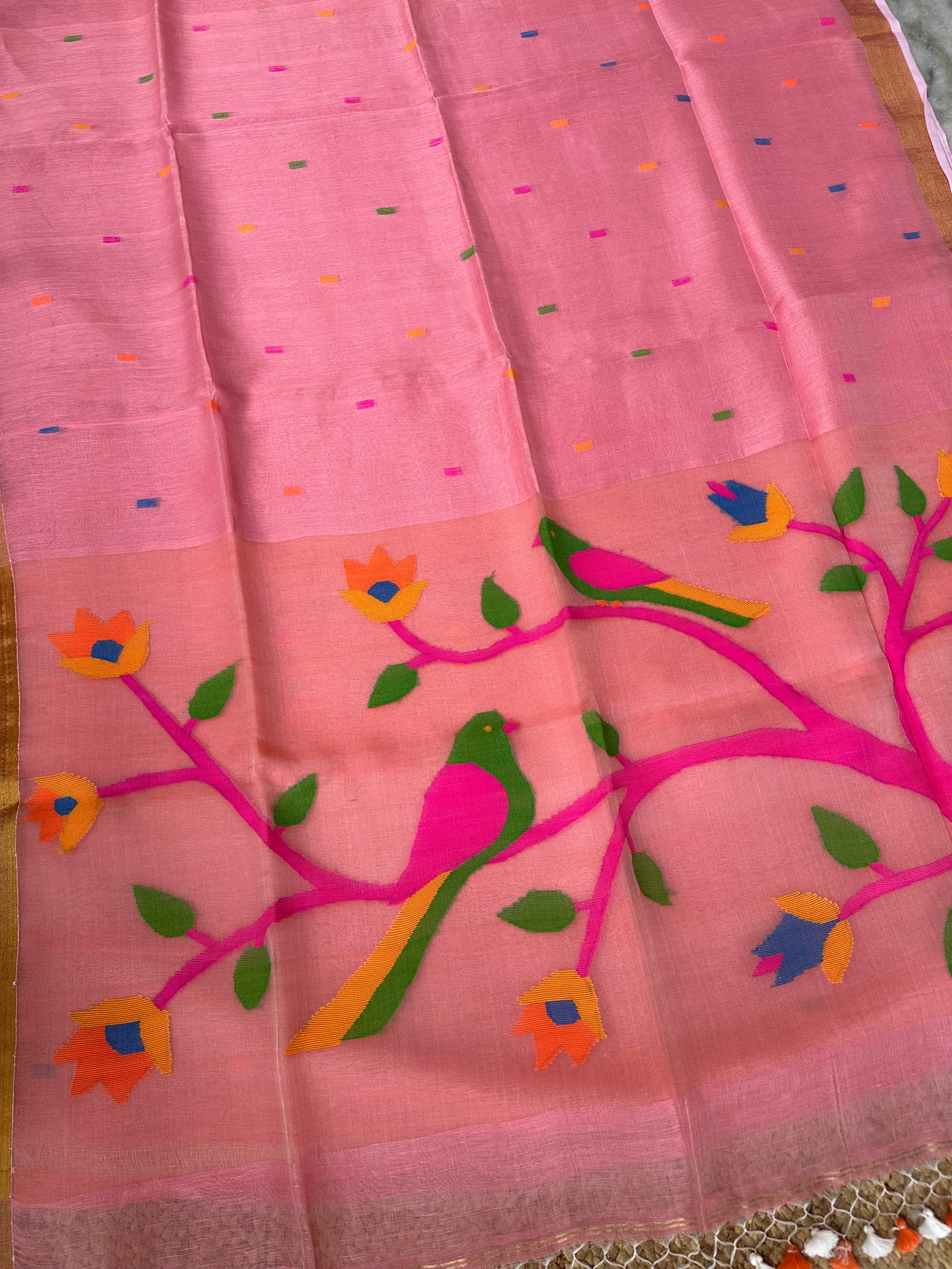 Light Pink Linen Muslin Silk Handloom Paithani Jamdani Saree