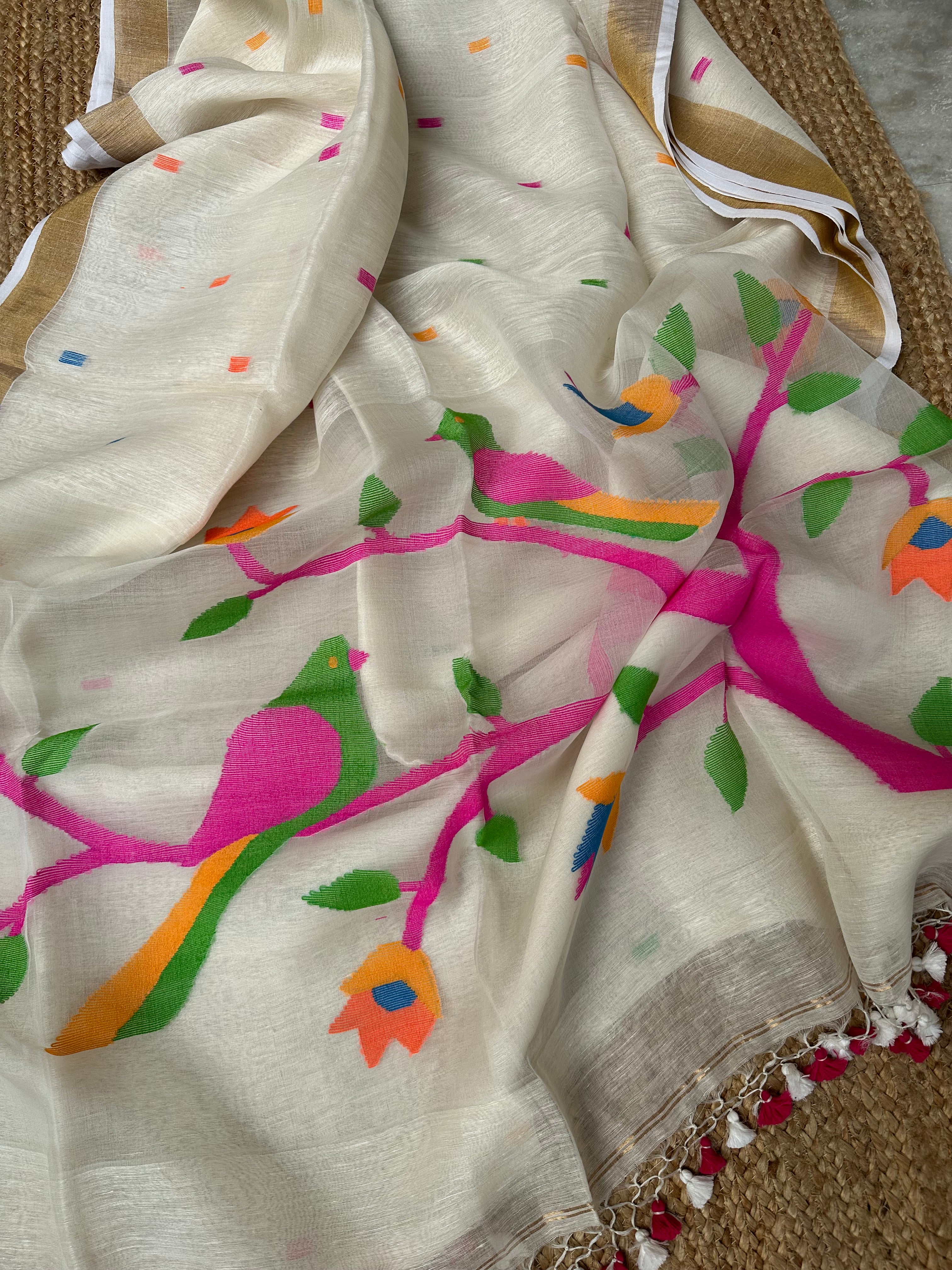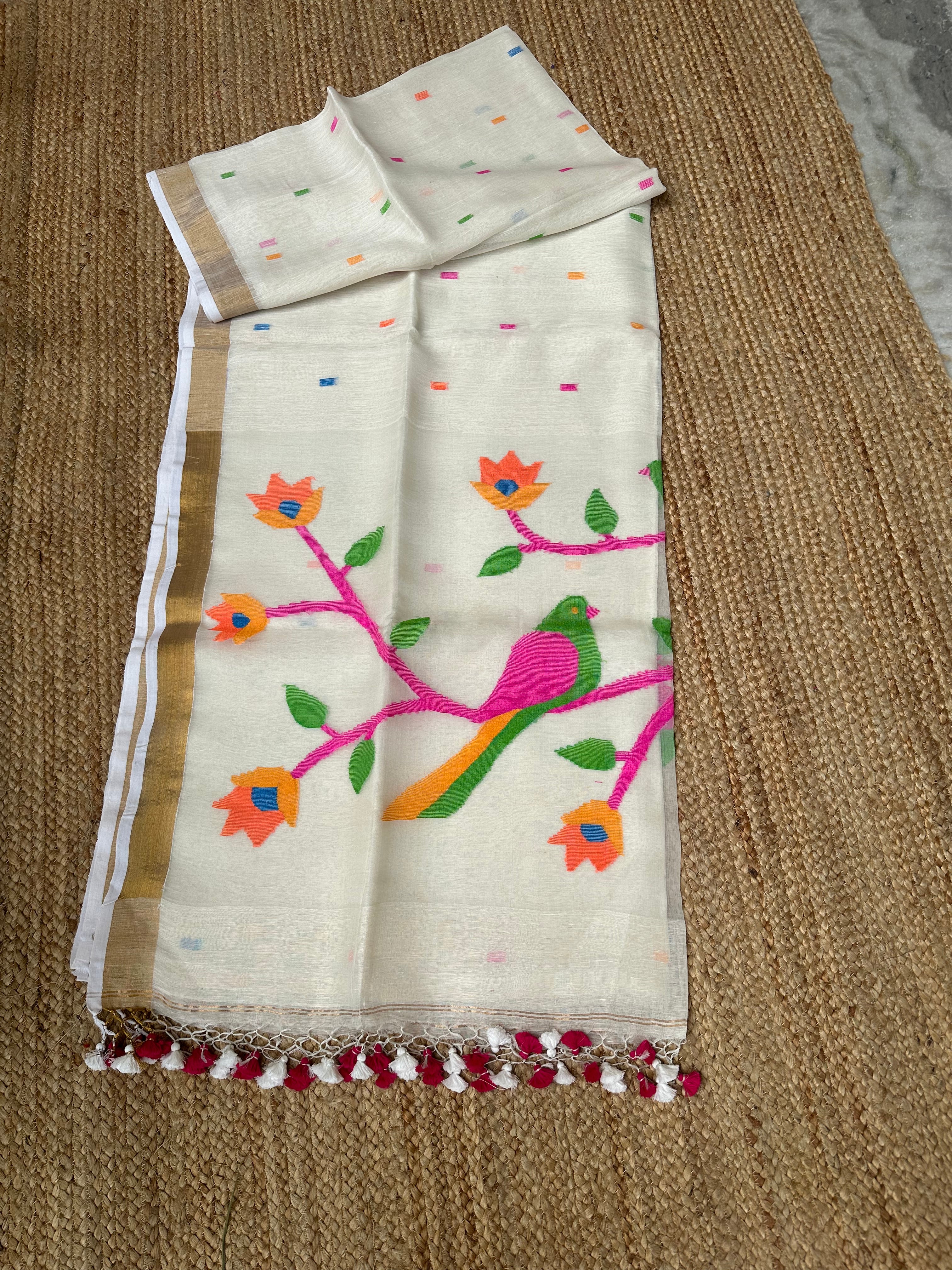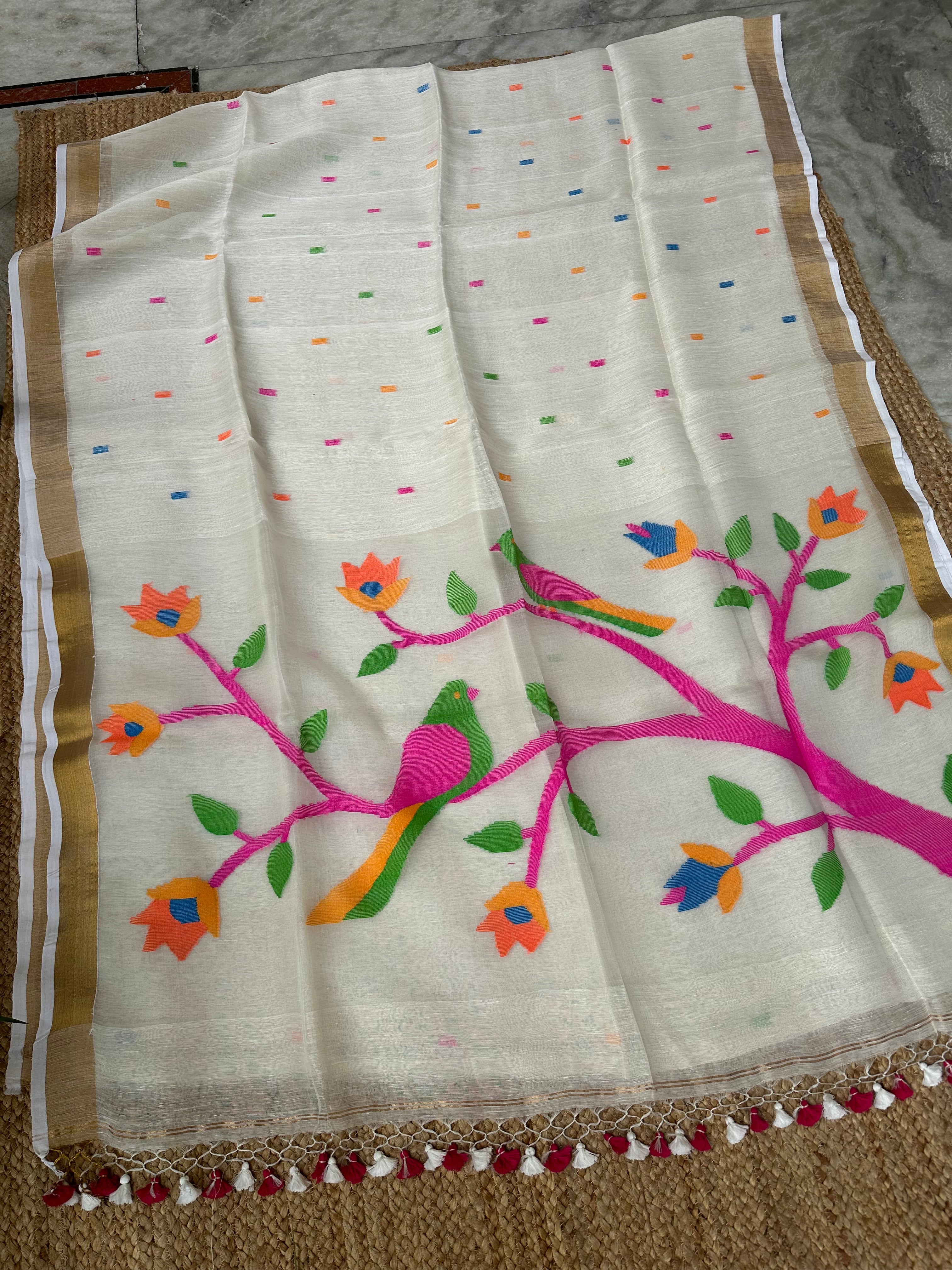 Off White Linen Muslin Silk Handloom Paithani Jamdani Saree