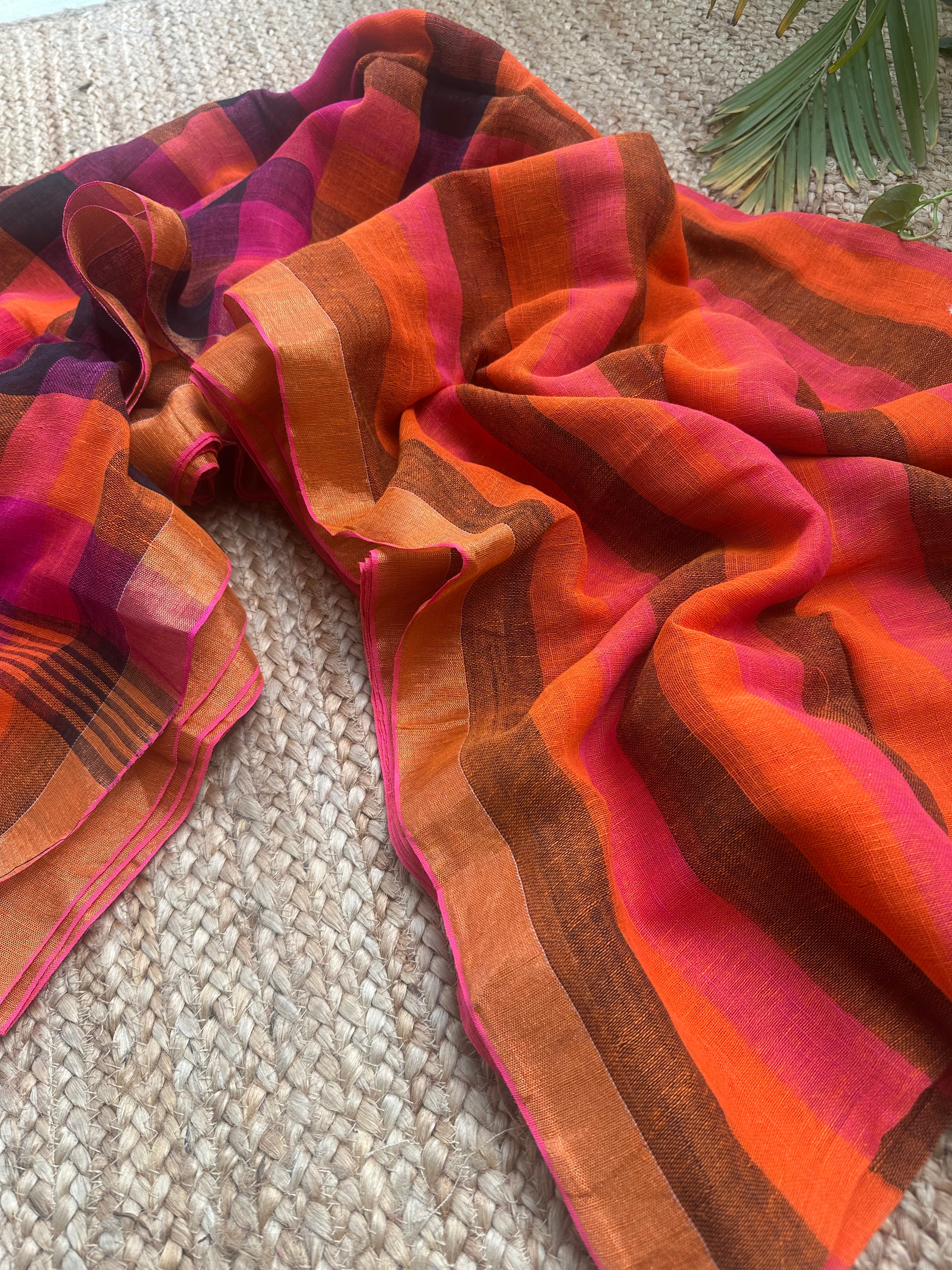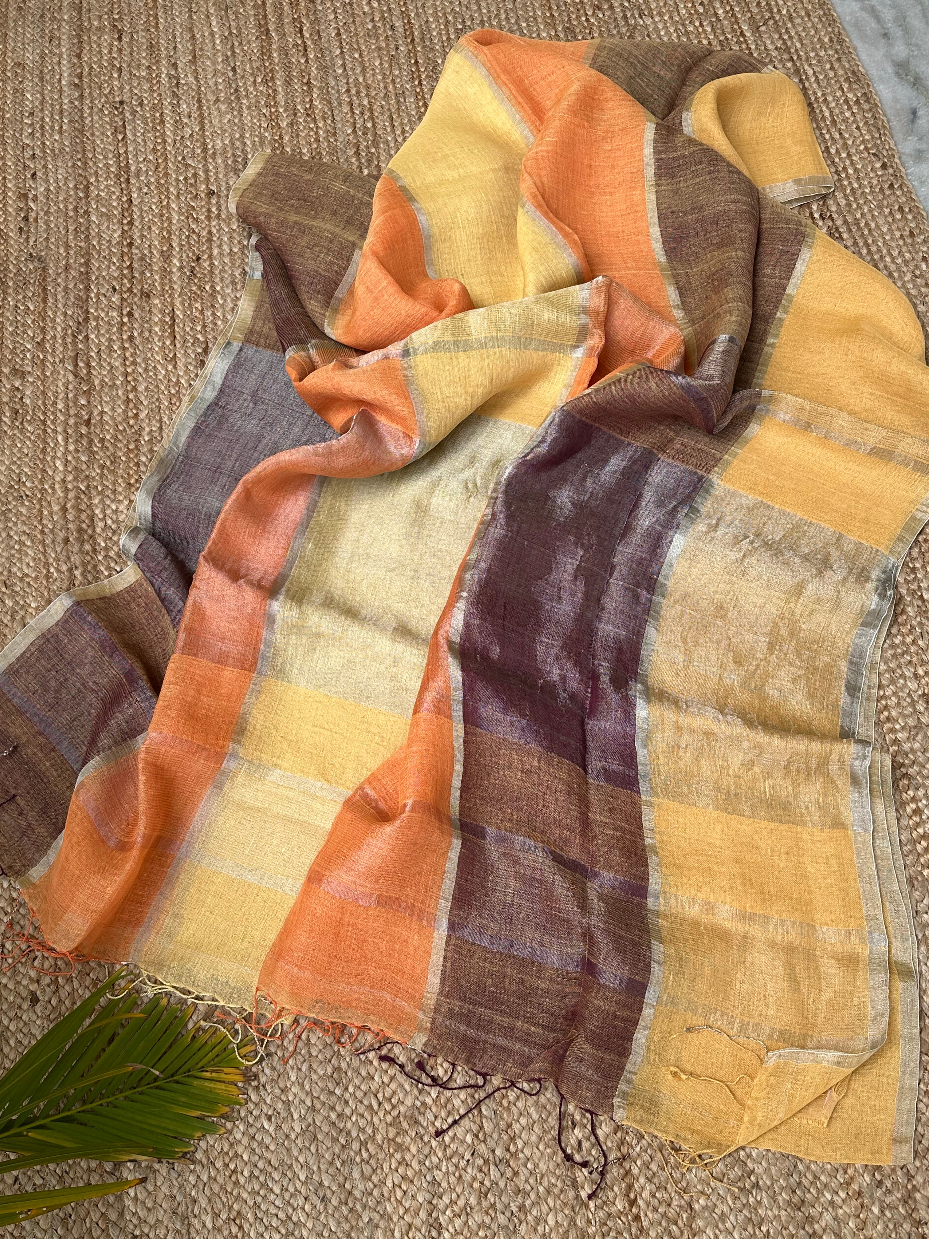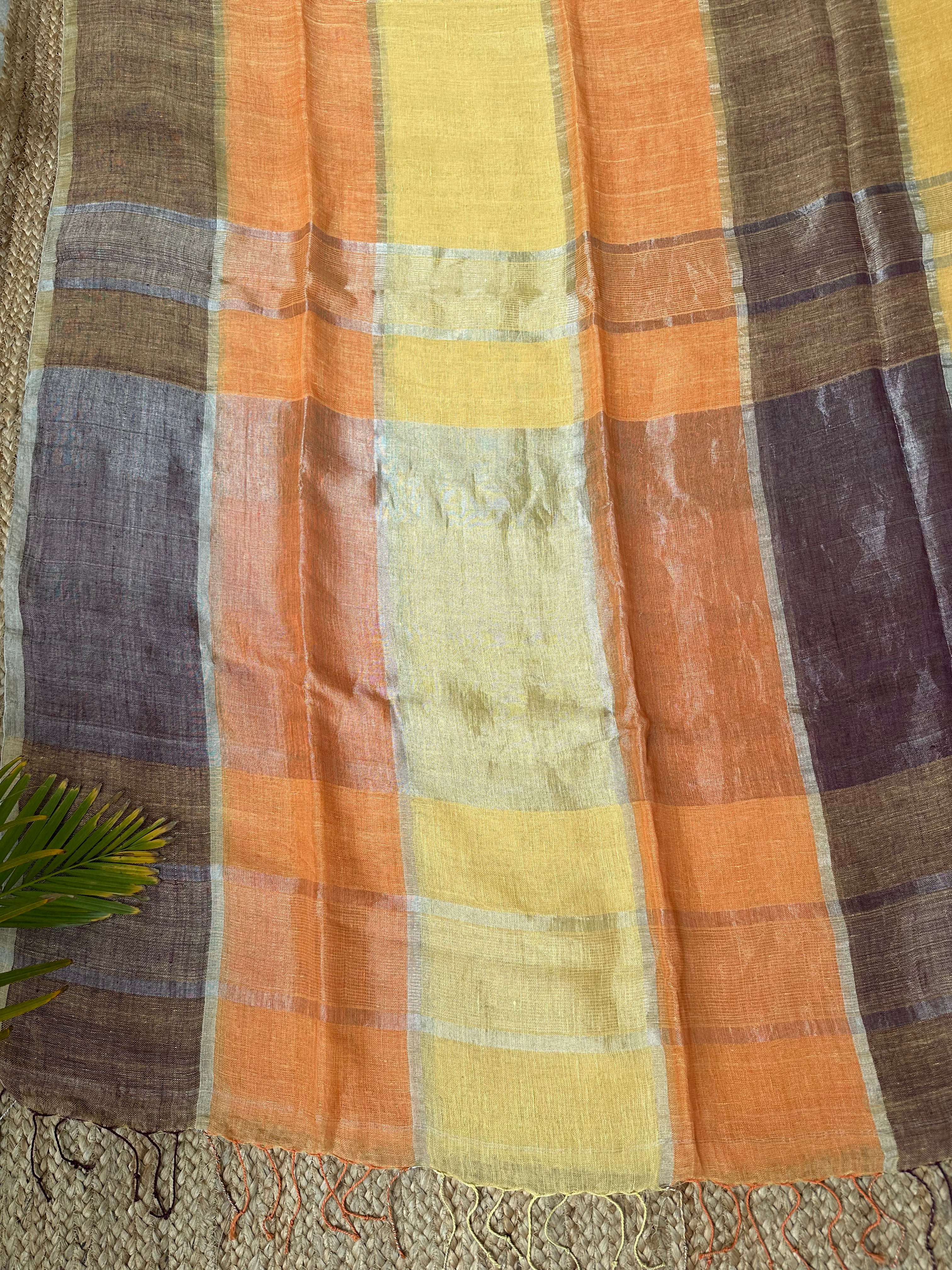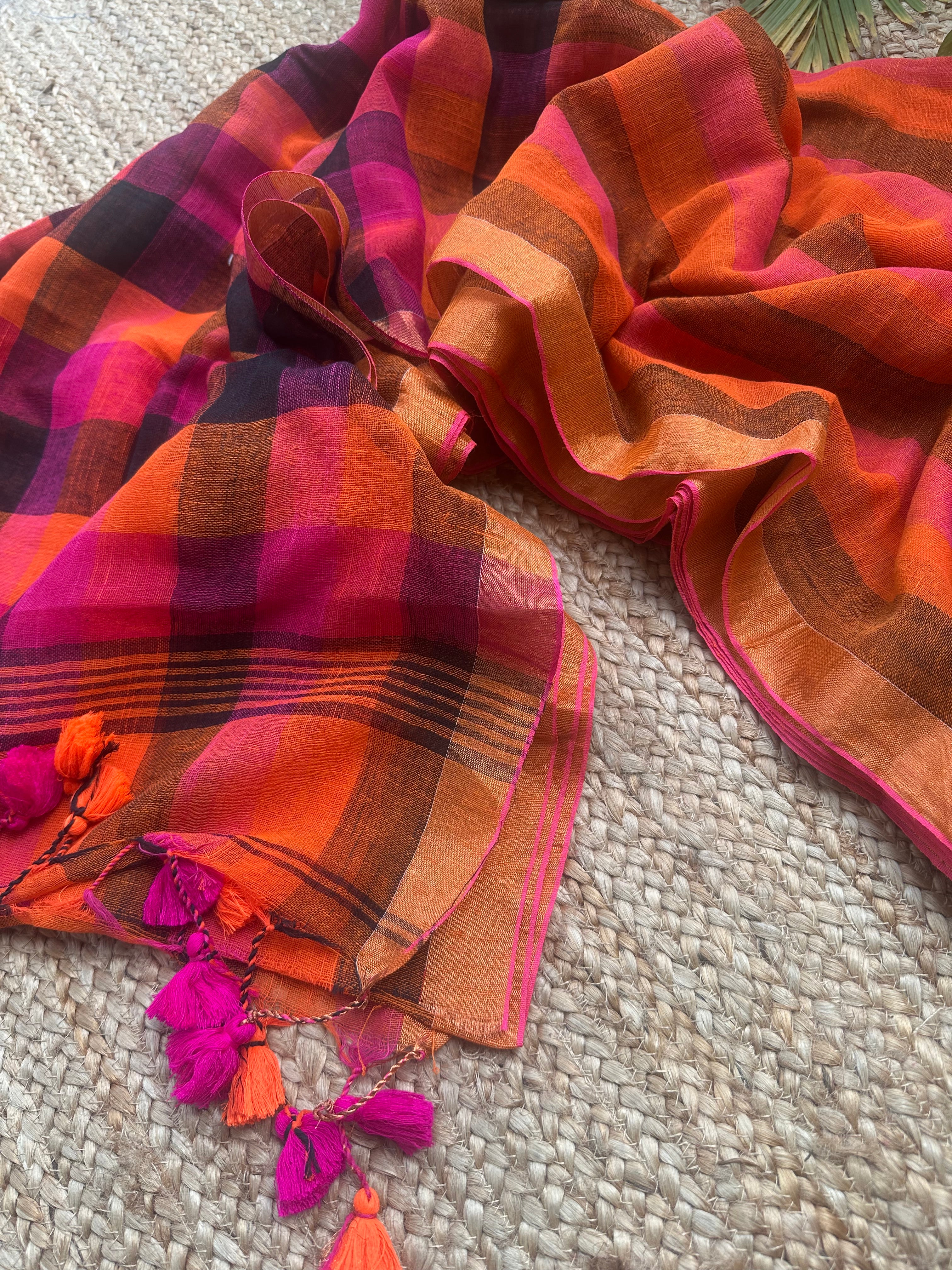 Orange Striped Checks Linen Cotton Handloom Saree
