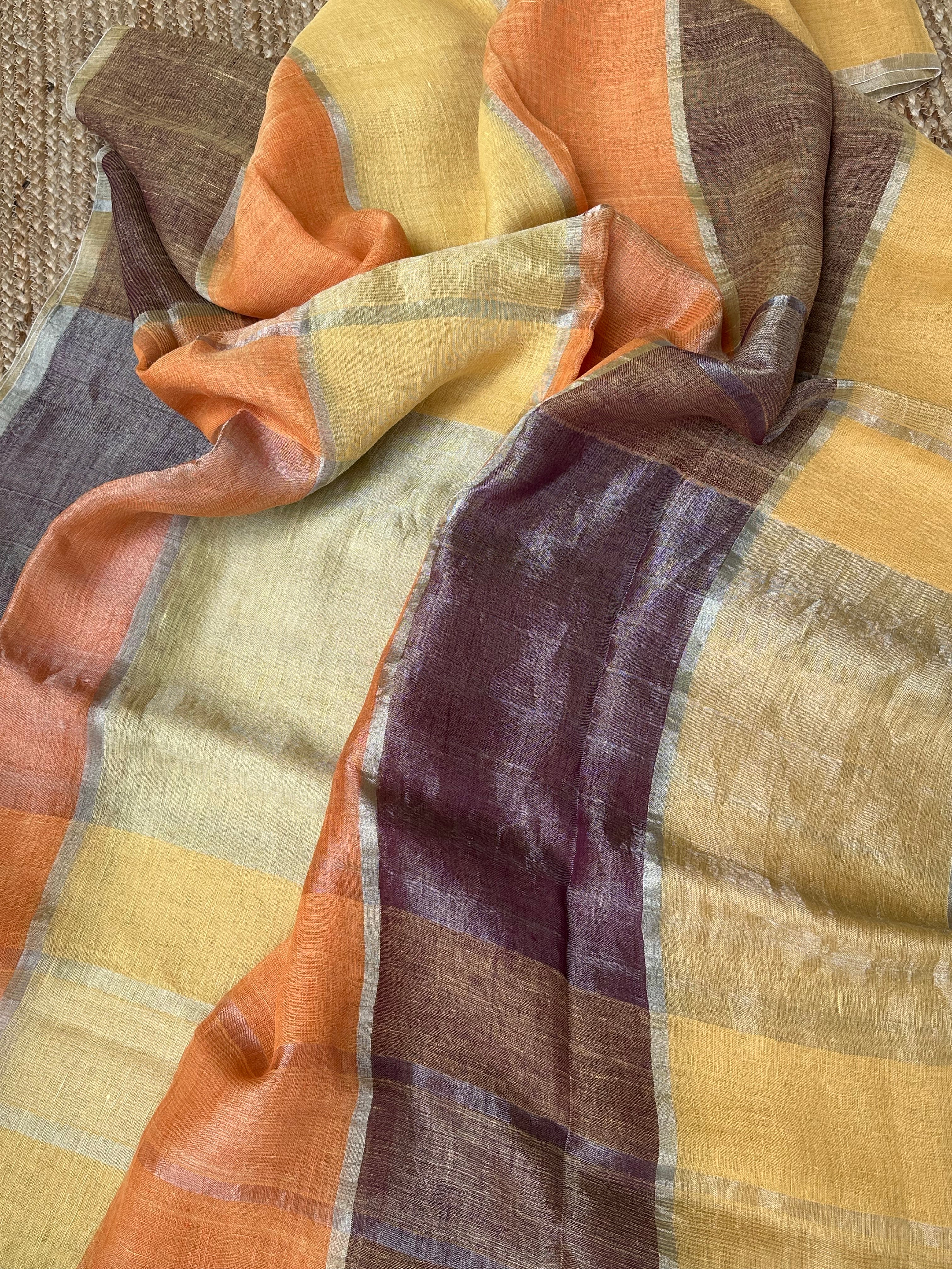 Multicoloured Pure Linen Handloom Silver Checks Saree