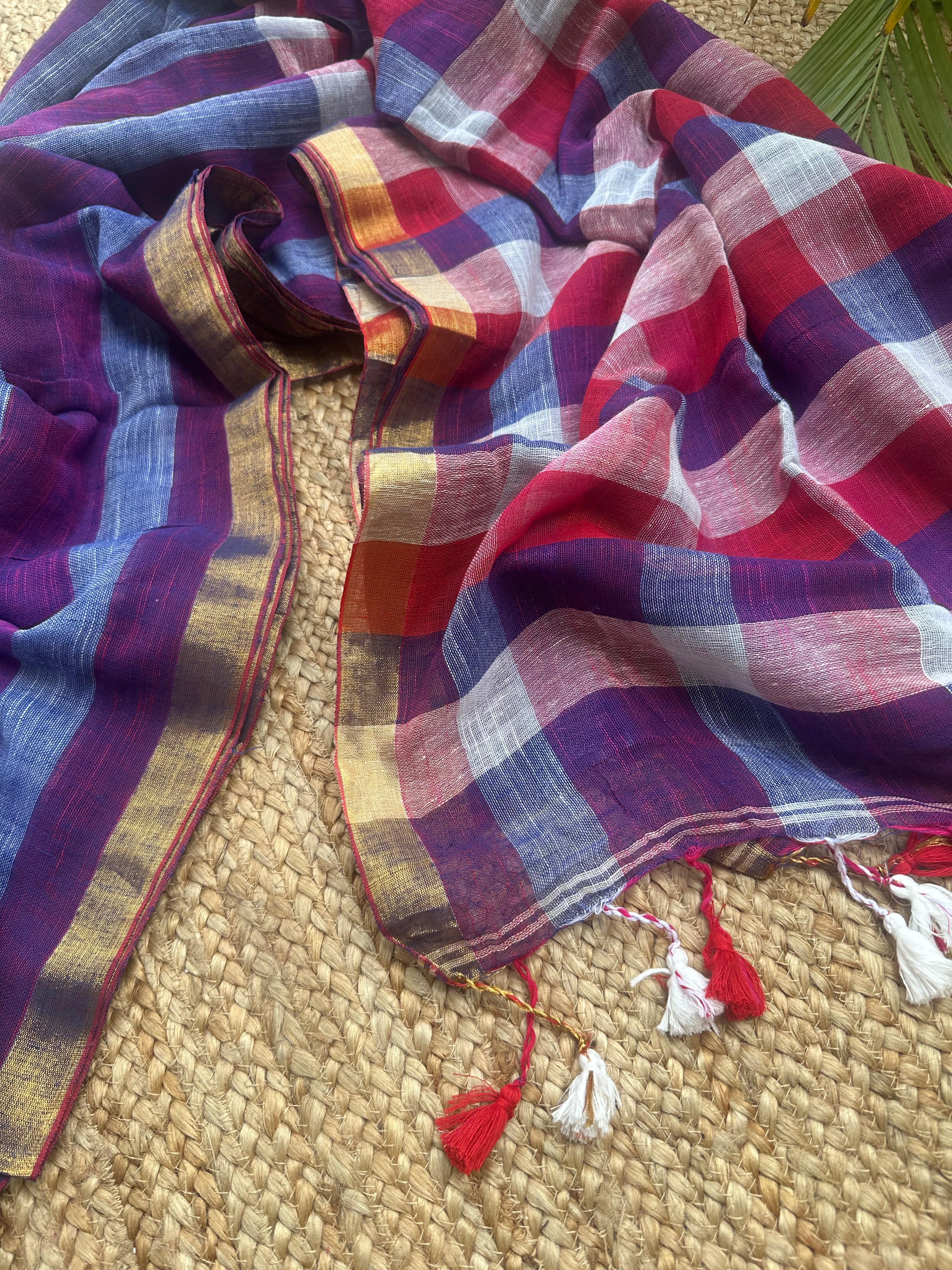 Blue Red Striped Checks Linen Cotton Handloom Saree