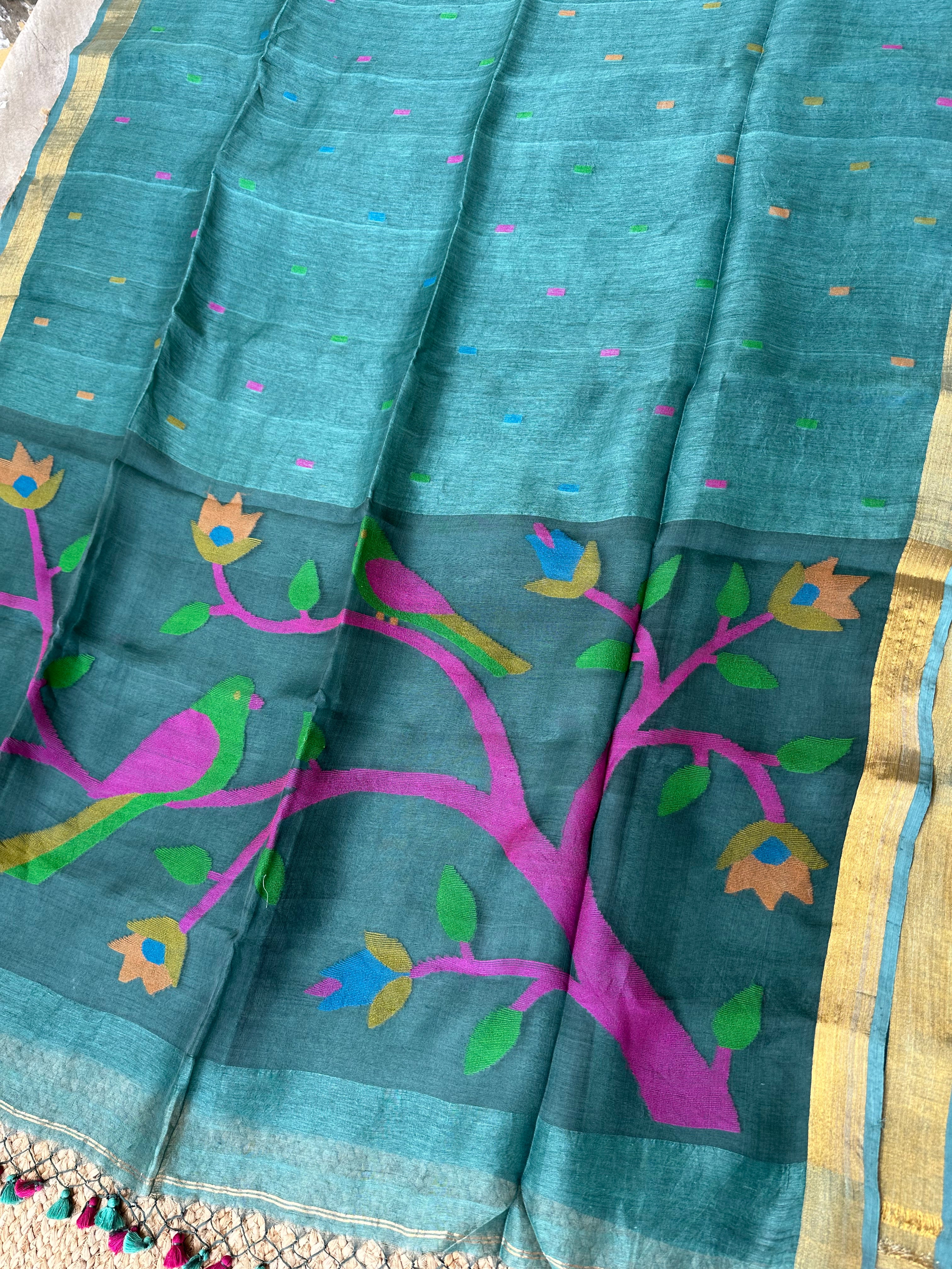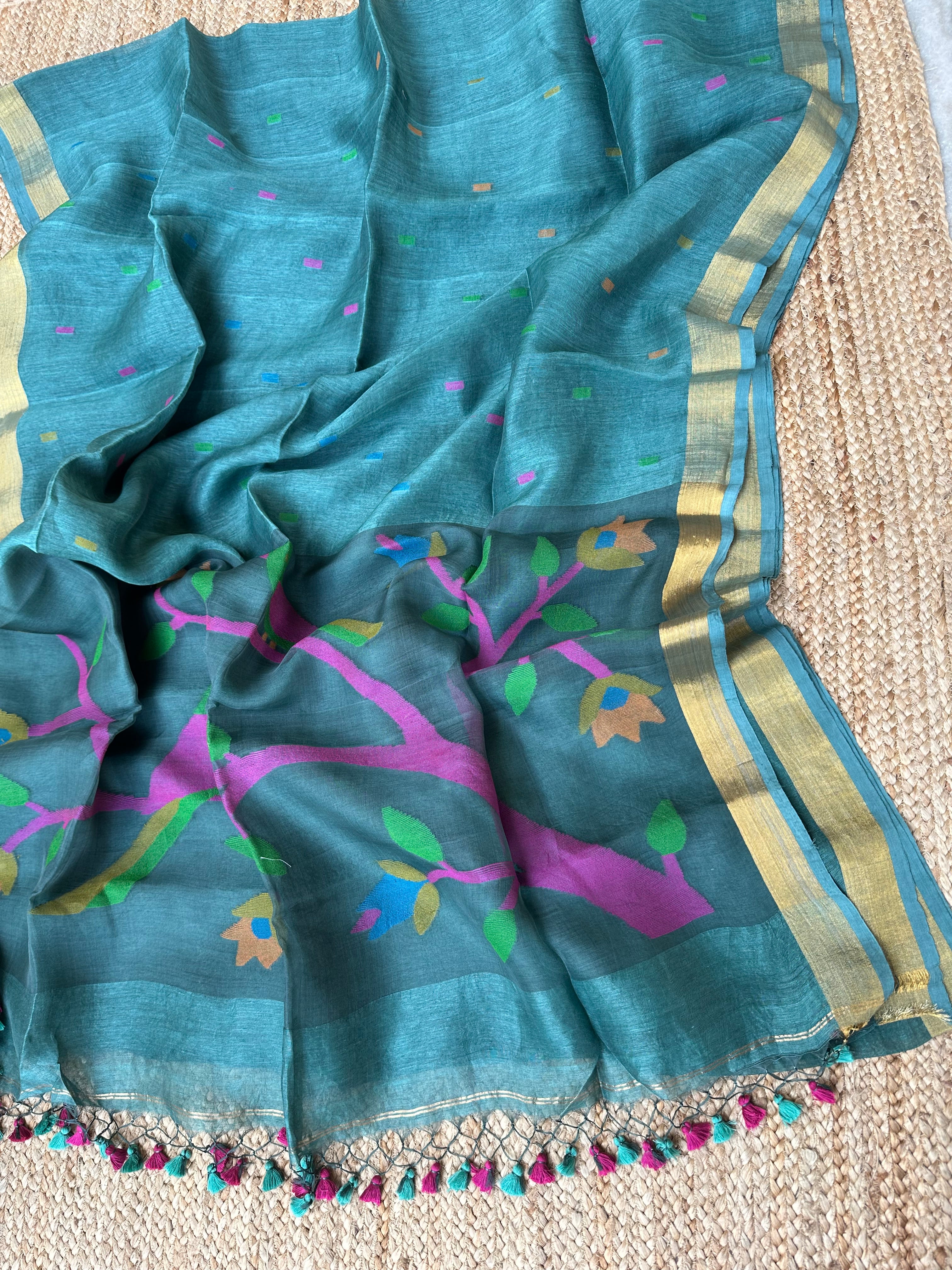 Bluish Green Linen Muslin Silk Handloom Paithani Jamdani Saree