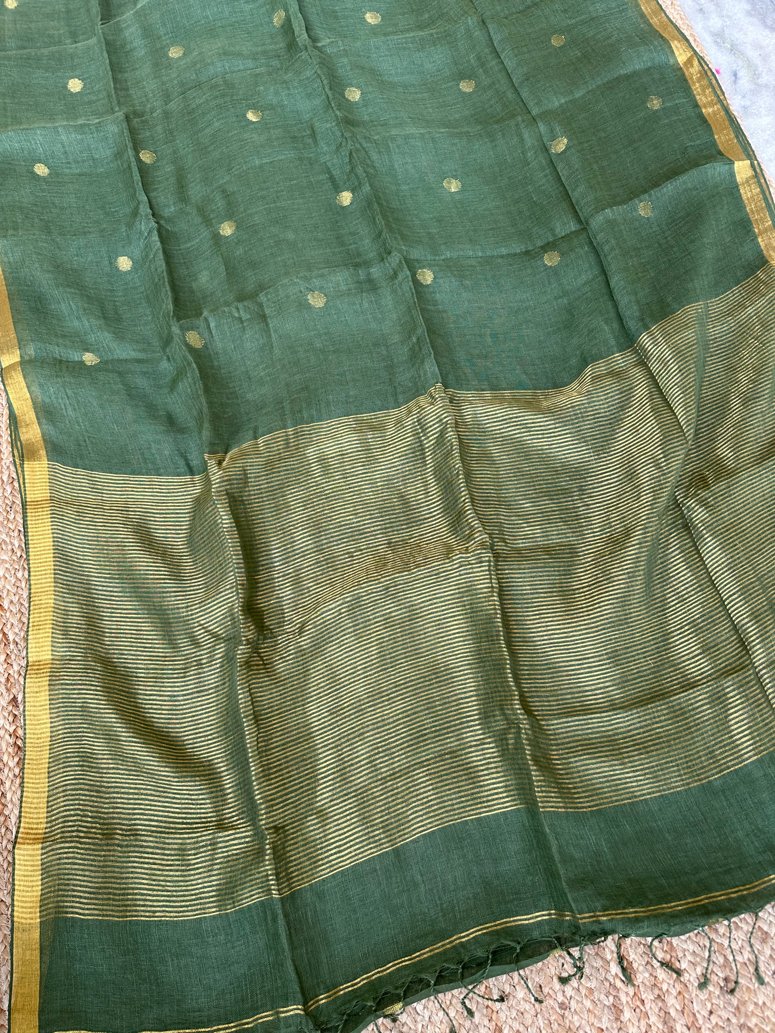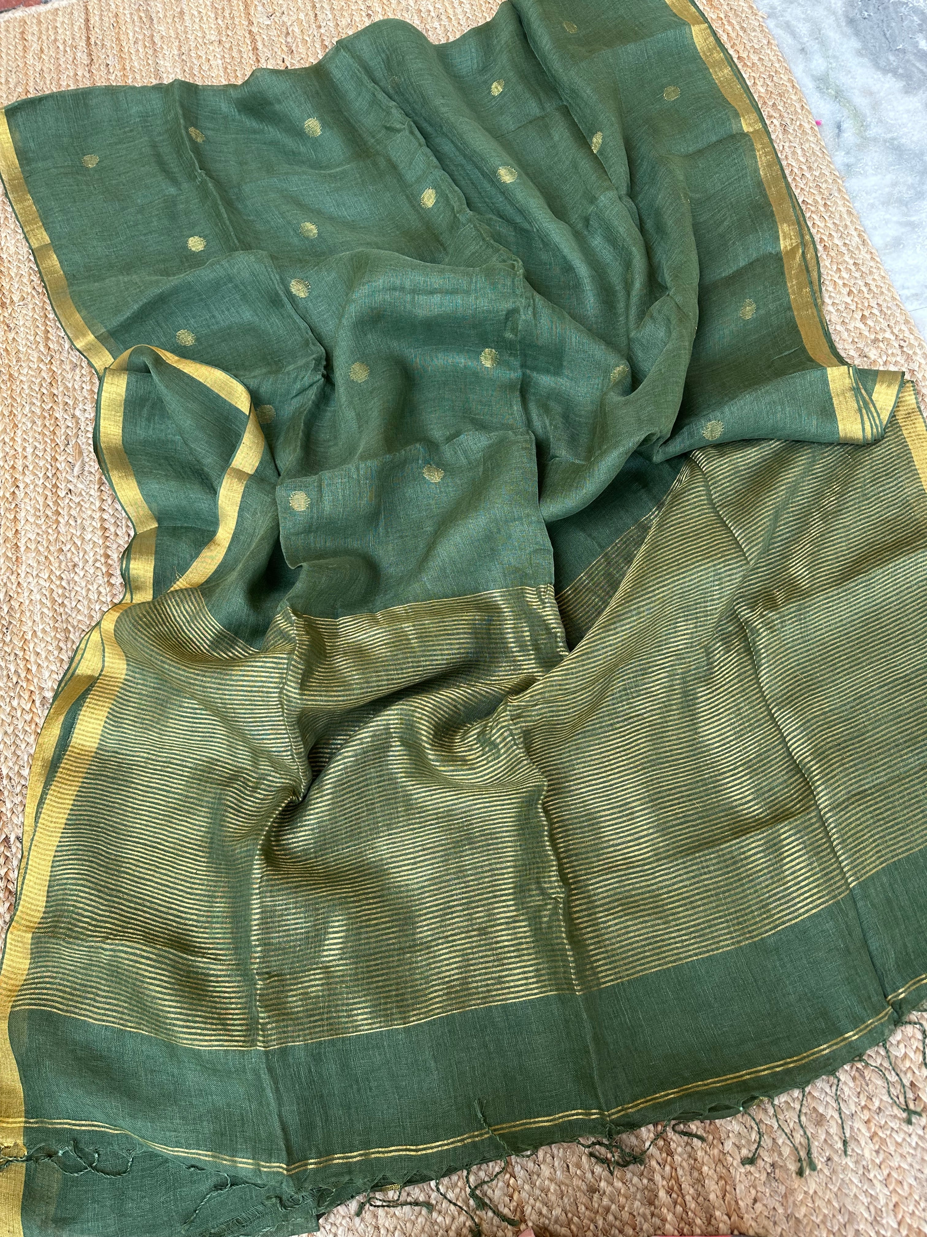 Mehendi Green Linen Handloom Silver Zari Saree