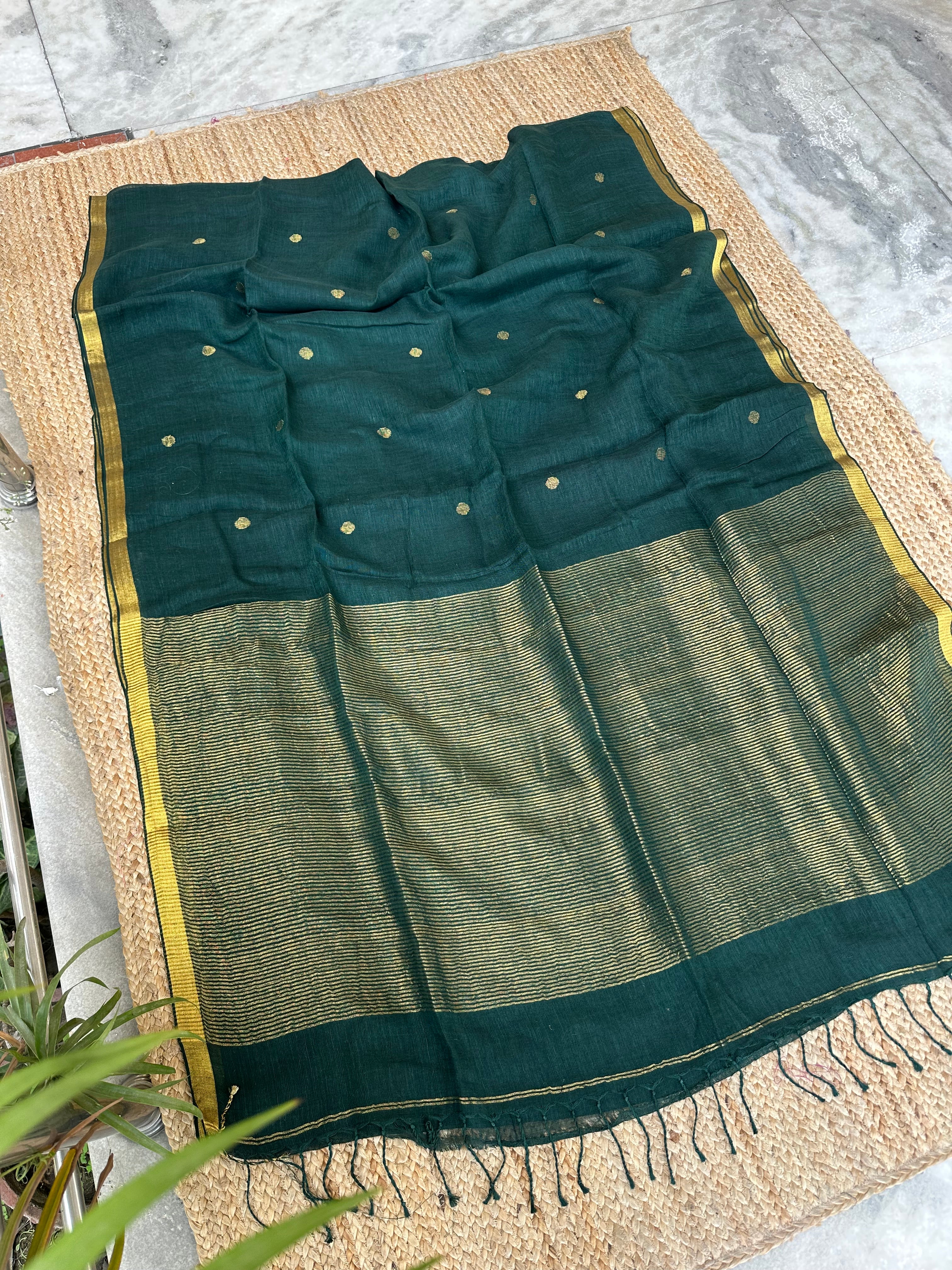 Material: Pure linen by linen handloom sarees with golden zari pallu and small circle bootas.