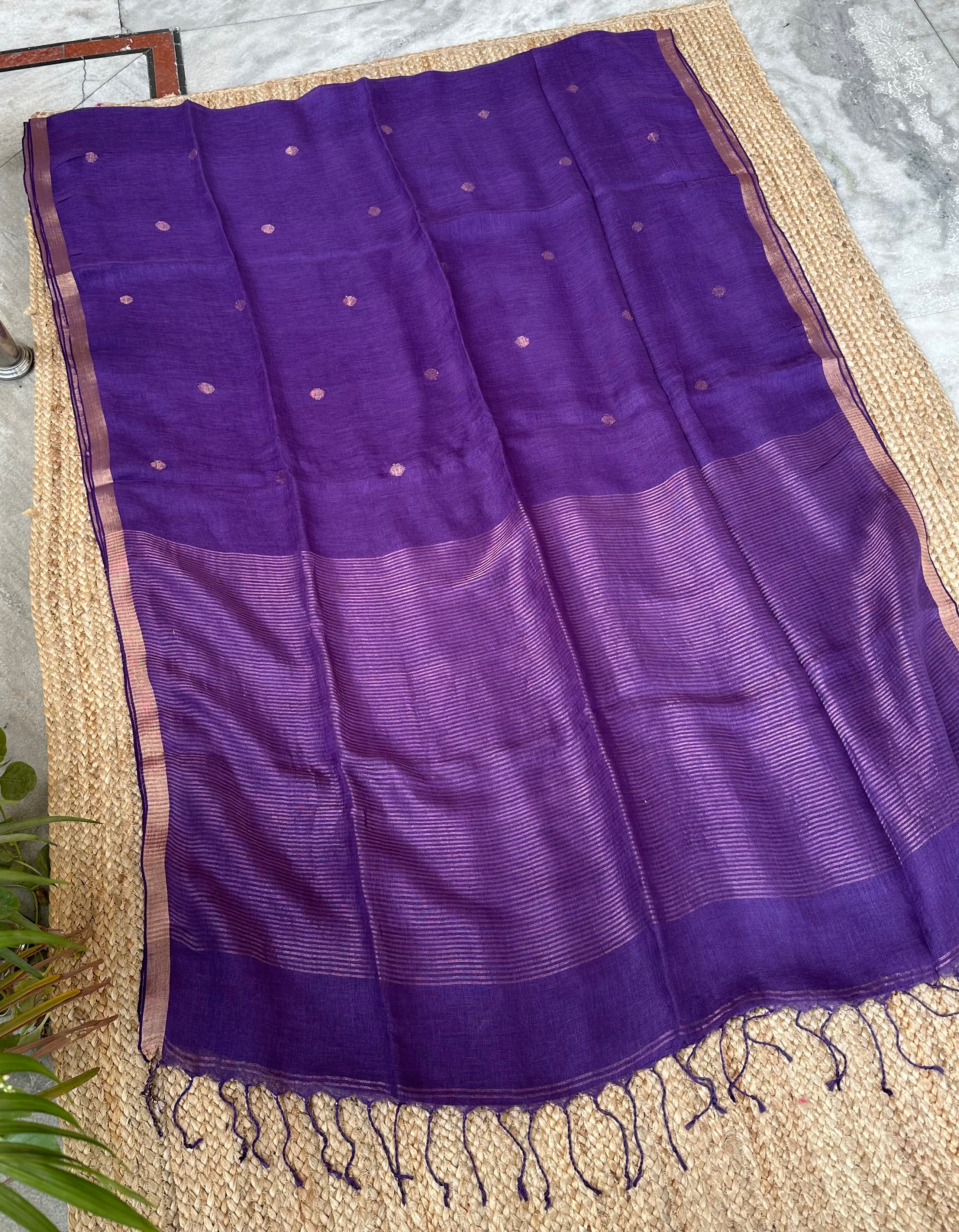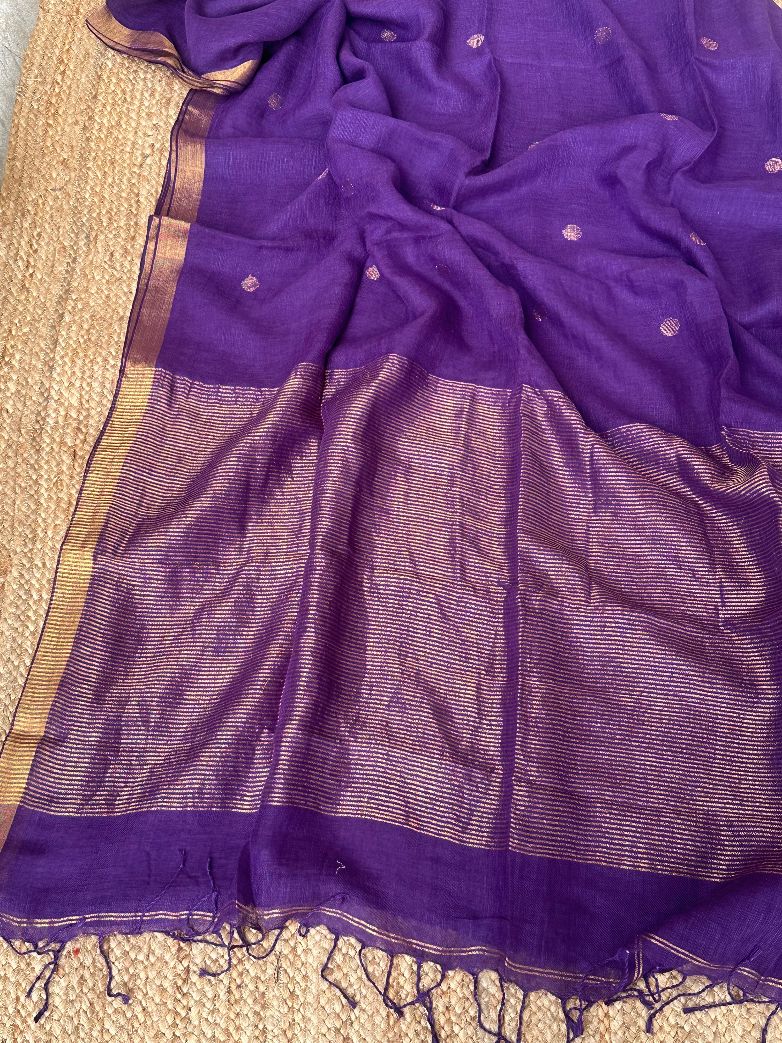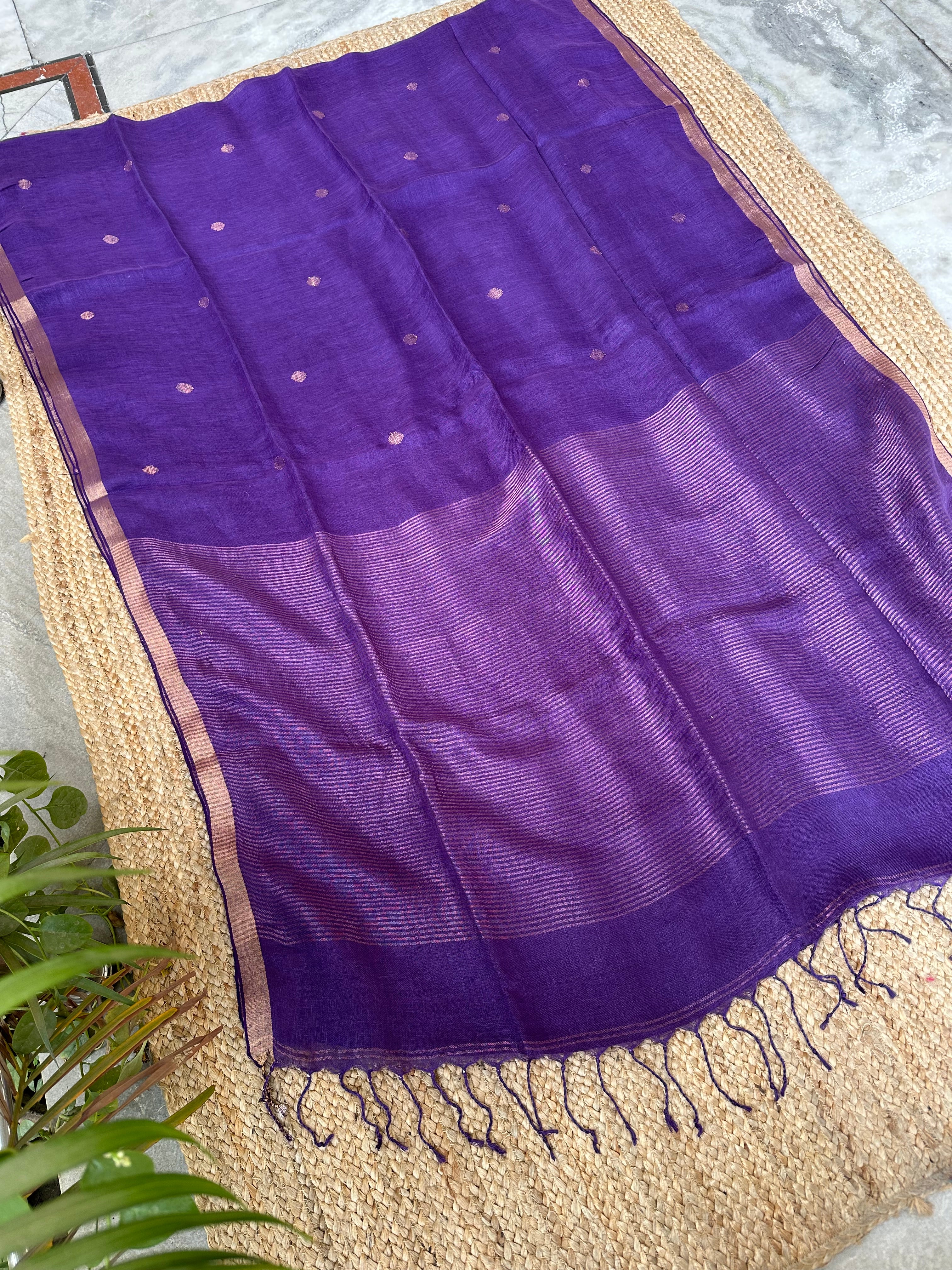 Material: Pure linen by linen handloom sarees with golden zari pallu and small circle bootas.