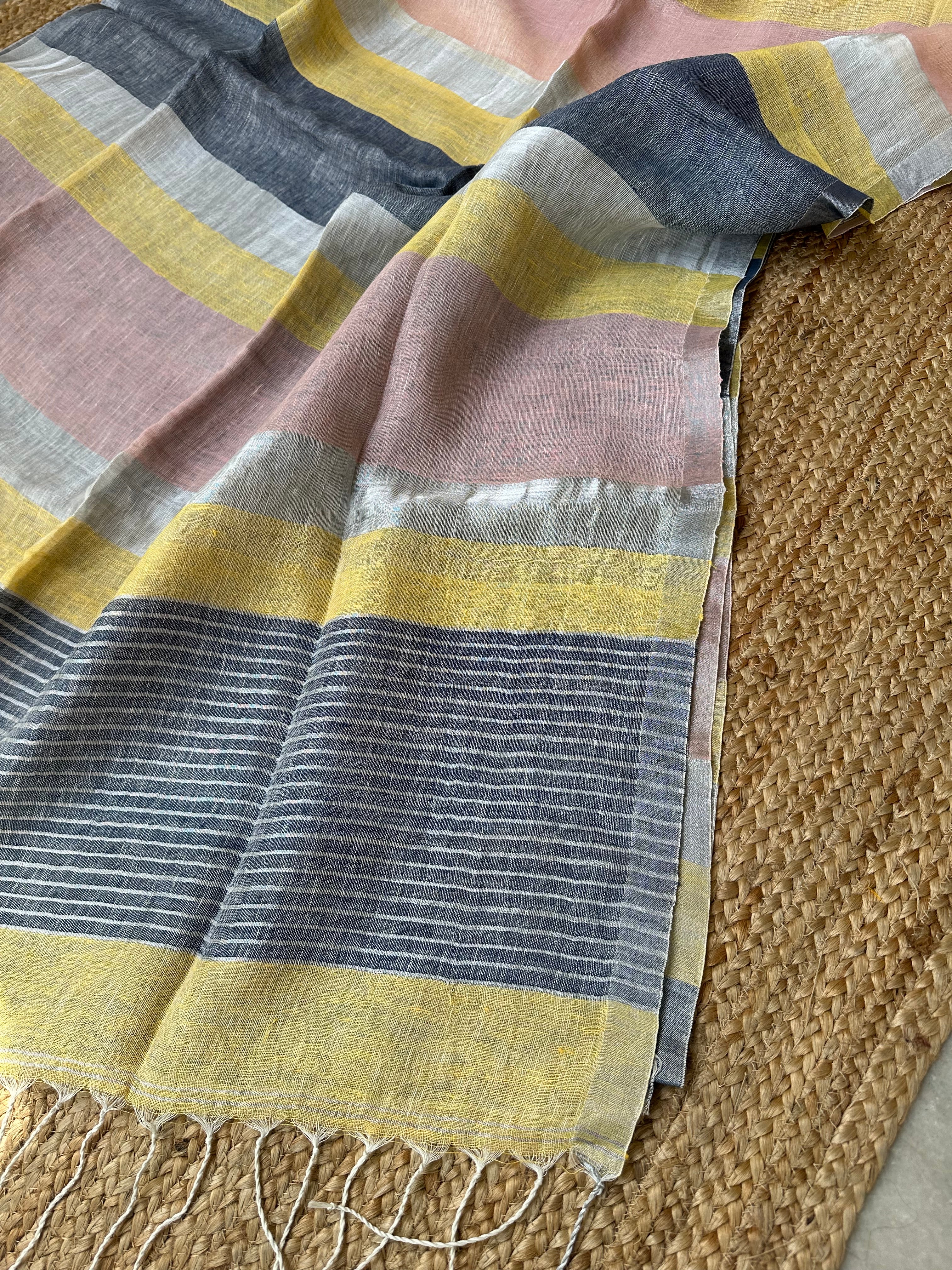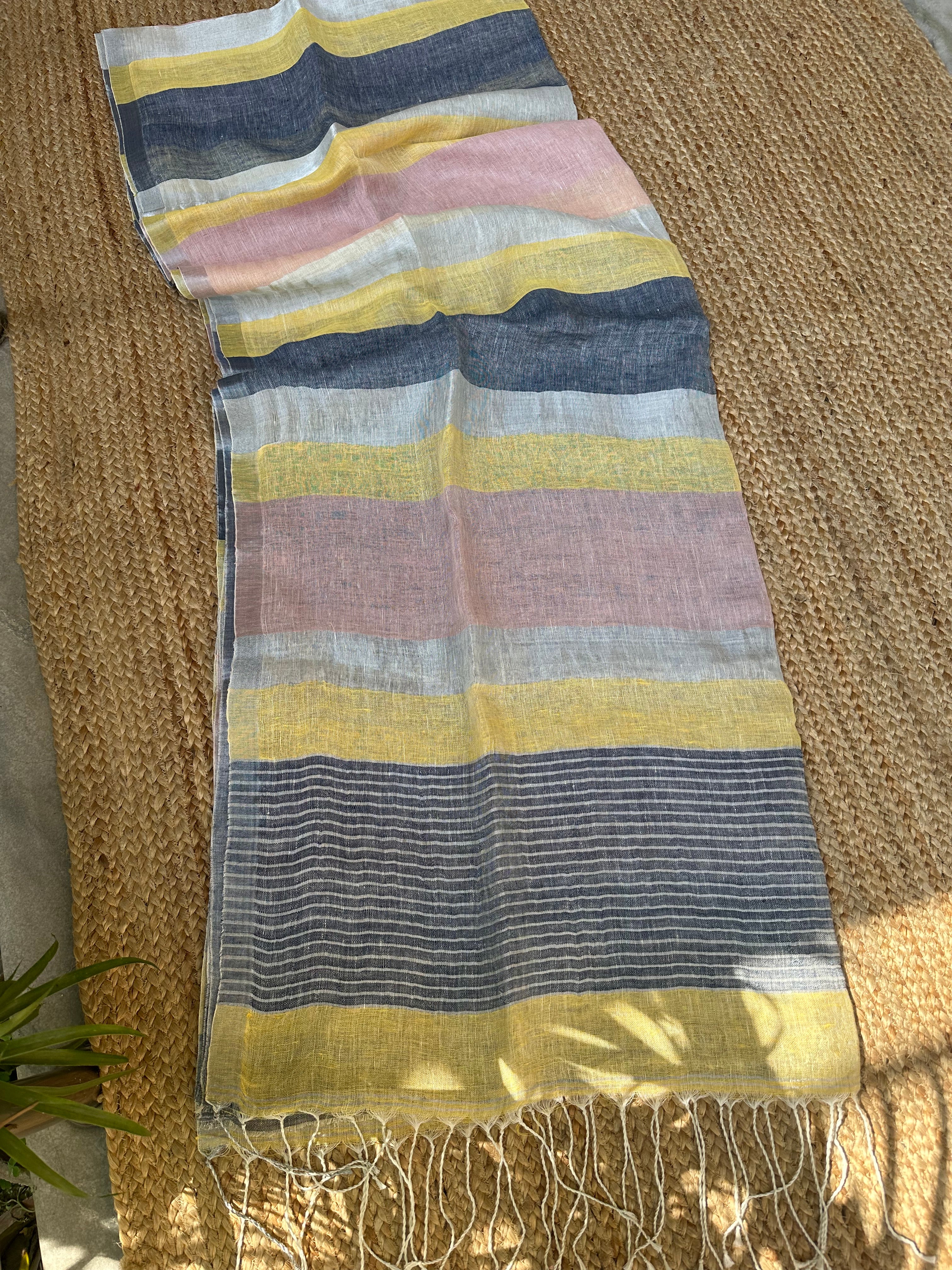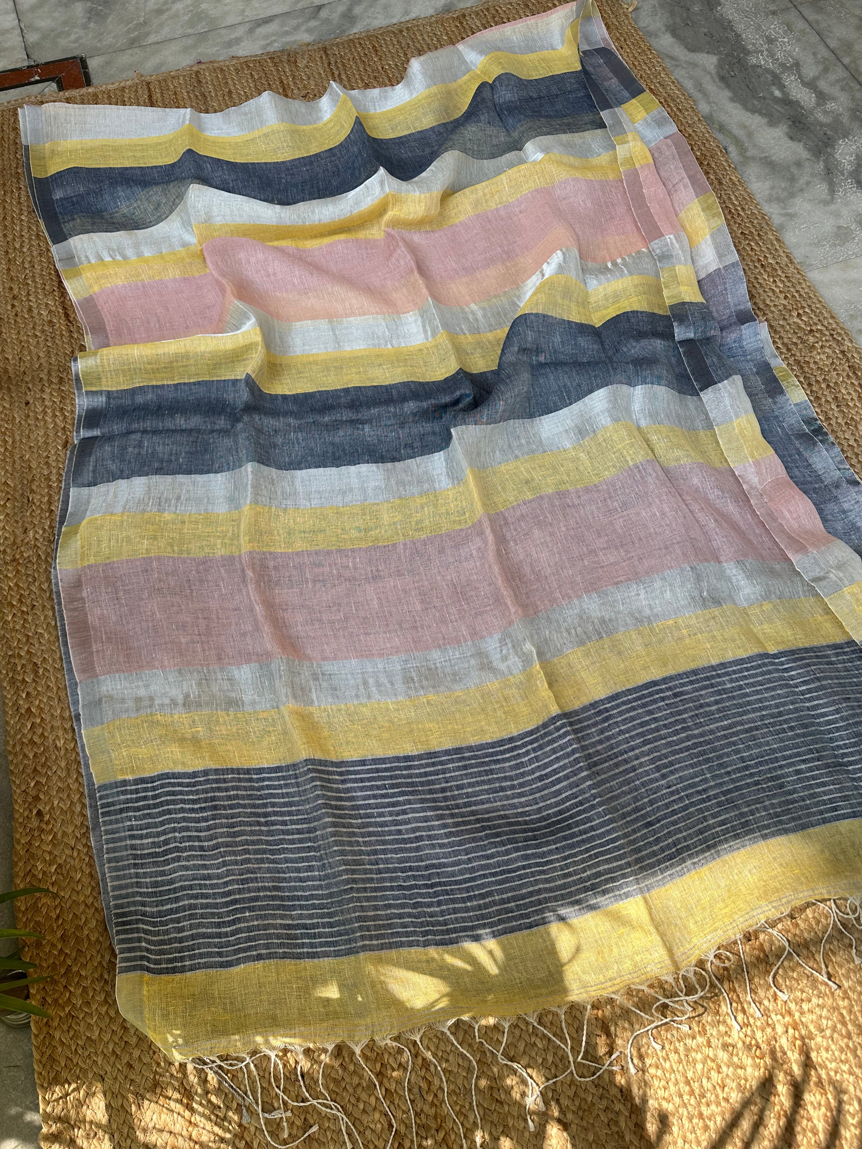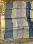 Pure Linen Handloom Peach Multi Stripes Saree