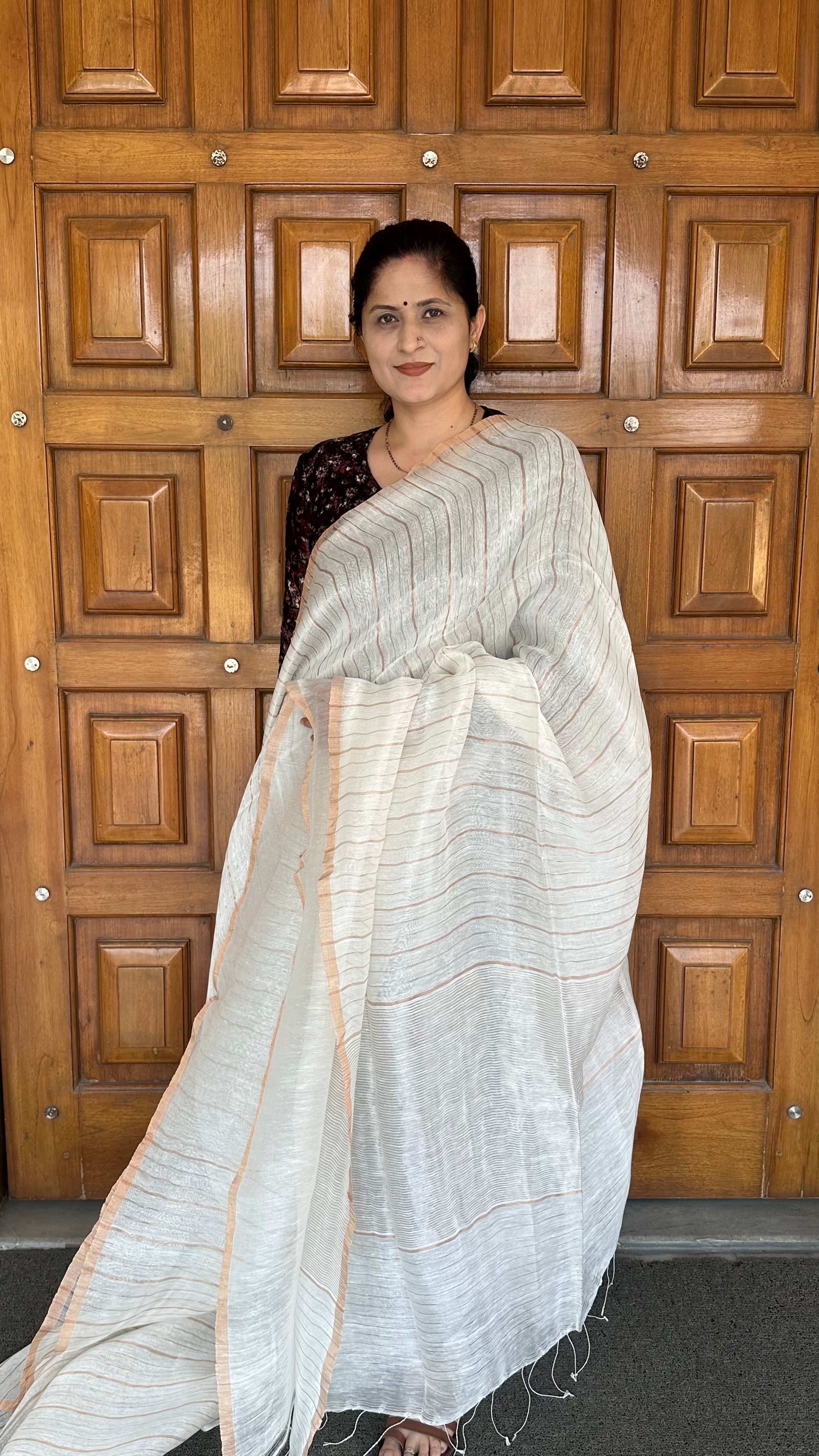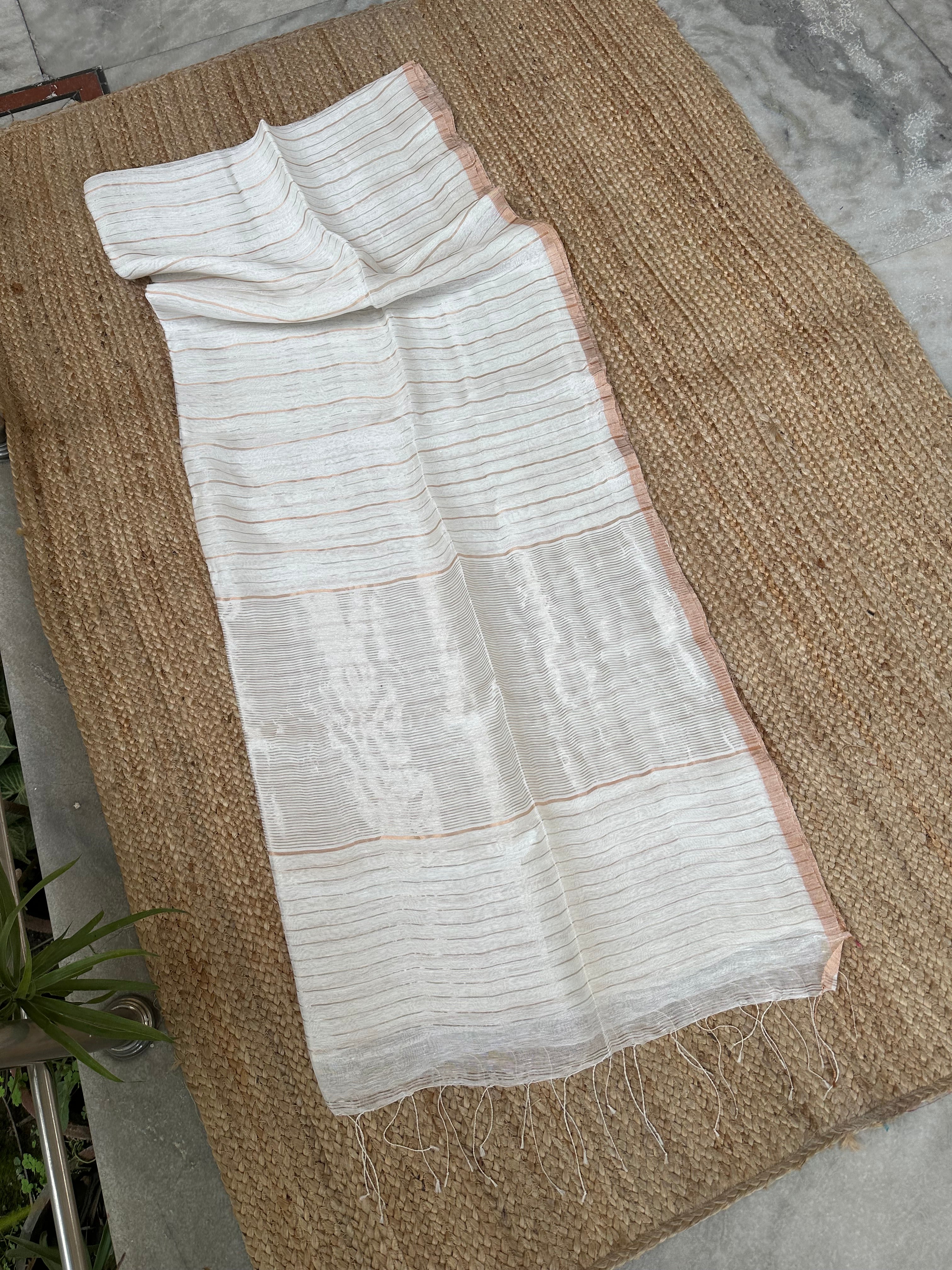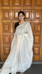 White Pure Linen Silk Handloom Dual Zari Striped Saree